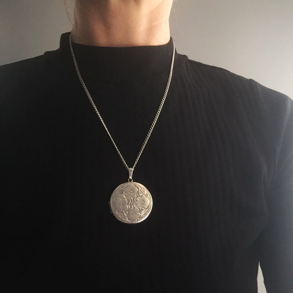 A really lovely silver ( 925) locket on a silver chain. Large round locket with flowers engraved on the front, opens to 2 photo frames , large enough for a good sized picture. supplied in a box