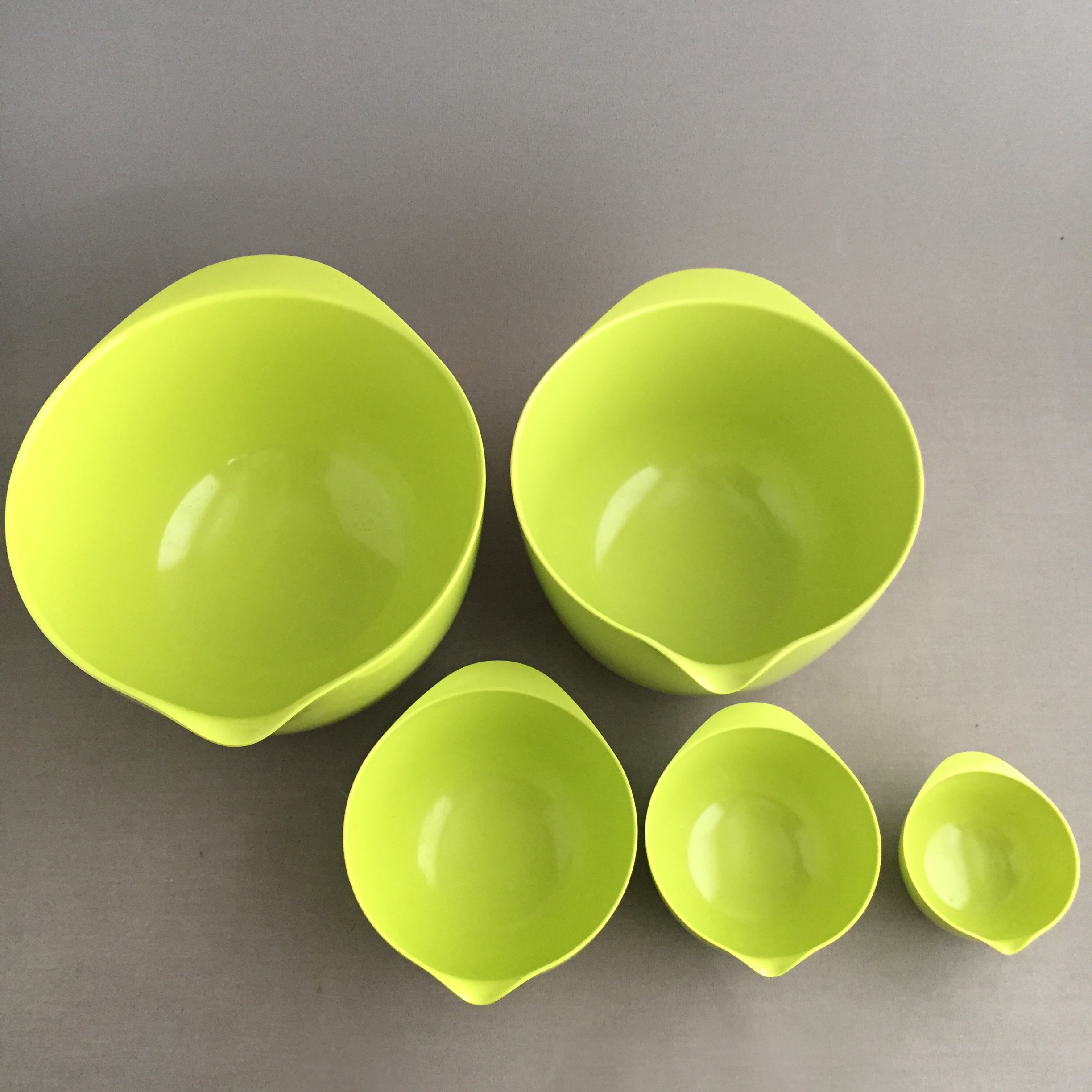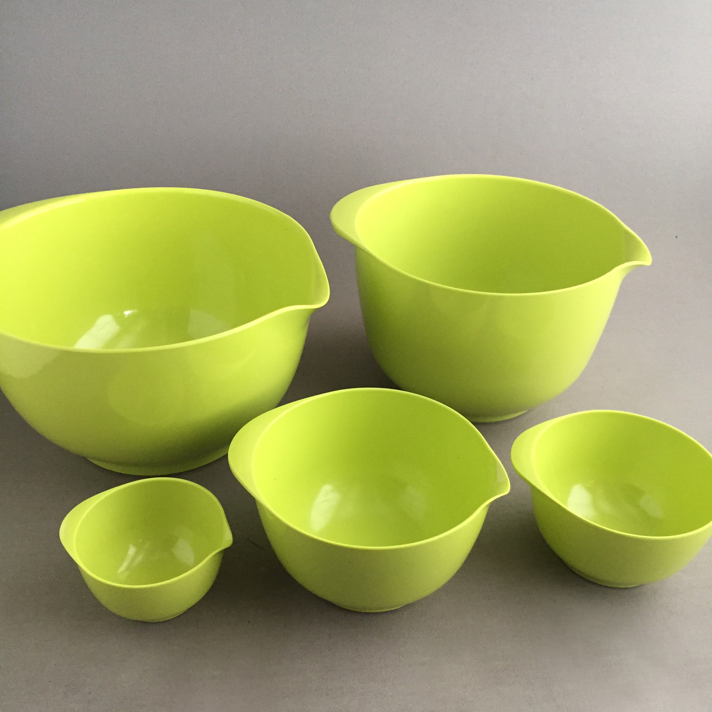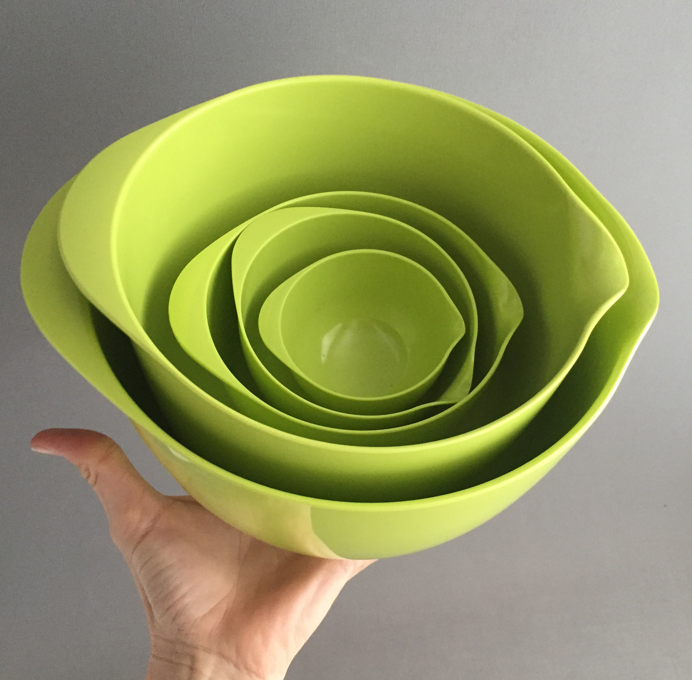 This is the lime green version. The bowls nest into each other for practical storage. This is a set of 6 bowls .
