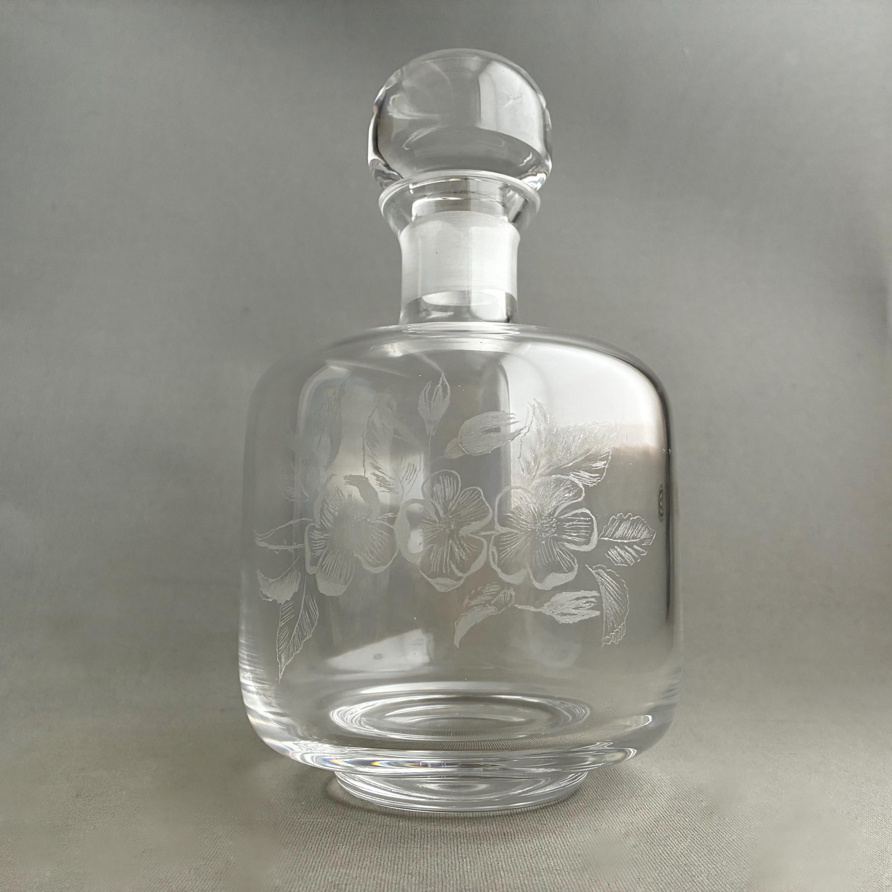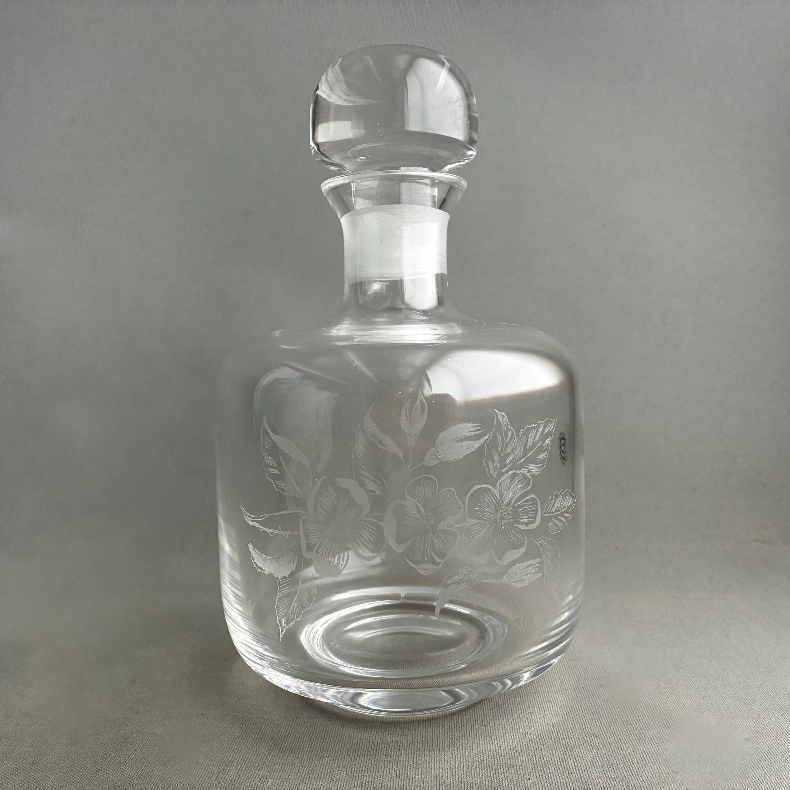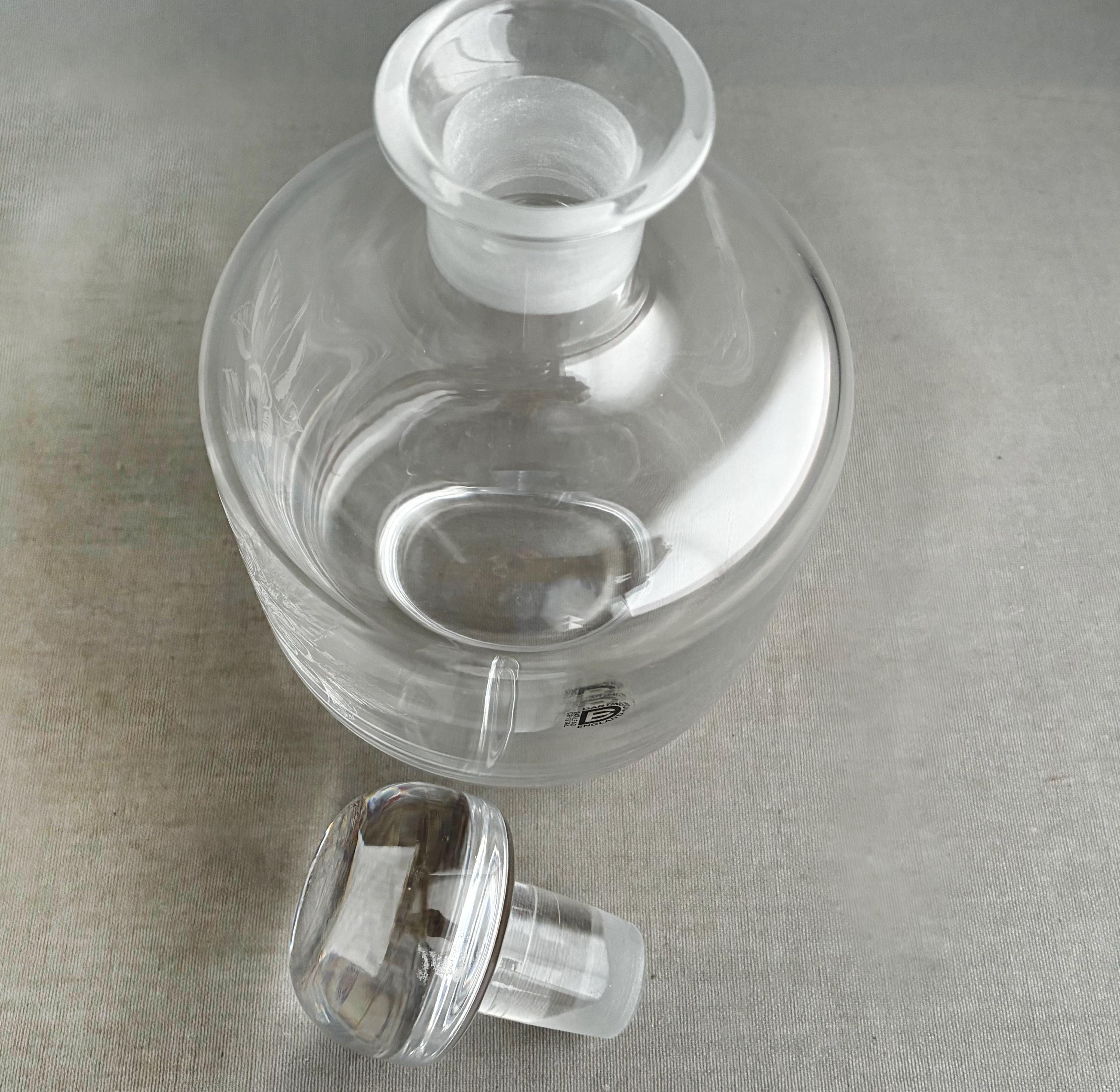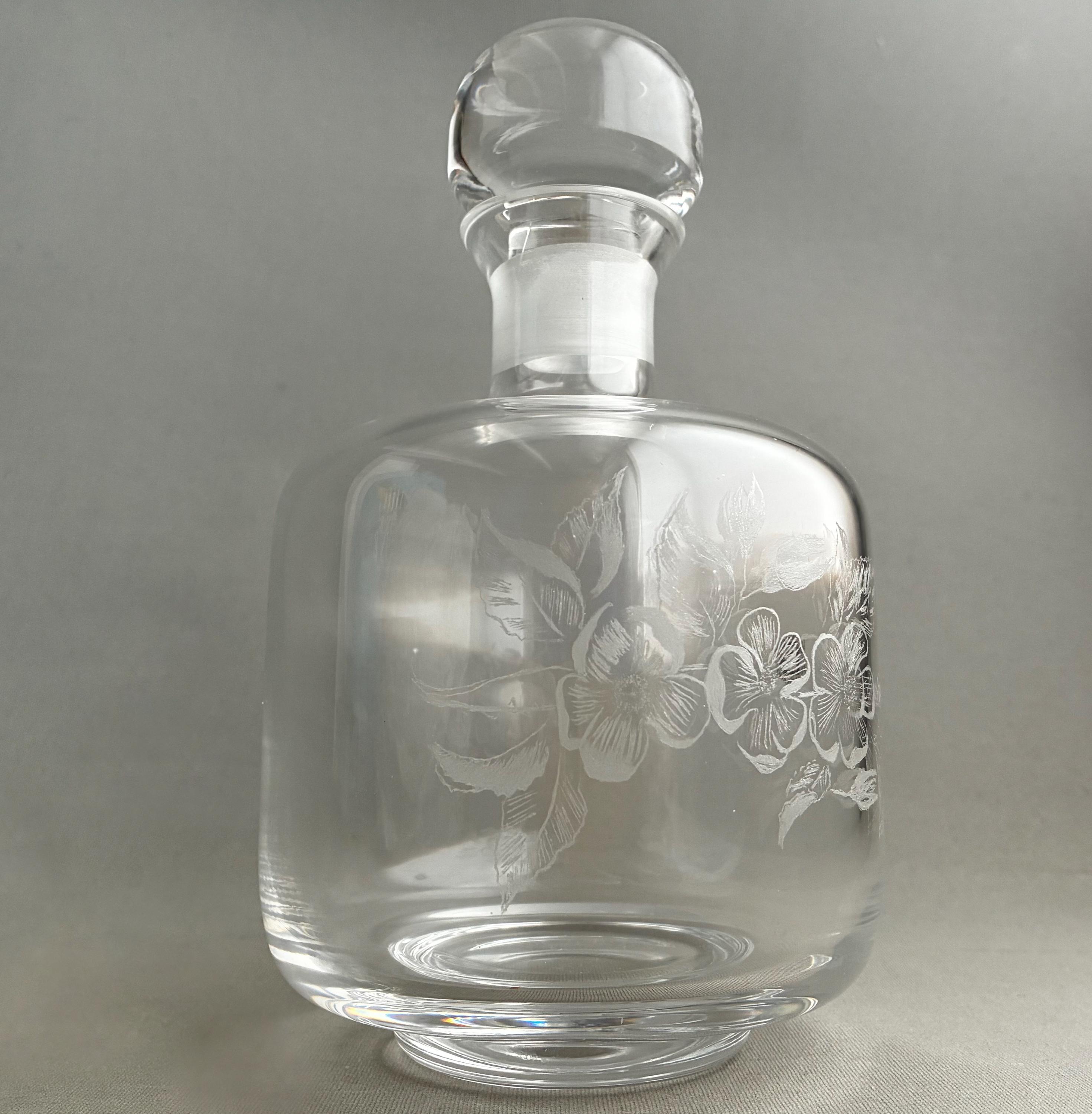 A quality lead crystal modernist decanter by British glass maker Dartington ( original makers sticker still on ) .Designed by the legendary glass designer Frank Thrower. The decanter has a modernist shape with beautiful curves and a large ball stopper at the top with a ground edge. Featuring a floral design etched into the glass .This Decanter will look beautiful displayed with your favourite tipple . Pleasingly weighty and in excellent condition