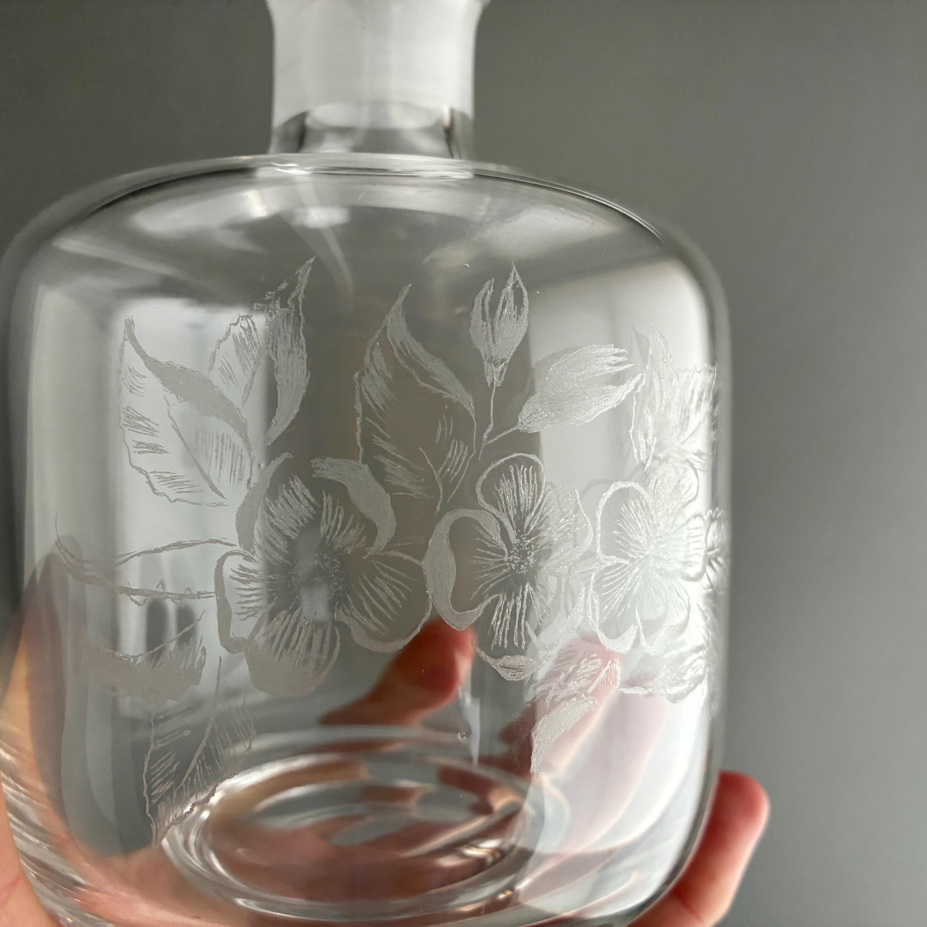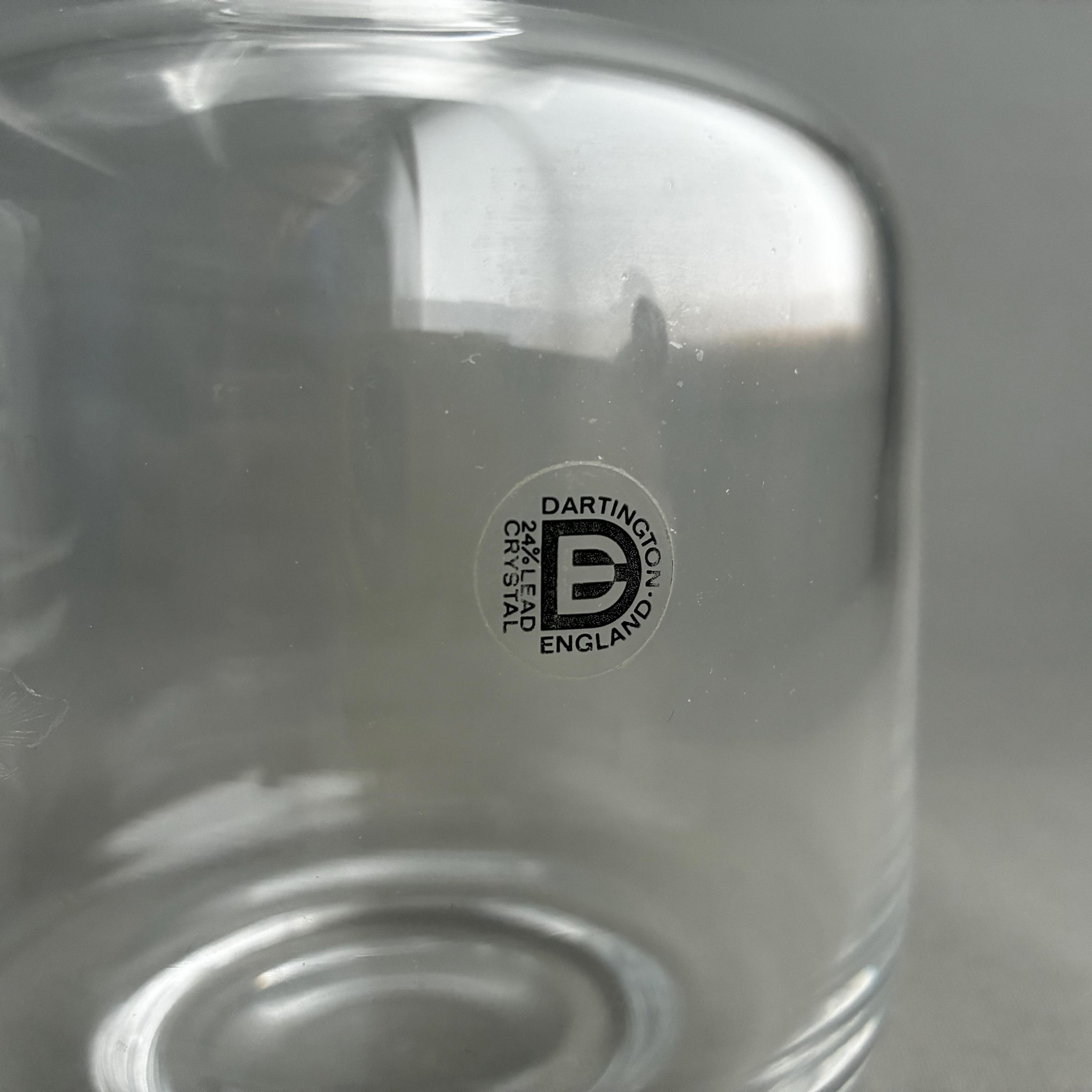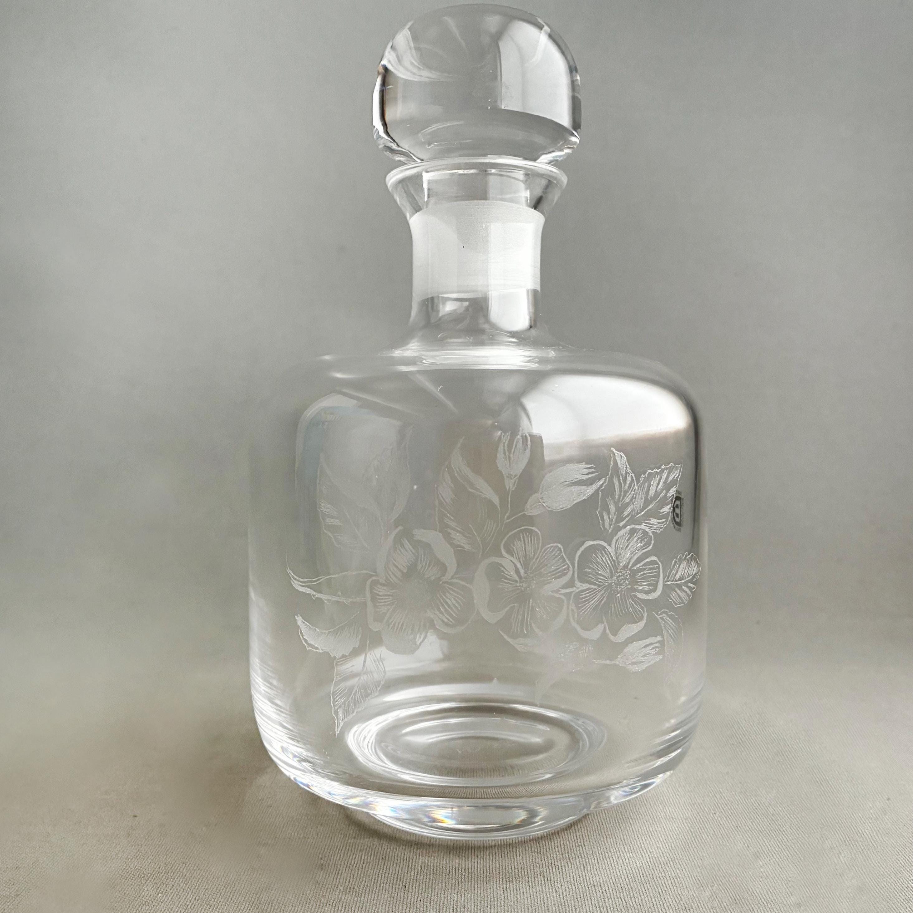 A quality lead crystal modernist decanter by British glass maker Dartington ( original makers sticker still on ) .Designed by the legendary glass designer Frank Thrower. The decanter has a modernist shape with beautiful curves and a large ball stopper at the top with a ground edge. Featuring a floral design etched into the glass .This Decanter will look beautiful displayed with your favourite tipple . Pleasingly weighty and in excellent condition