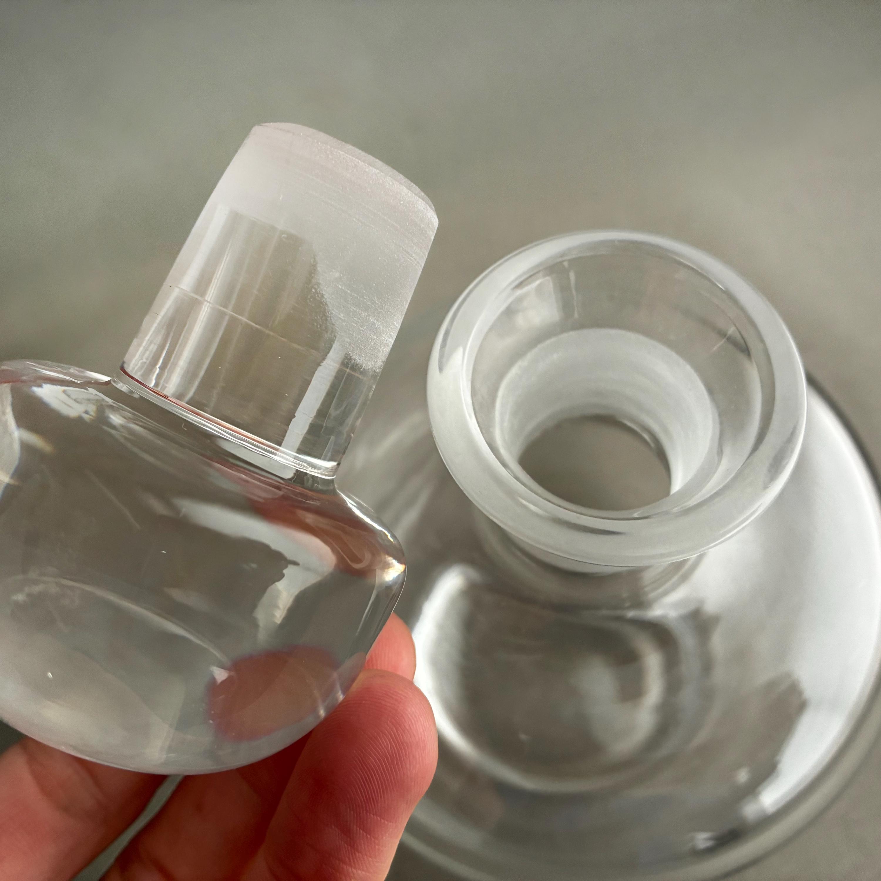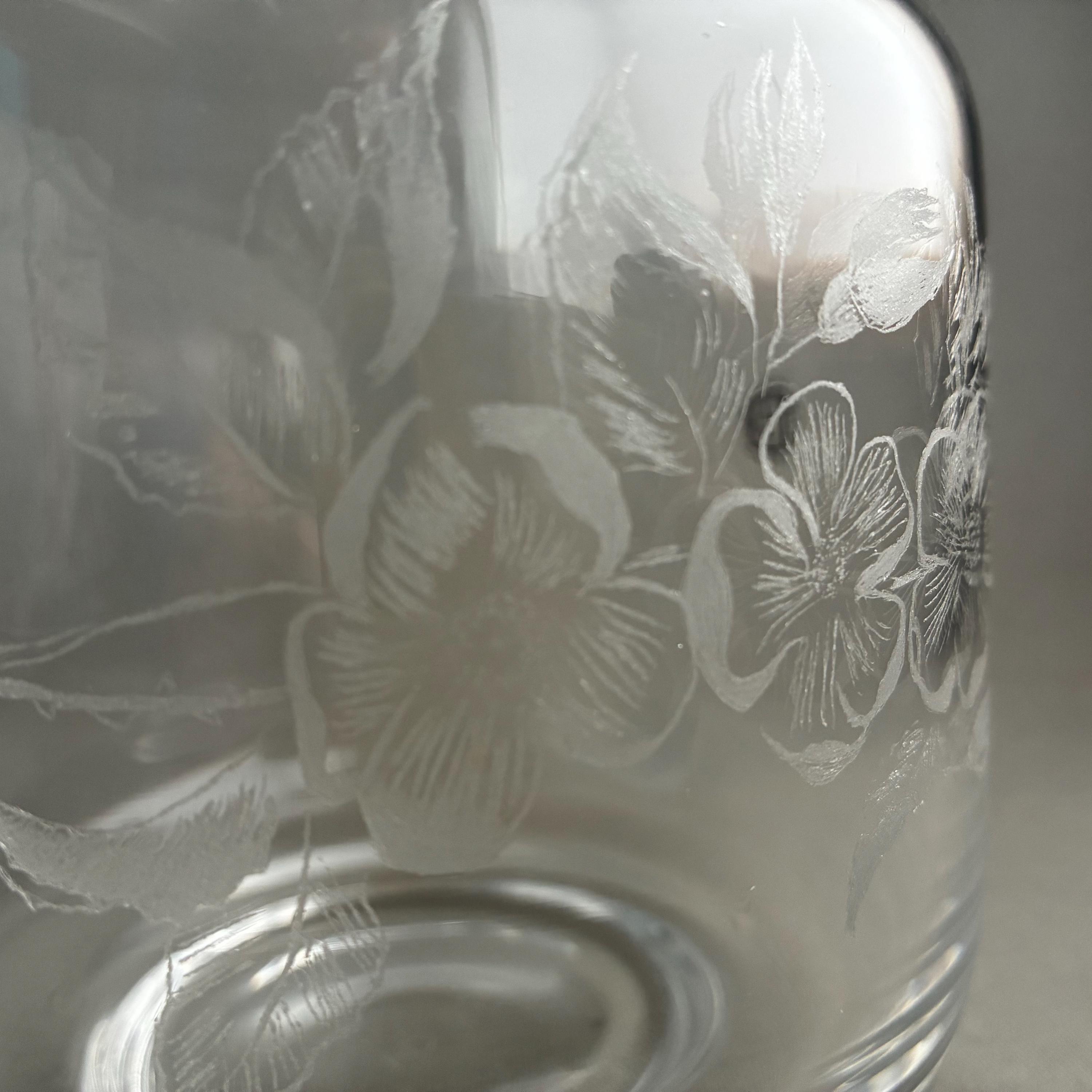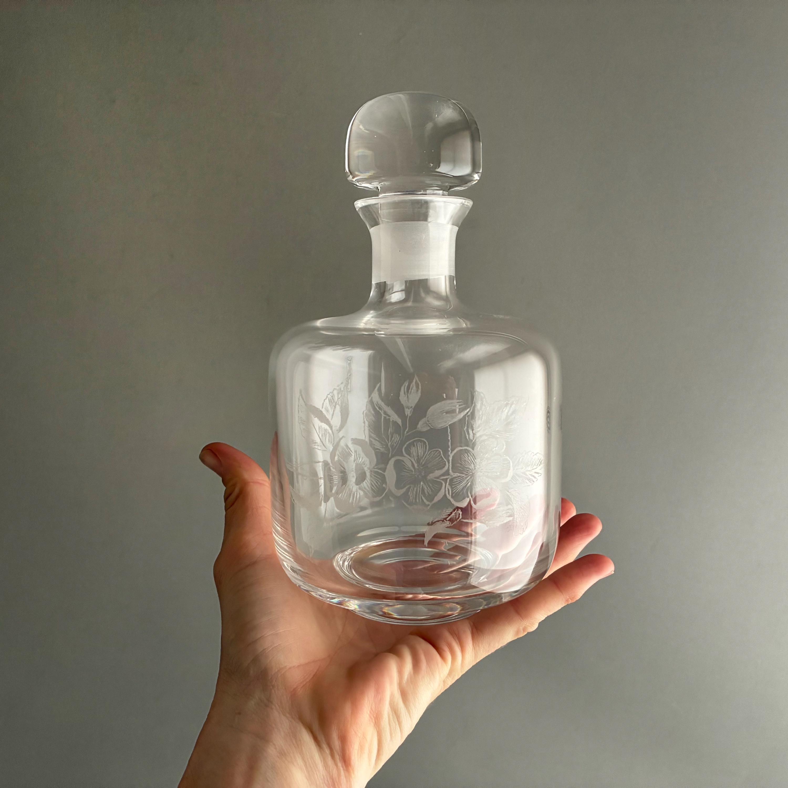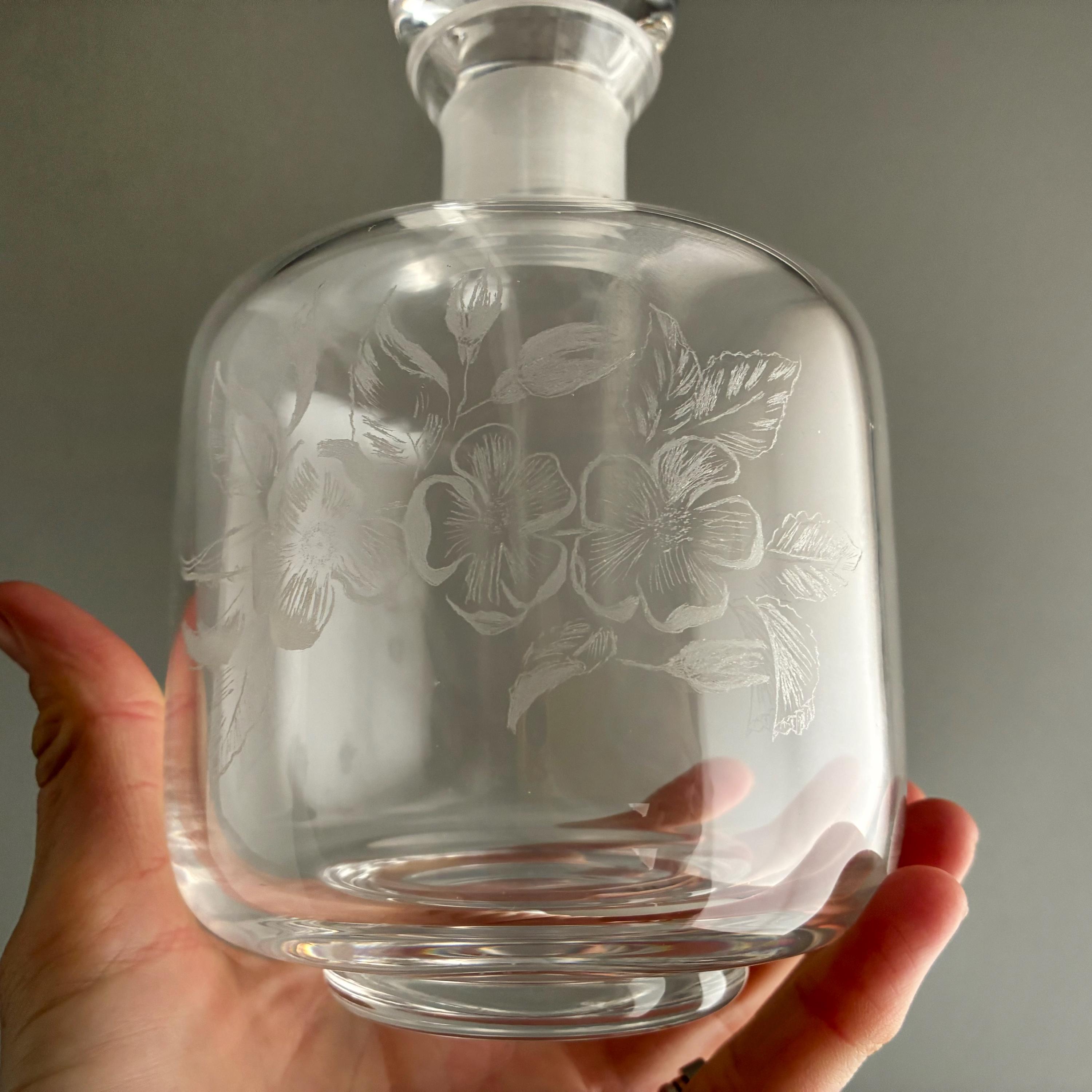 A quality lead crystal modernist decanter by British glass maker Dartington ( original makers sticker still on ) .Designed by the legendary glass designer Frank Thrower. The decanter has a modernist shape with beautiful curves and a large ball stopper at the top with a ground edge. Featuring a floral design etched into the glass .This Decanter will look beautiful displayed with your favourite tipple . Pleasingly weighty and in excellent condition