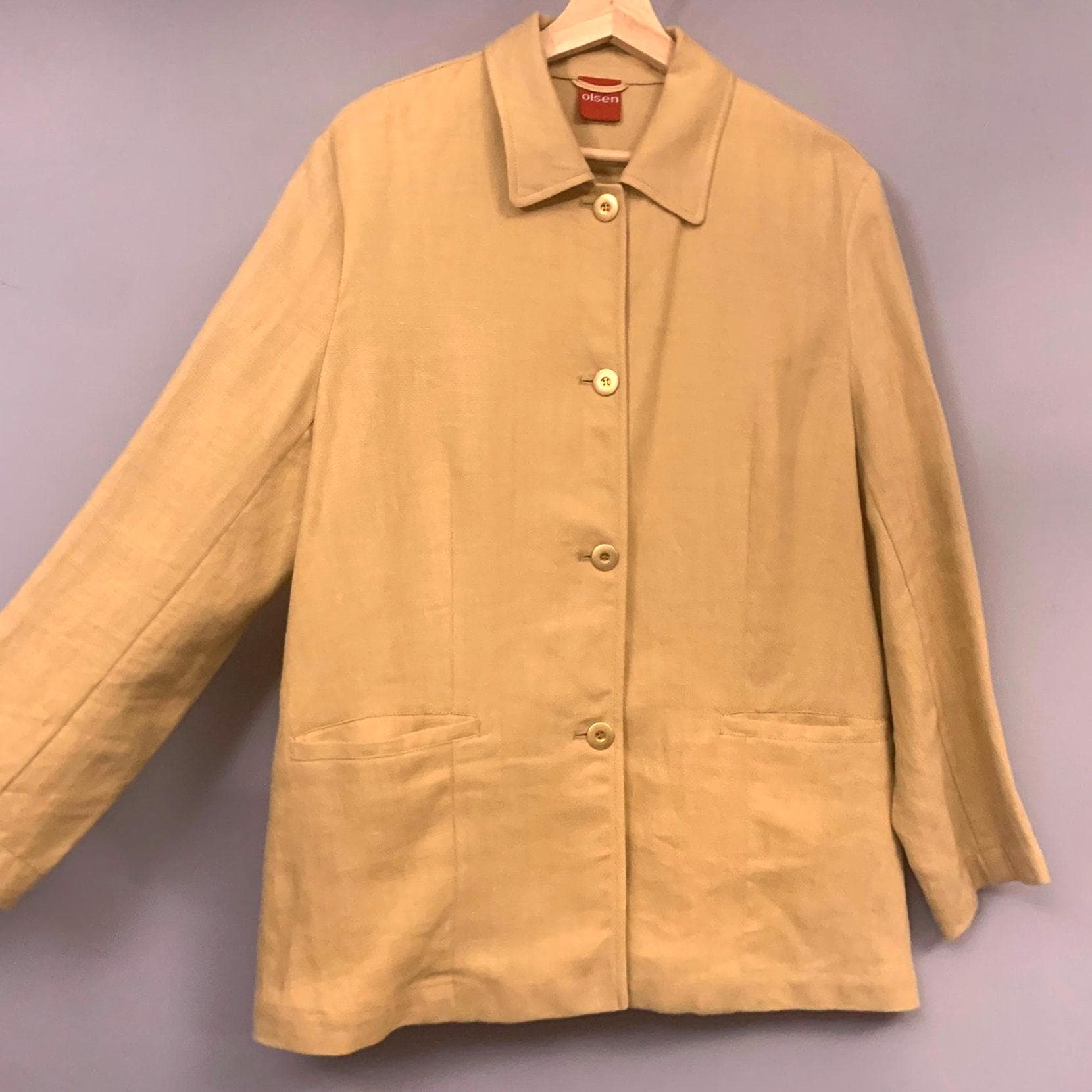A neat caramel coloured linen jacket in the style of a workwear chore but in luxurious linen. Unlined with Patch pockets at the front . Buttons up with stylish brass buttons. A beautifully made light and smart jacket .Layer in the winter or throw on in the summer.