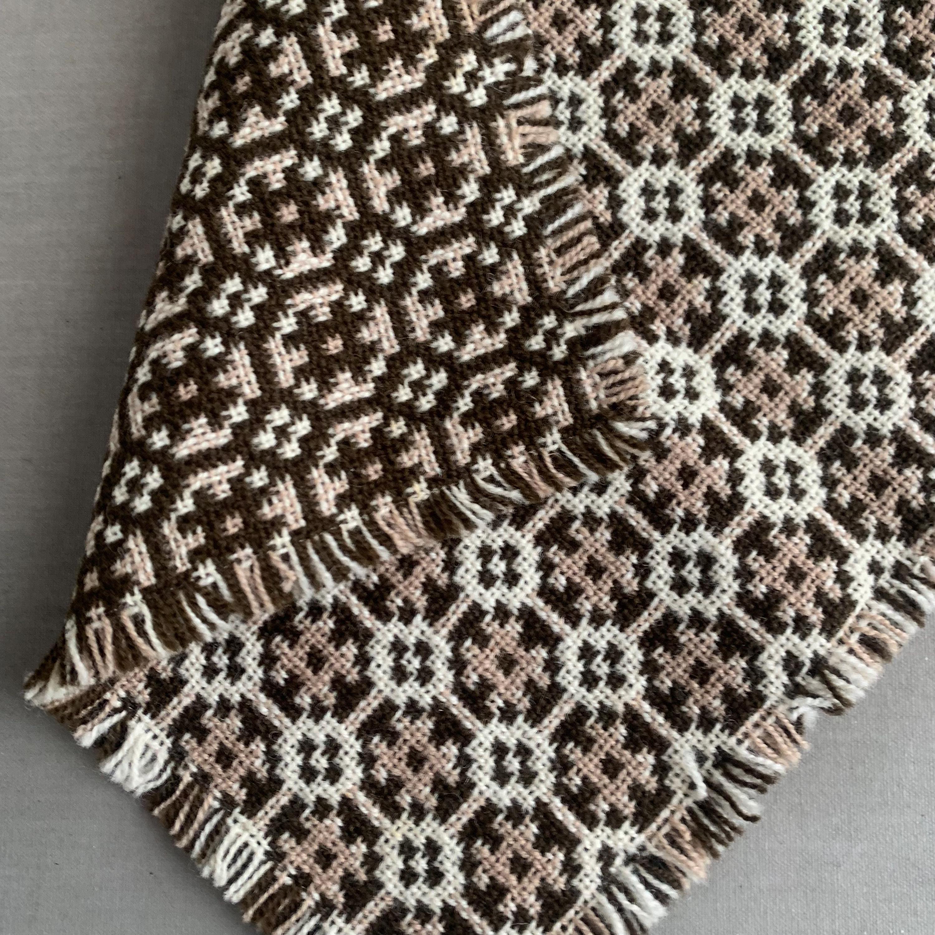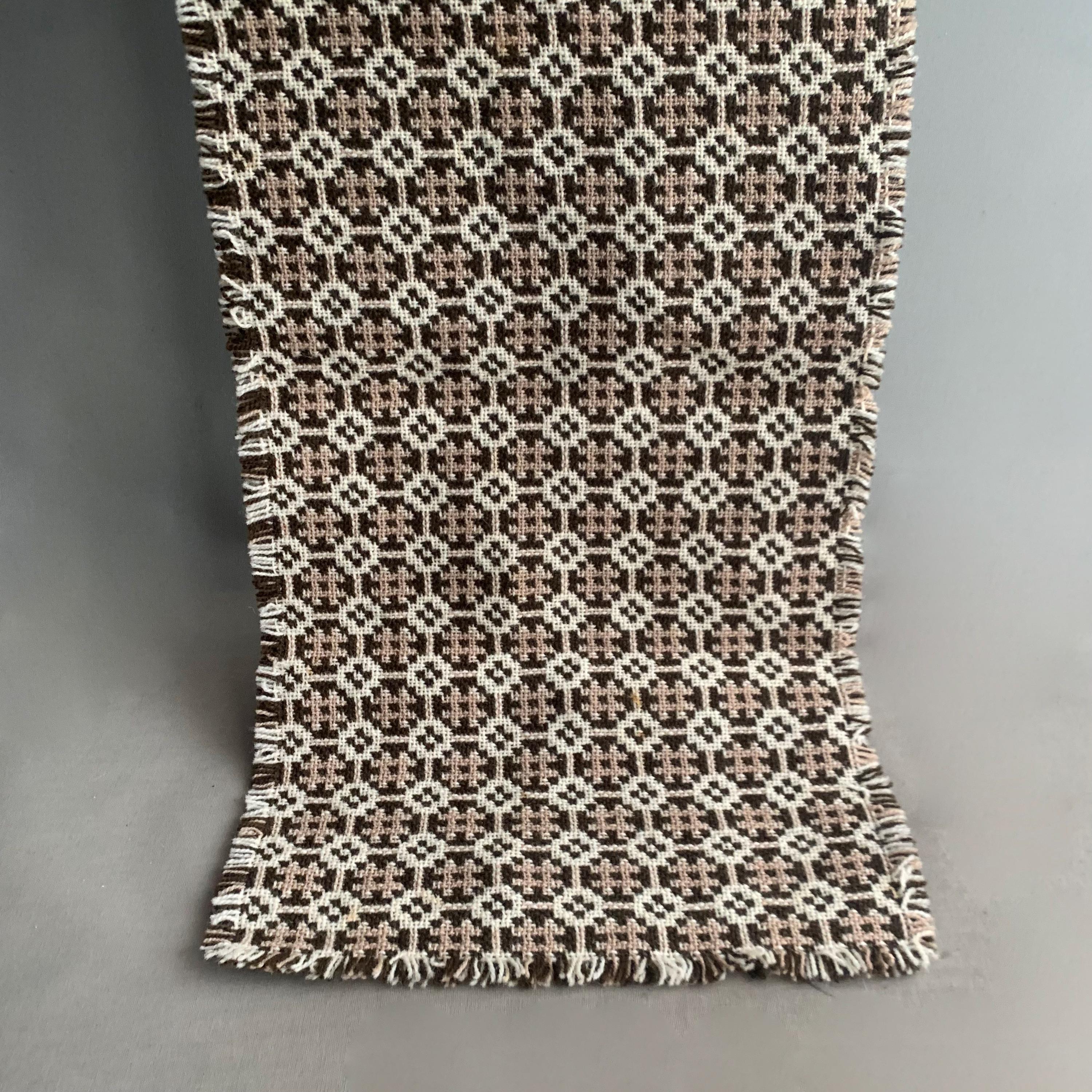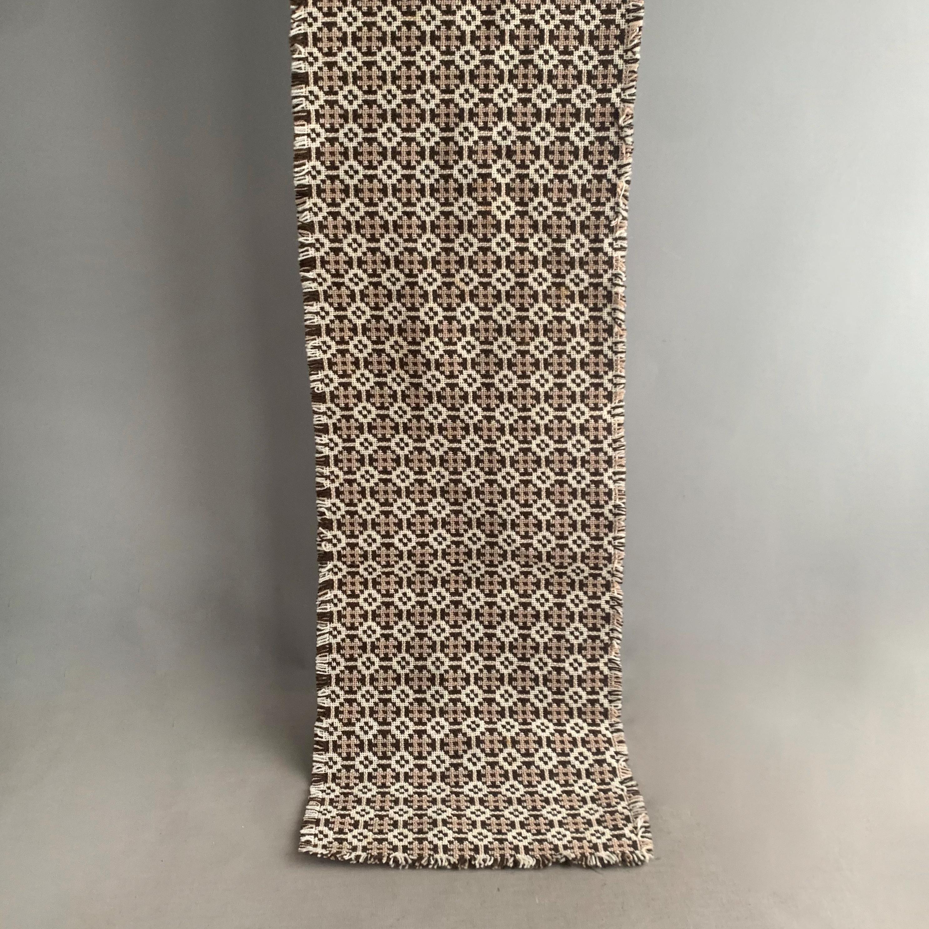 welsh wool table runner. A classic Welsh tapestry wool weave in brown , cream and beige with a fringed edge. A decorative table runner that will also protect wood from heat damage.