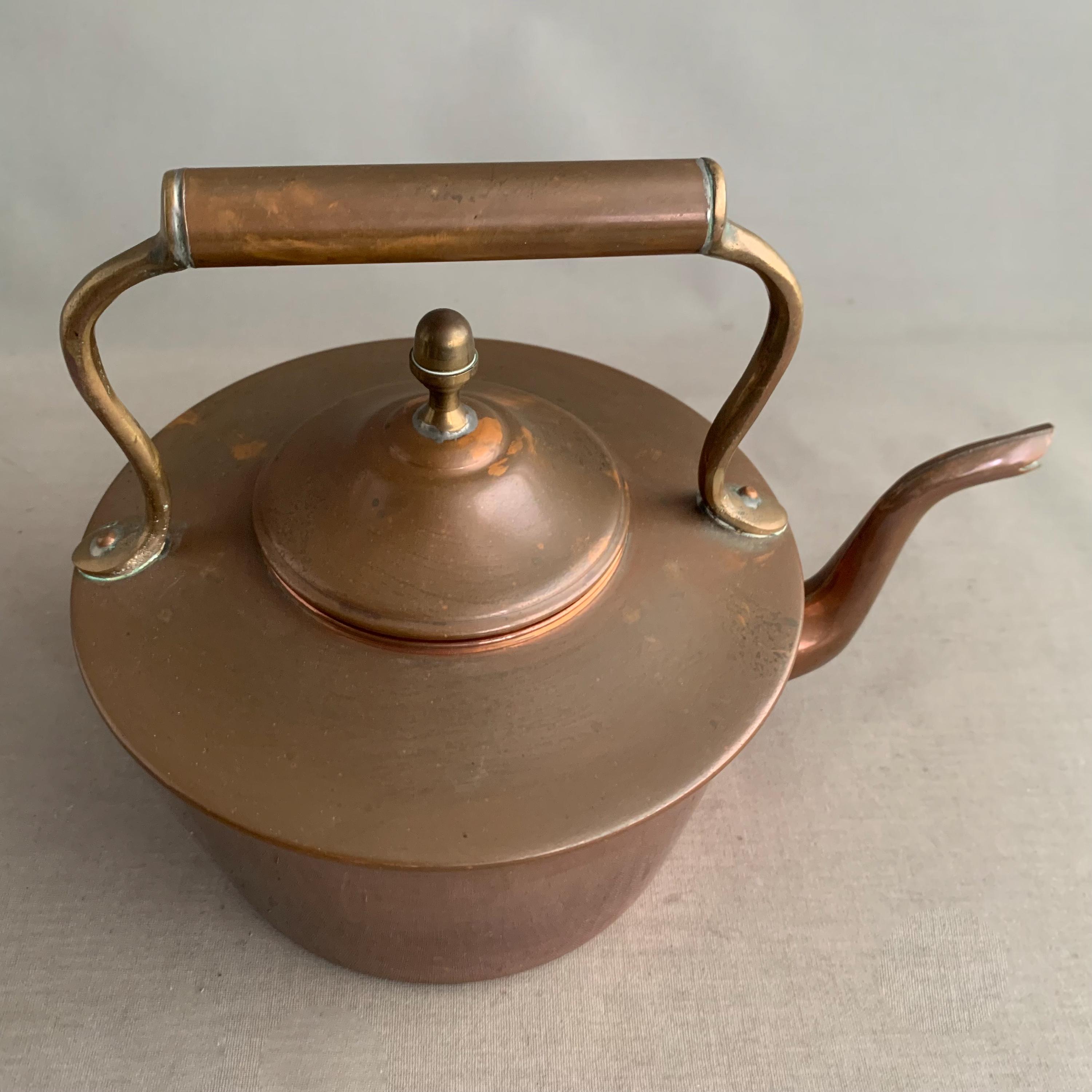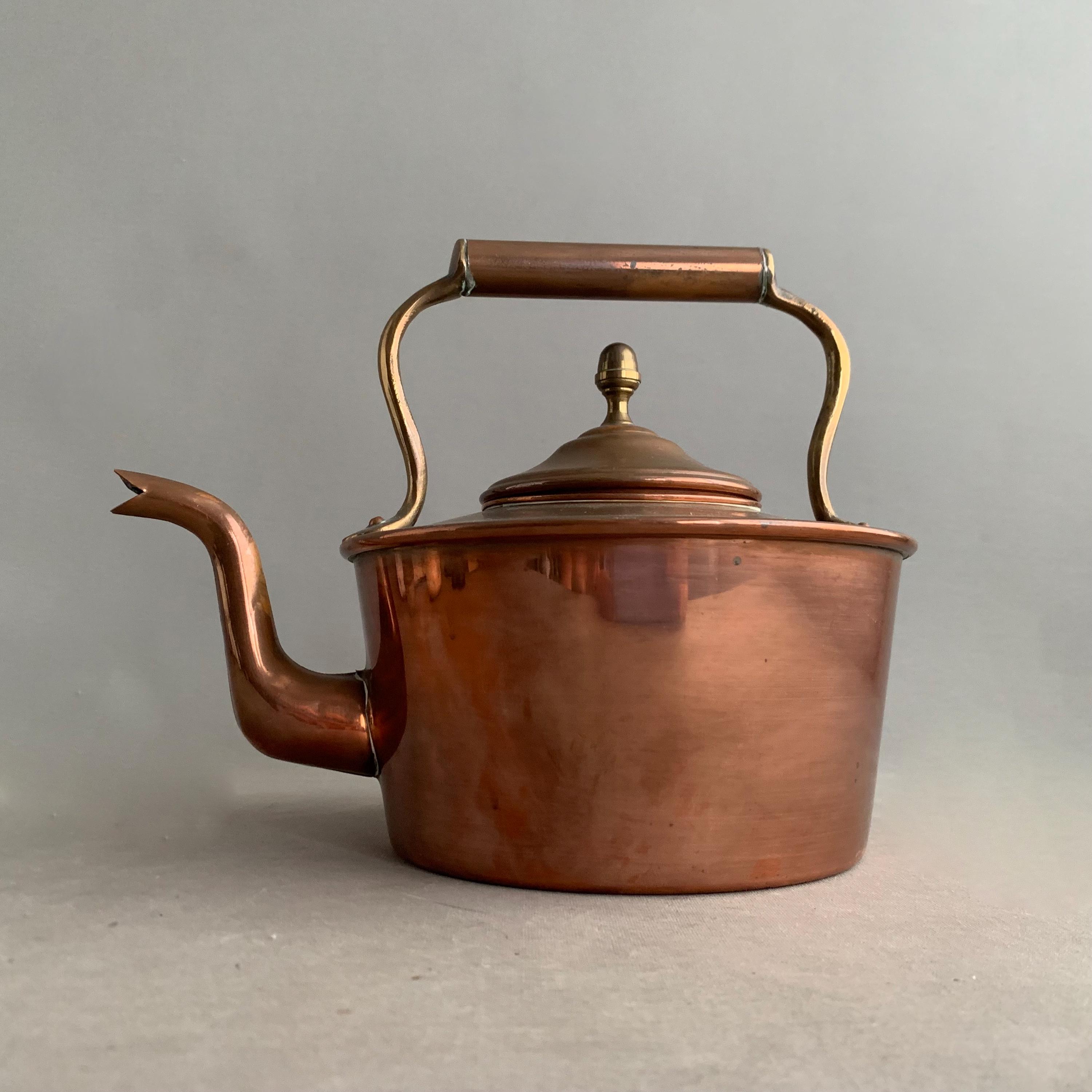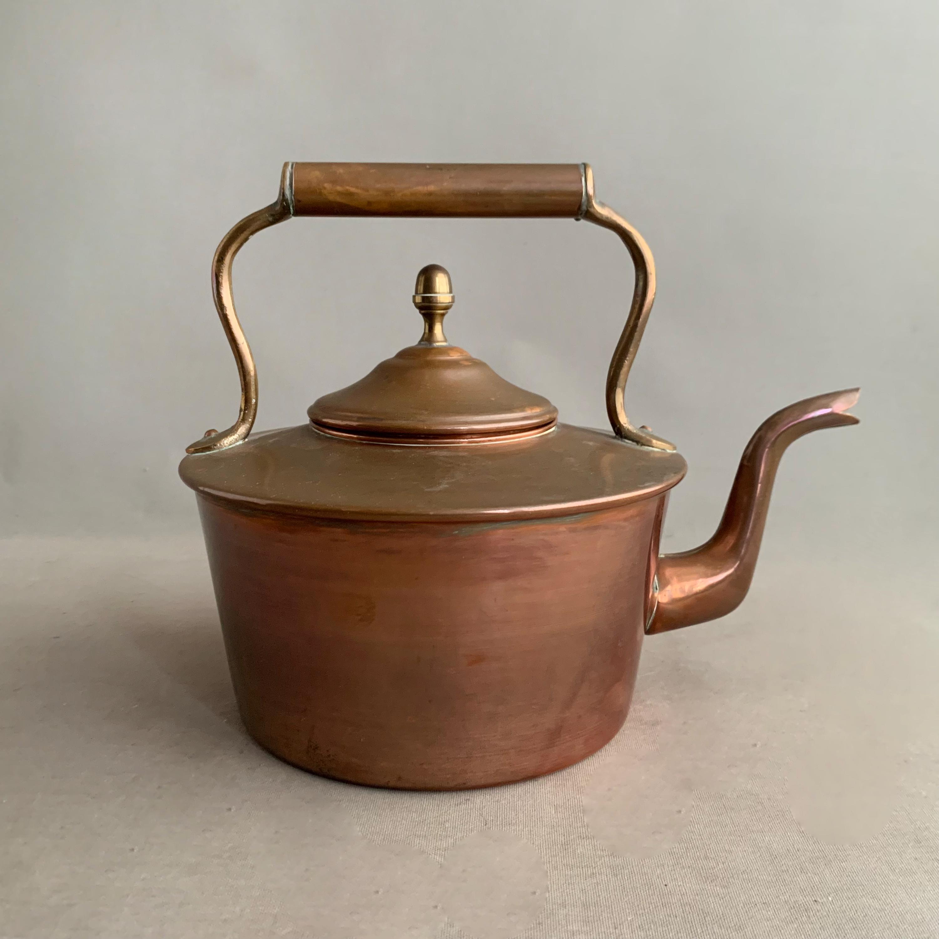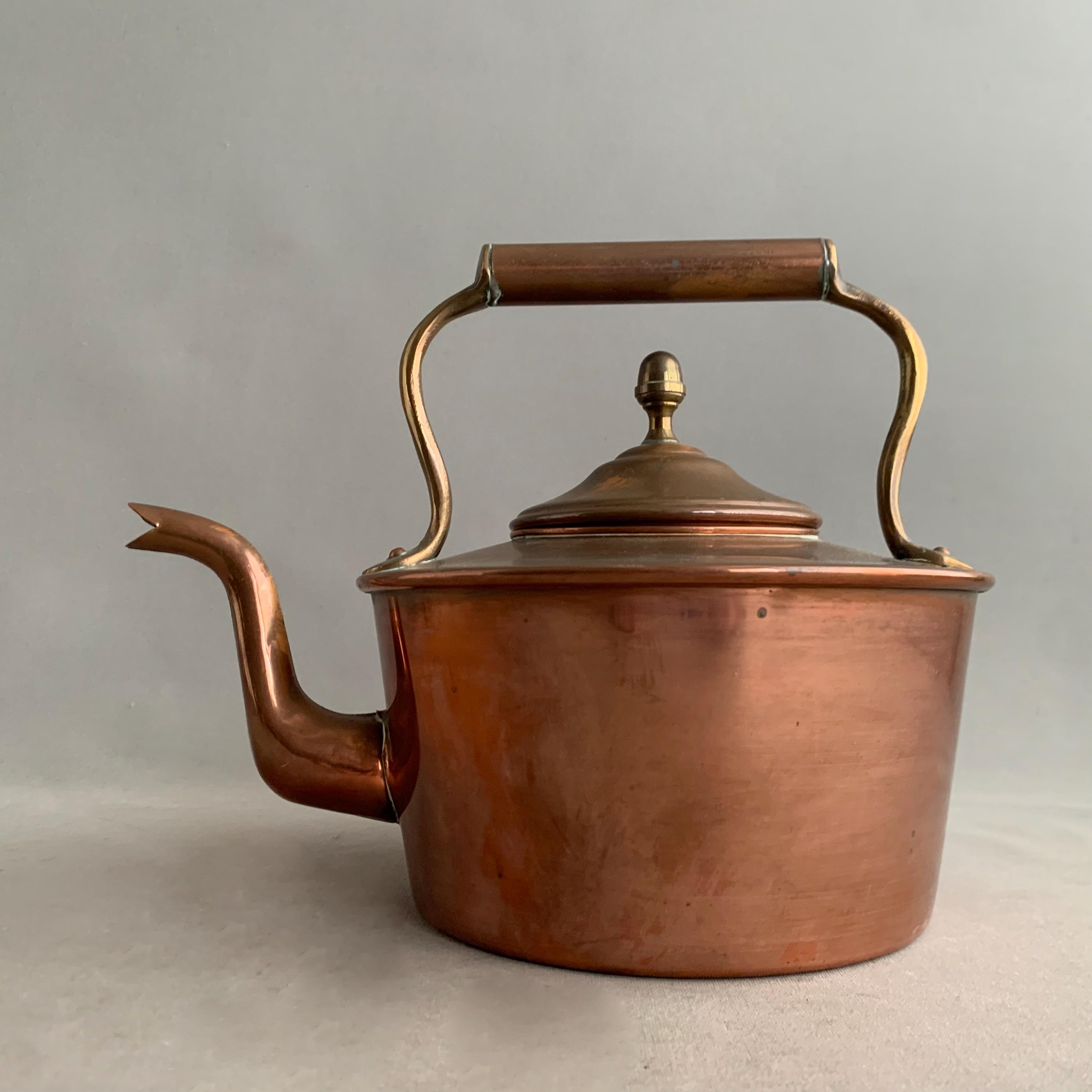 A lovely old copper kettle with solid brass fittings, and an elegant oval form. The shaped spout, riveted brass handle, and lift - off lid with original knob give it a pleasingly decorative form