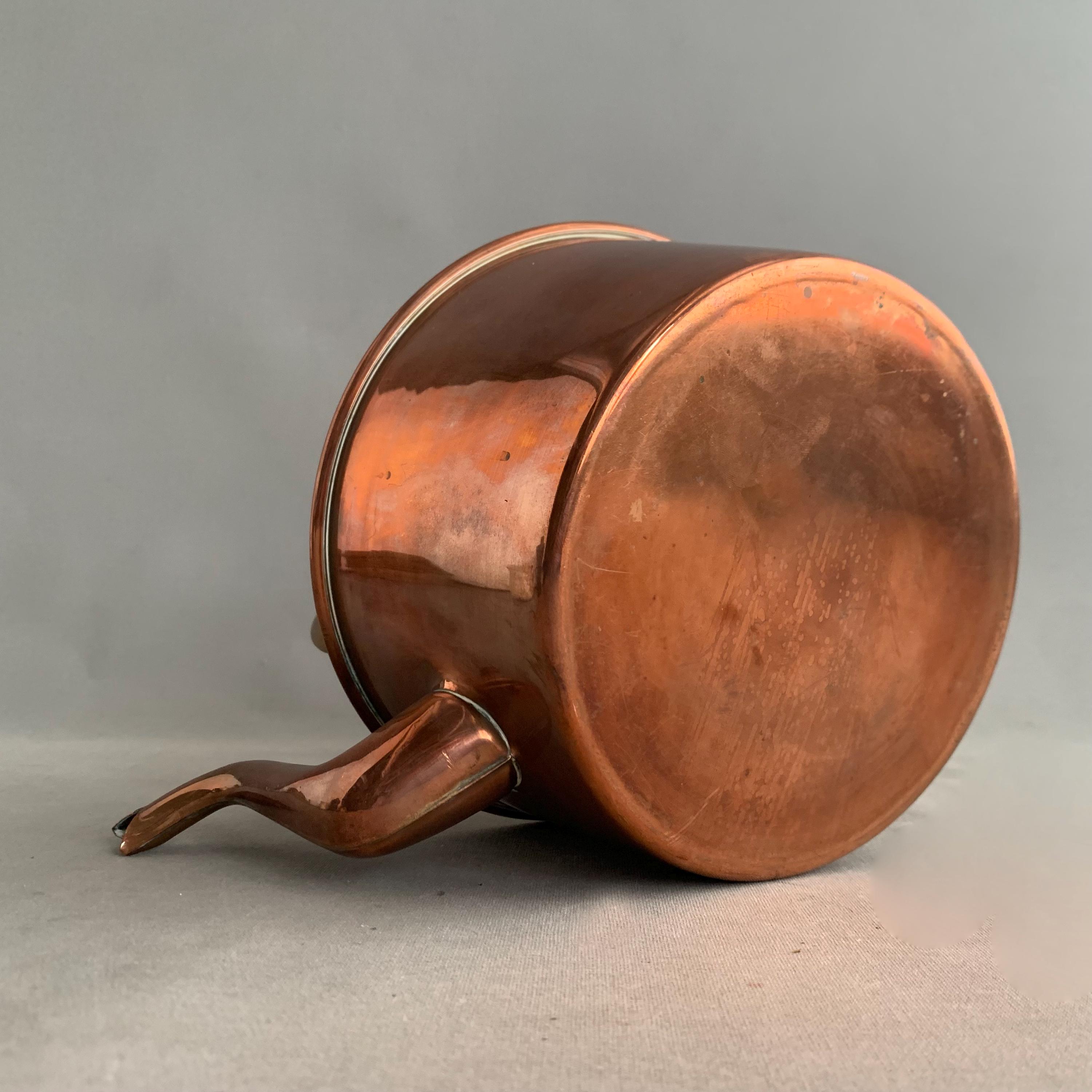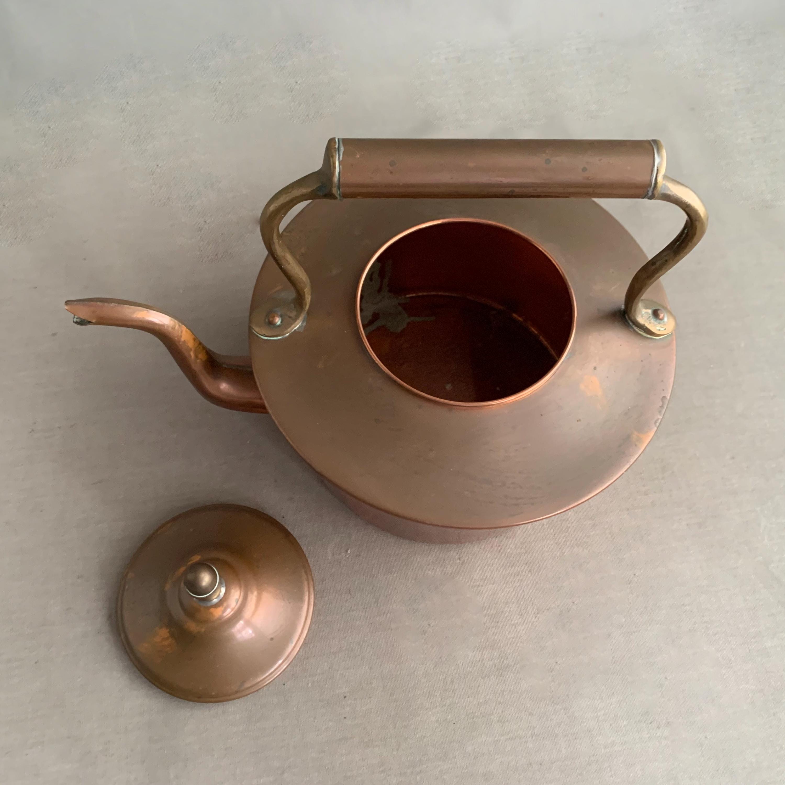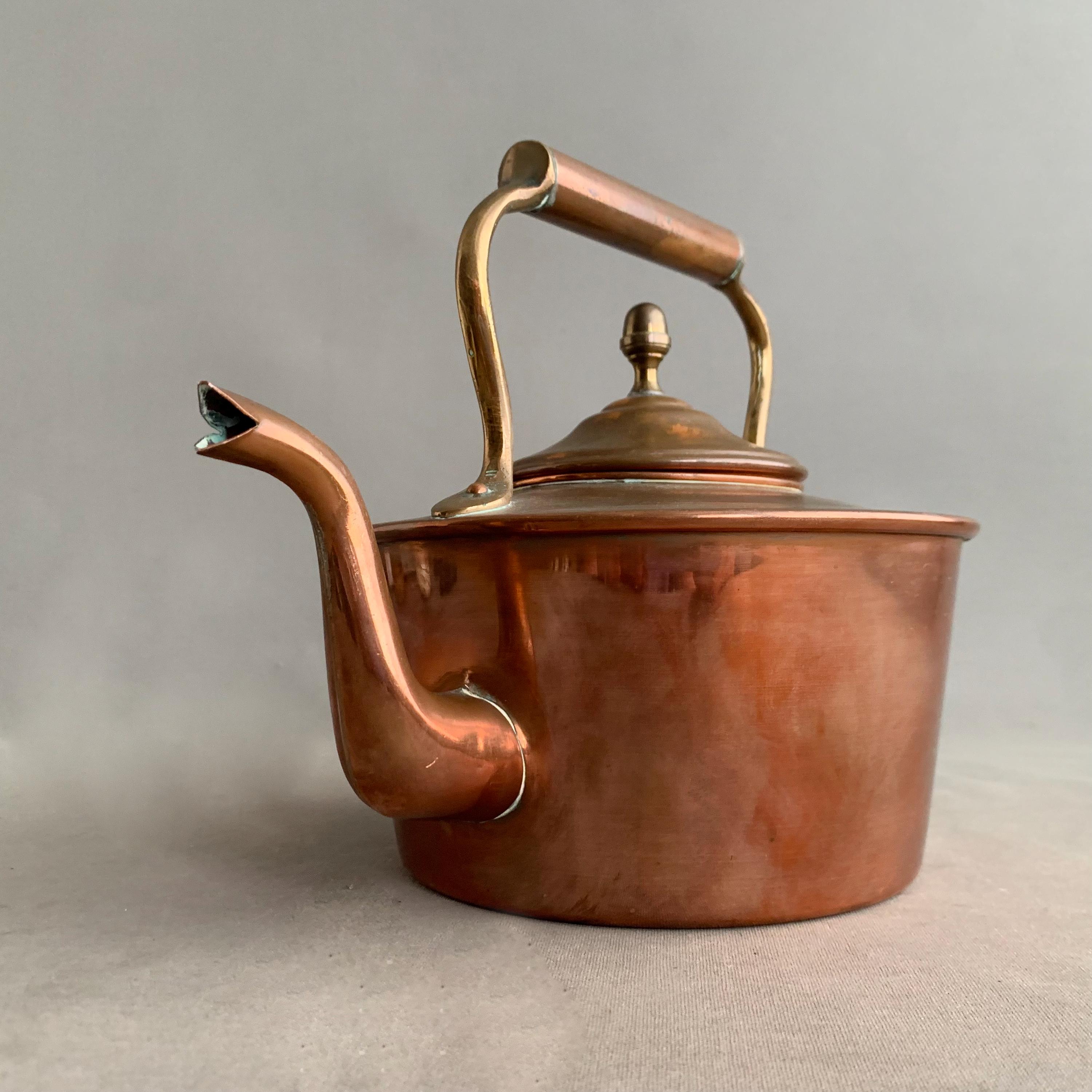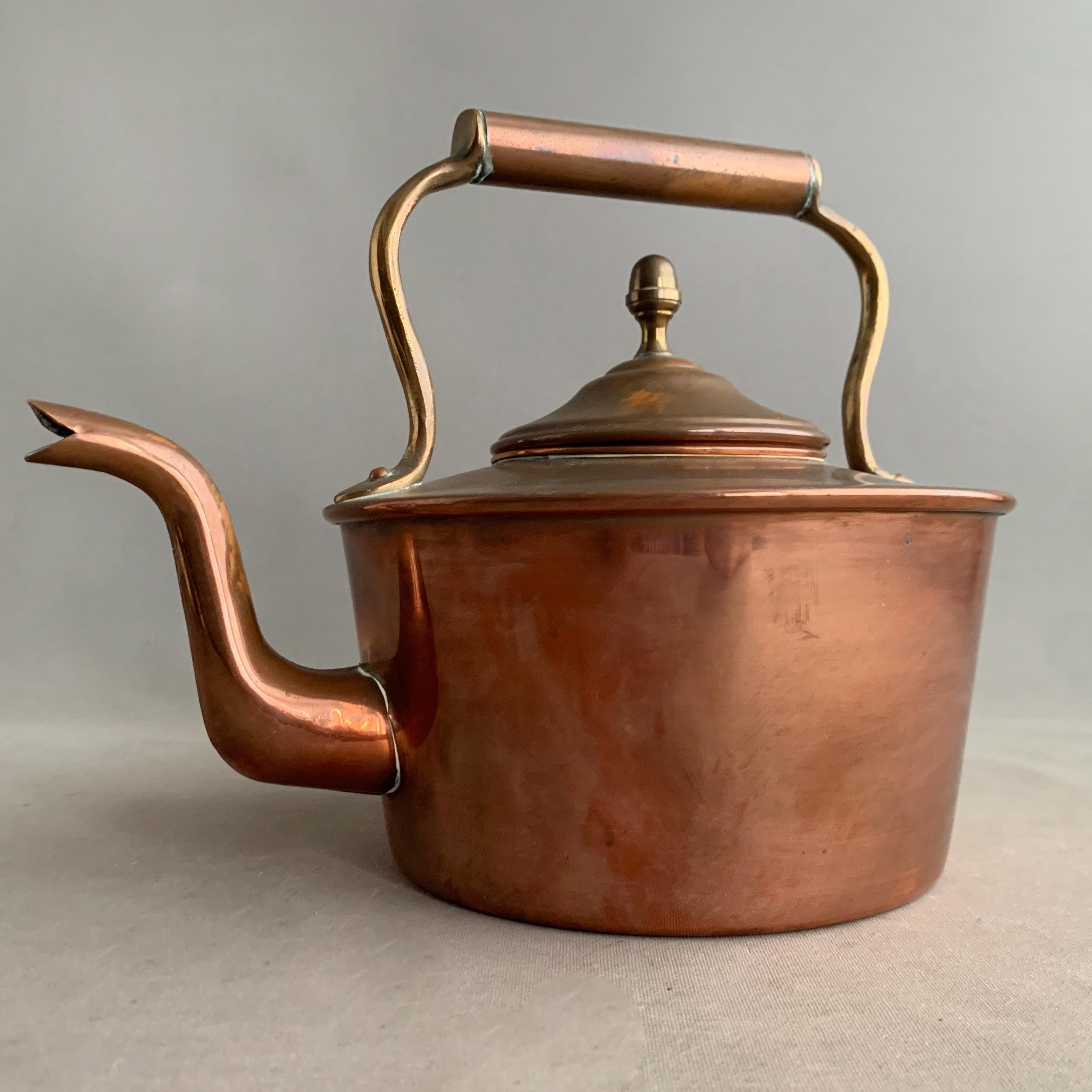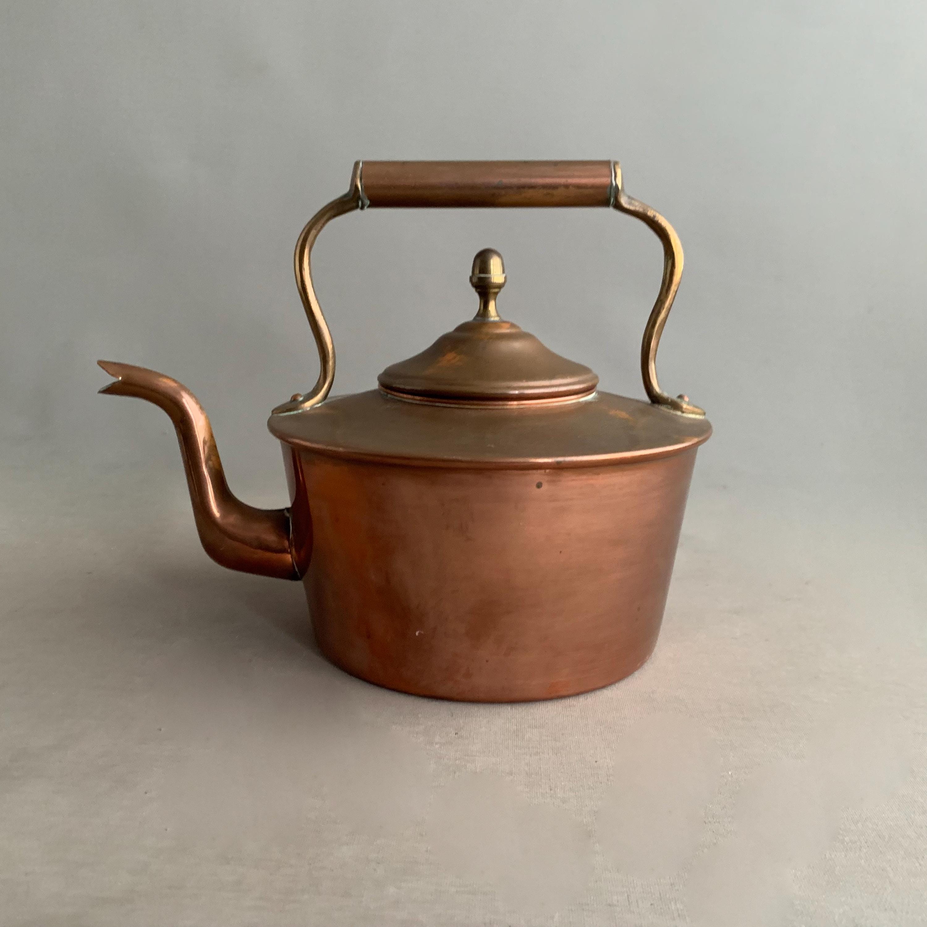 A lovely old copper kettle with solid brass fittings, and an elegant oval form. The shaped spout, riveted brass handle, and lift - off lid with original knob give it a pleasingly decorative form