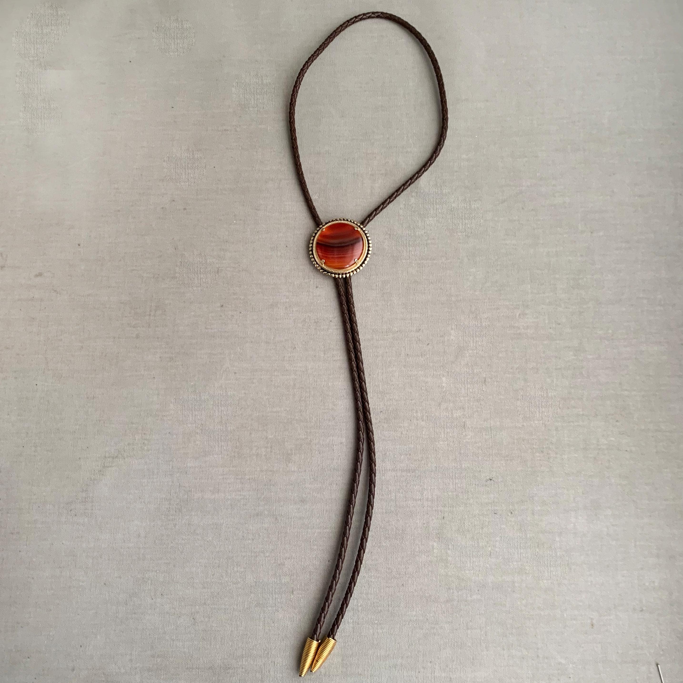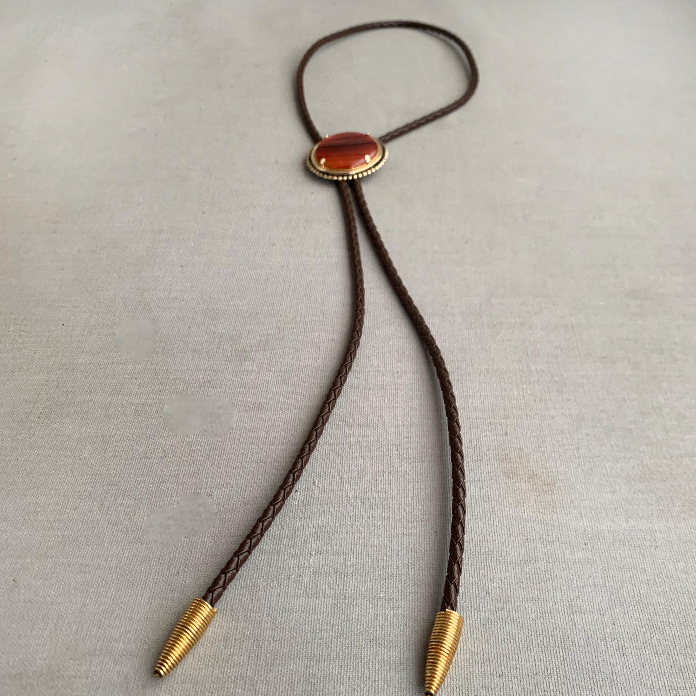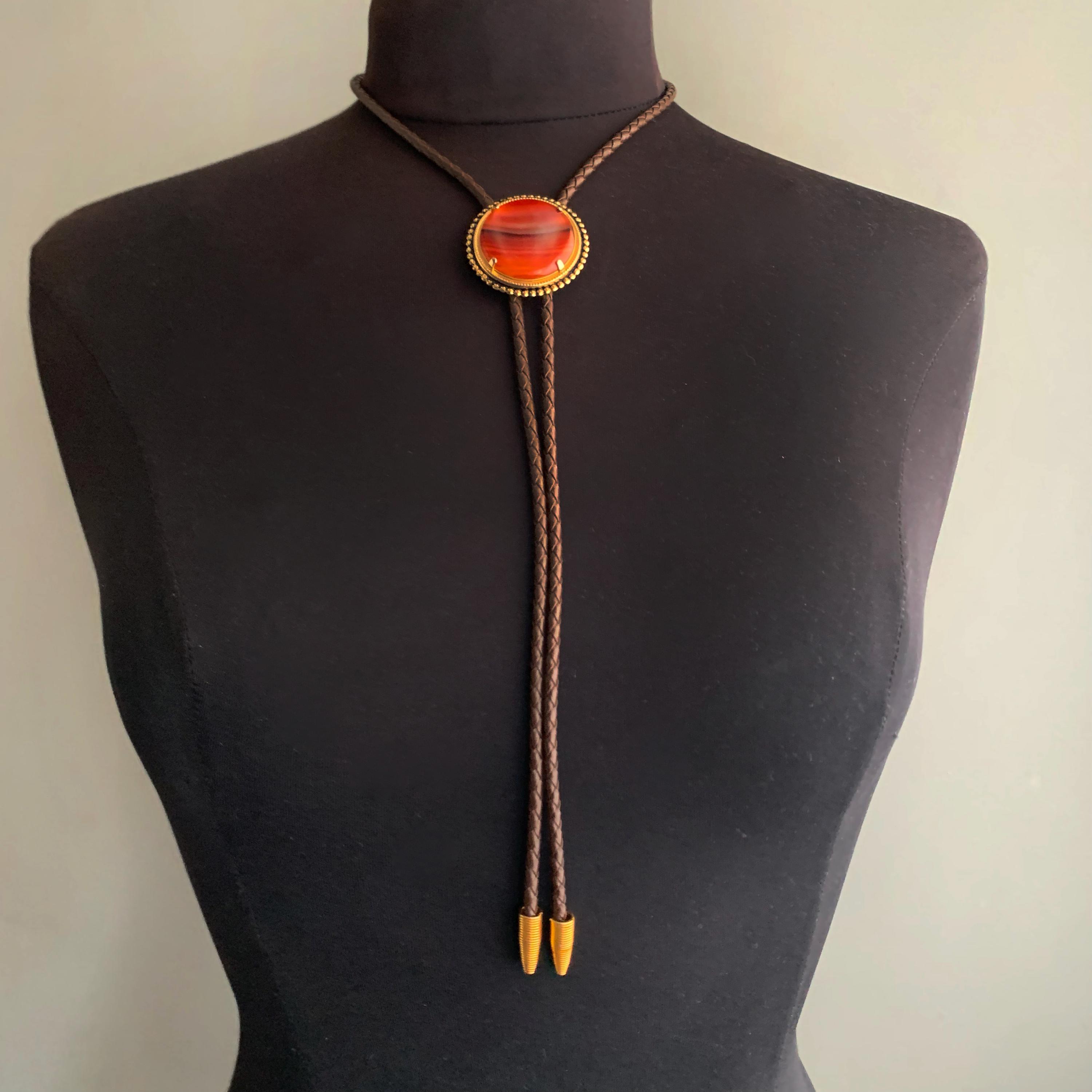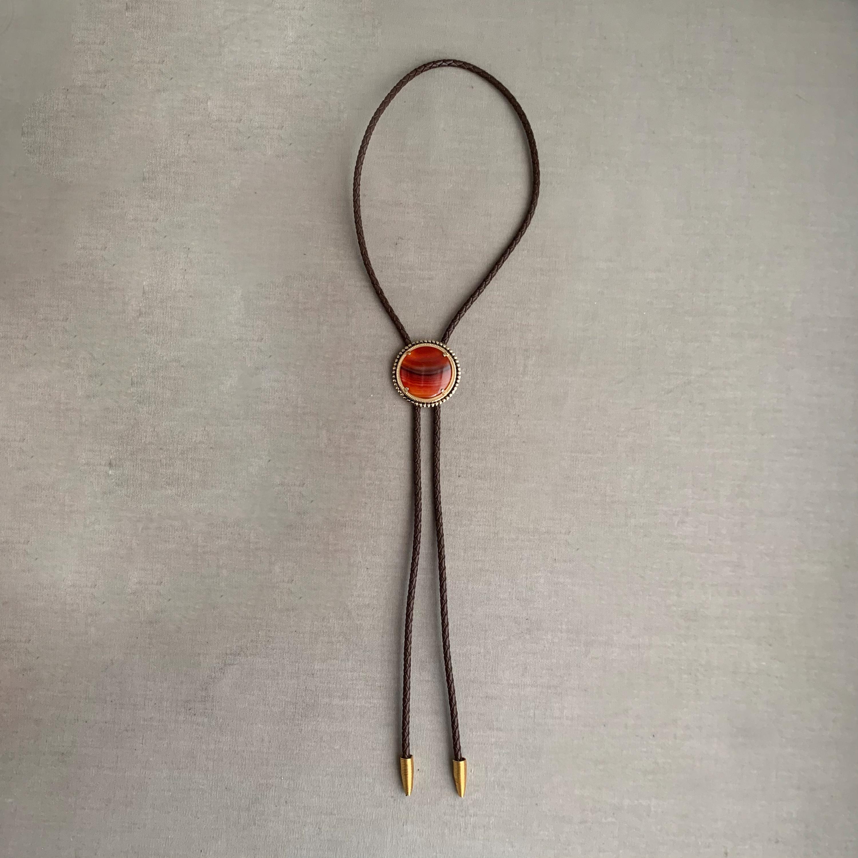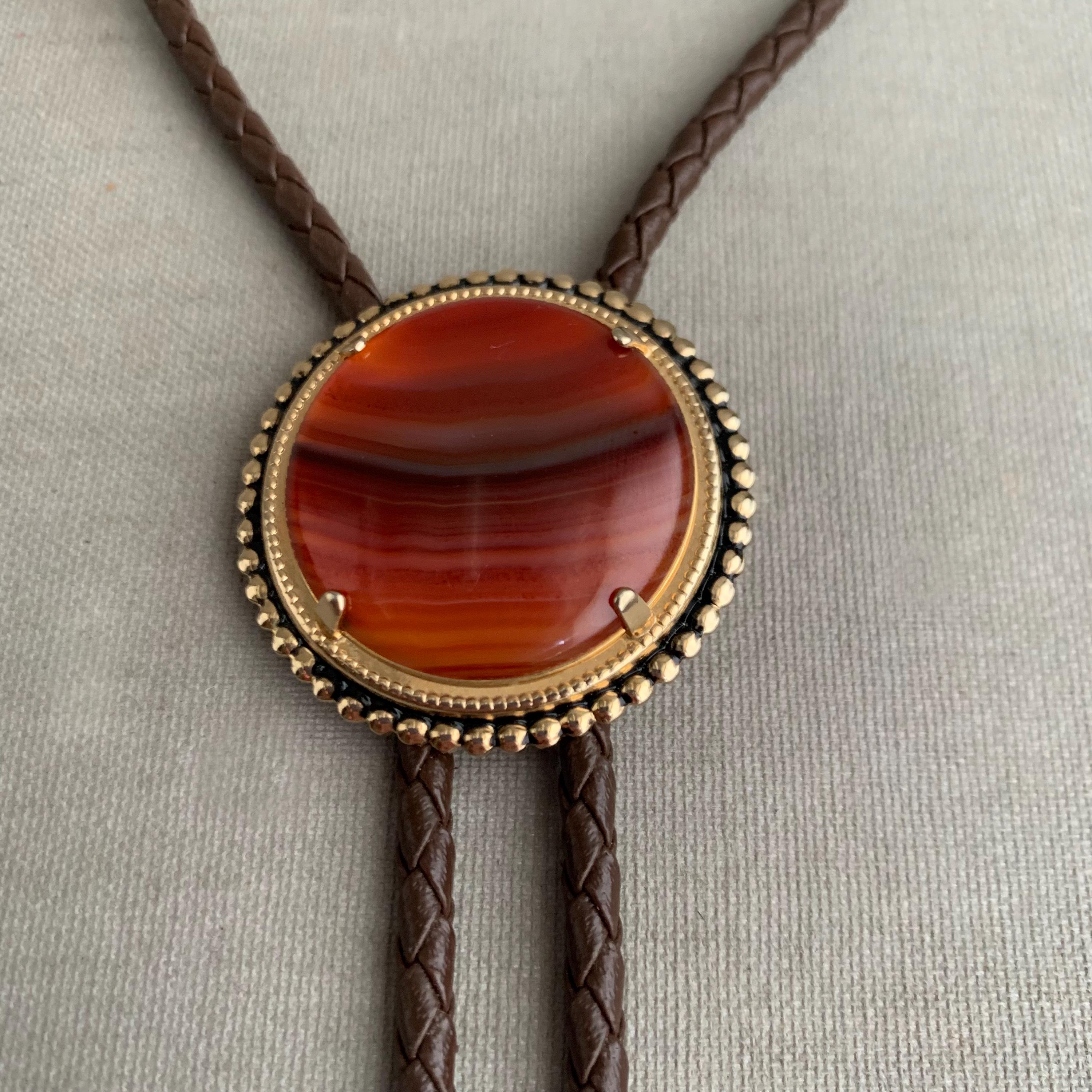 A very attractive bolo tie featuring a circular stone ( carnelian ) on brass base on plaid/ woven leather cord . with coiled bullet shaped brass end weights. nice weight. bolo ties look great on woman too