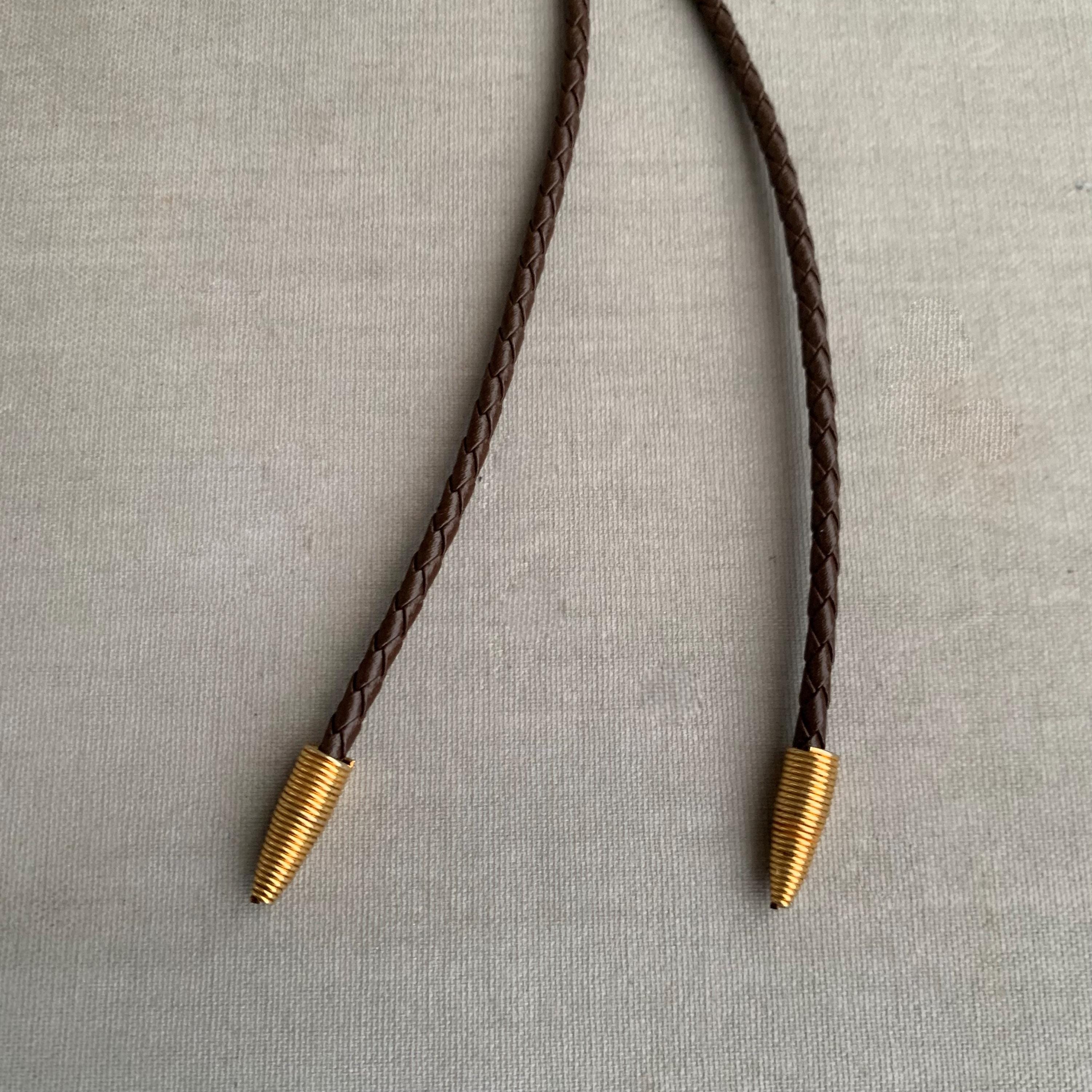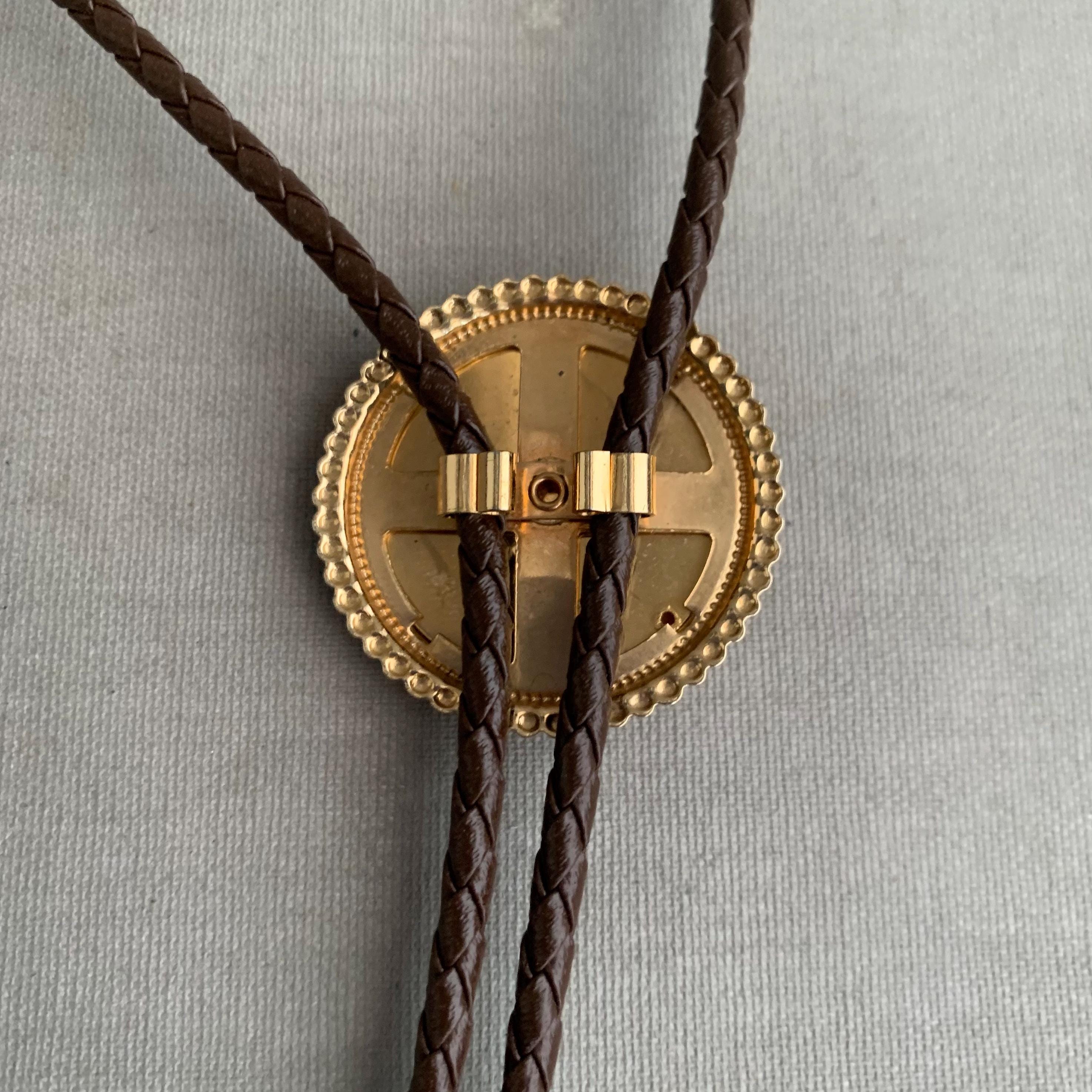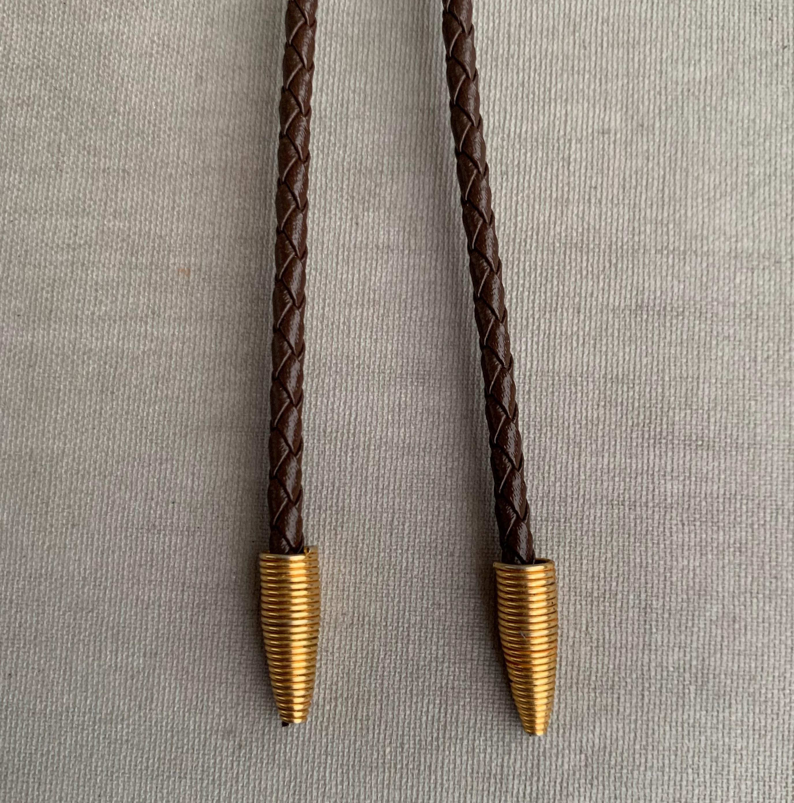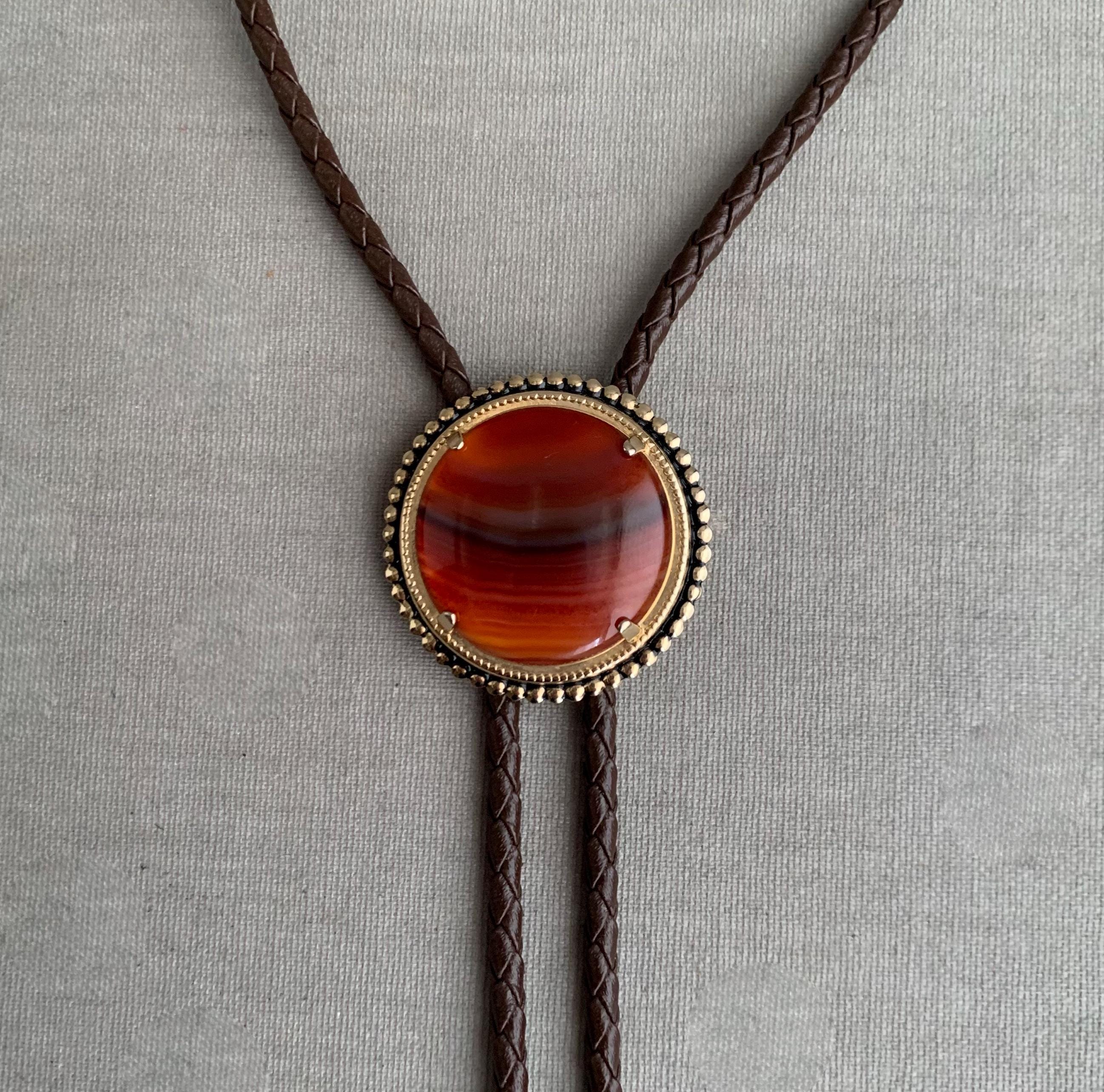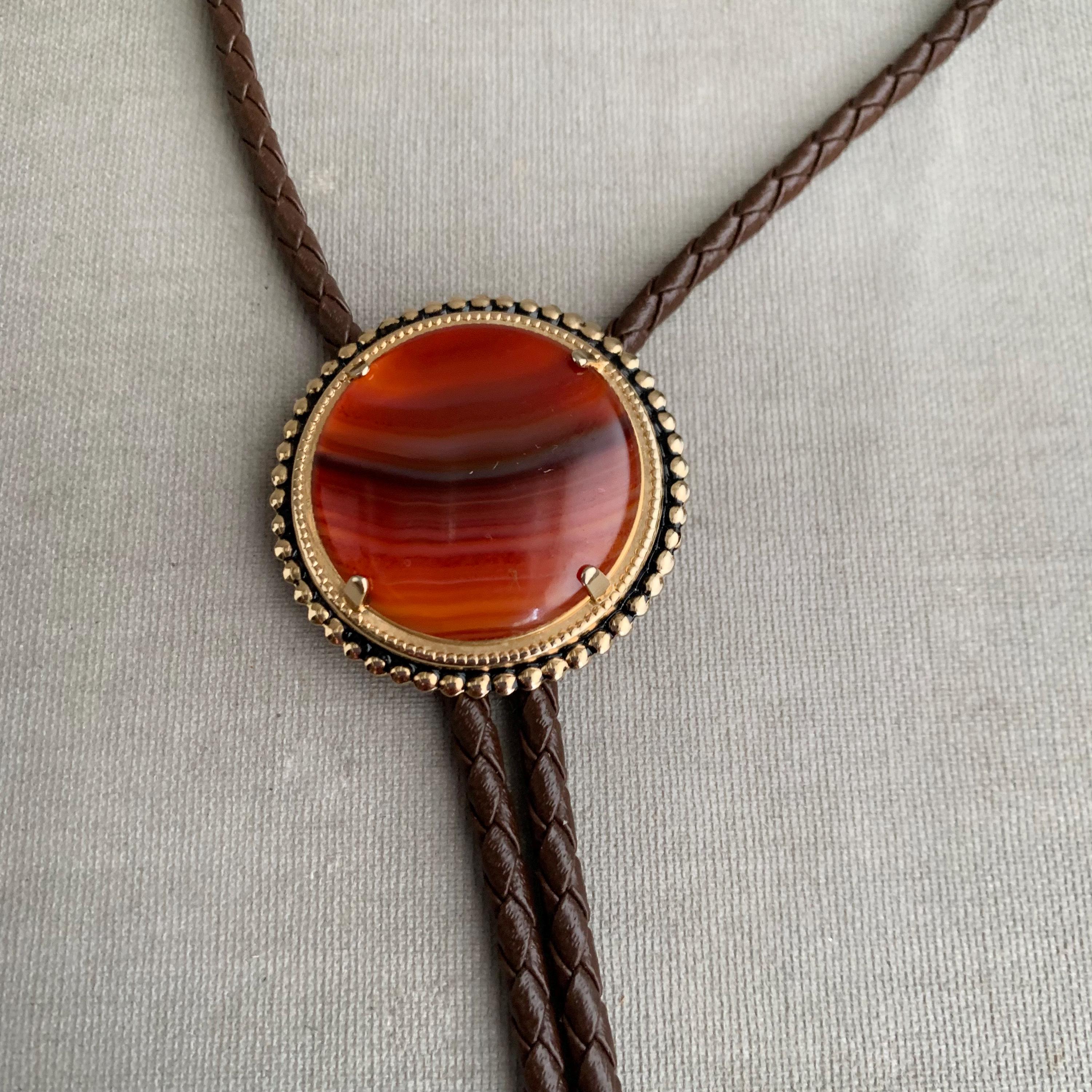 A very attractive bolo tie featuring a circular stone ( carnelian ) on brass base on plaid/ woven leather cord . with coiled bullet shaped brass end weights. nice weight. bolo ties look great on woman too