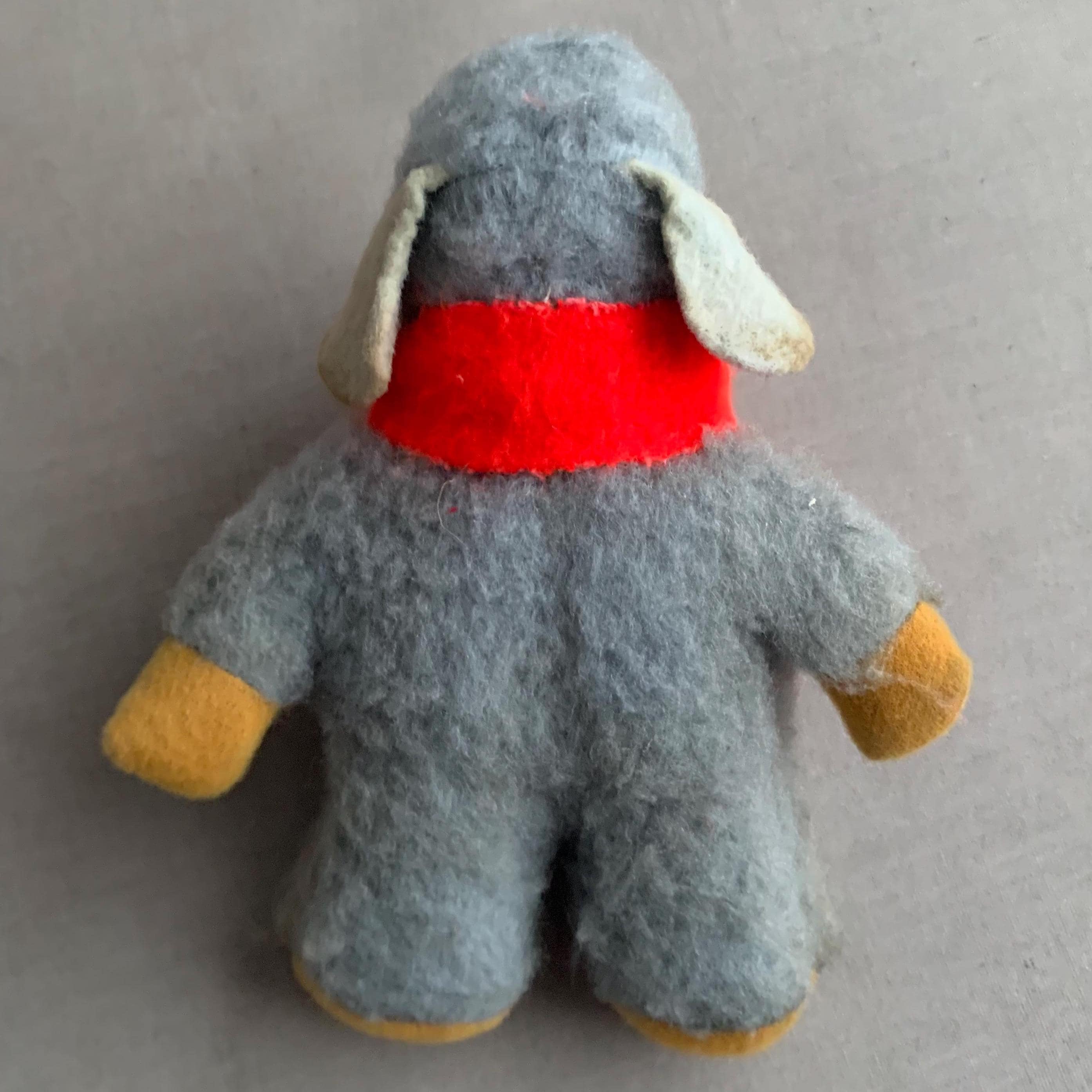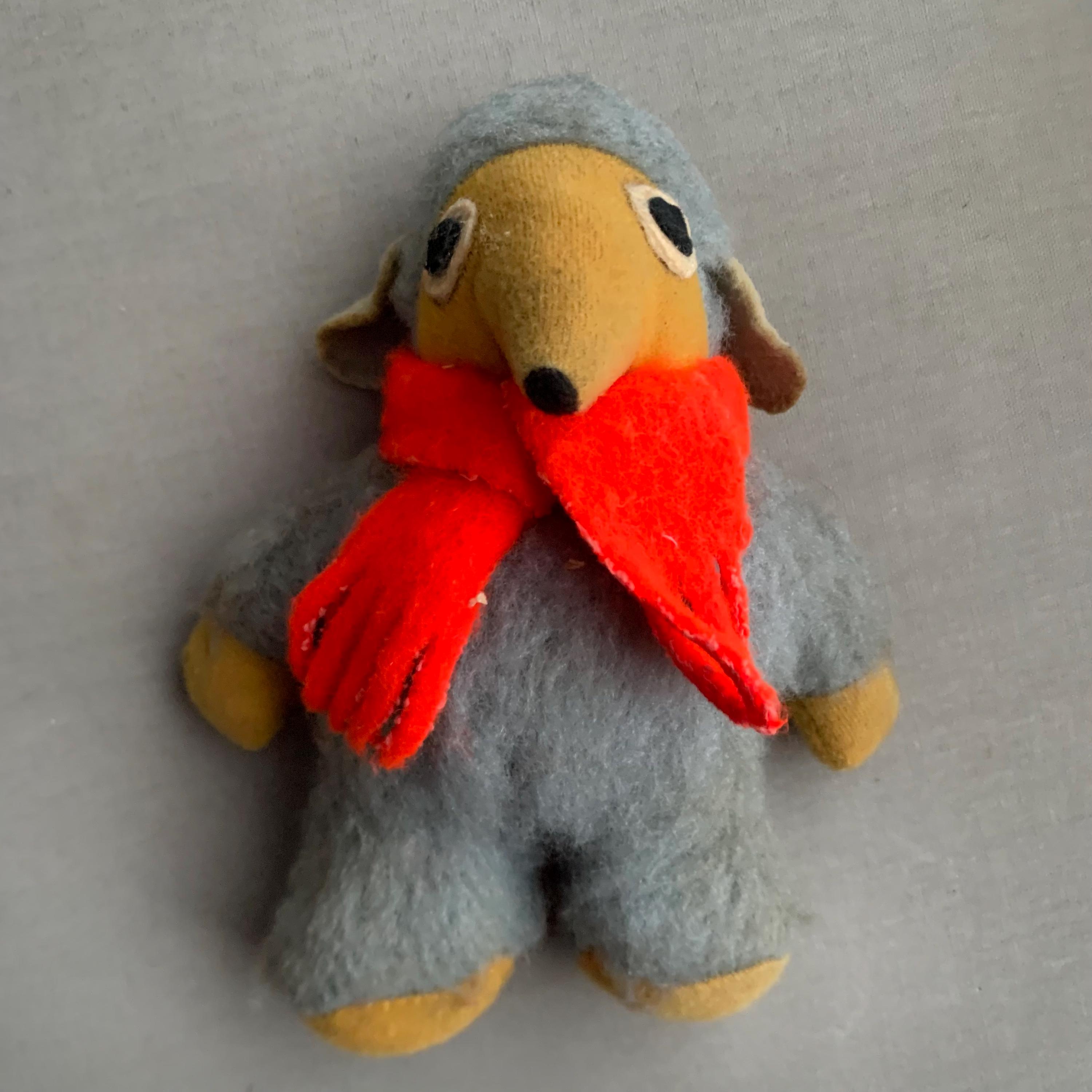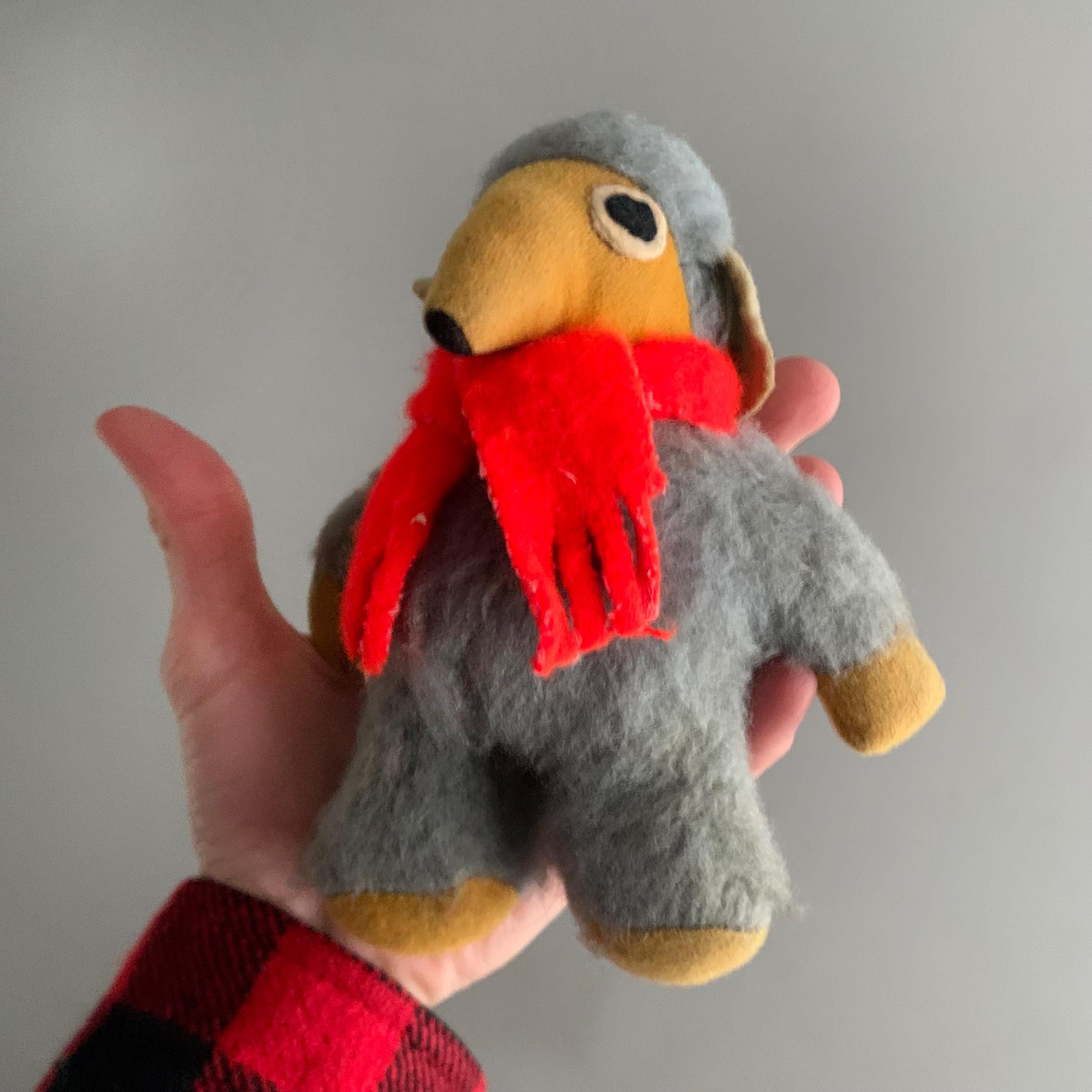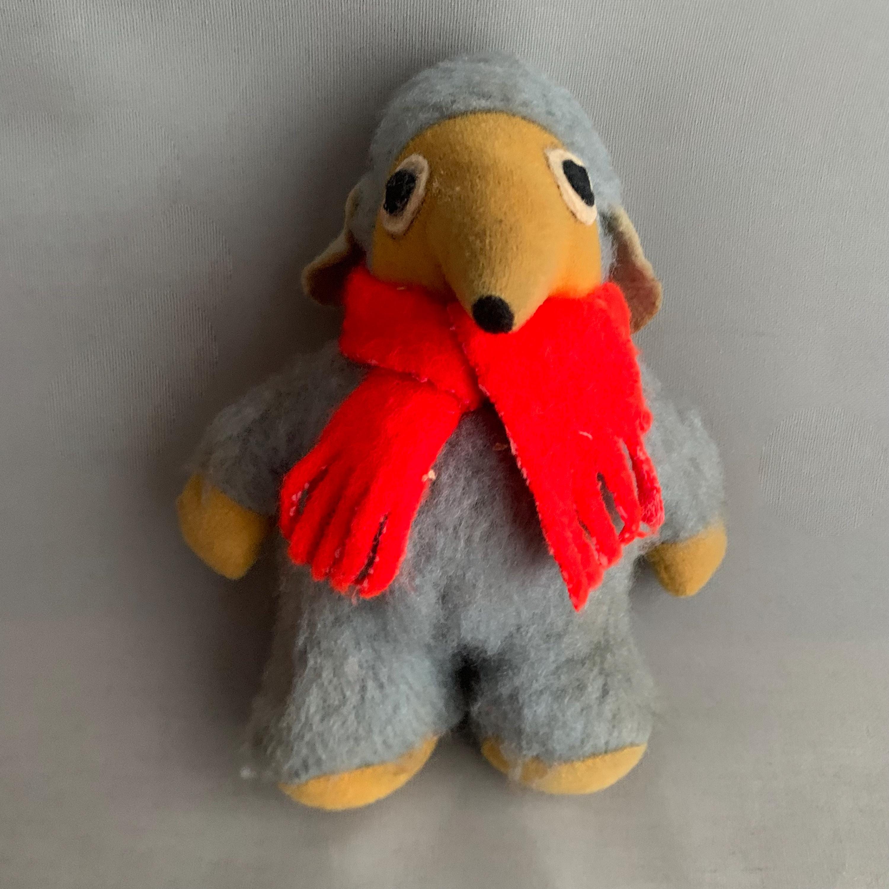 A vintage Orinoco Womble plush toy from the 1970s, which was a popular handmade or early commercial plush character based on the UK children's television series. Orinoco, known for his grey fur, yellow face, and red scarf.