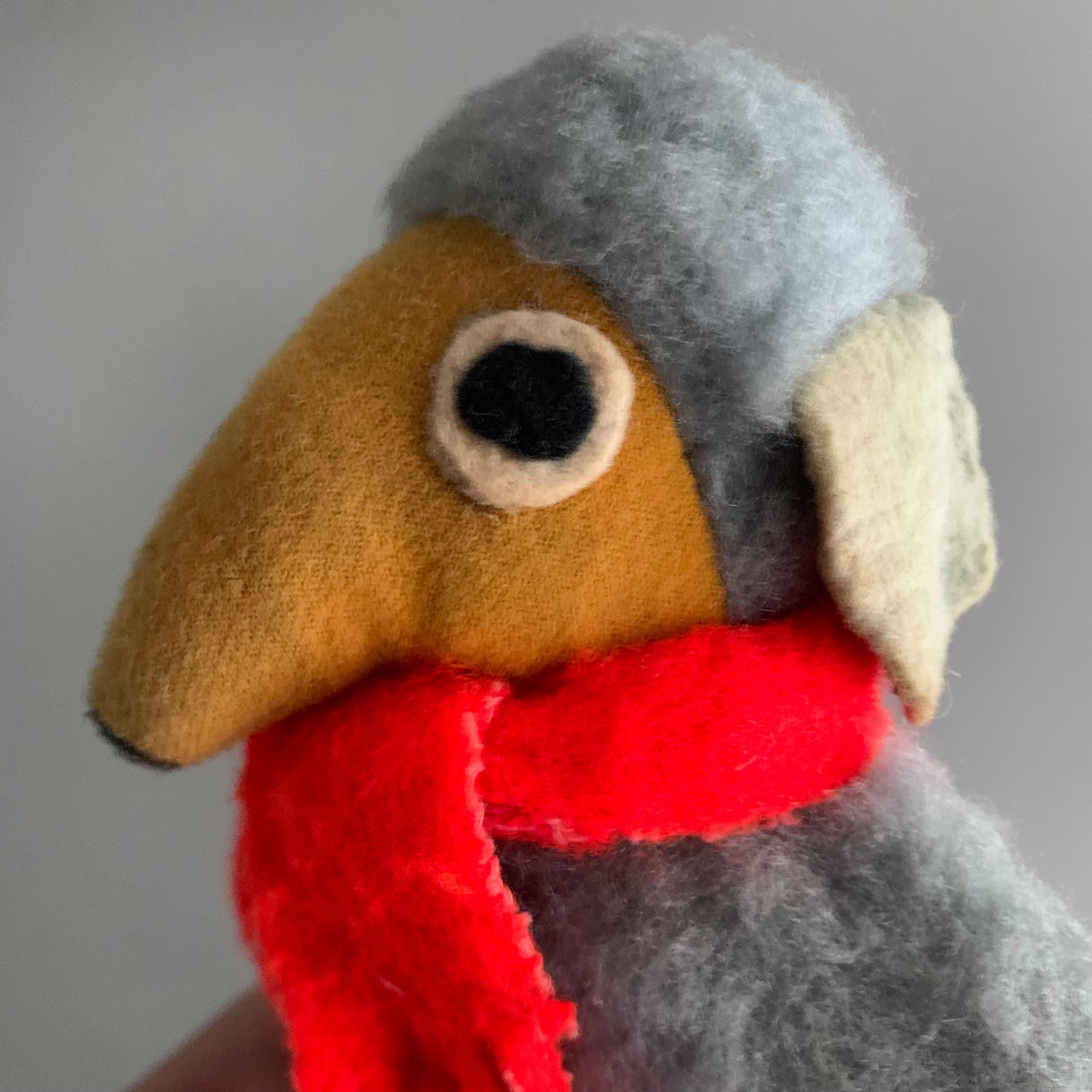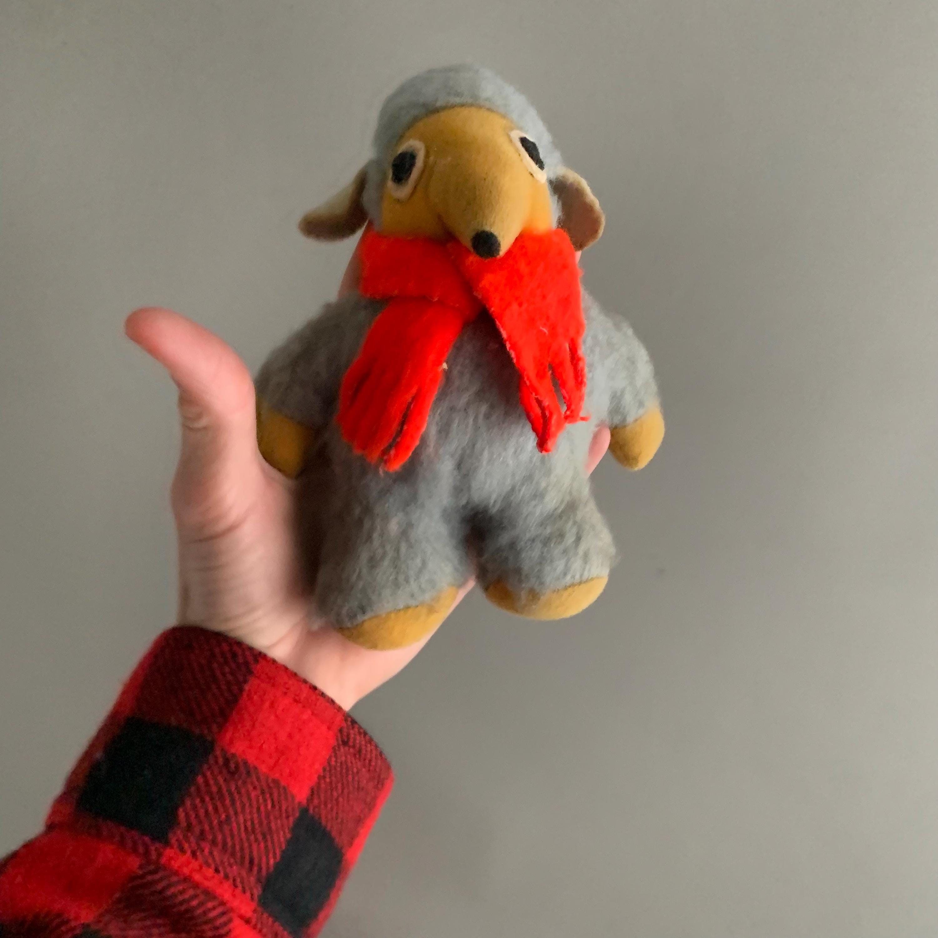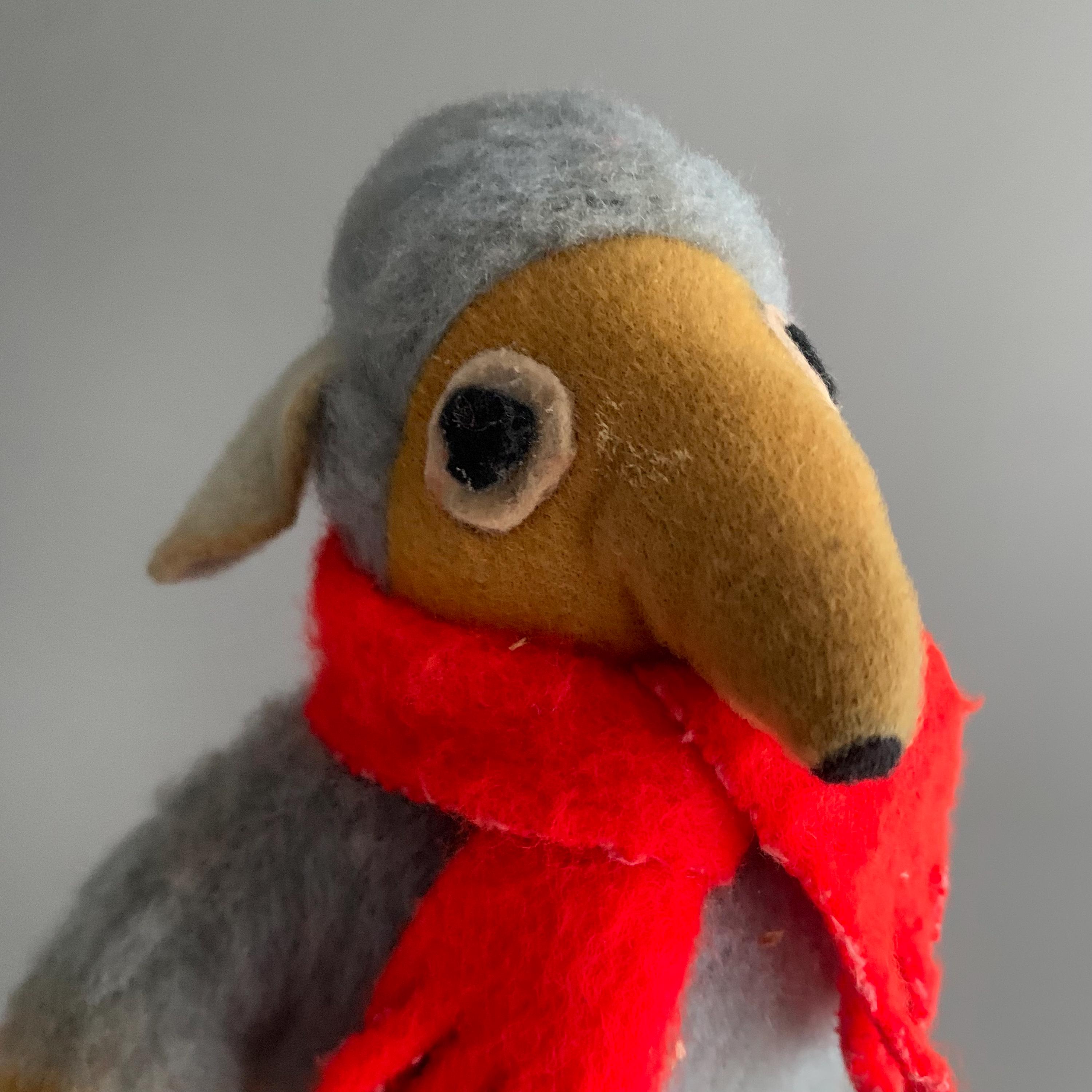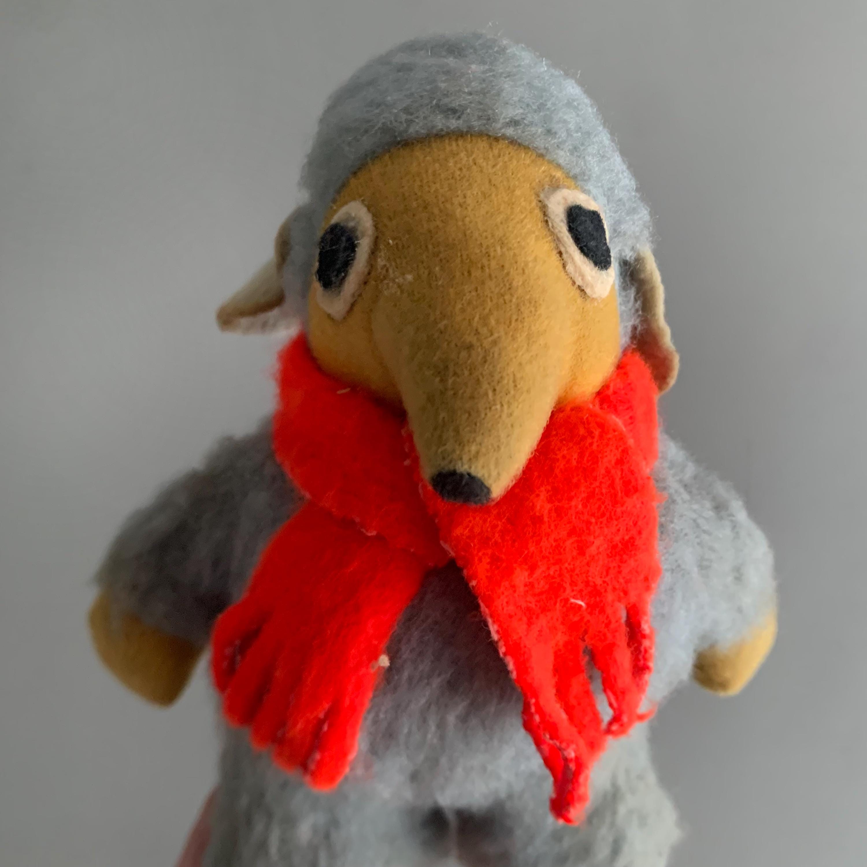 A vintage Orinoco Womble plush toy from the 1970s, which was a popular handmade or early commercial plush character based on the UK children's television series. Orinoco, known for his grey fur, yellow face, and red scarf.