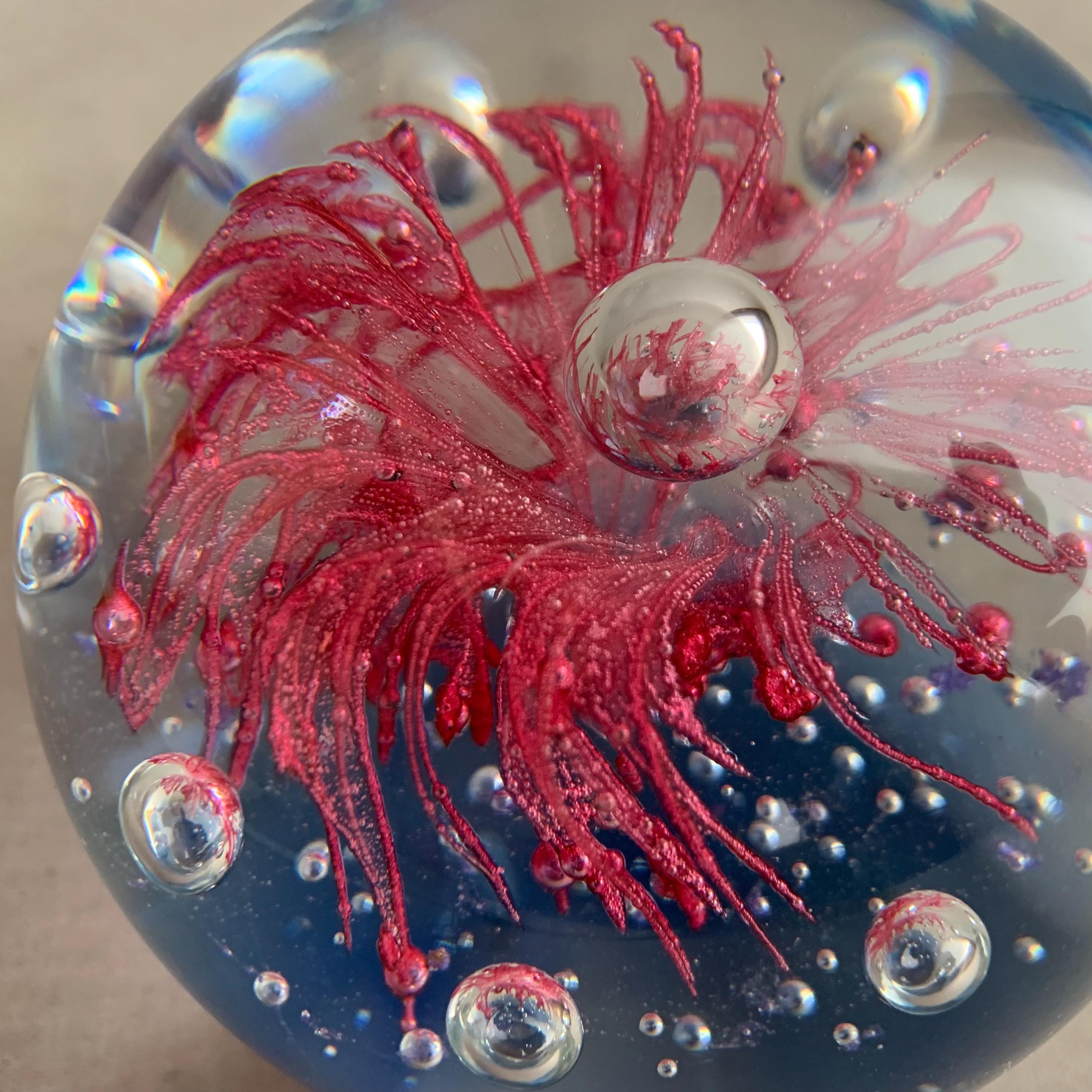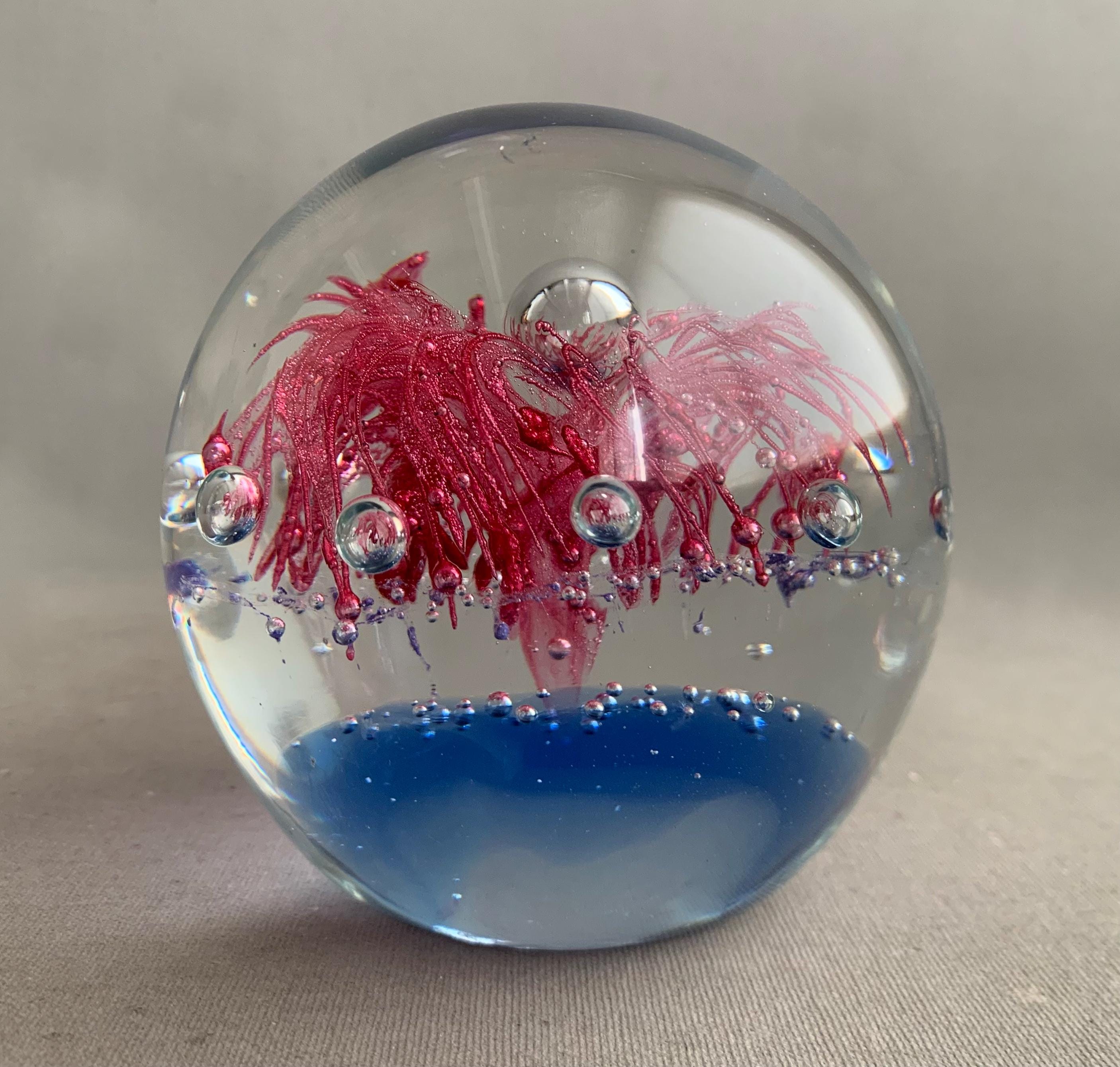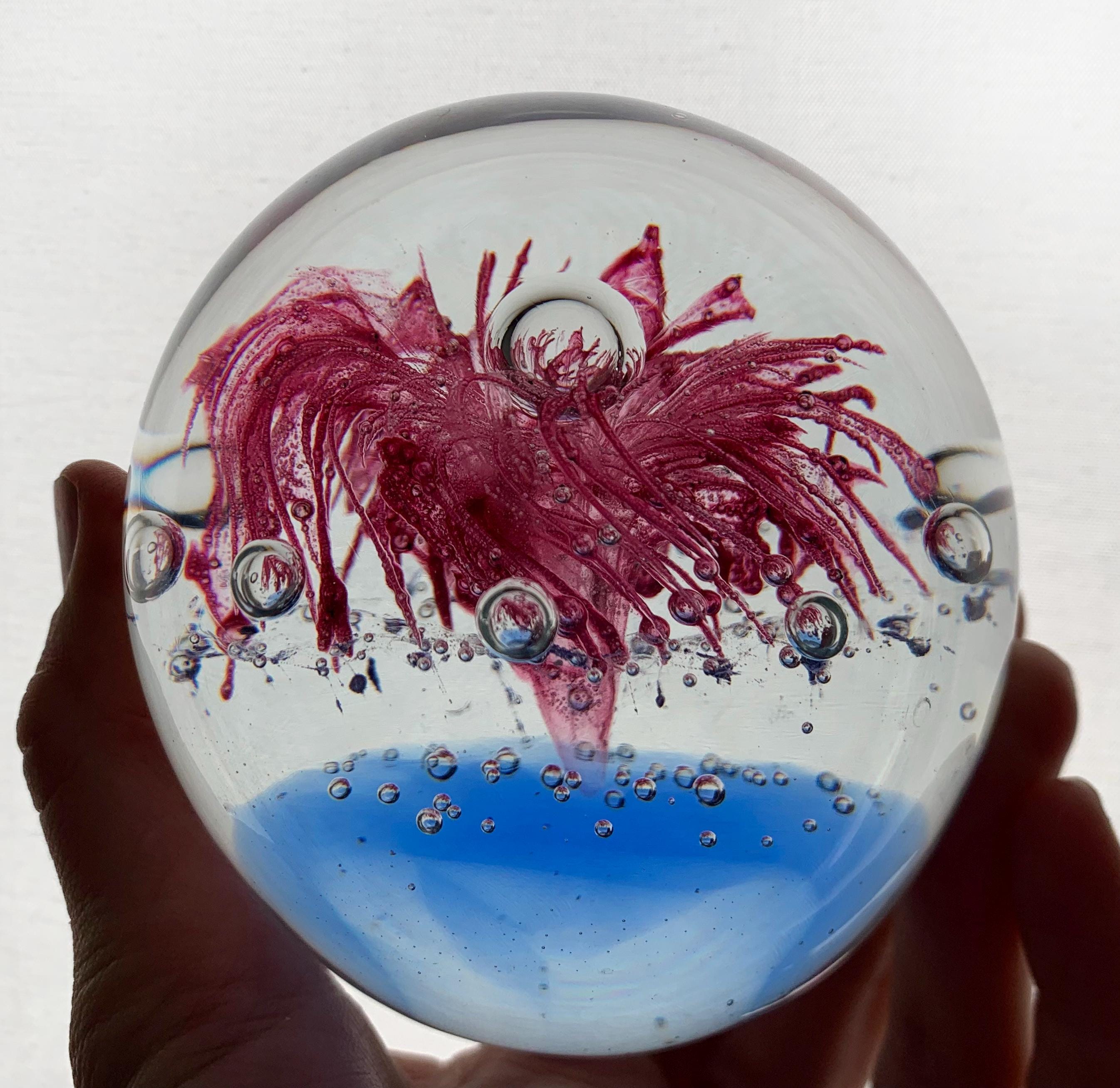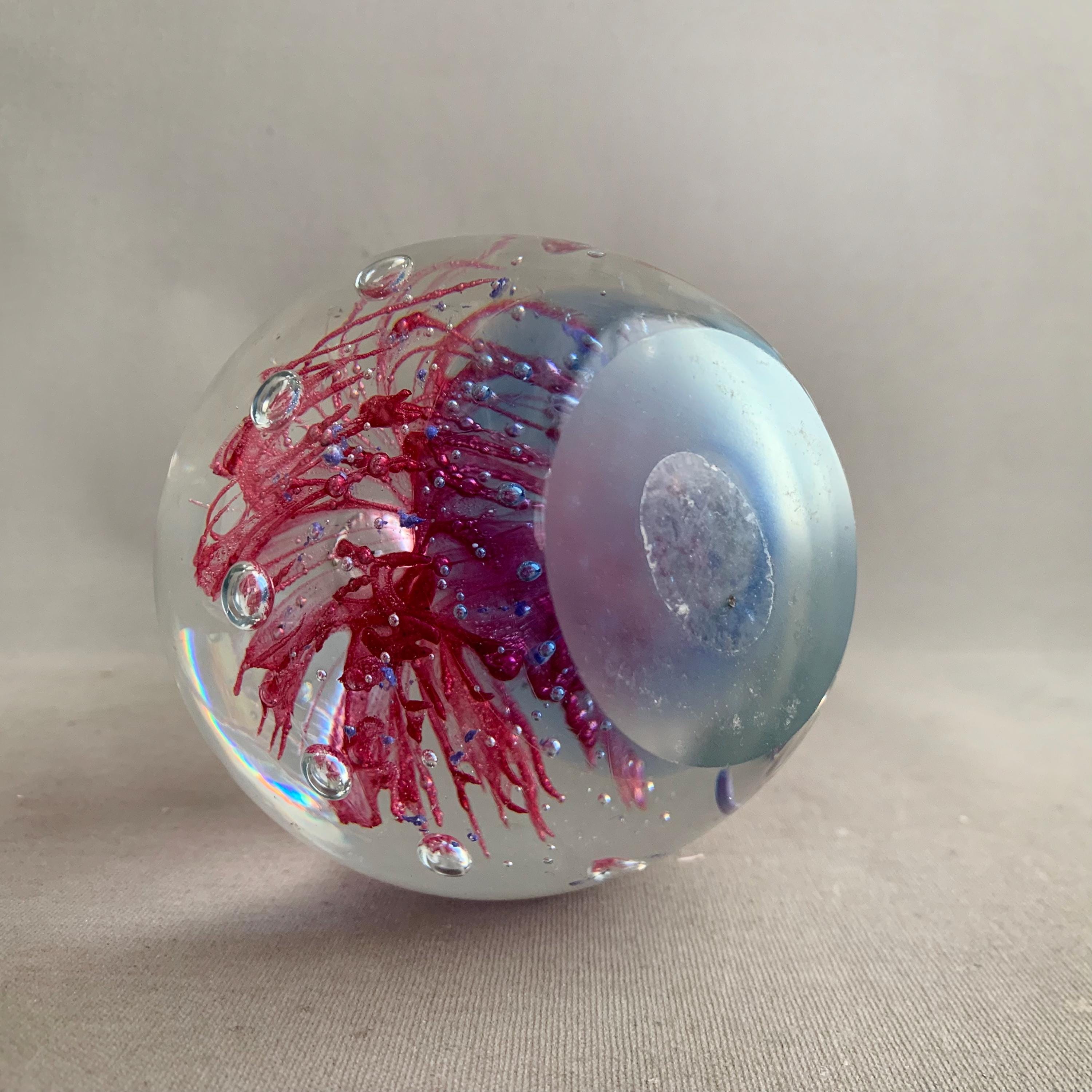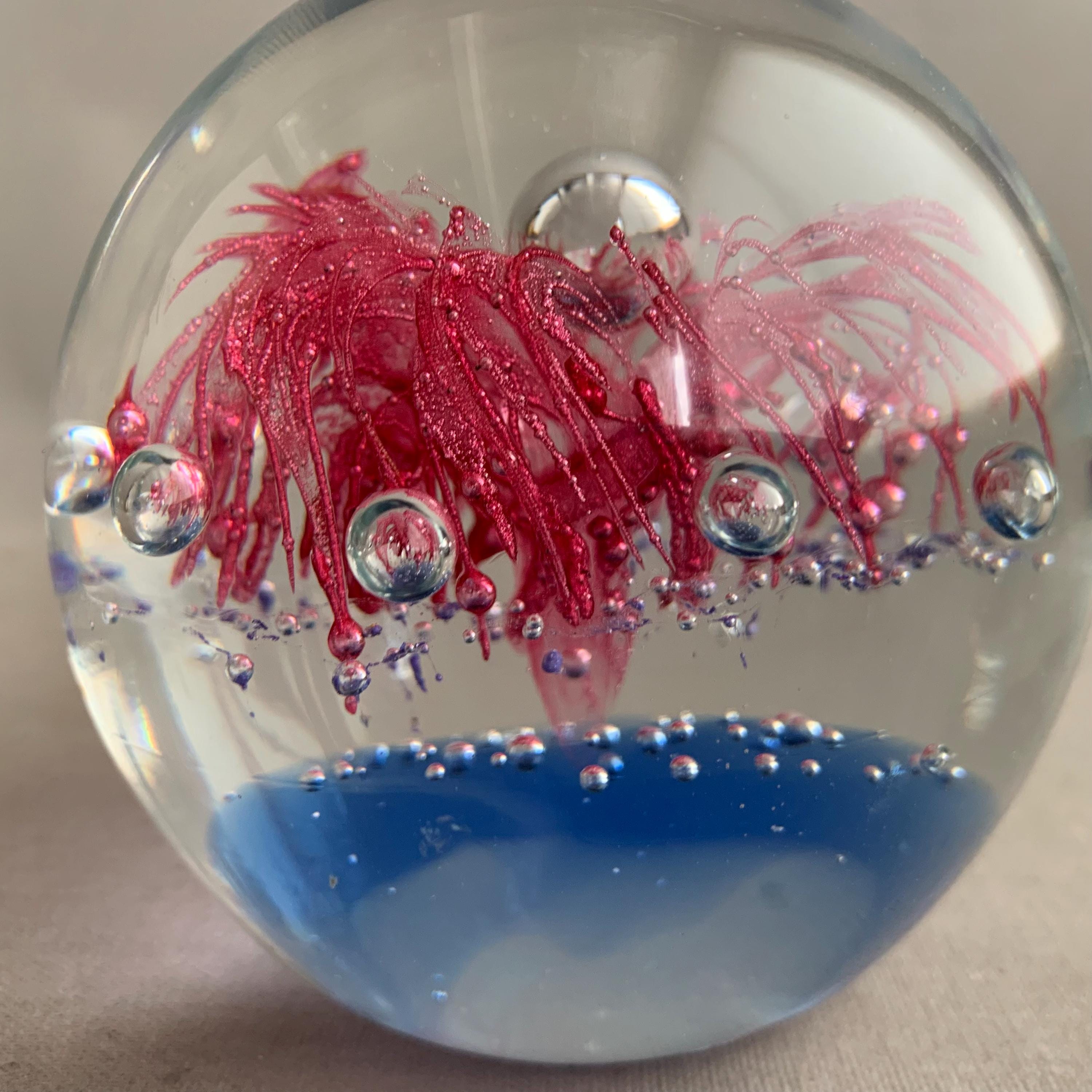 20th Century Art Glass Paperweight Clear With dark pink & blue details amoungst bubbles. looks like something from under the sea
