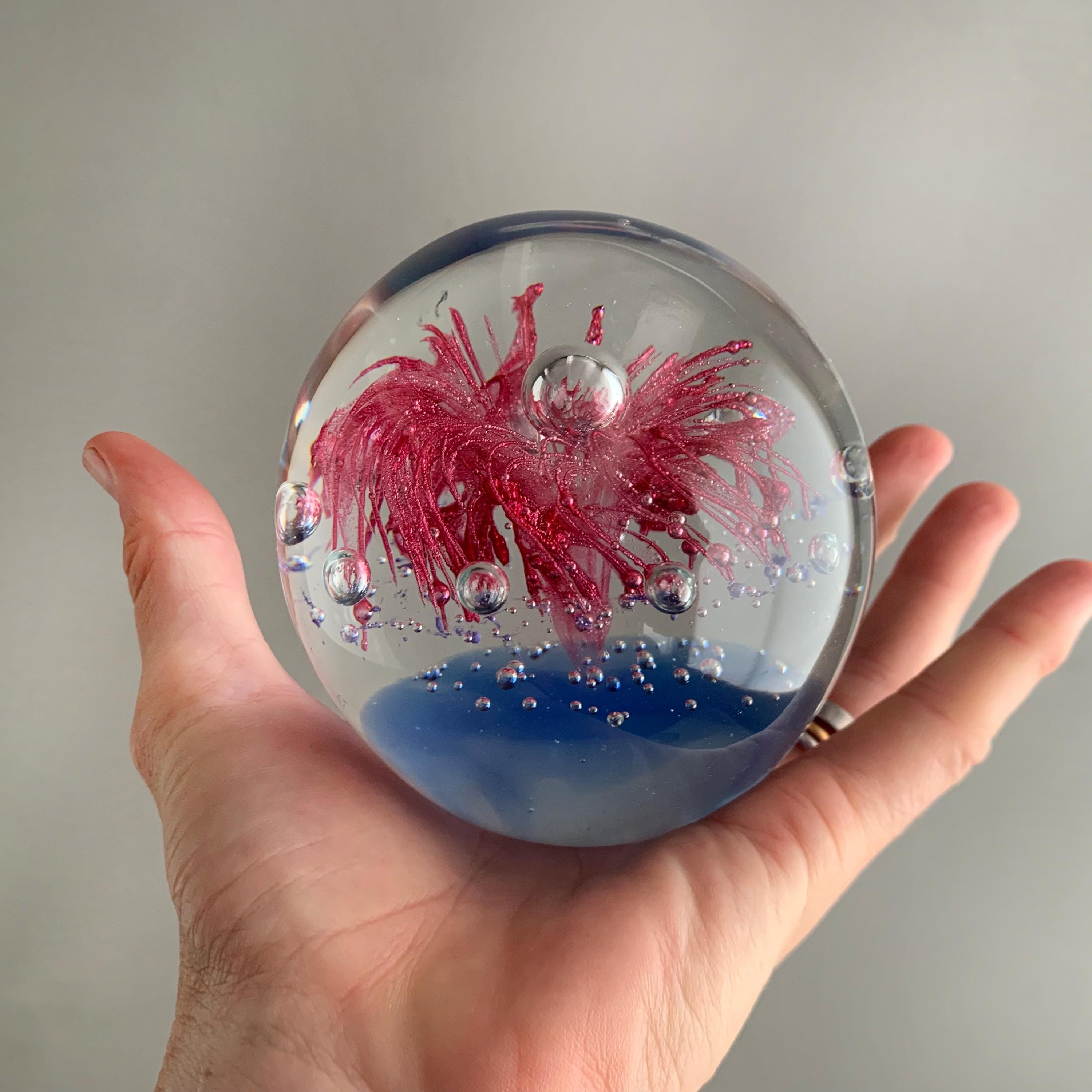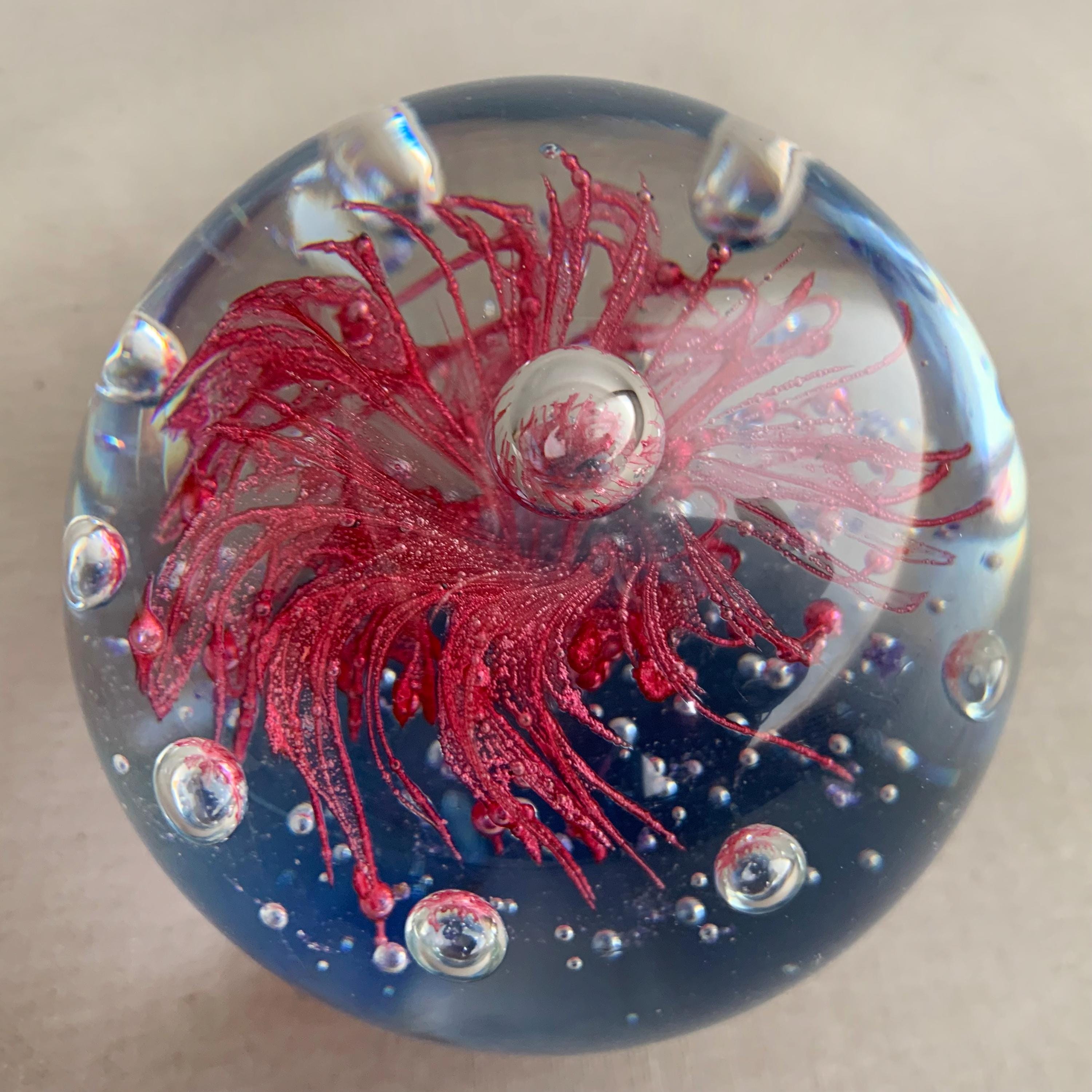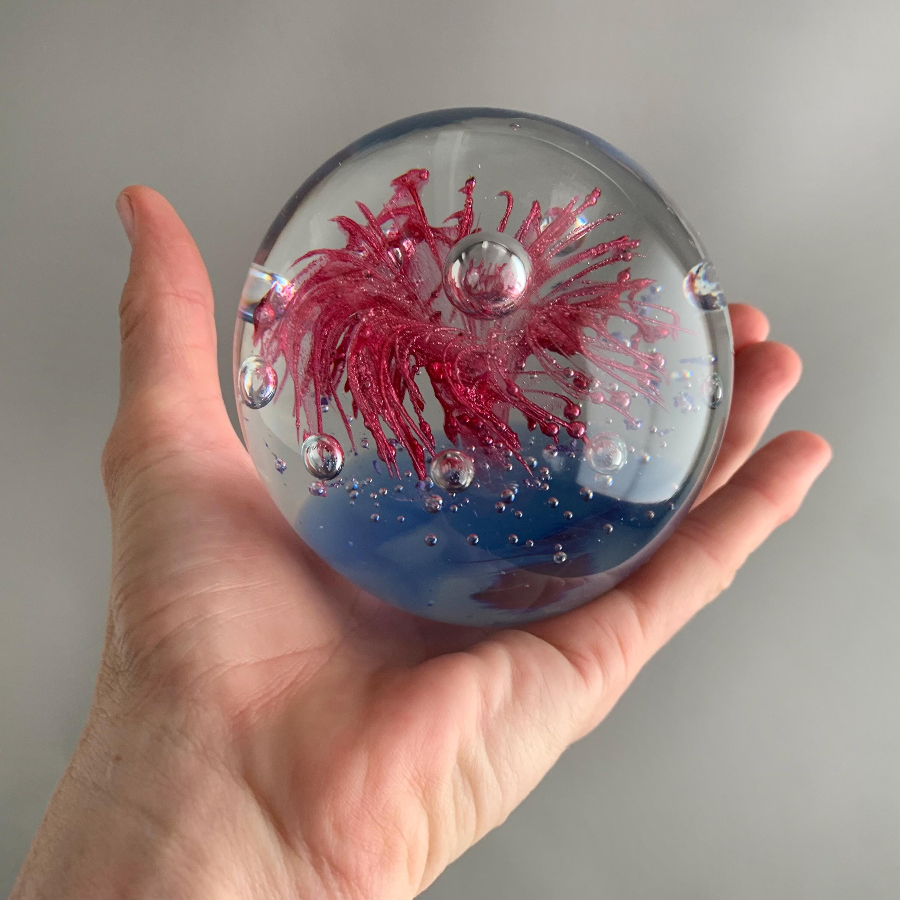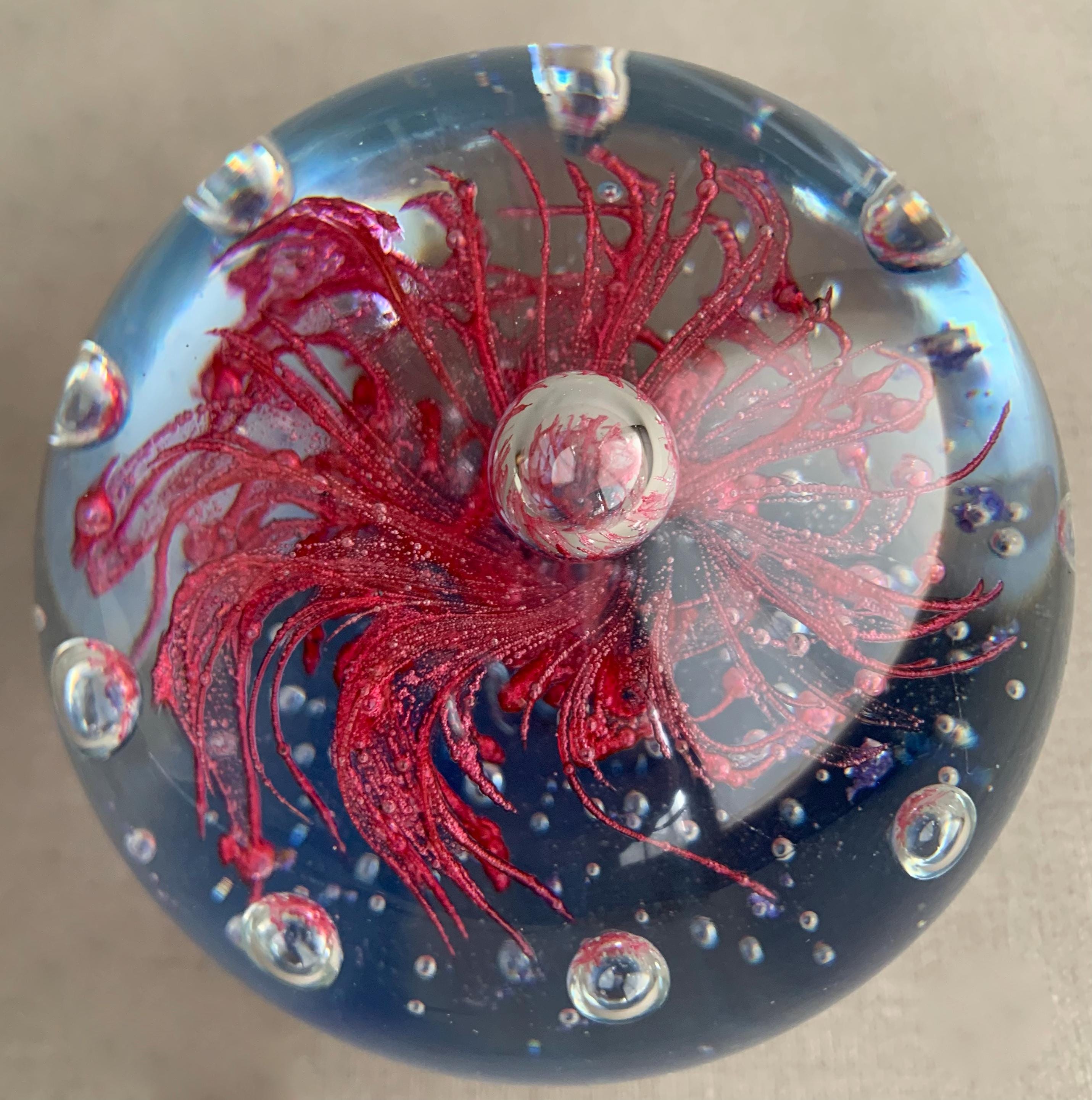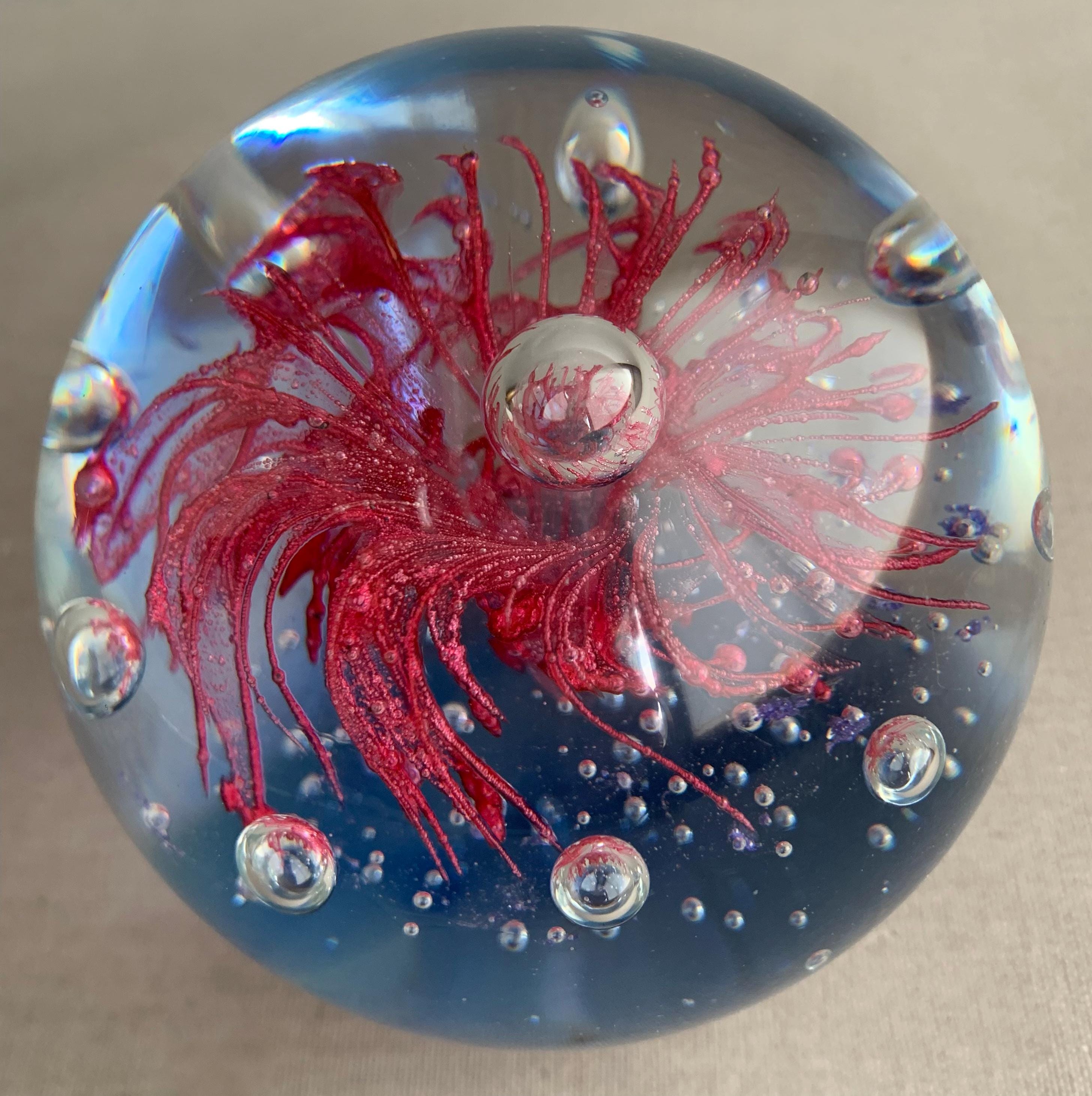 20th Century Art Glass Paperweight Clear With dark pink & blue details amoungst bubbles. looks like something from under the sea