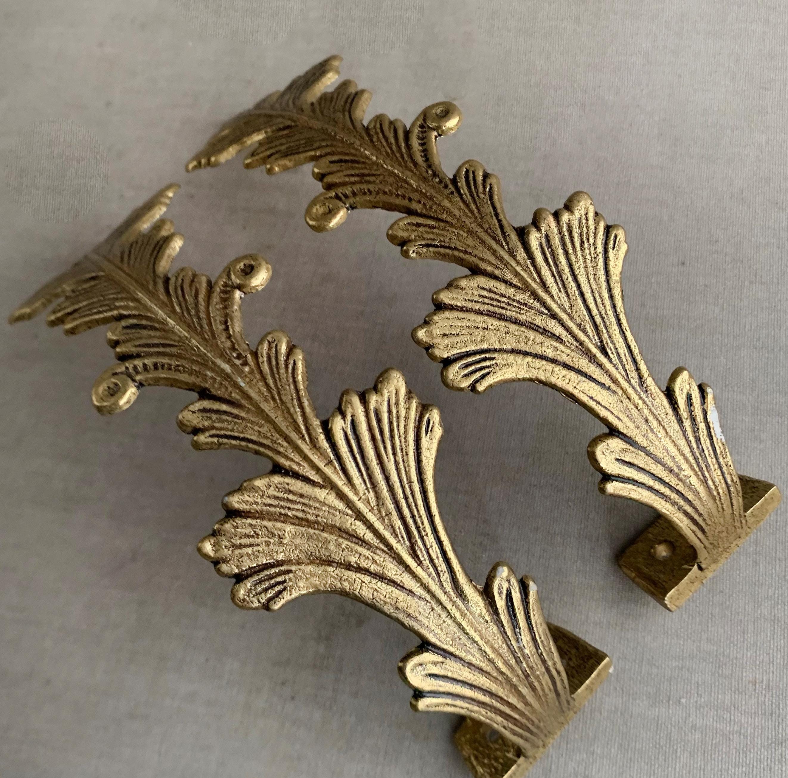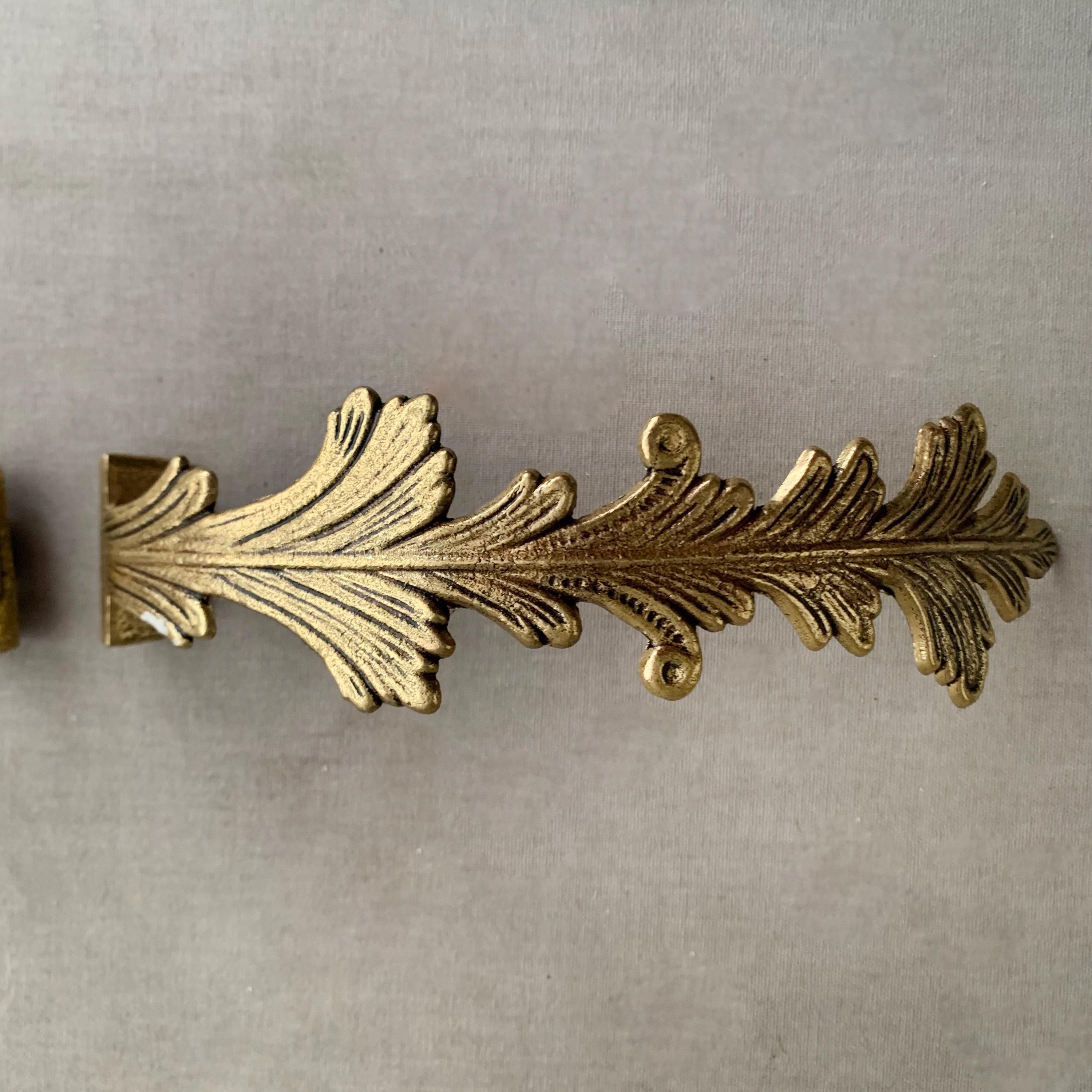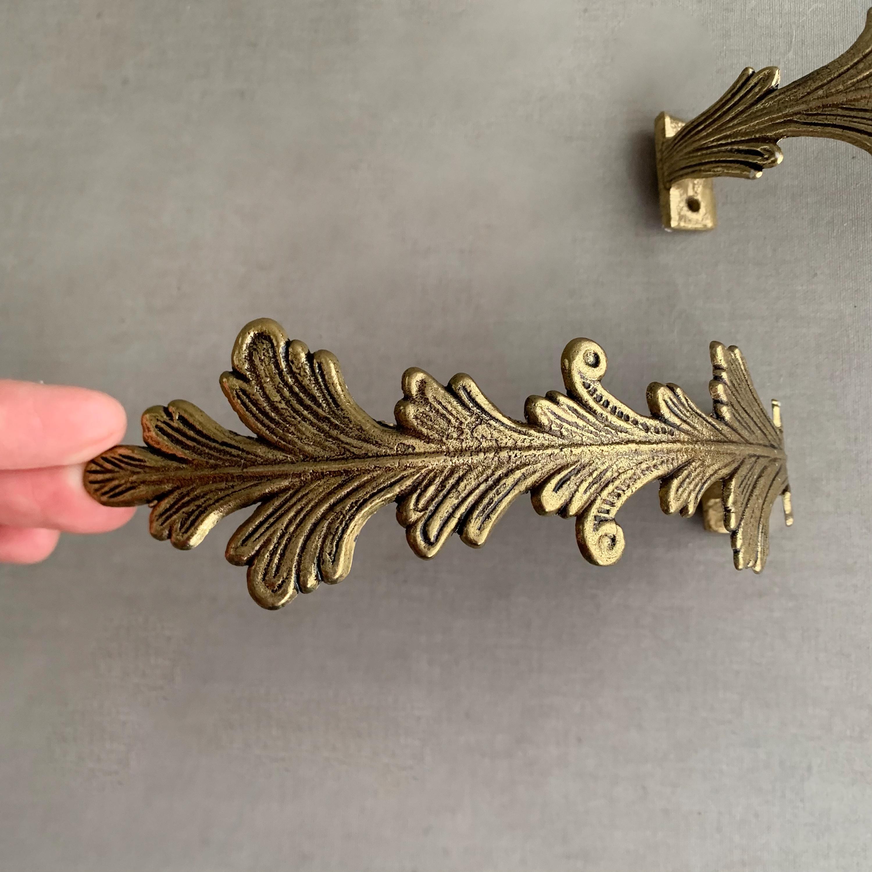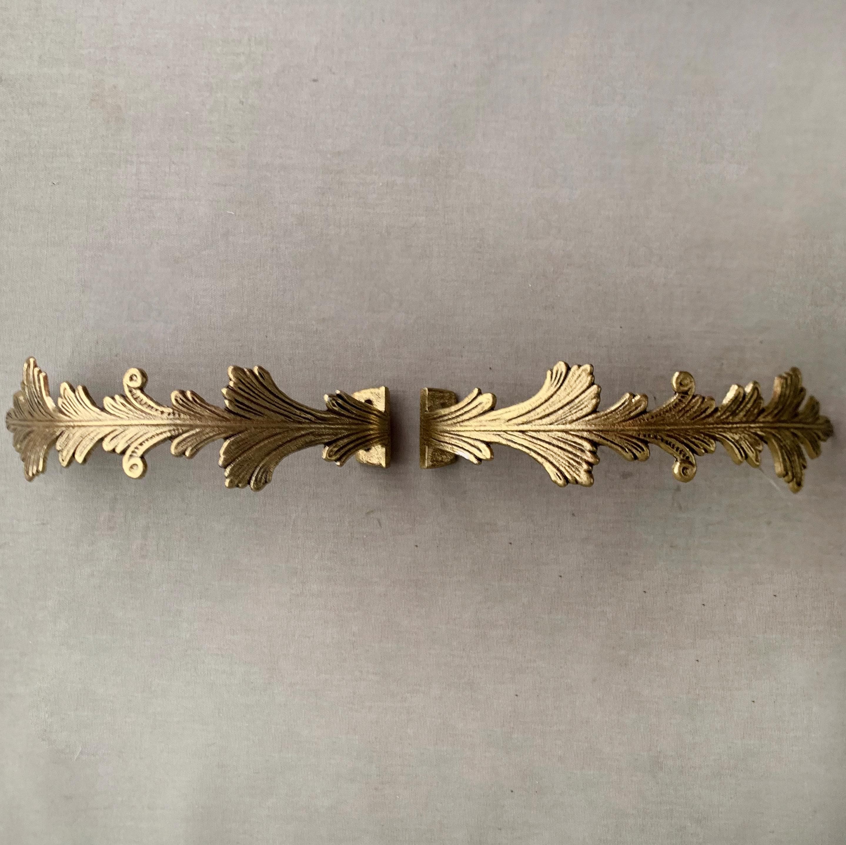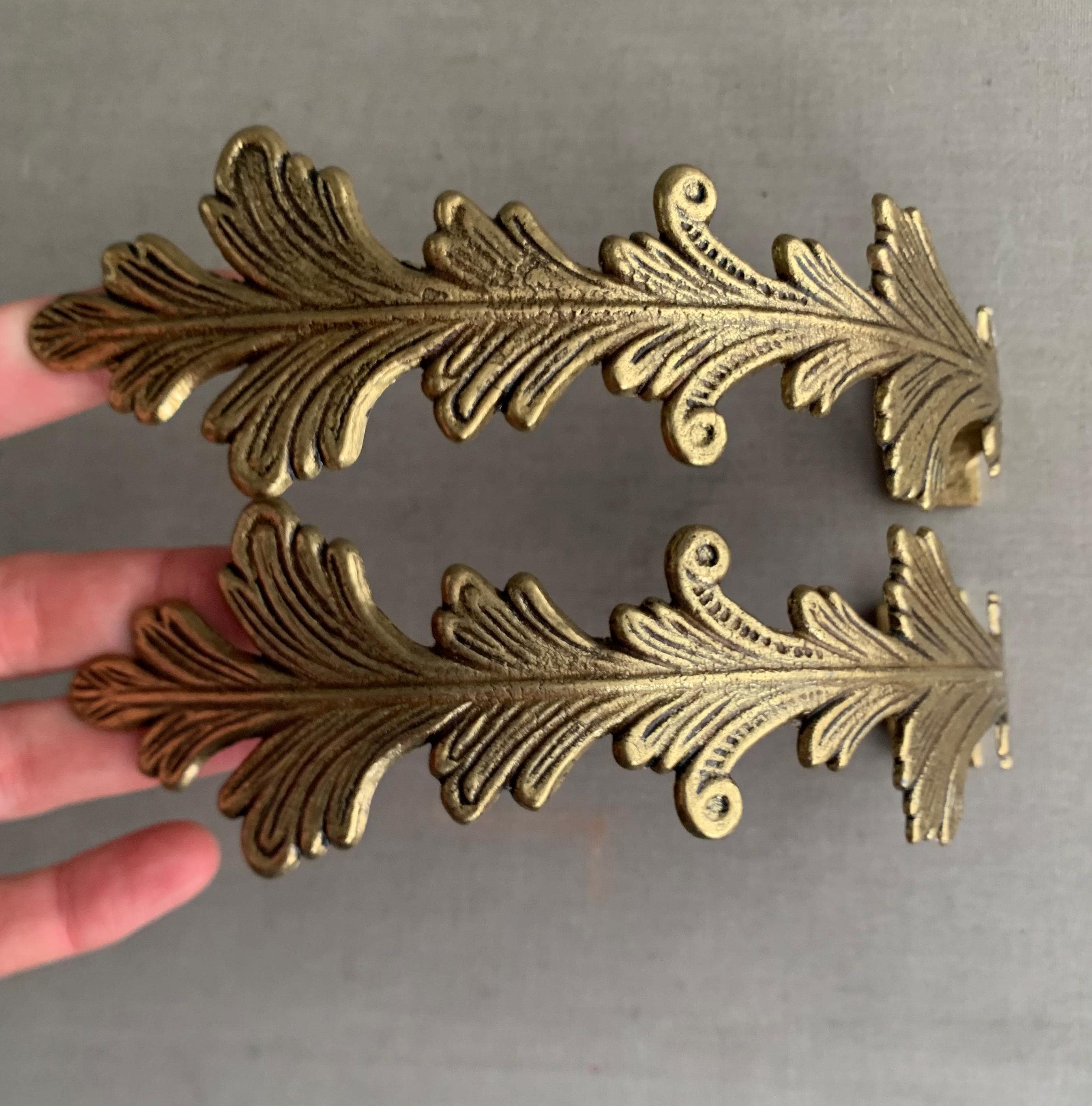 A Pair of vintage Acanthus solid brass curtains tiebbacks in a leaf/ laural design .Few signs of age used overall in good condition (please check the pictures ) length 9.5'' - 24 cm. width 2'' - 5 cm.