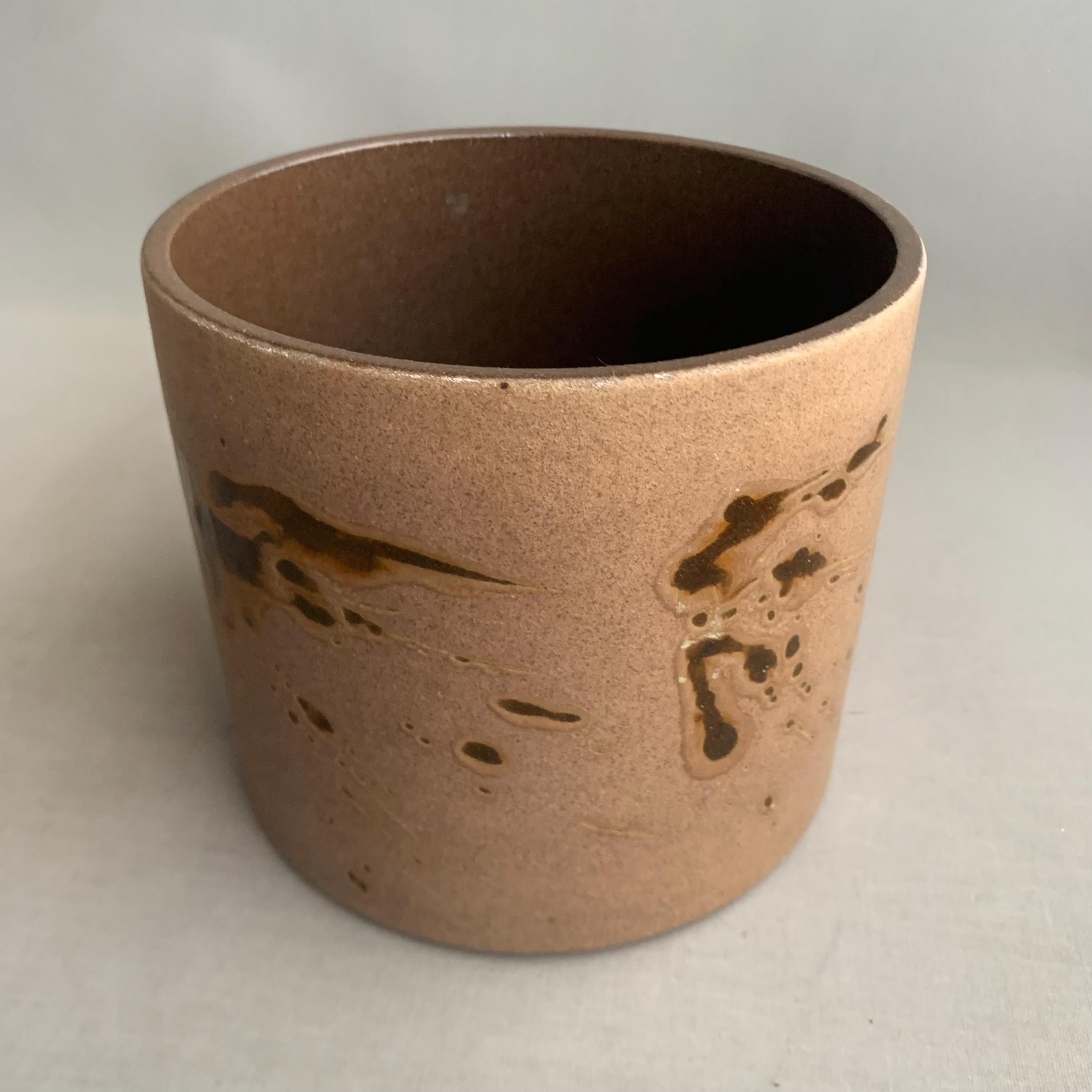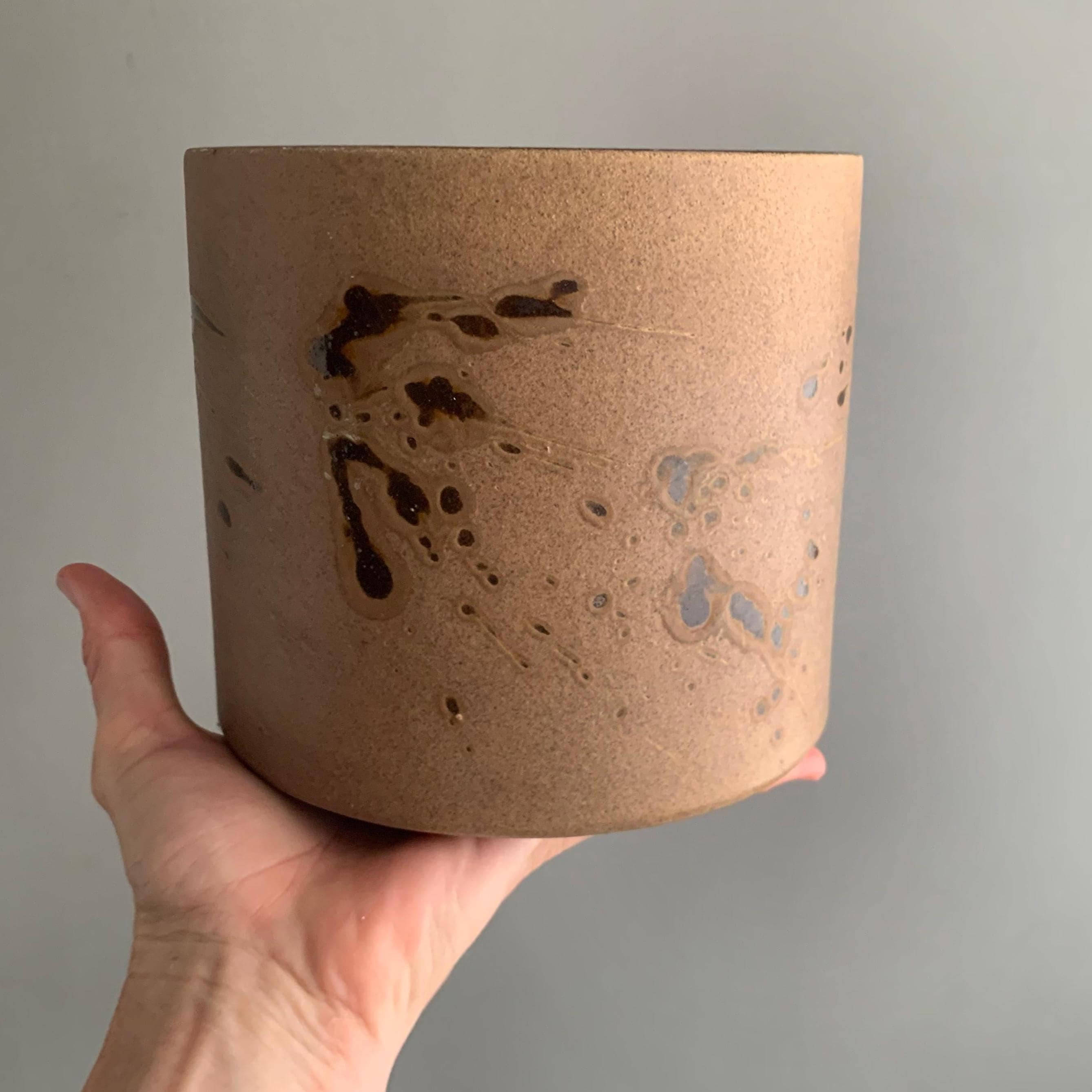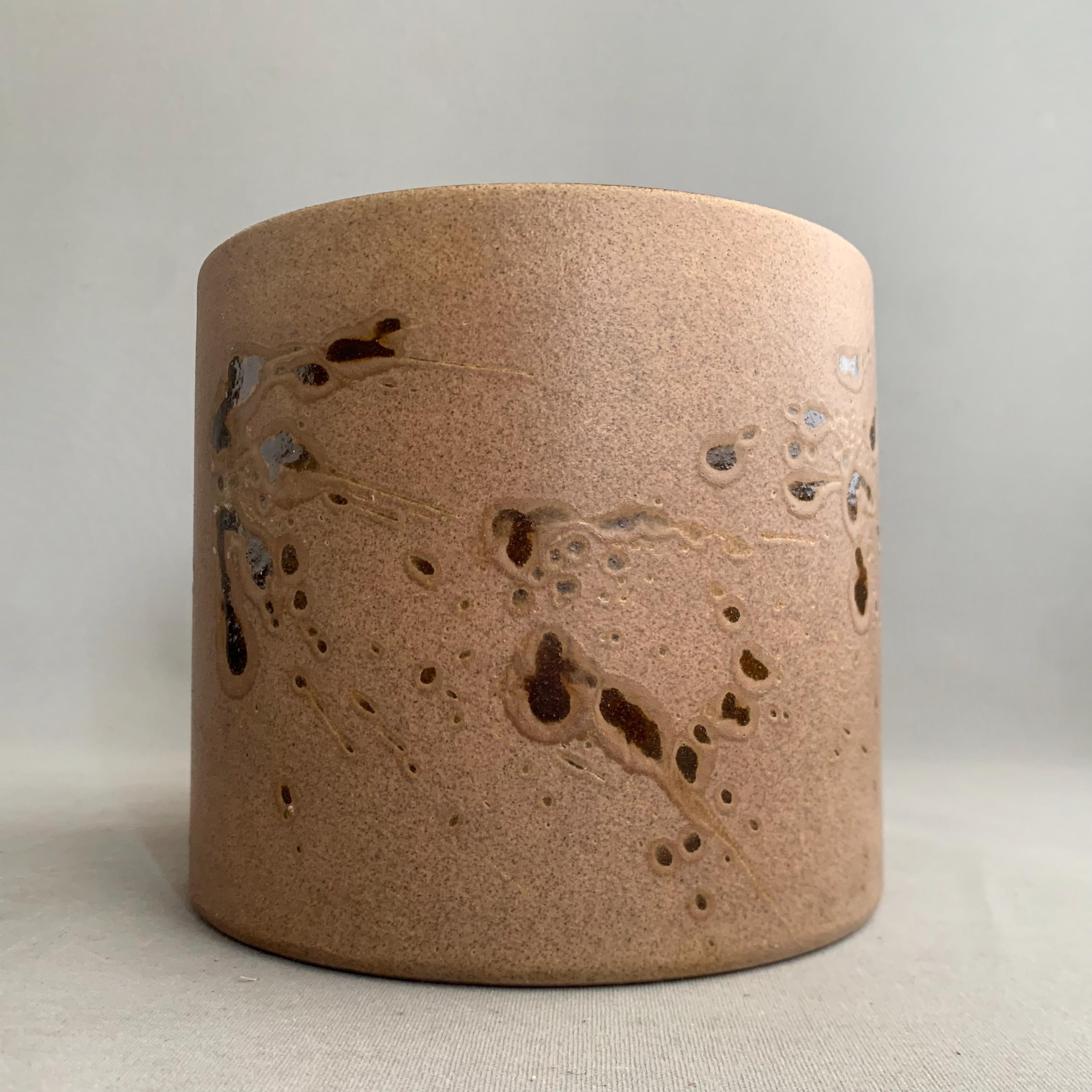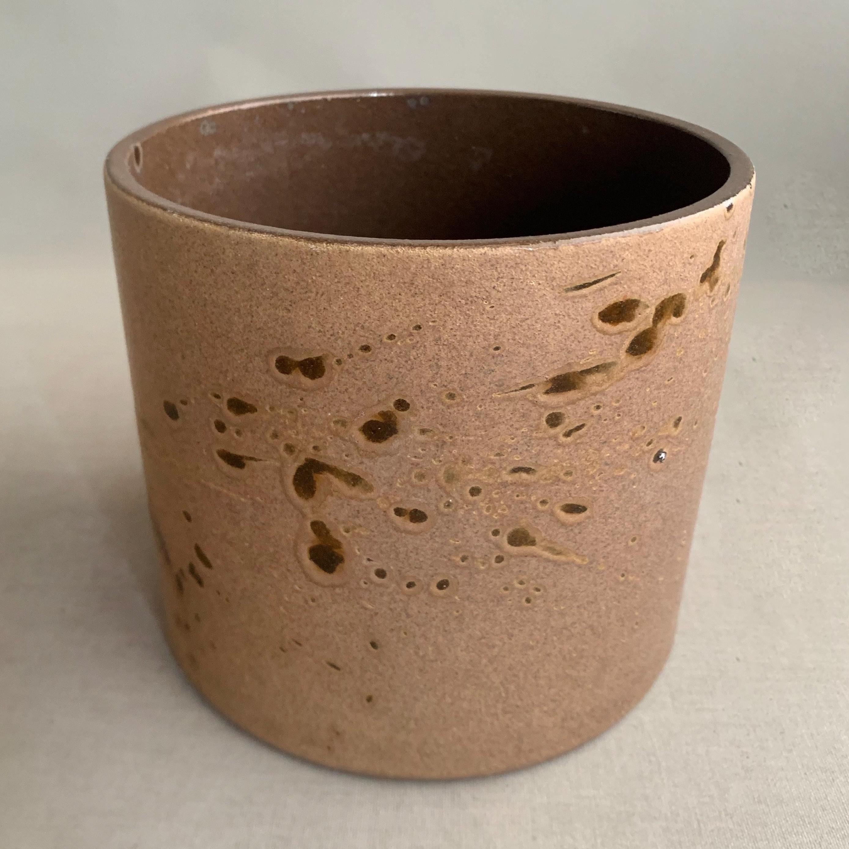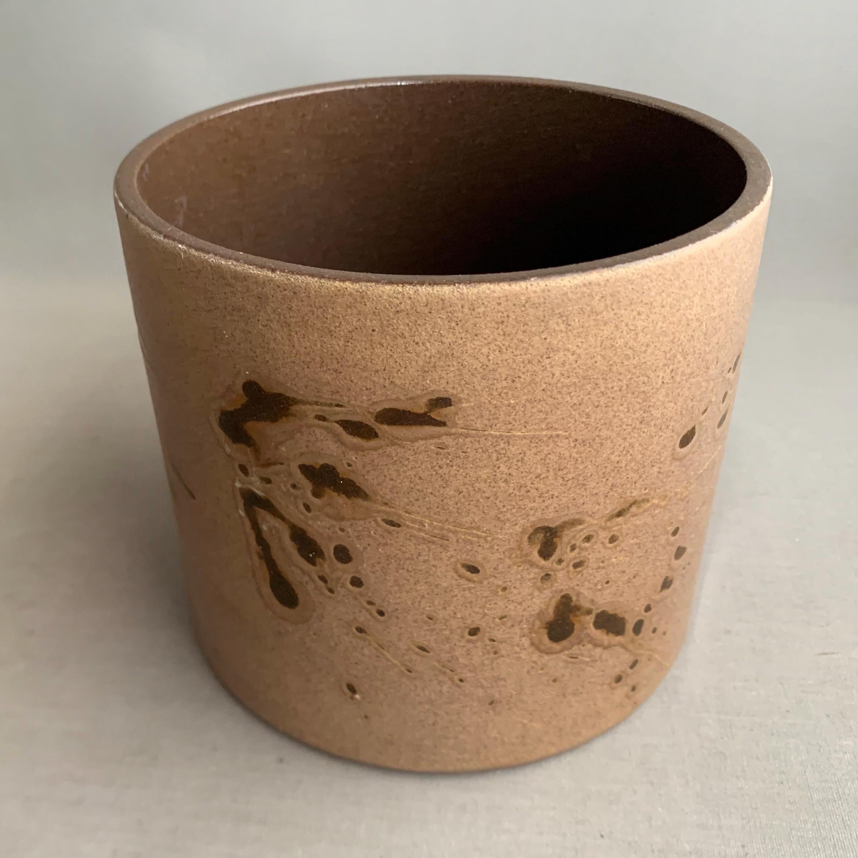 A 1970s west german ceramic plant pot . Glossy glaze inside. matt brown glaze on the outside with glossy brown splatter glaze details . straight sided studio pottery pot Produced in West Germany, and with the maker's mark stamped into the bottom, this highly collectable piece is a beautiful mocha brown colour with splashes of deep espresso all around. Ideal for housing a plant, or just displaying on top of a stack of books.