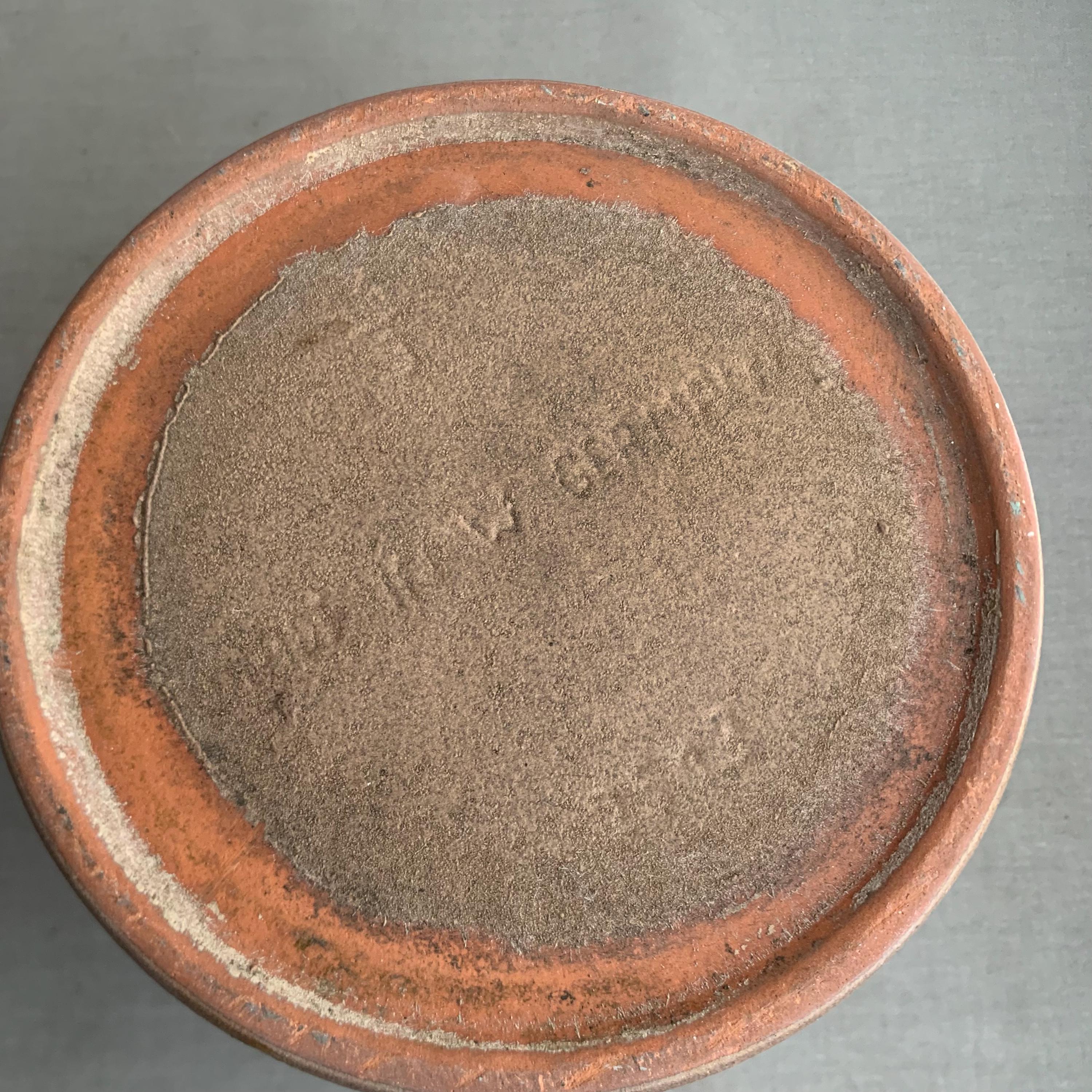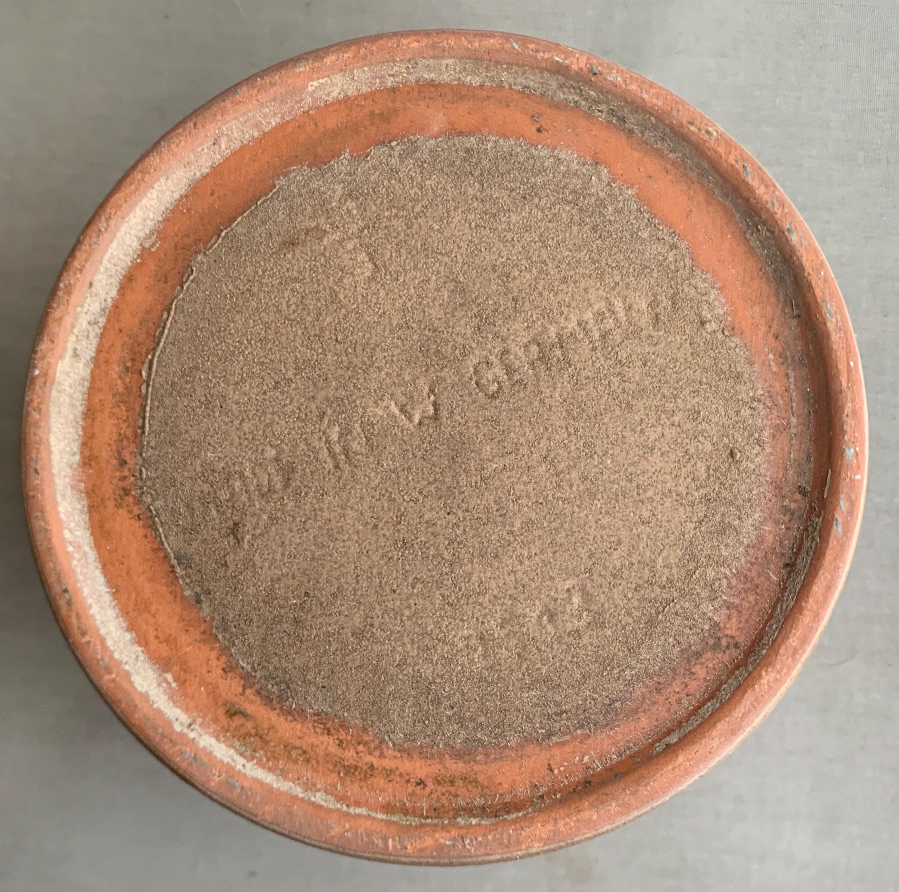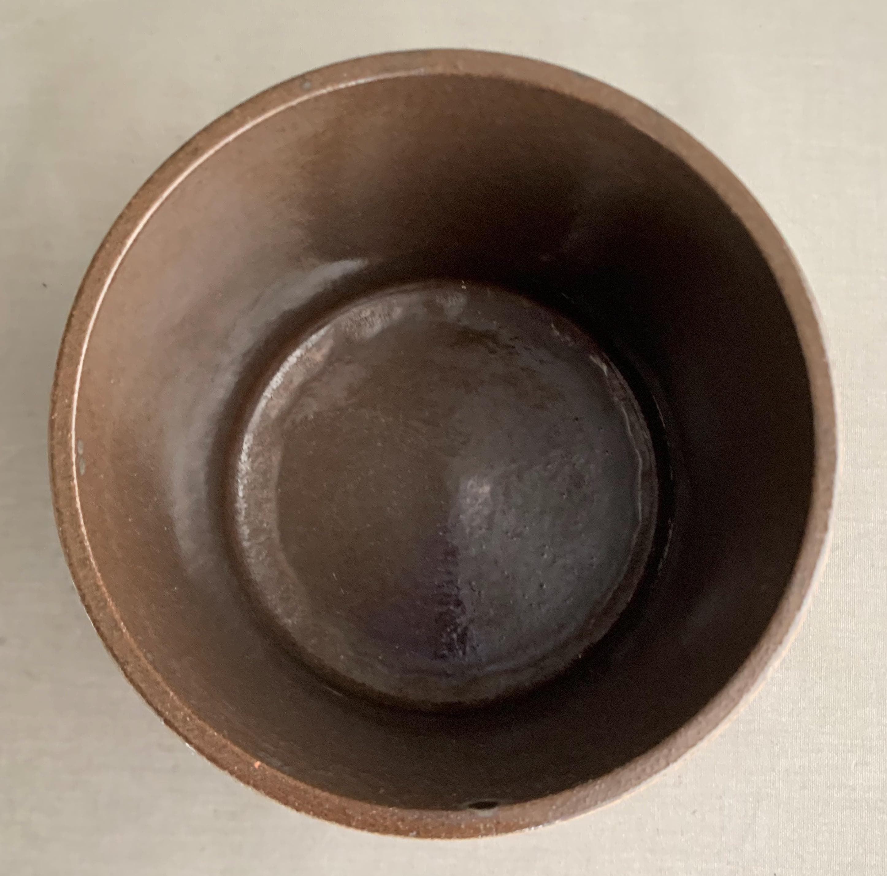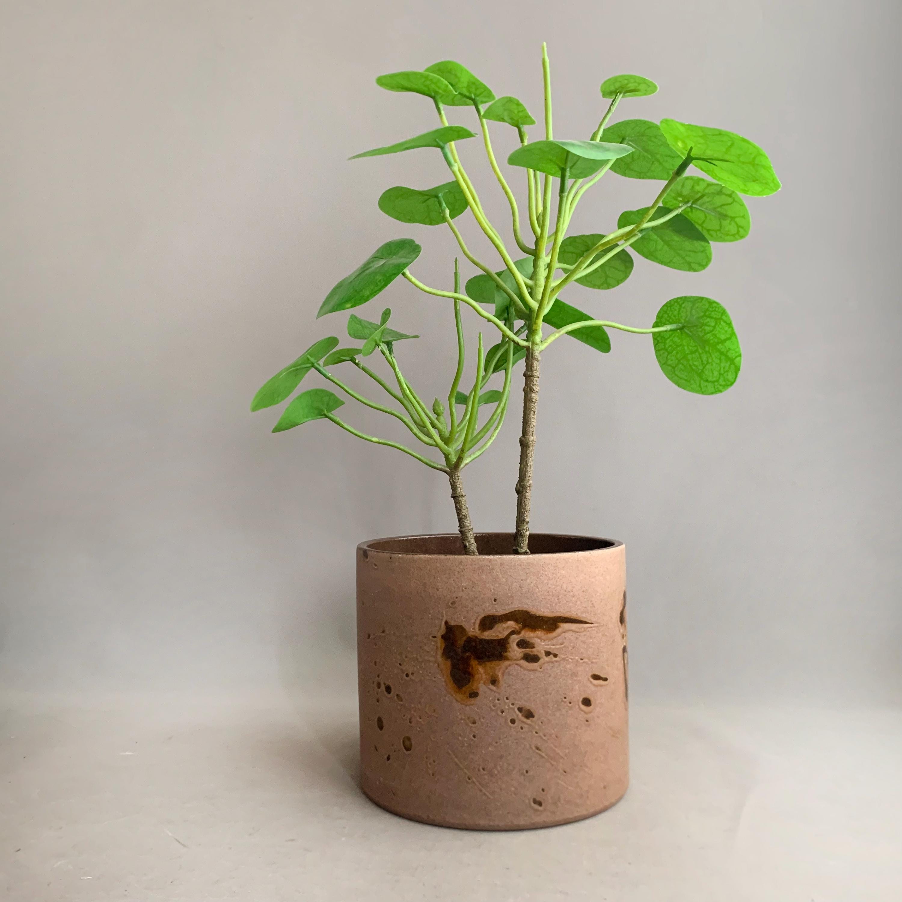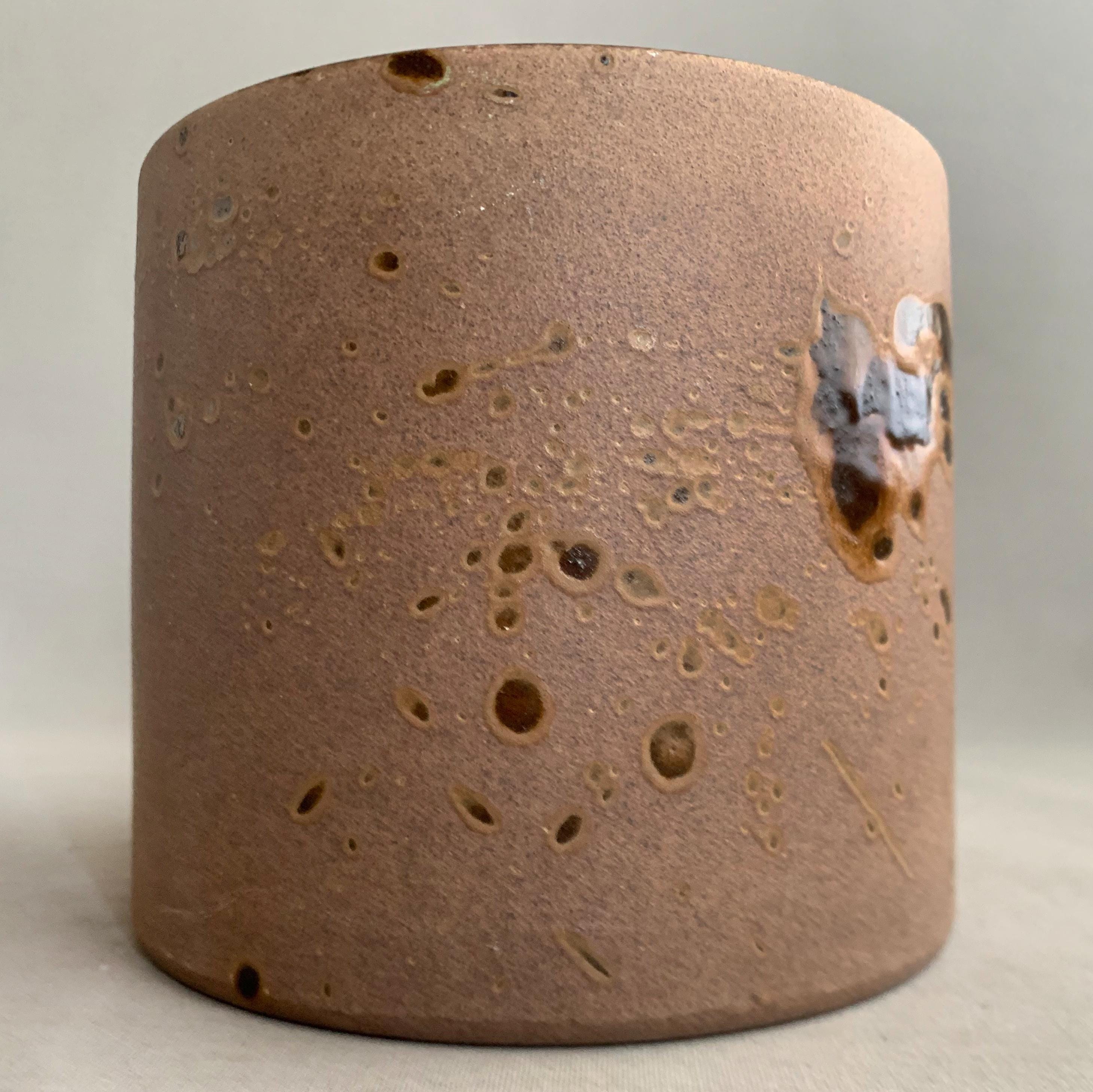 A 1970s west german ceramic plant pot . Glossy glaze inside. matt brown glaze on the outside with glossy brown splatter glaze details . straight sided studio pottery pot Produced in West Germany, and with the maker's mark stamped into the bottom, this highly collectable piece is a beautiful mocha brown colour with splashes of deep espresso all around. Ideal for housing a plant, or just displaying on top of a stack of books.