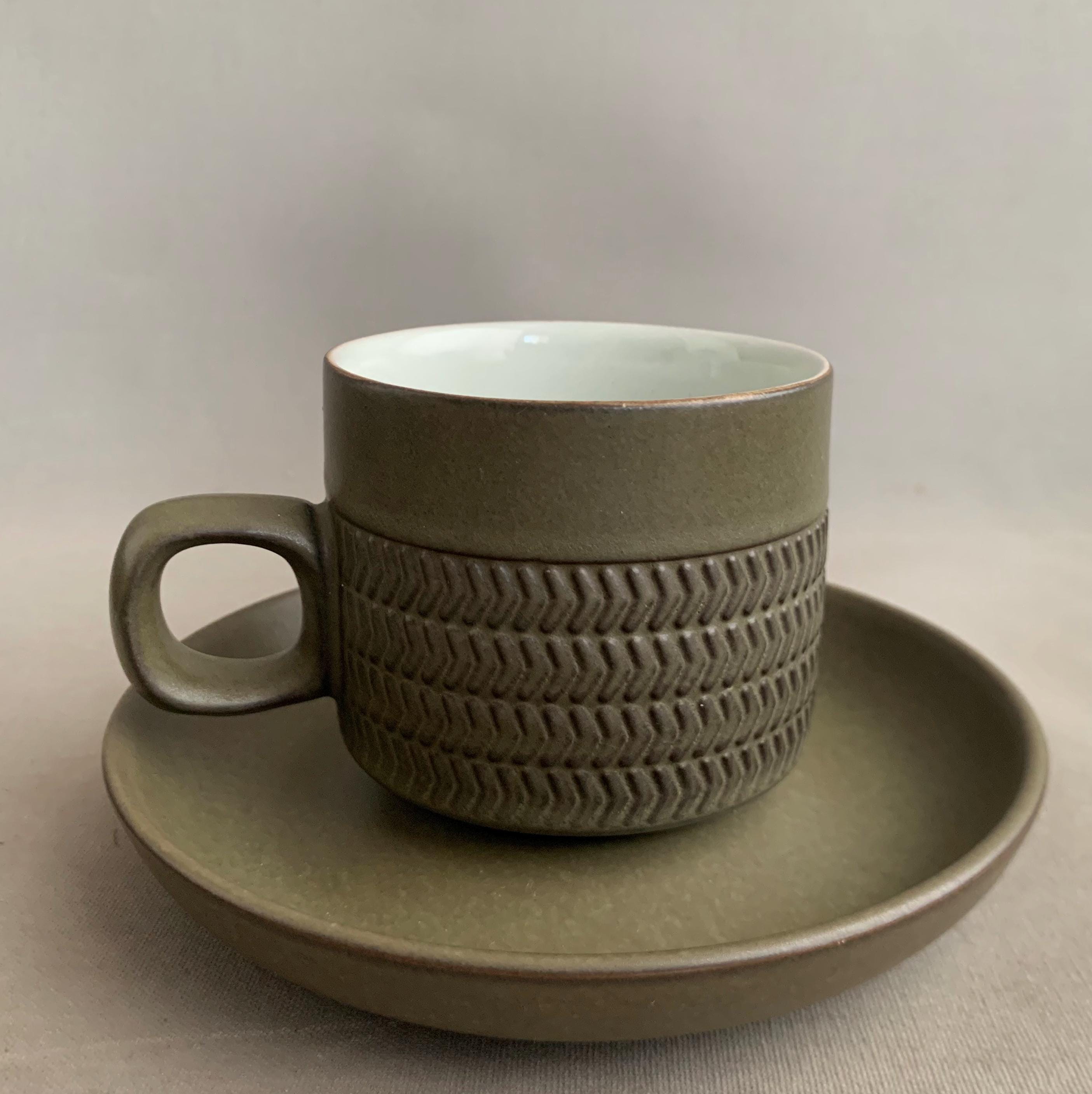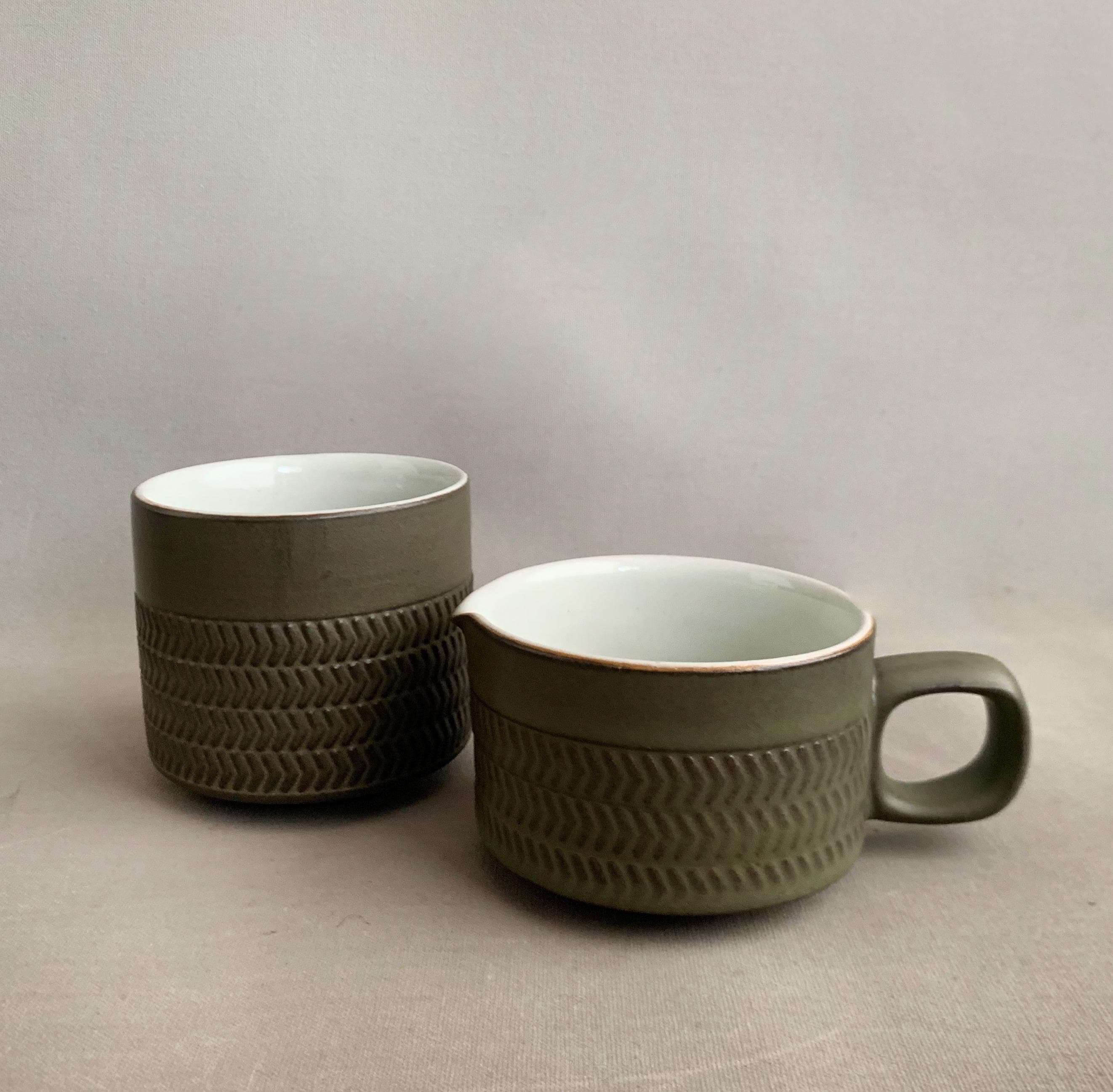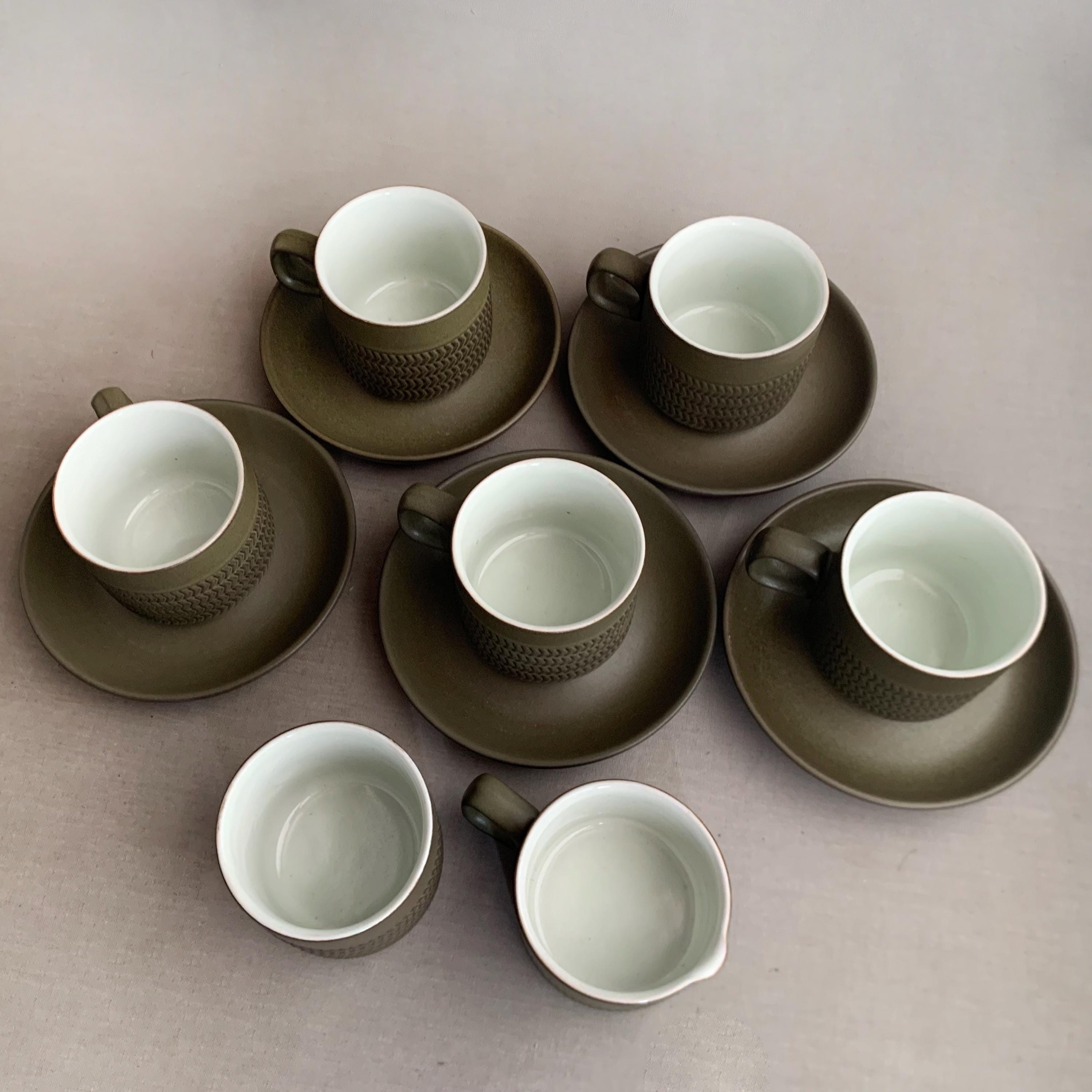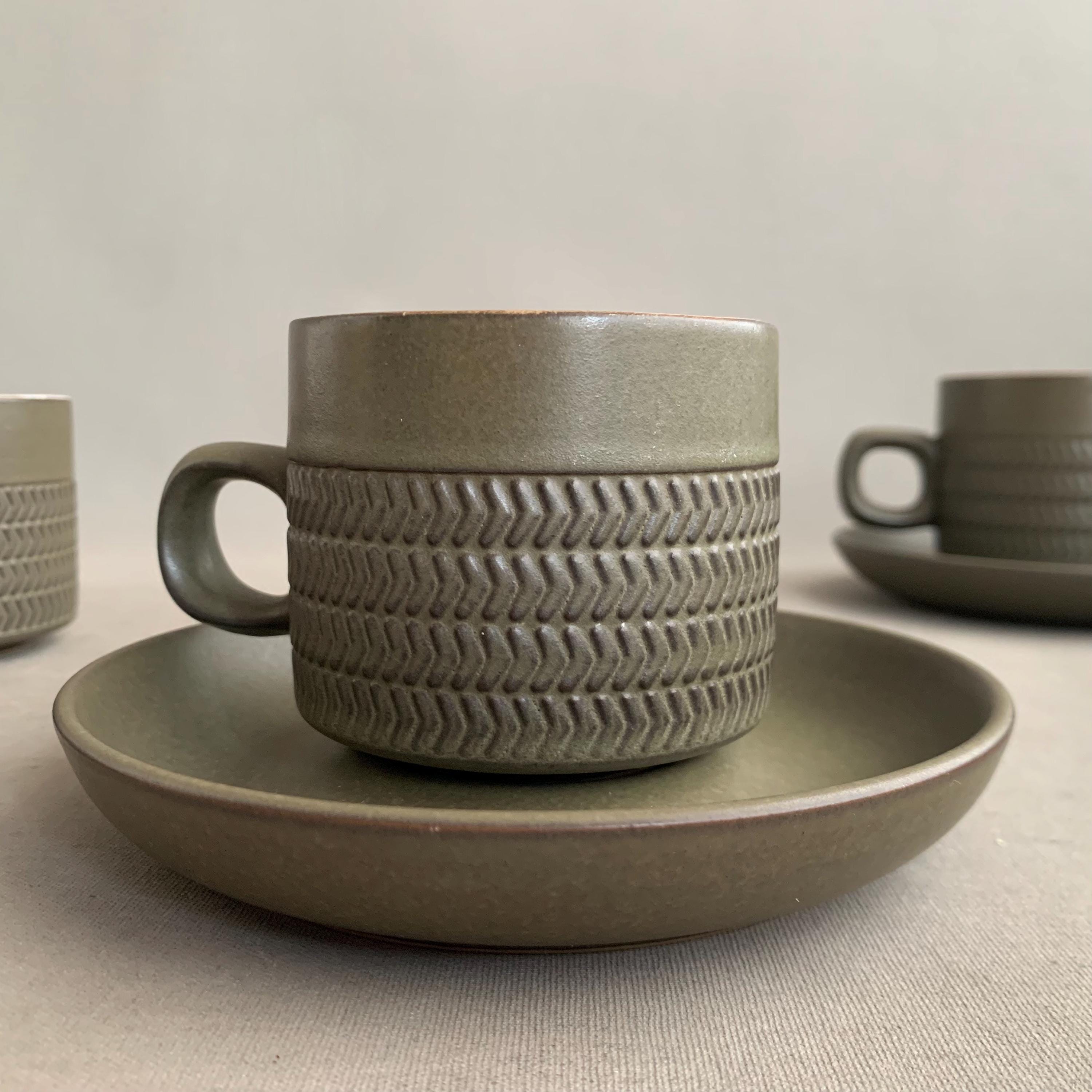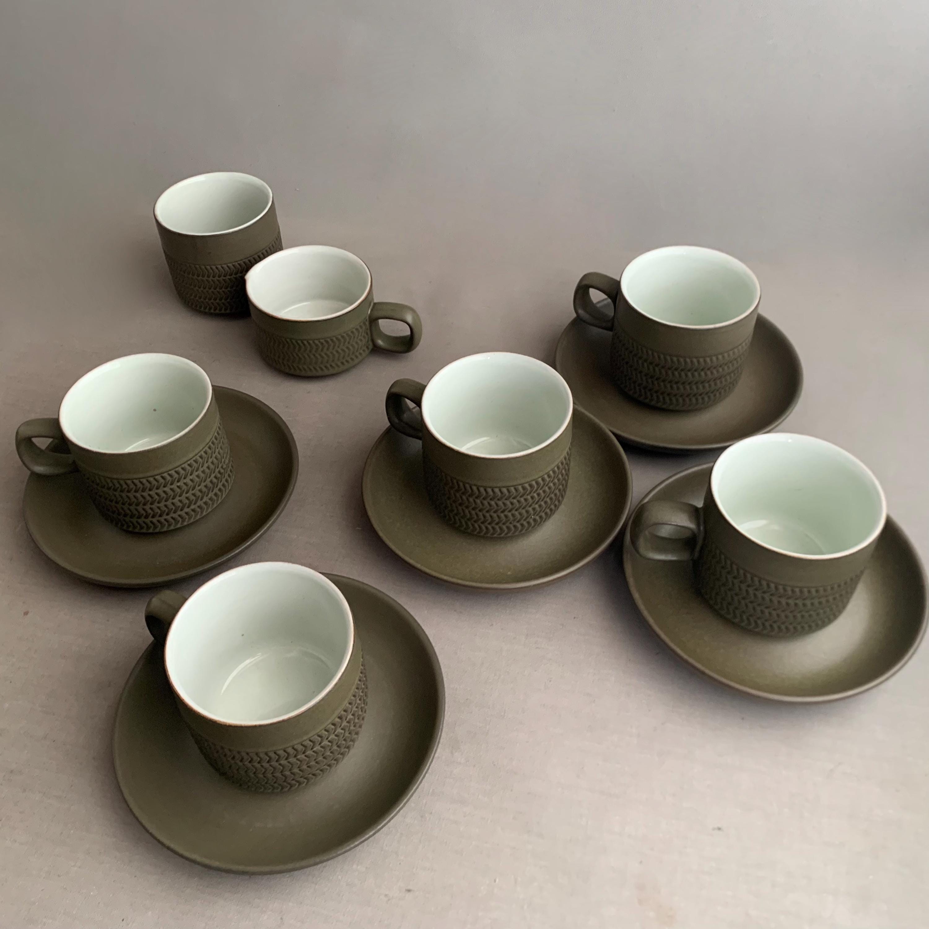Produced 1962 until 1978. Matt glazed in khaki green with a serrated 'chevron' pattern. Designed by Gill Pemberton. sold as a set