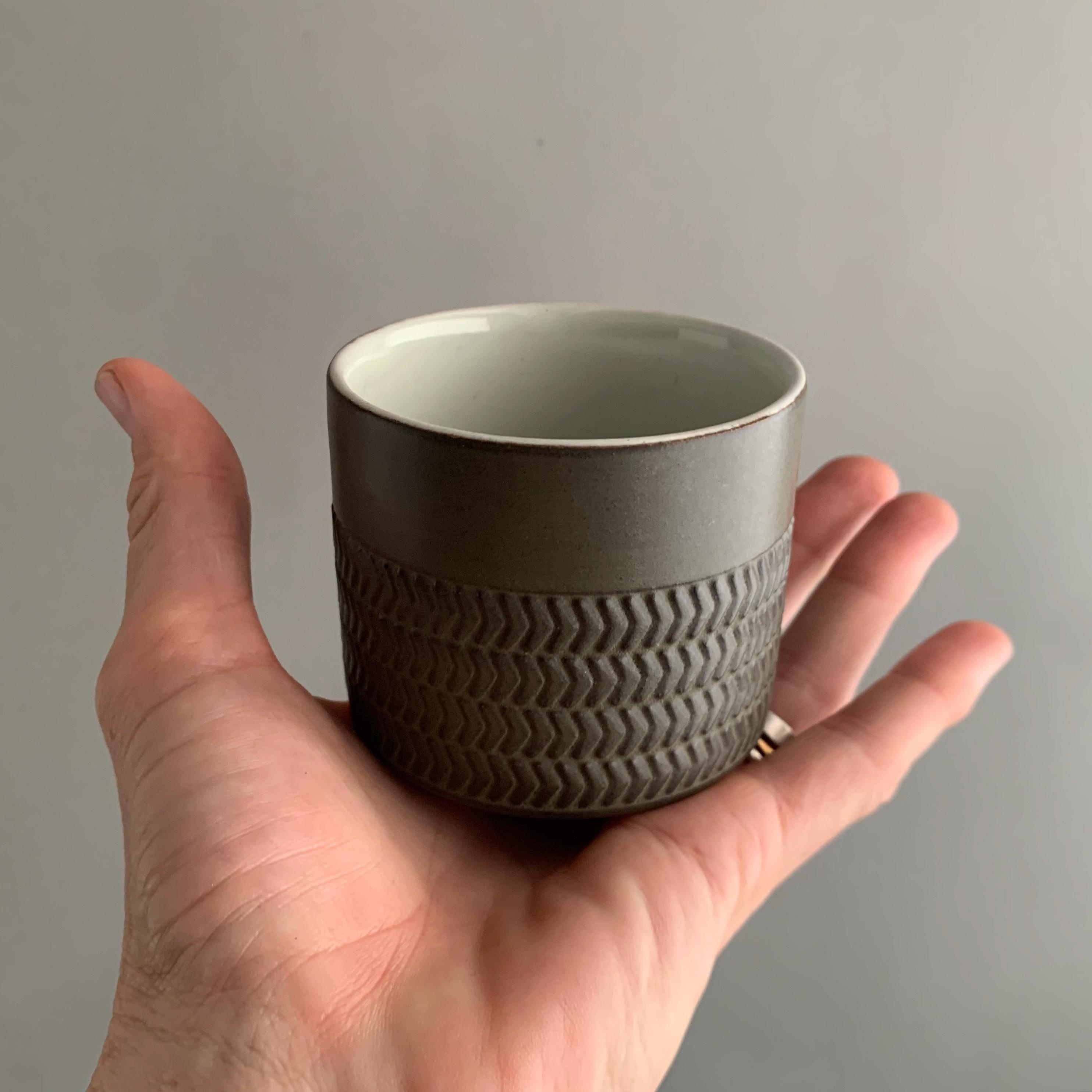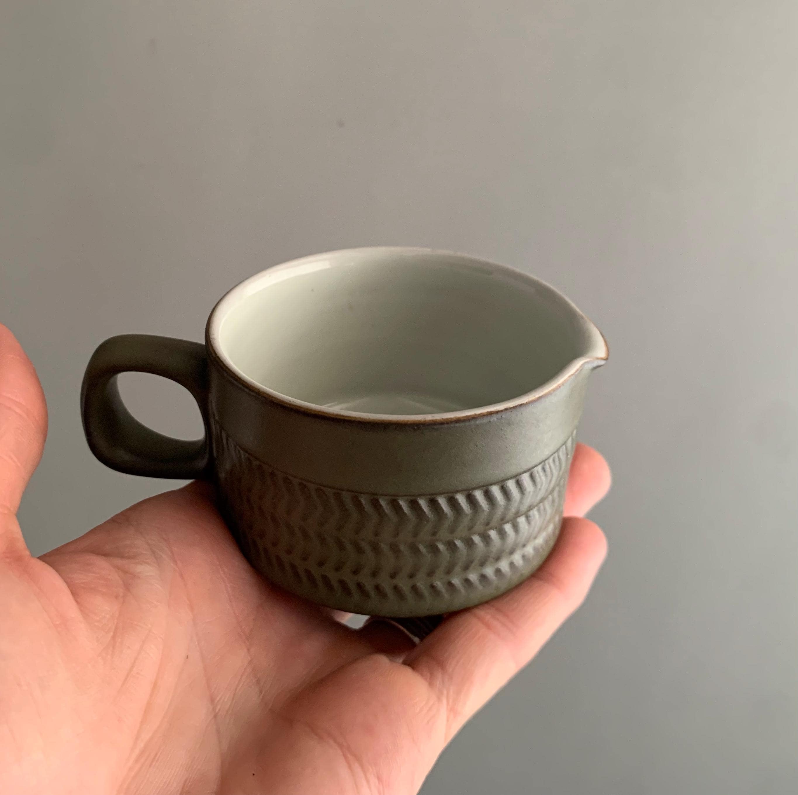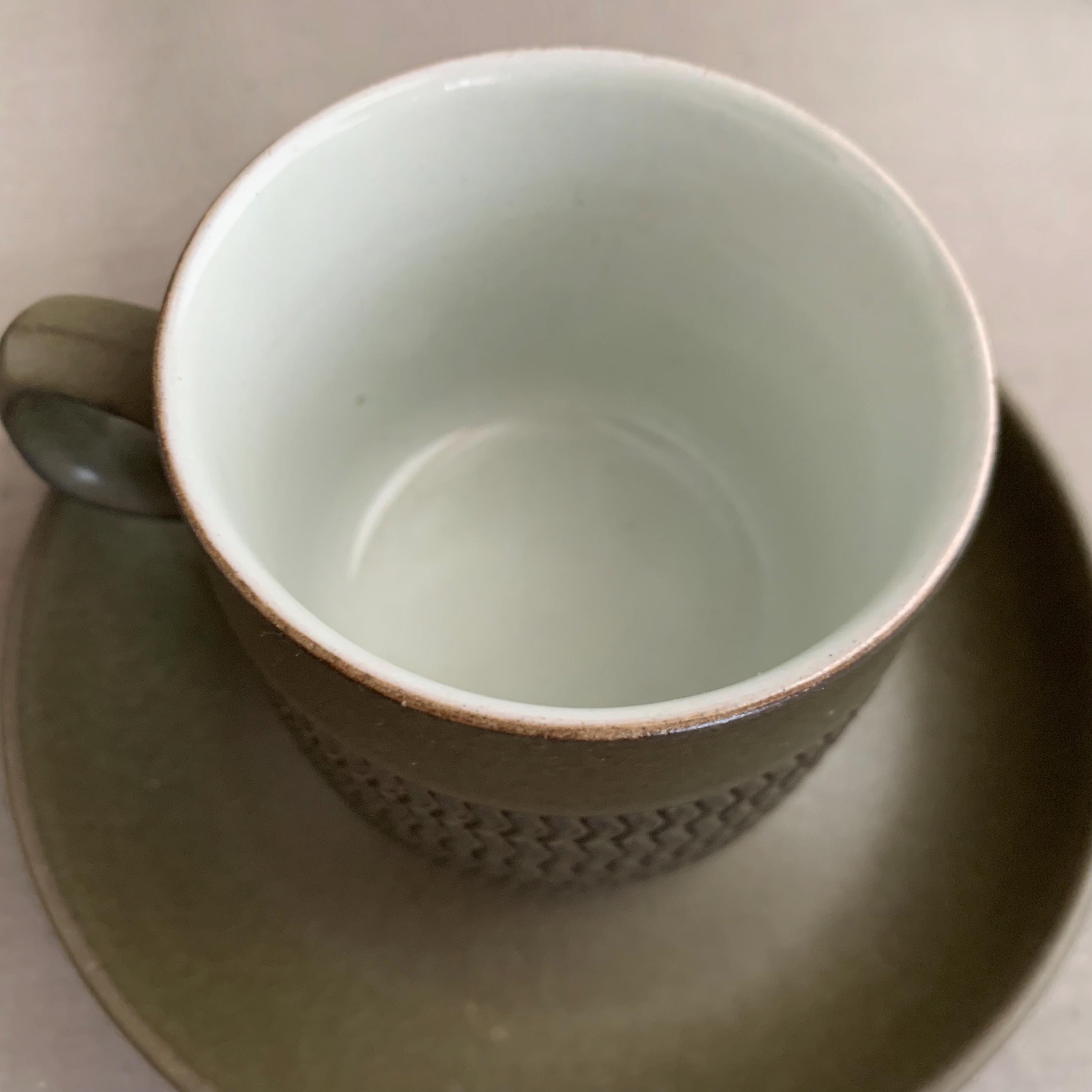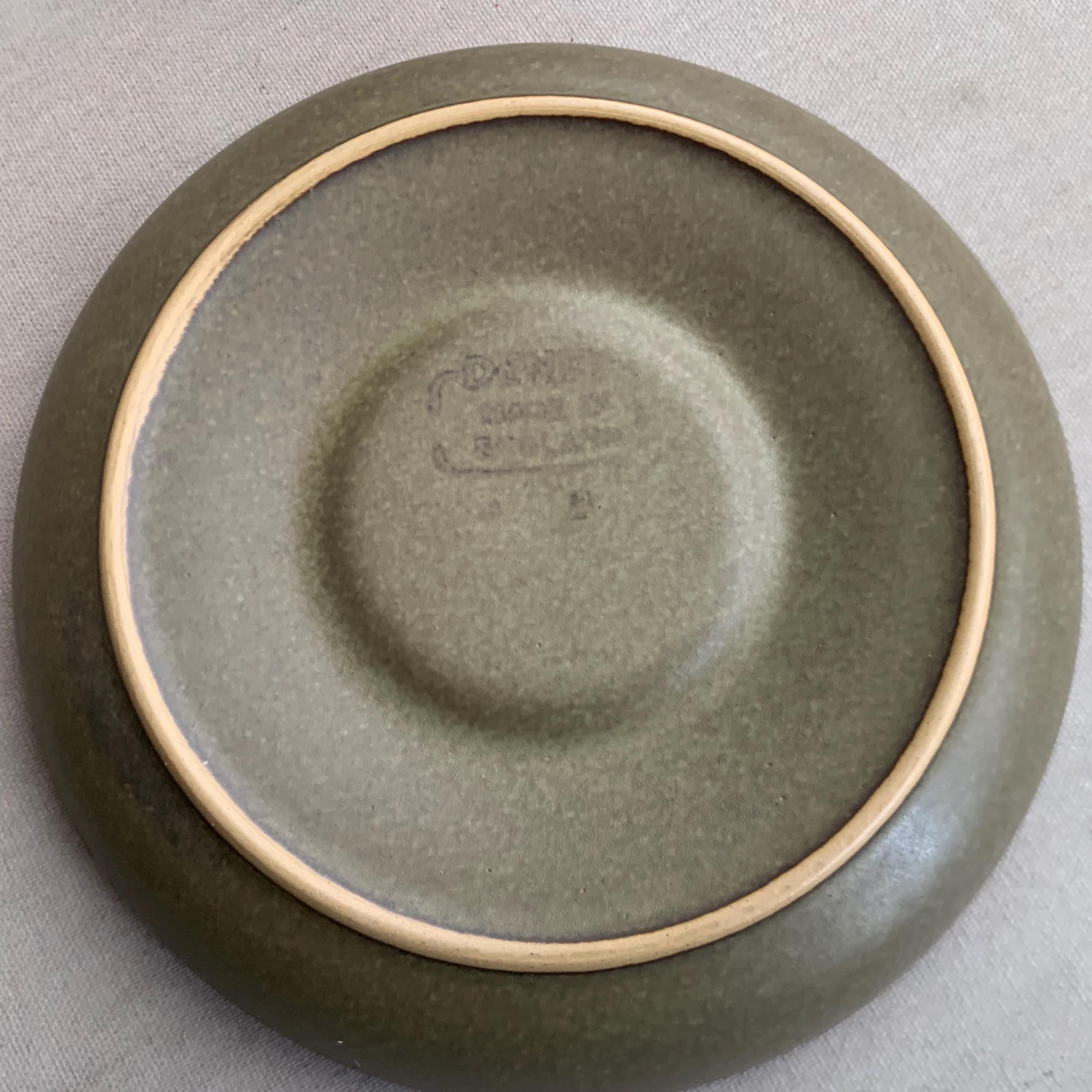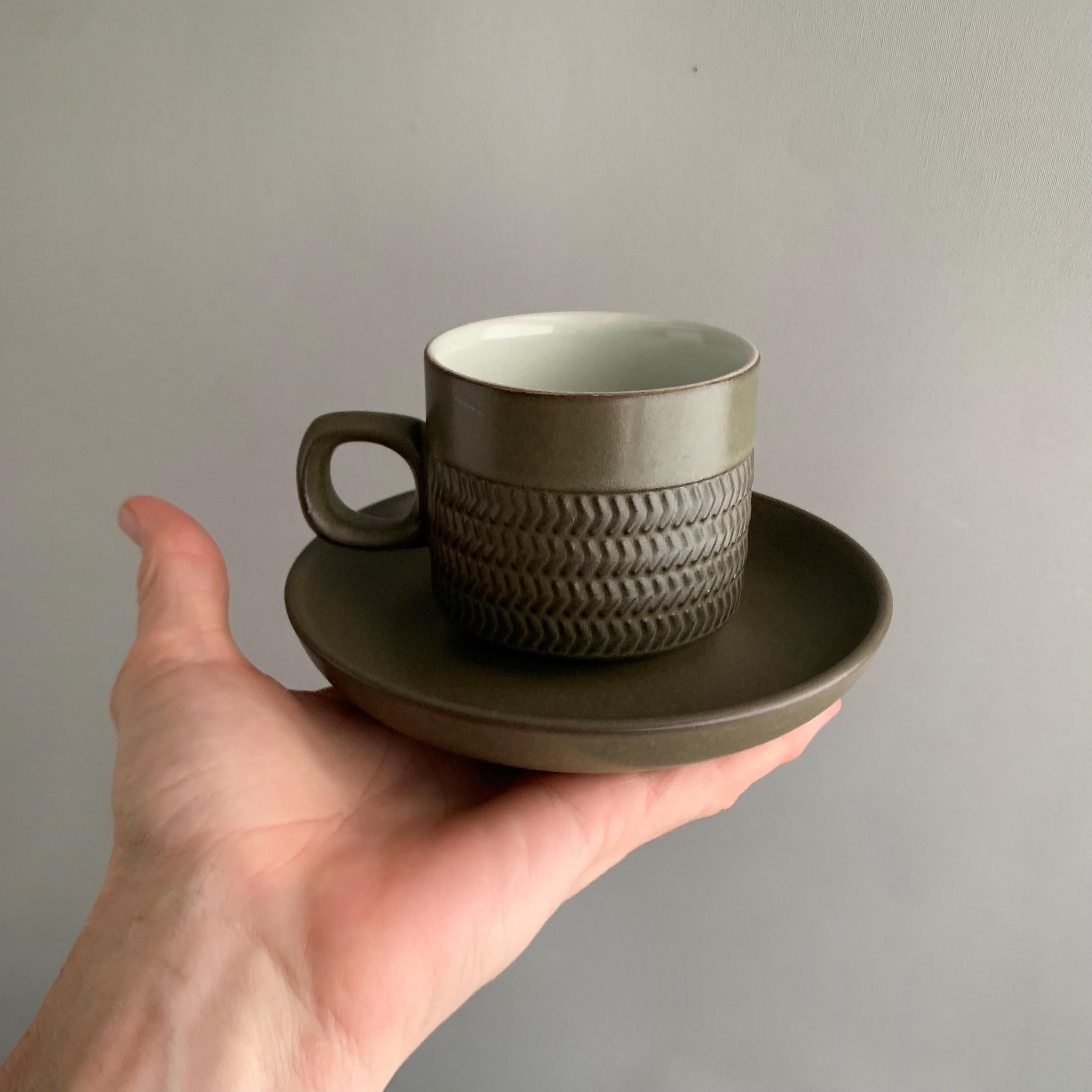 Produced 1962 until 1978. Matt glazed in khaki green with a serrated 'chevron' pattern. Designed by Gill Pemberton. sold as a set