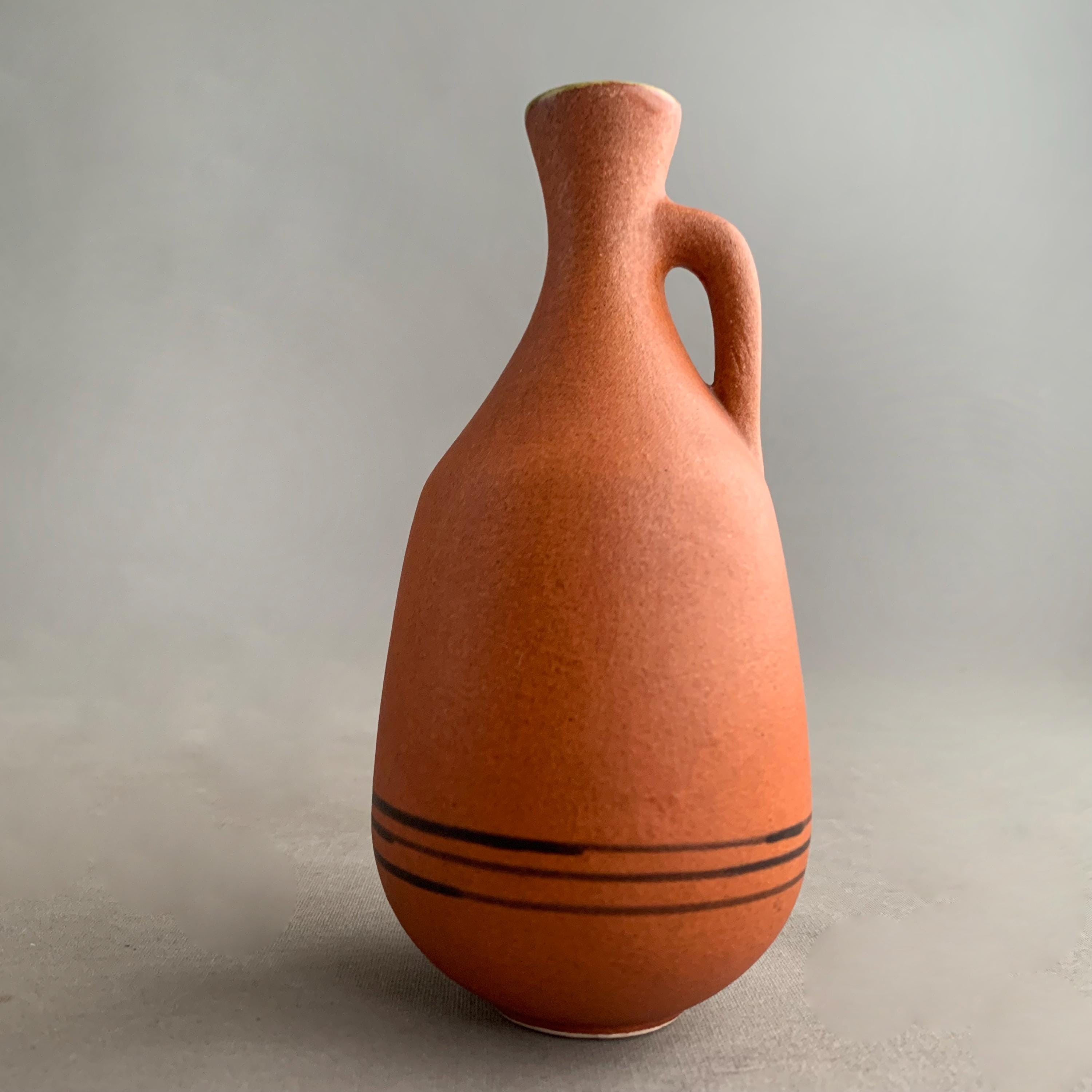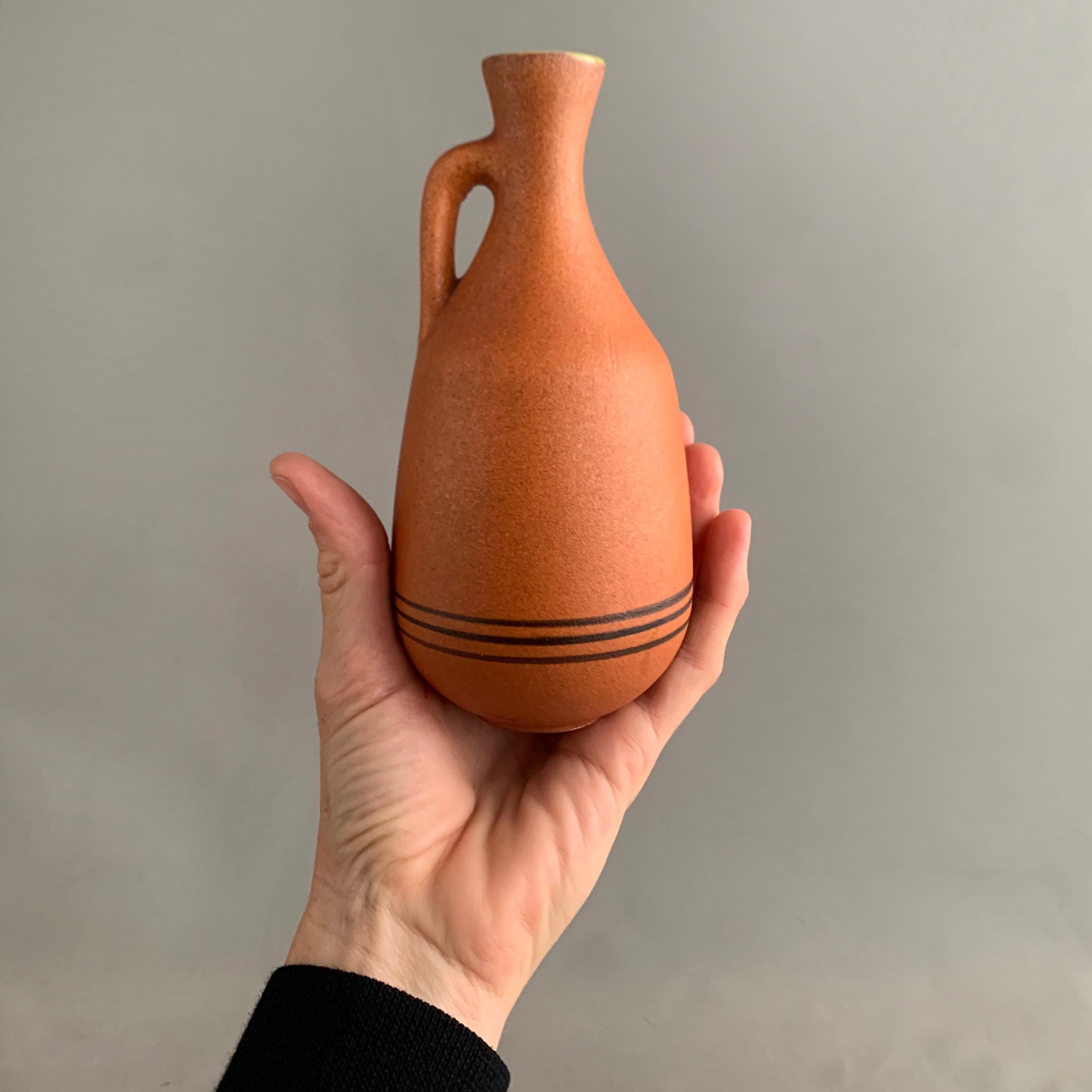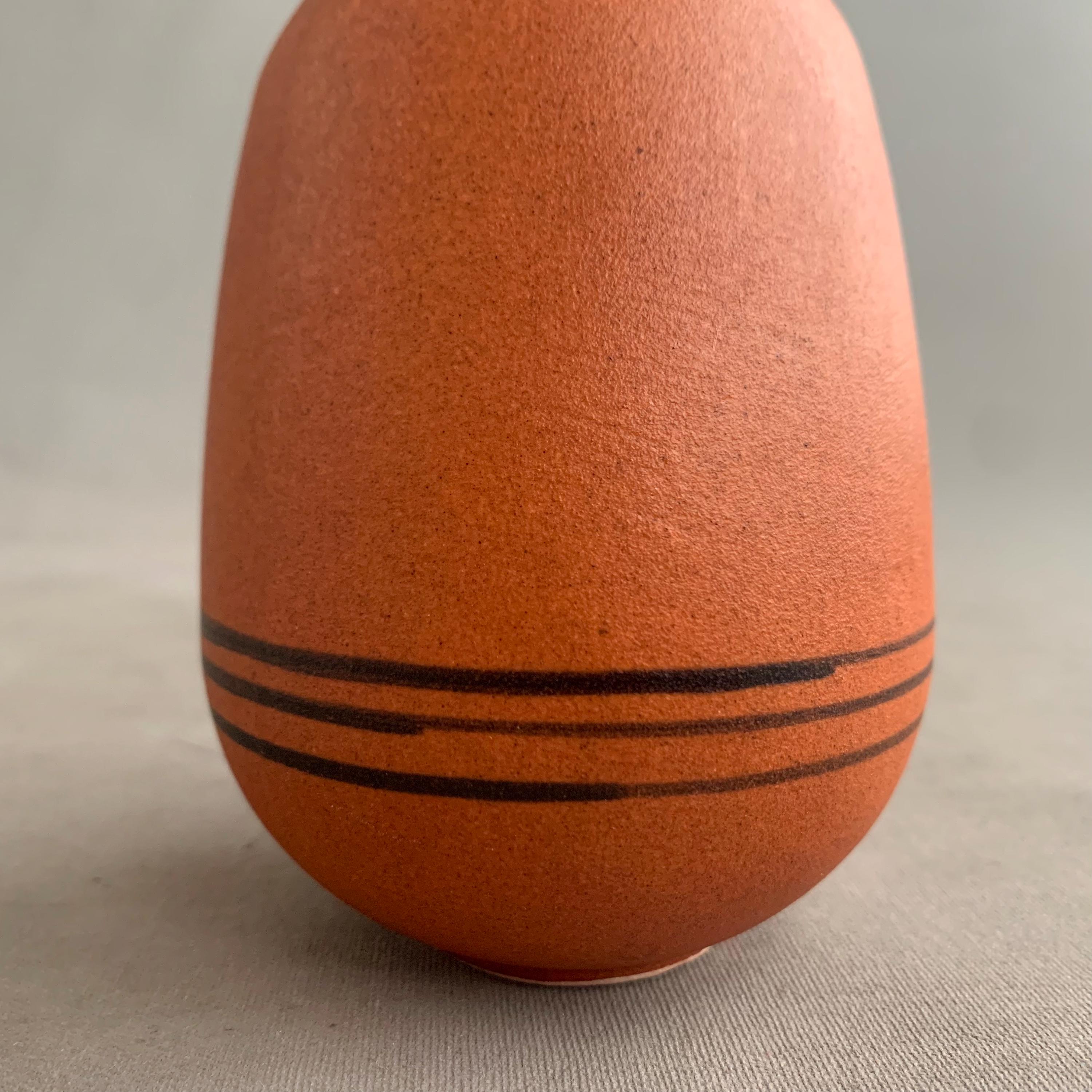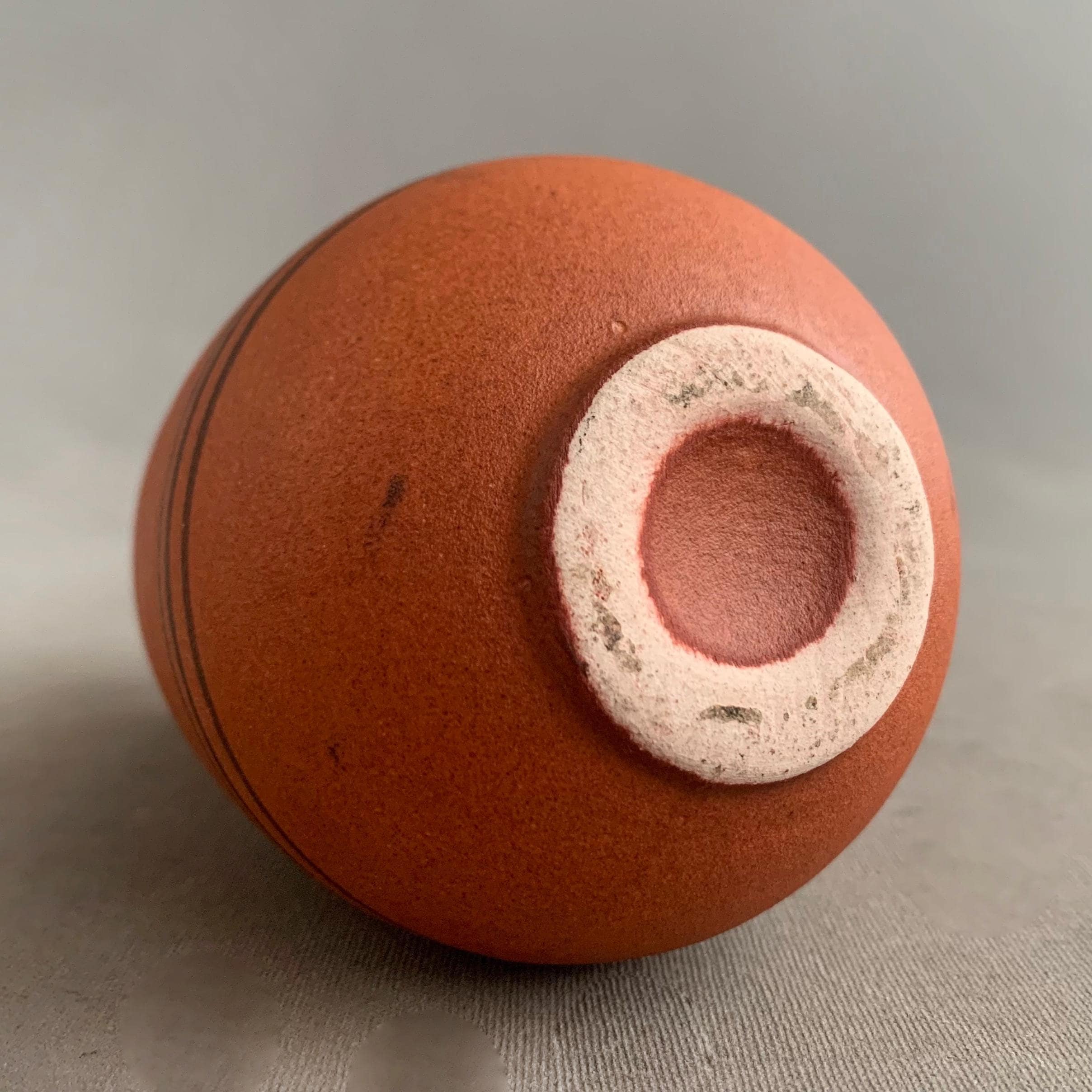 A beautifully crafted little vase. Matt teracotta exterior with dark green glossy interior glaze. 3 hand painted lines at the base. No makers mark but i suspect it is swedish