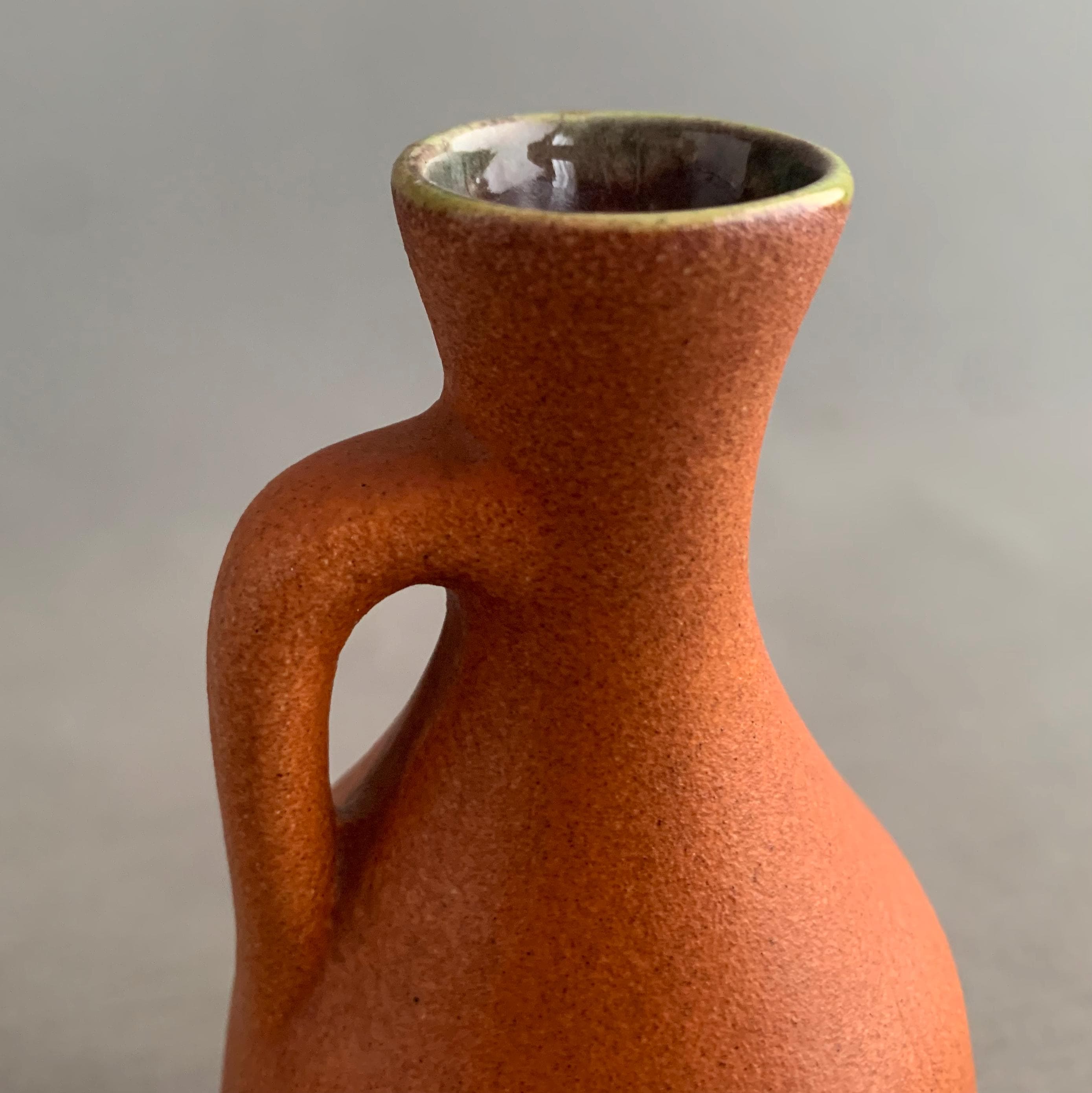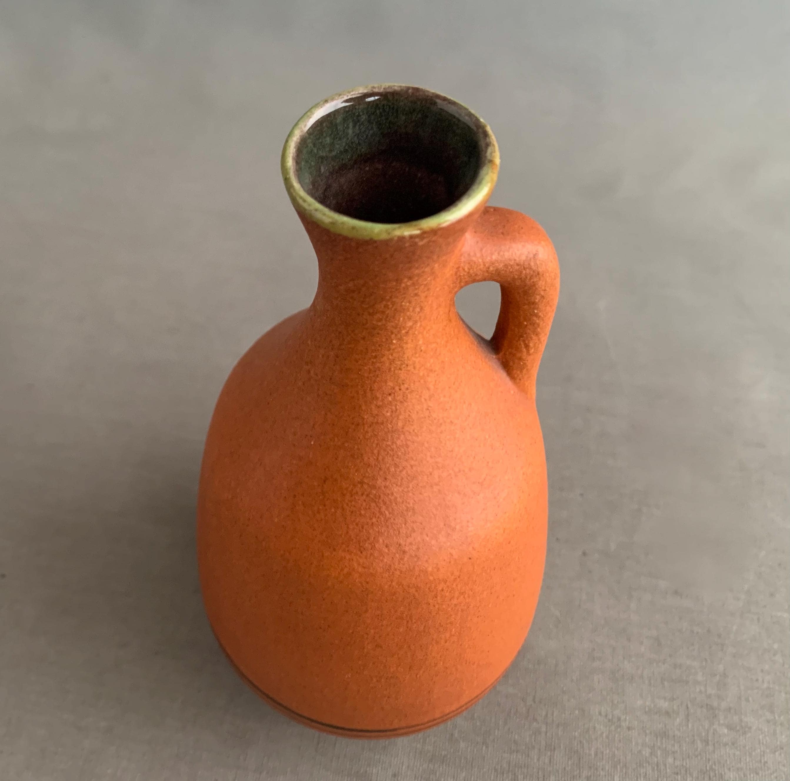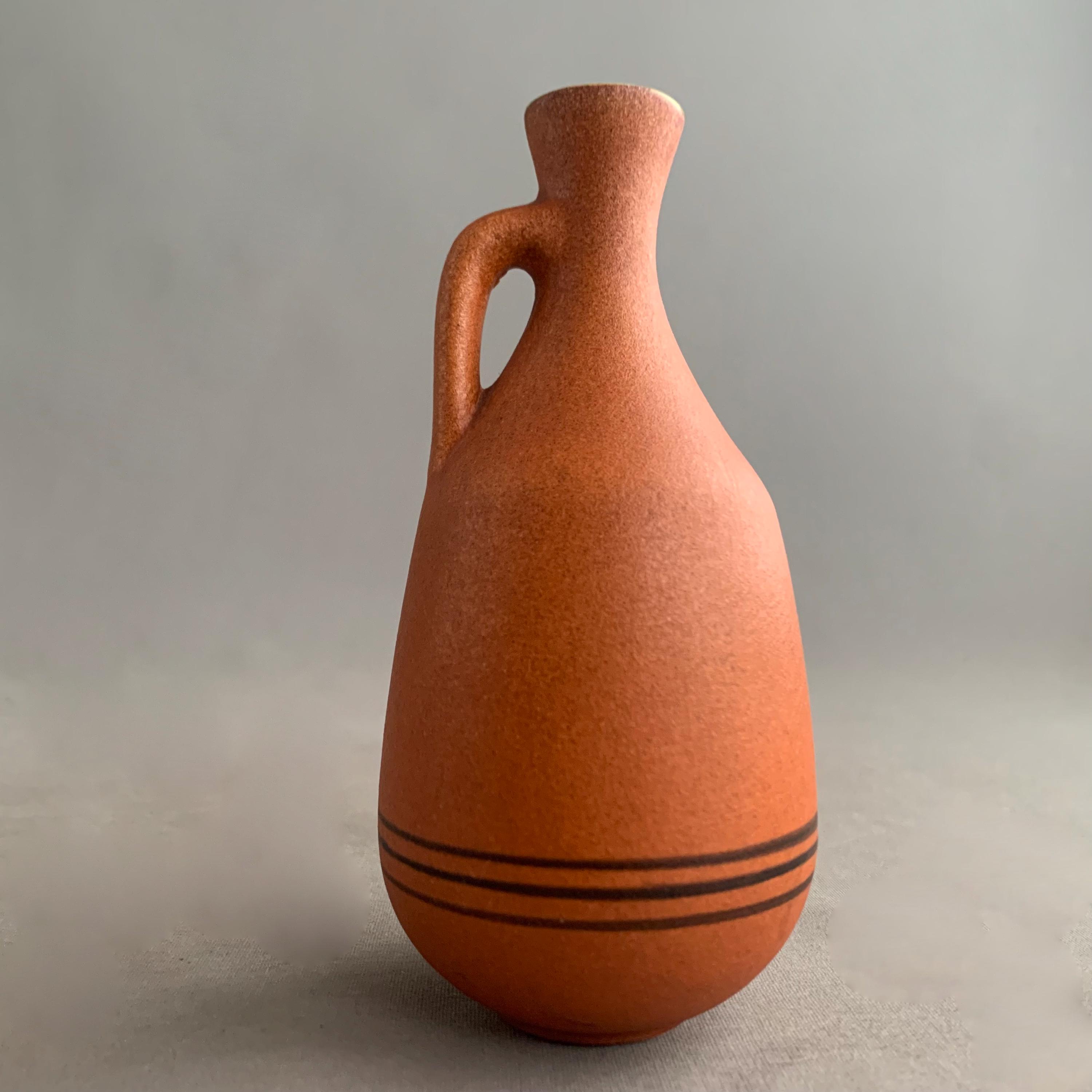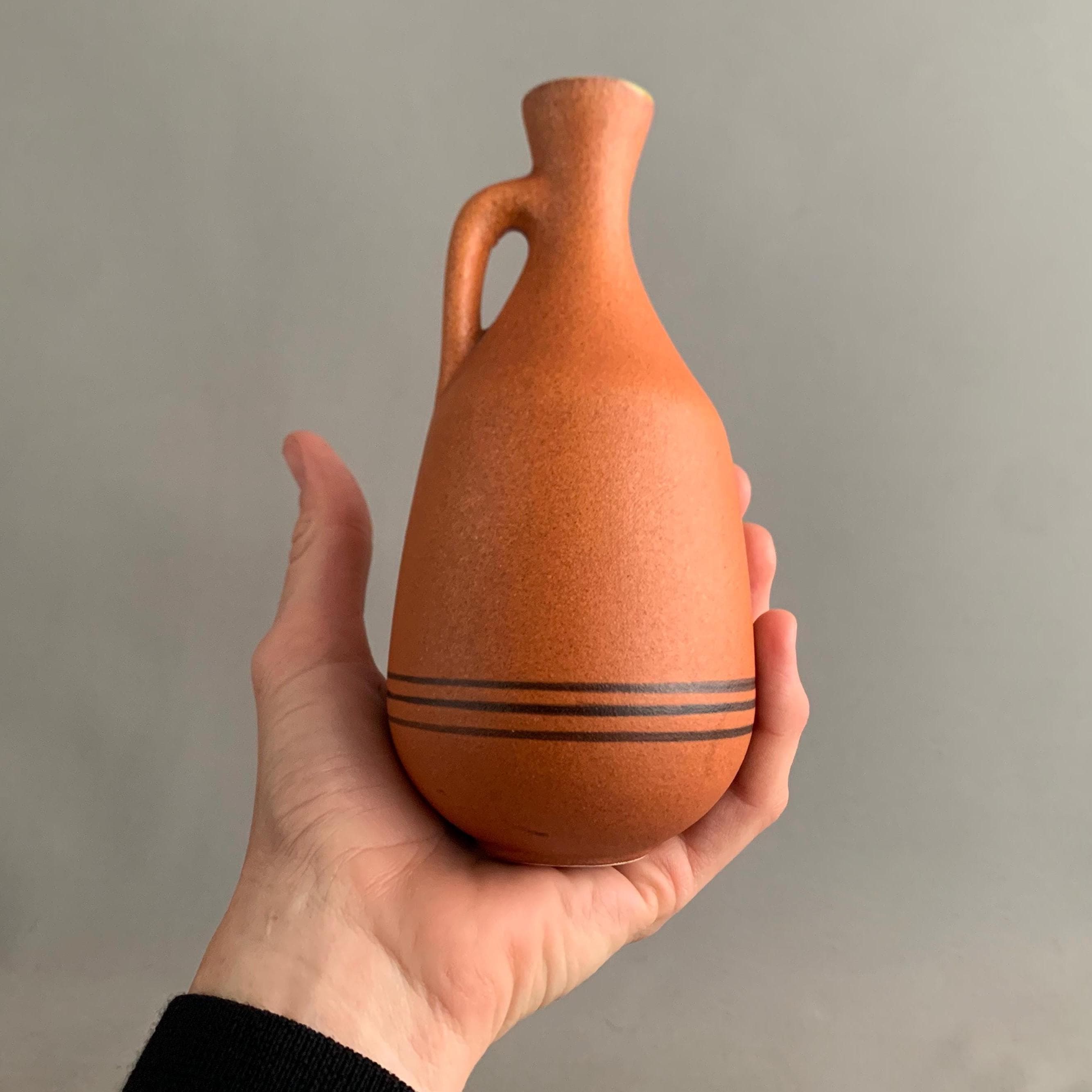 A beautifully crafted little vase. Matt teracotta exterior with dark green glossy interior glaze. 3 hand painted lines at the base. No makers mark but i suspect it is swedish