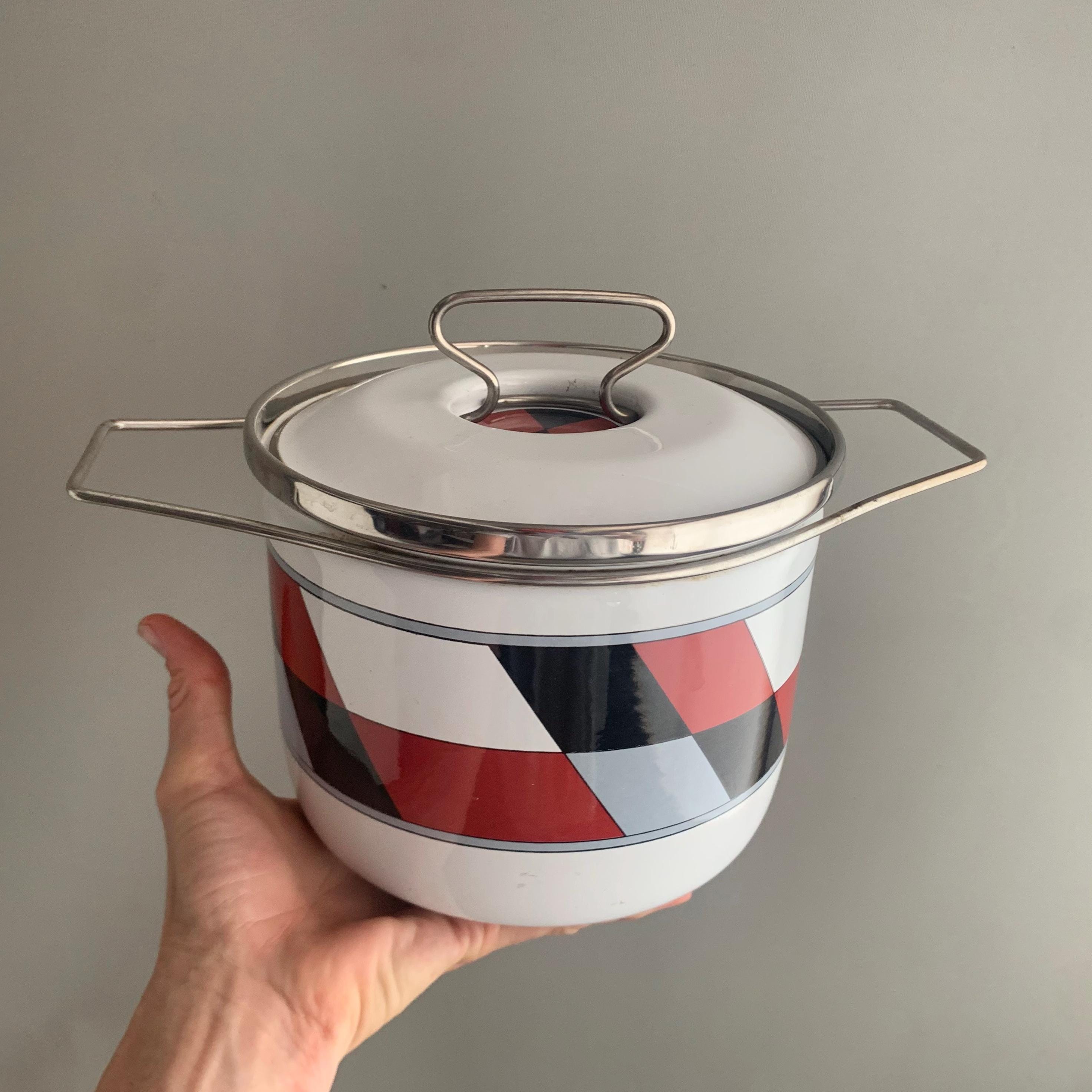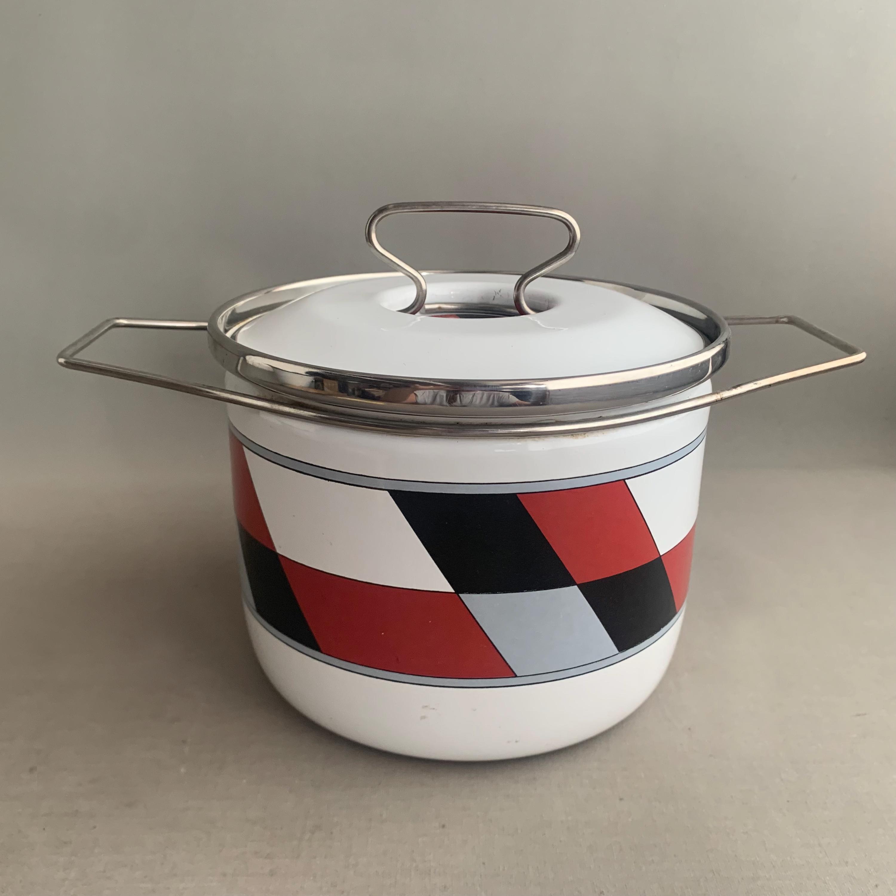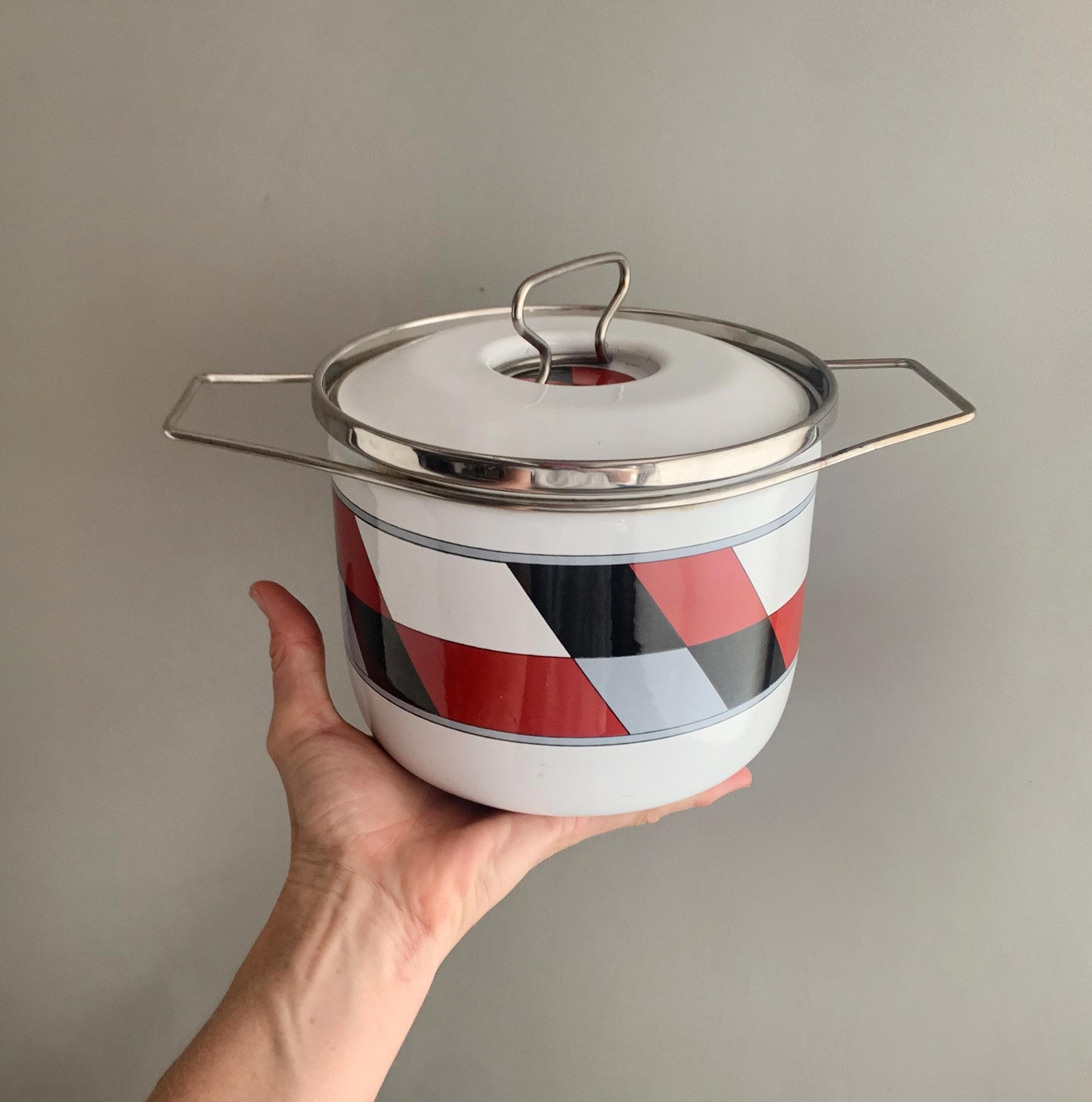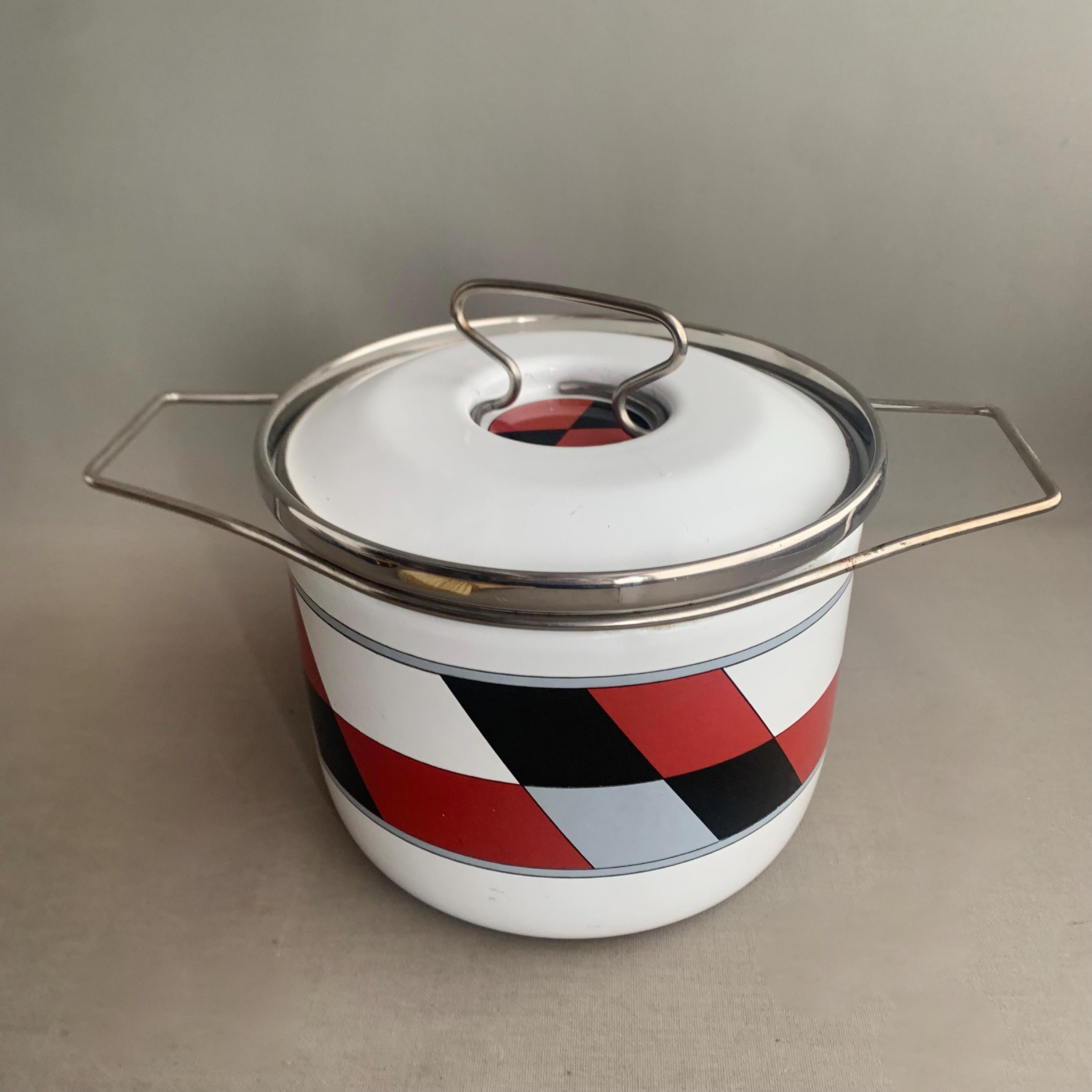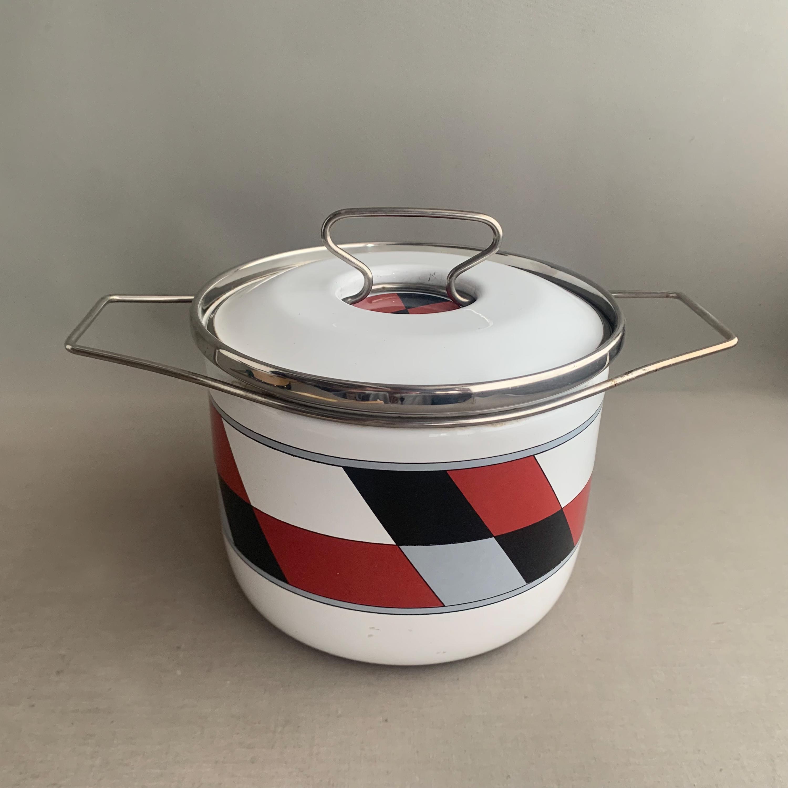 A 1960’s enamel cooking pot. In white, brick red and black, made in Italy, by Siltal, circa 1960s, designed by Carla Agnelli. In excellent vintage condition, was barely used, just has some little marks on the exterior ( see photos) which have not effected the enamel .Pattern is very stylish