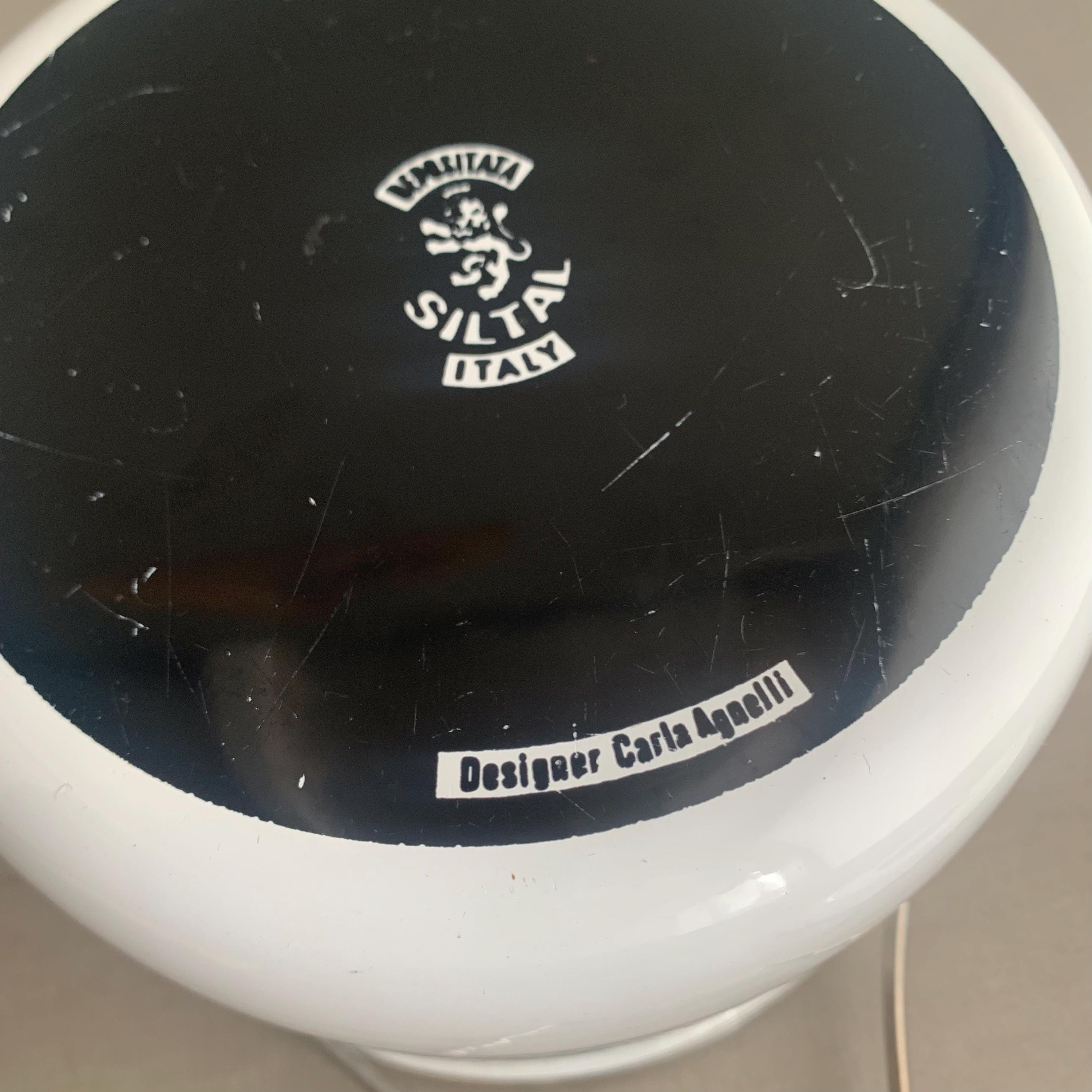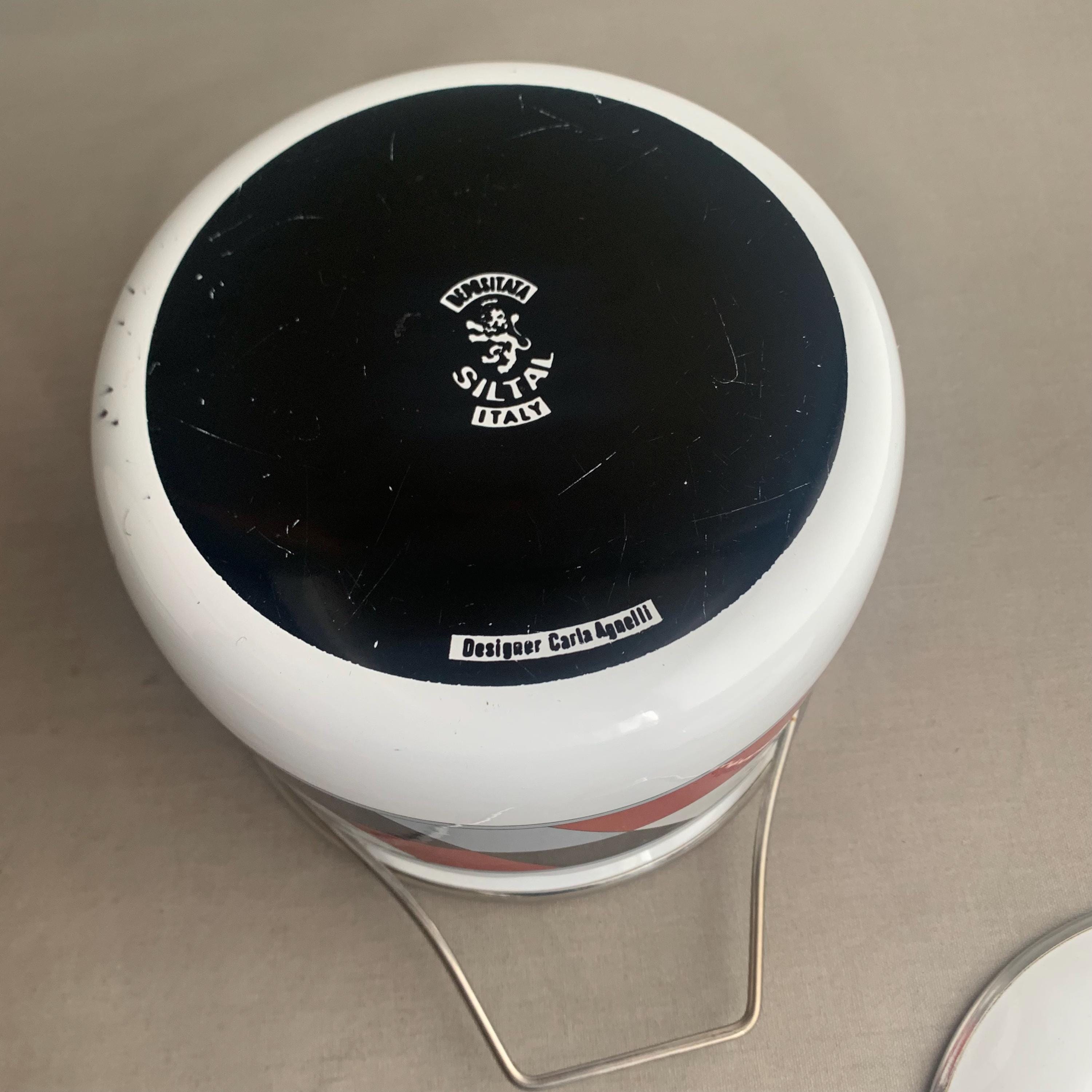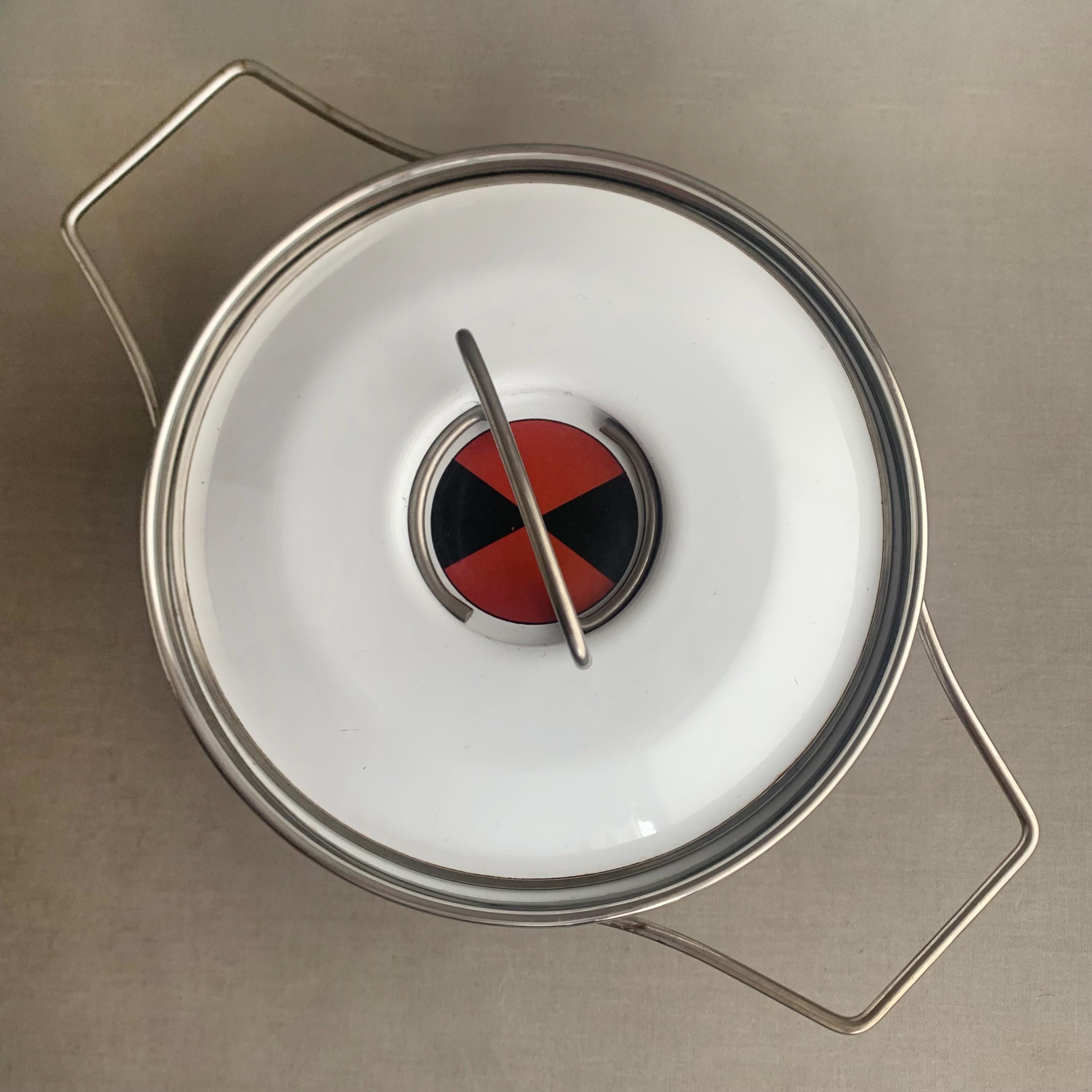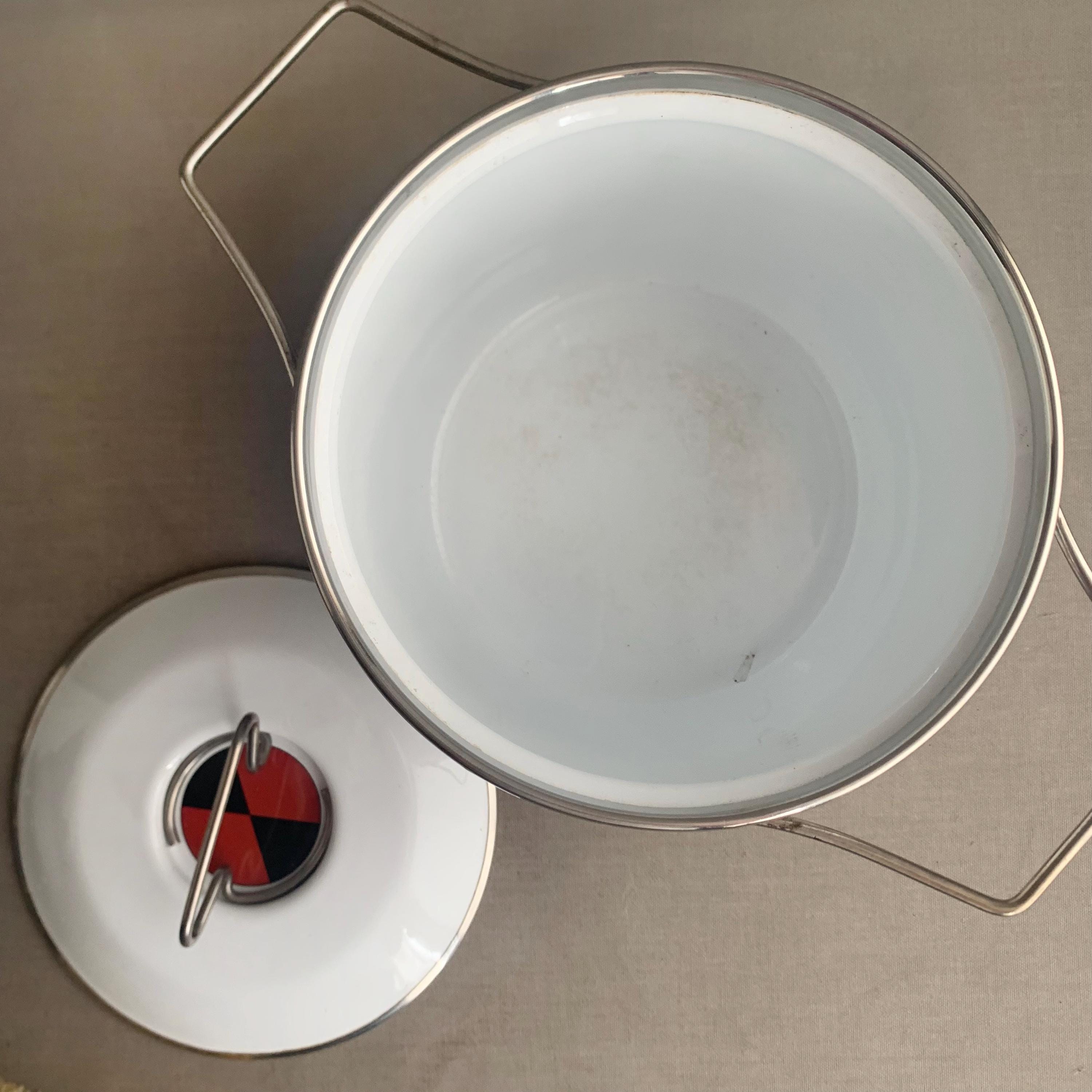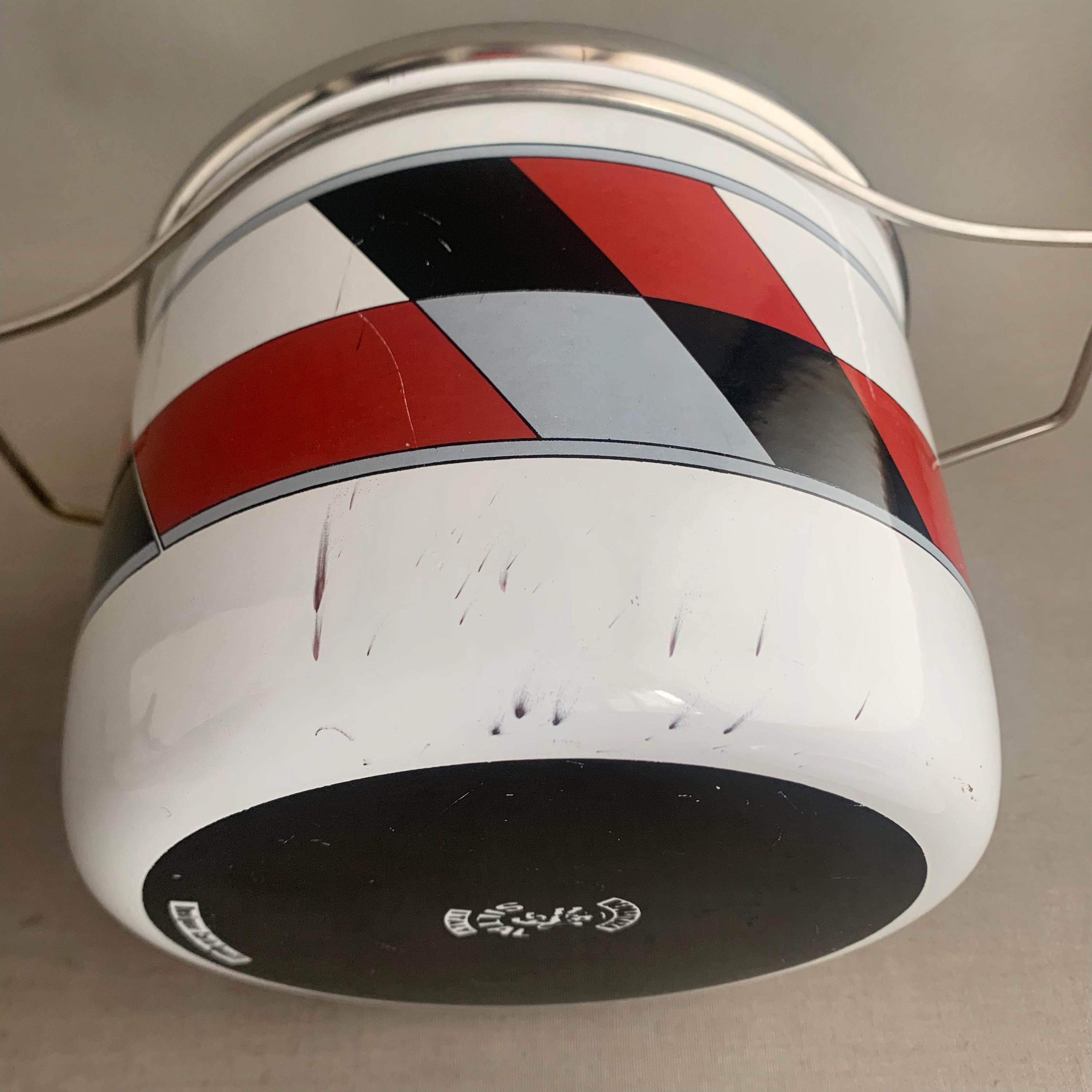 A 1960’s enamel cooking pot. In white, brick red and black, made in Italy, by Siltal, circa 1960s, designed by Carla Agnelli. In excellent vintage condition, was barely used, just has some little marks on the exterior ( see photos) which have not effected the enamel .Pattern is very stylish