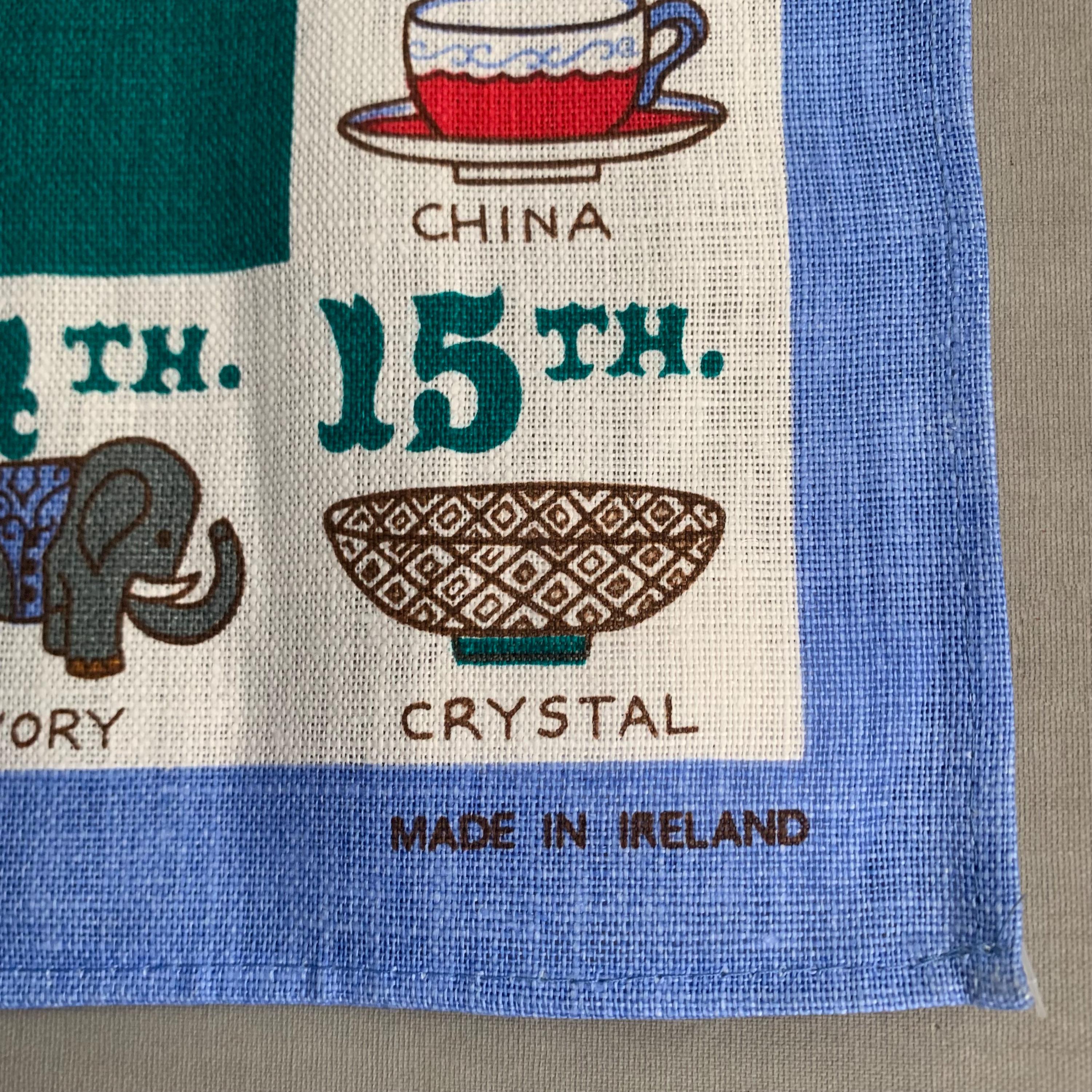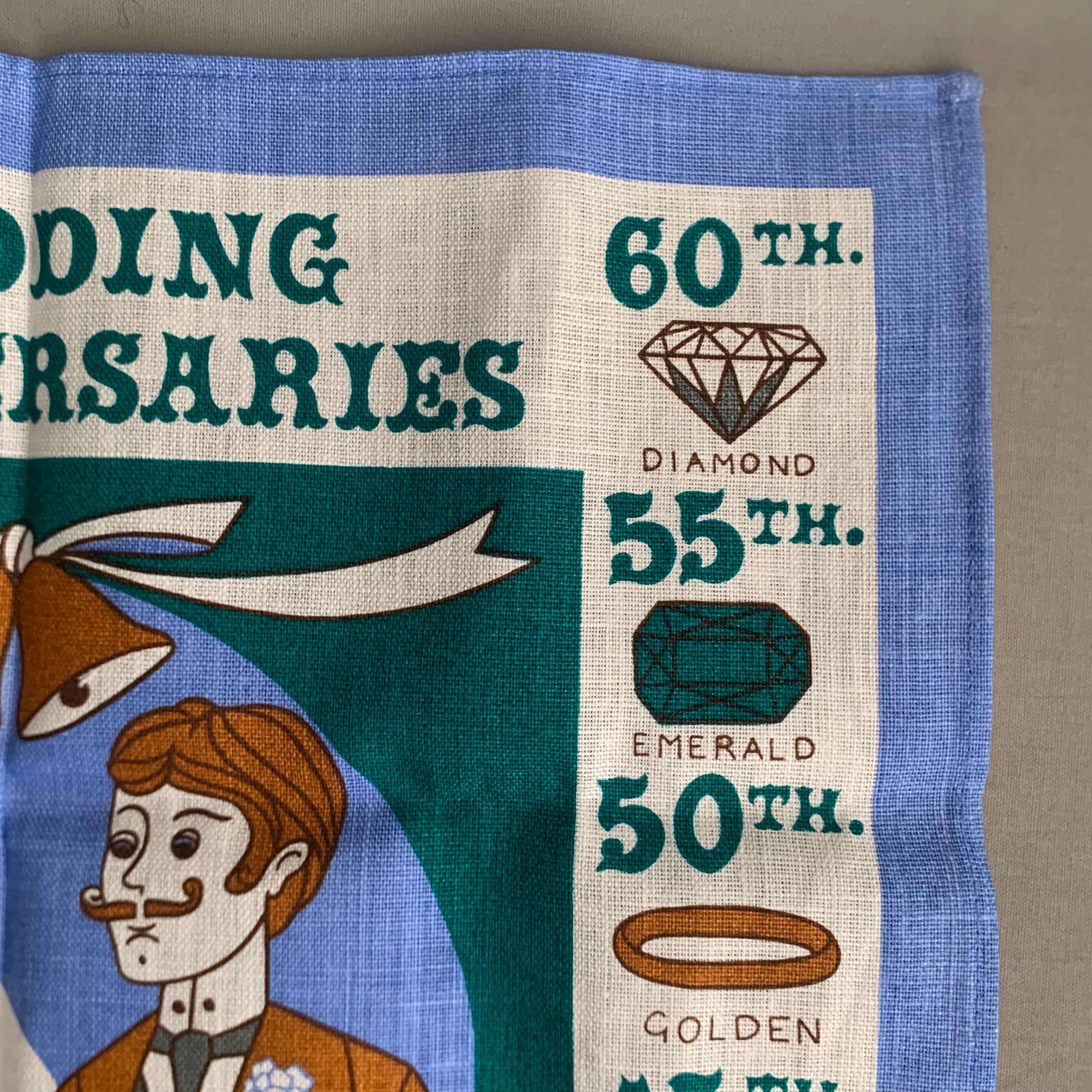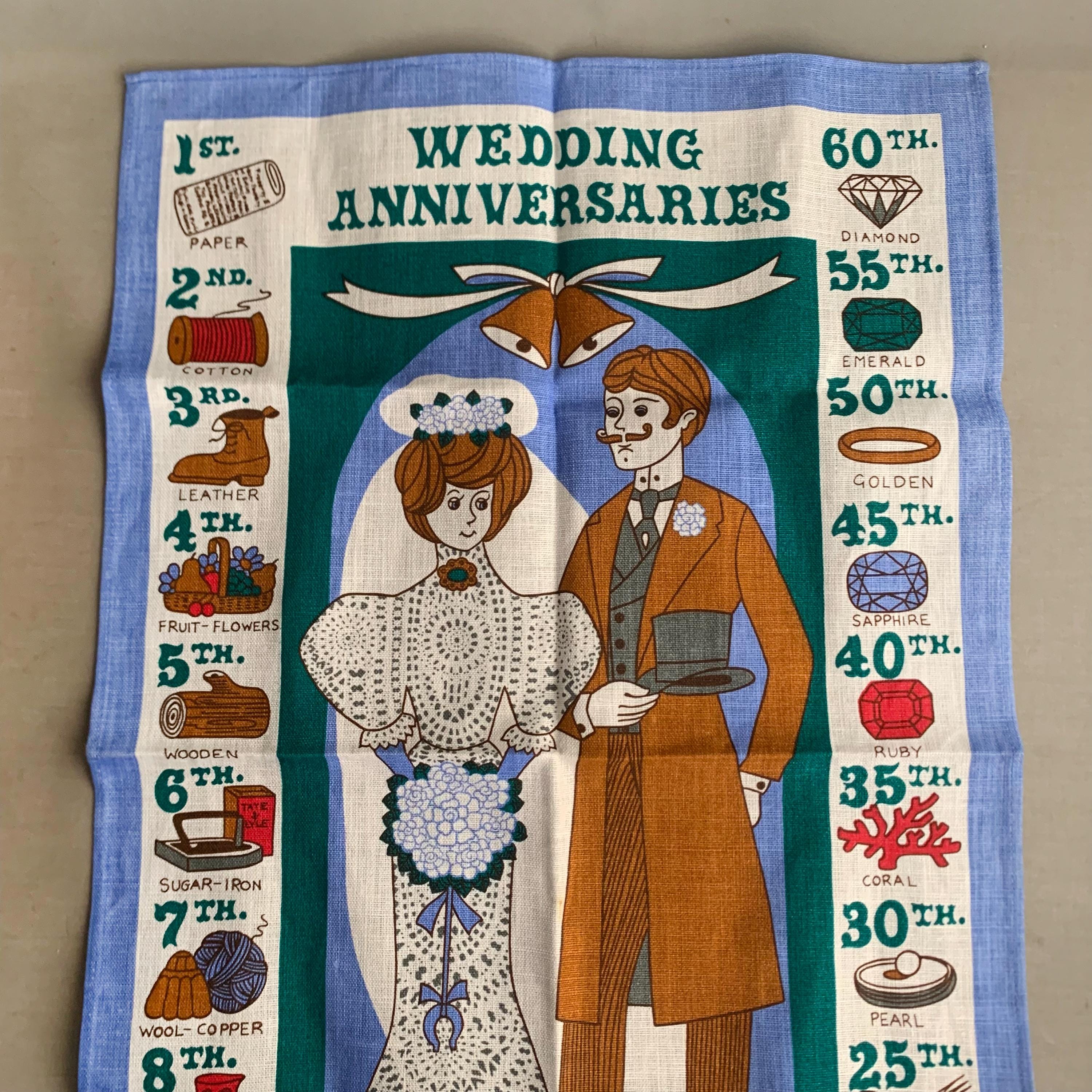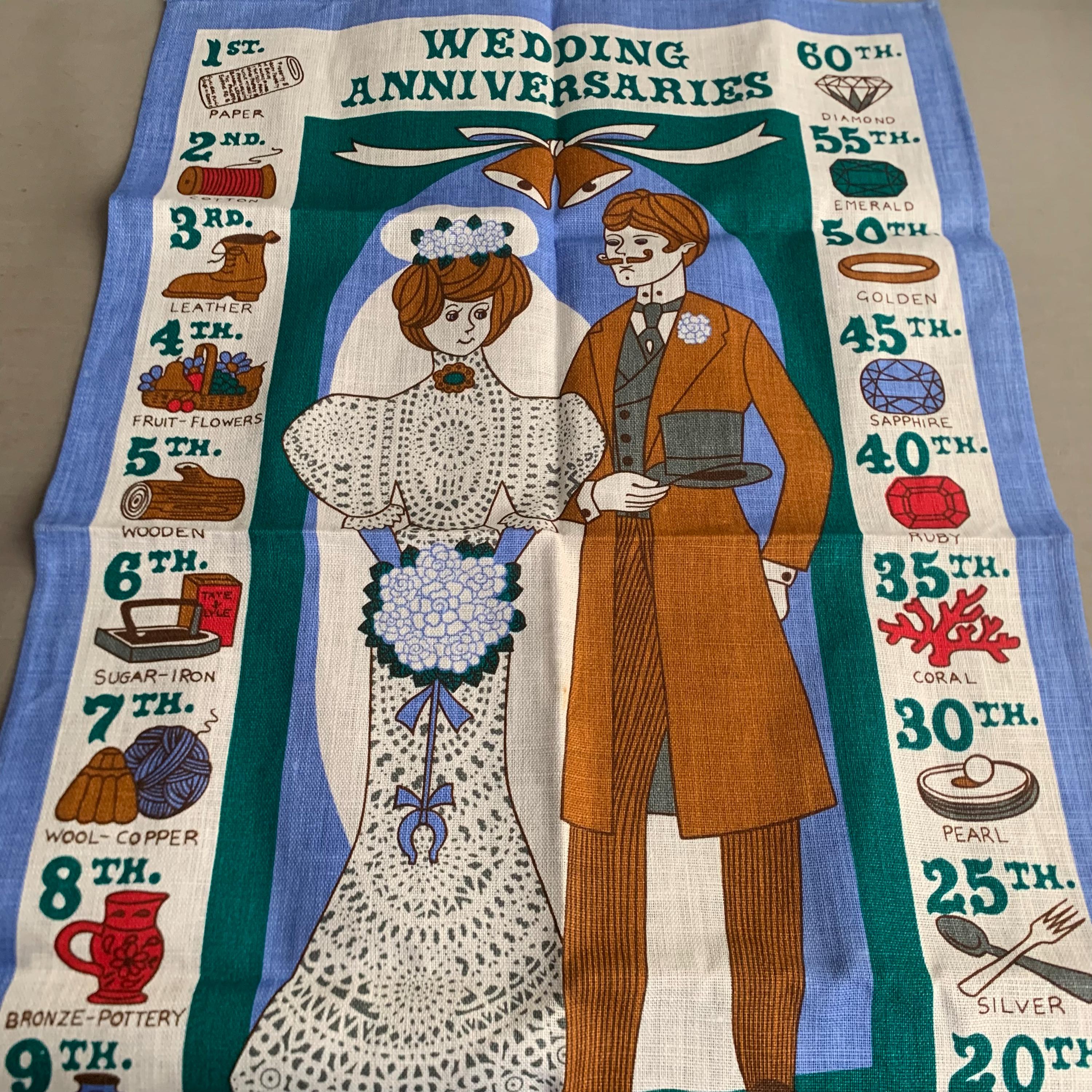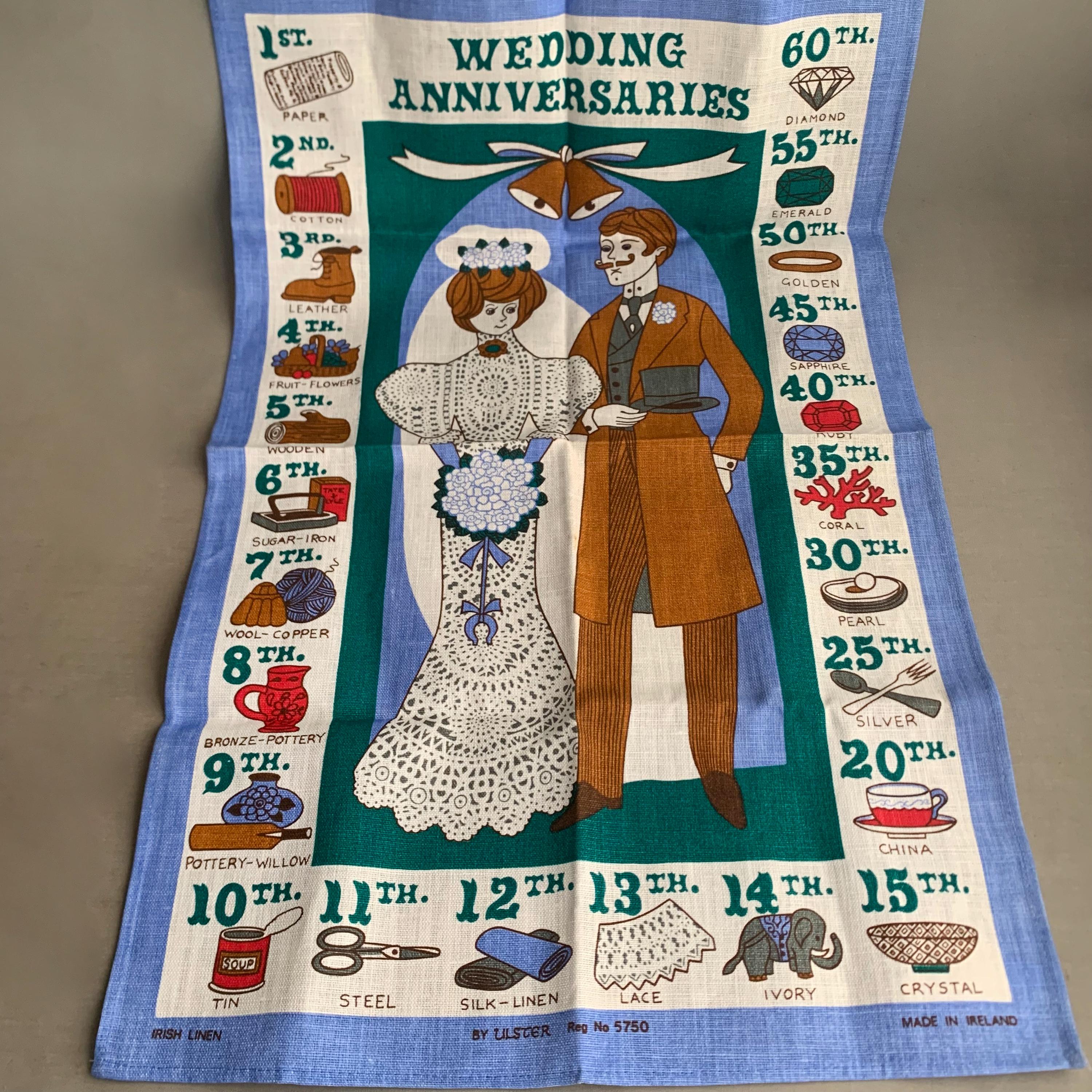 A sweet vintage irish linen tea towel that features gifts for wedding anniversaries for years 1-20, 25, 30, 35, 40, 45, 50, 55 & 60. Fabulous bride & groom. Wonderful 70s tea towel made in Ireland by Ulster, reg. no. 4904