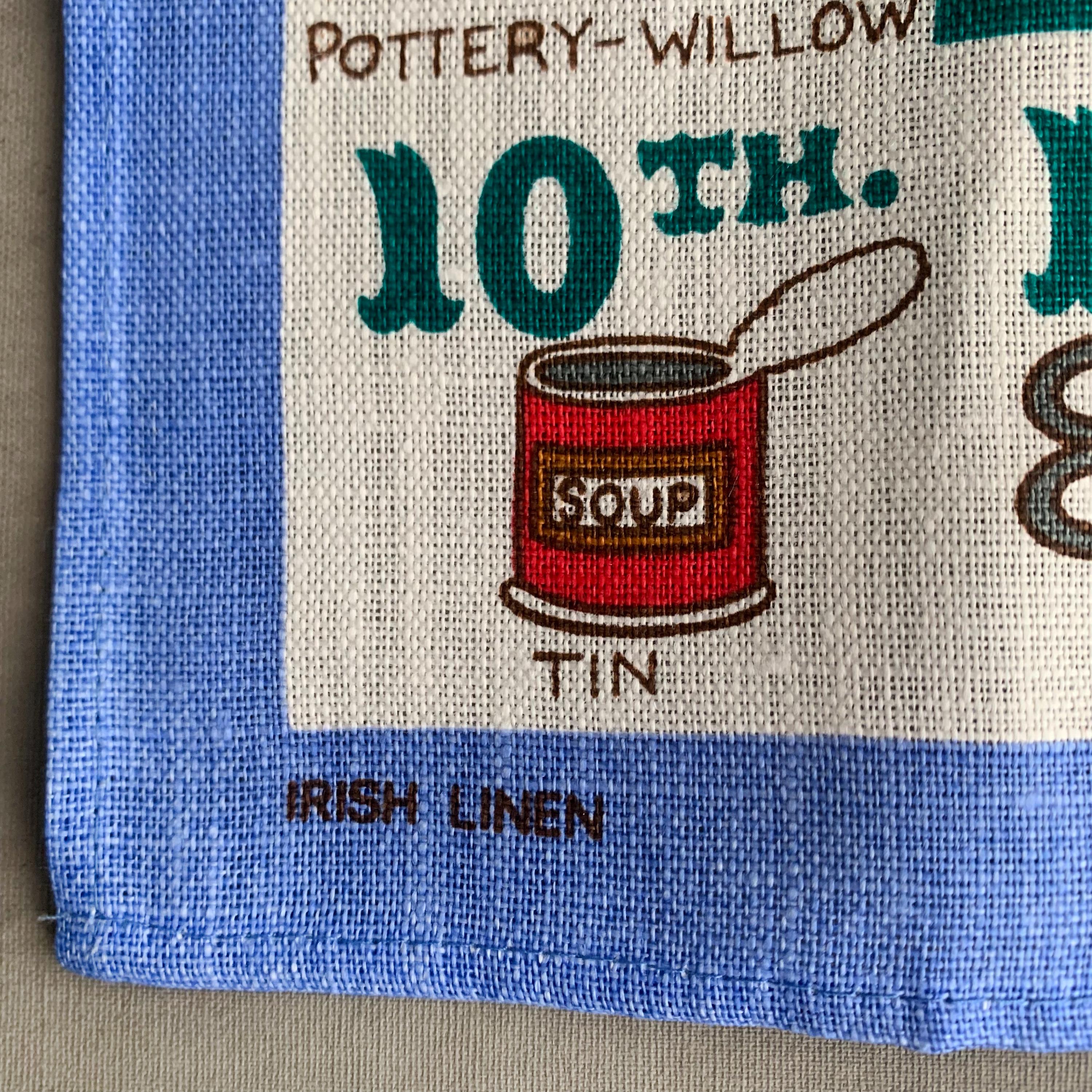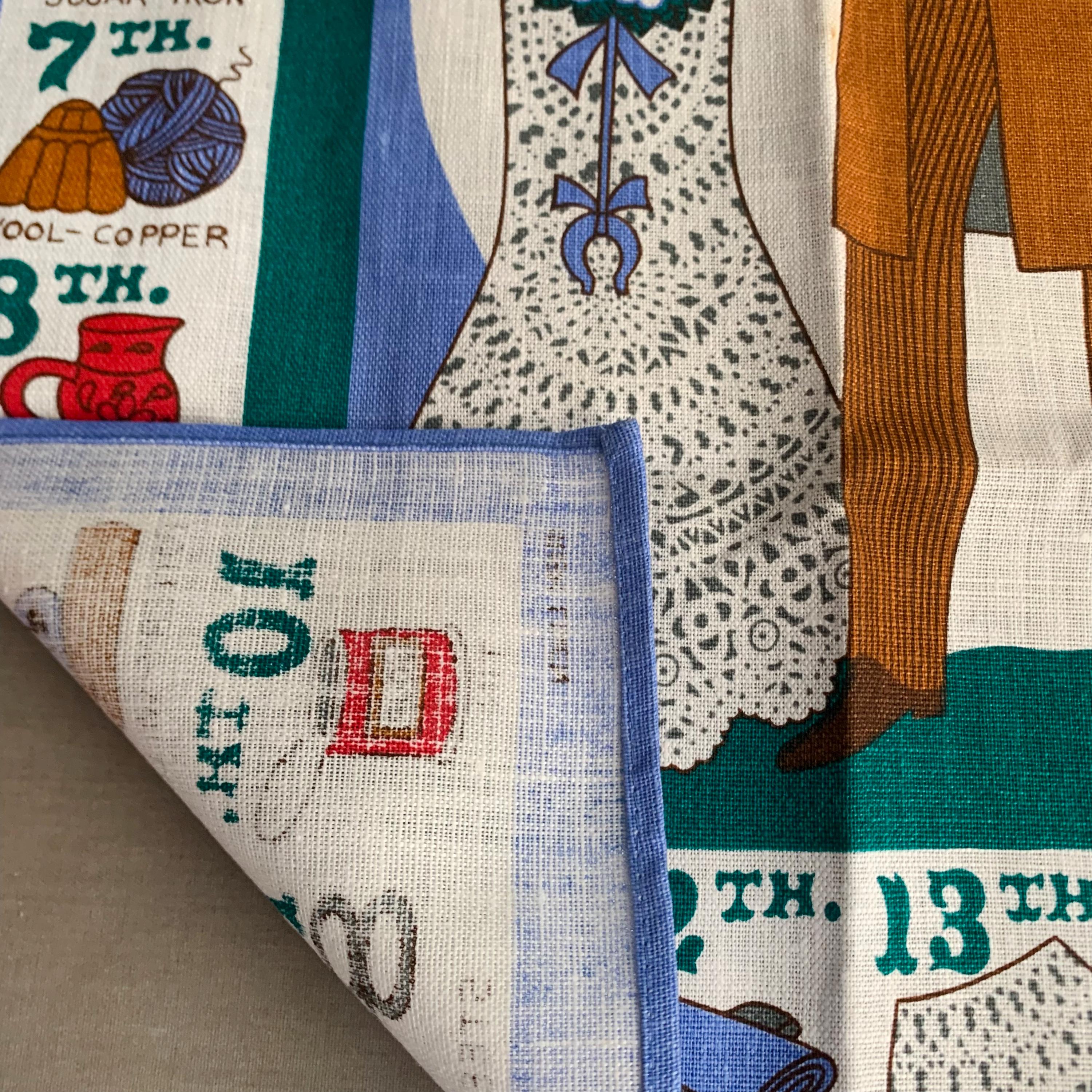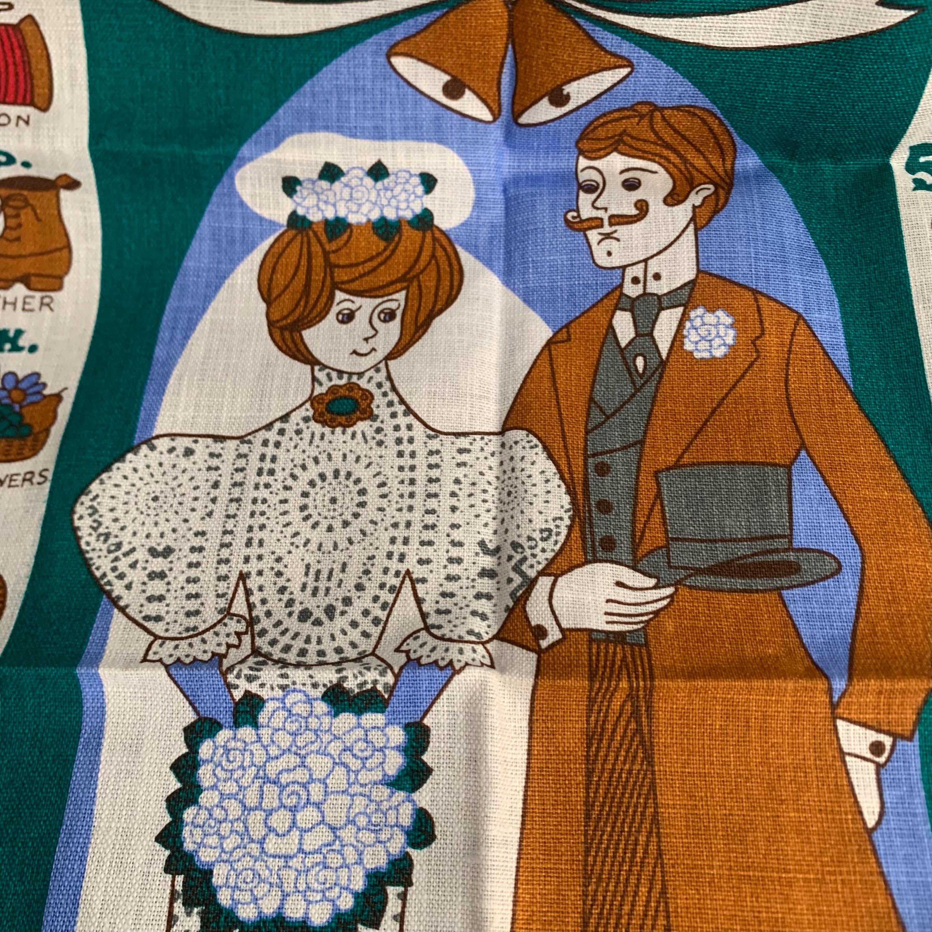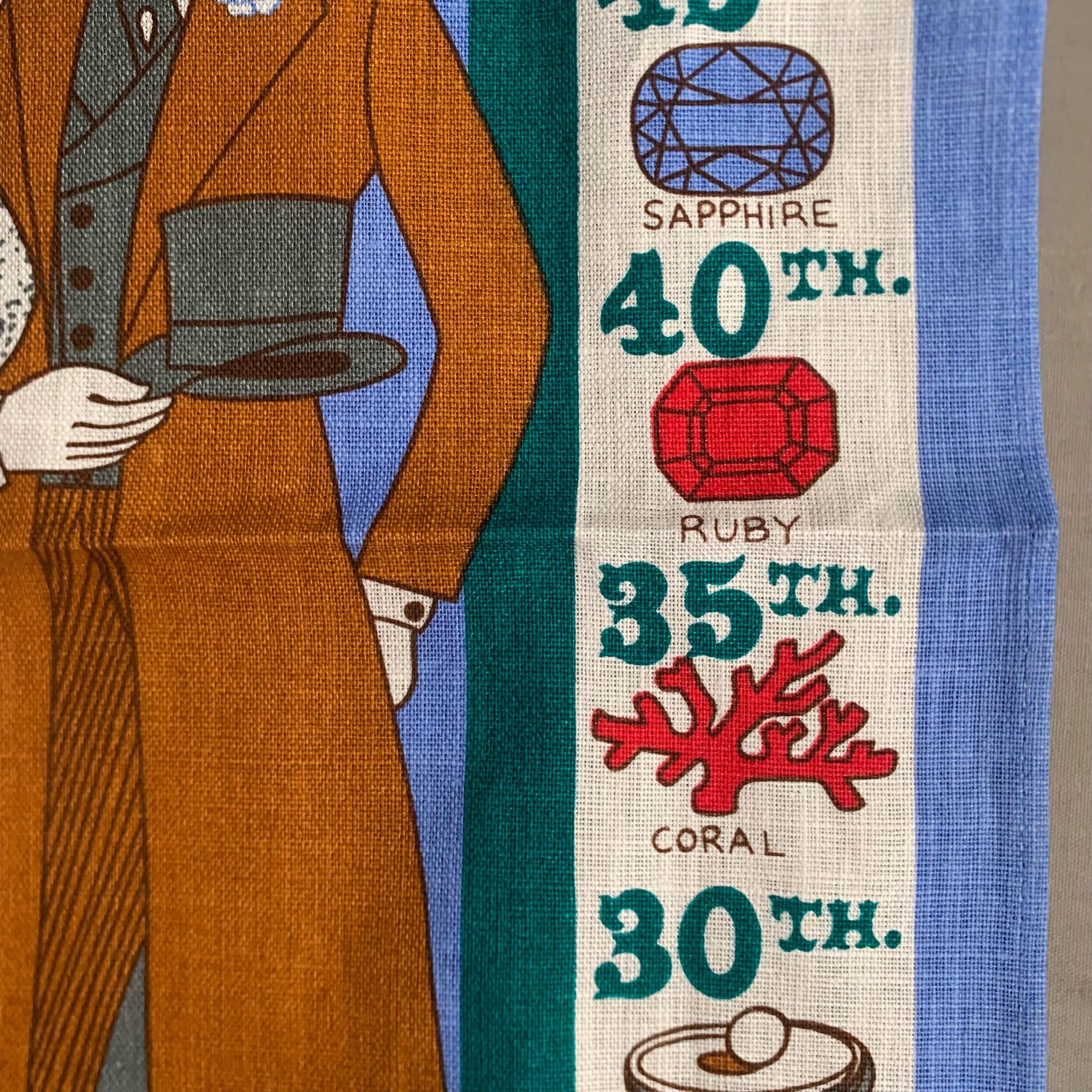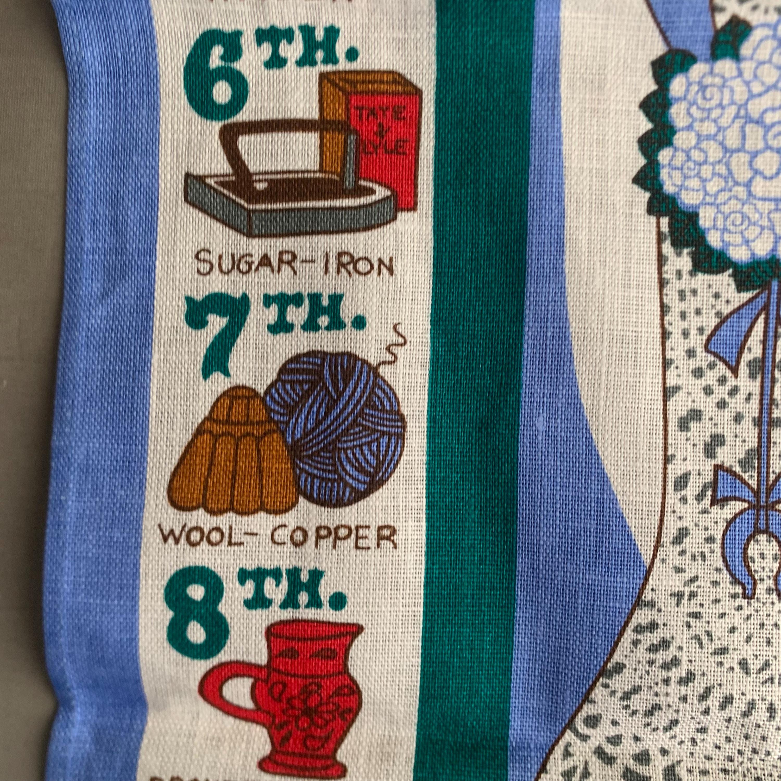 A sweet vintage irish linen tea towel that features gifts for wedding anniversaries for years 1-20, 25, 30, 35, 40, 45, 50, 55 & 60. Fabulous bride & groom. Wonderful 70s tea towel made in Ireland by Ulster, reg. no. 4904