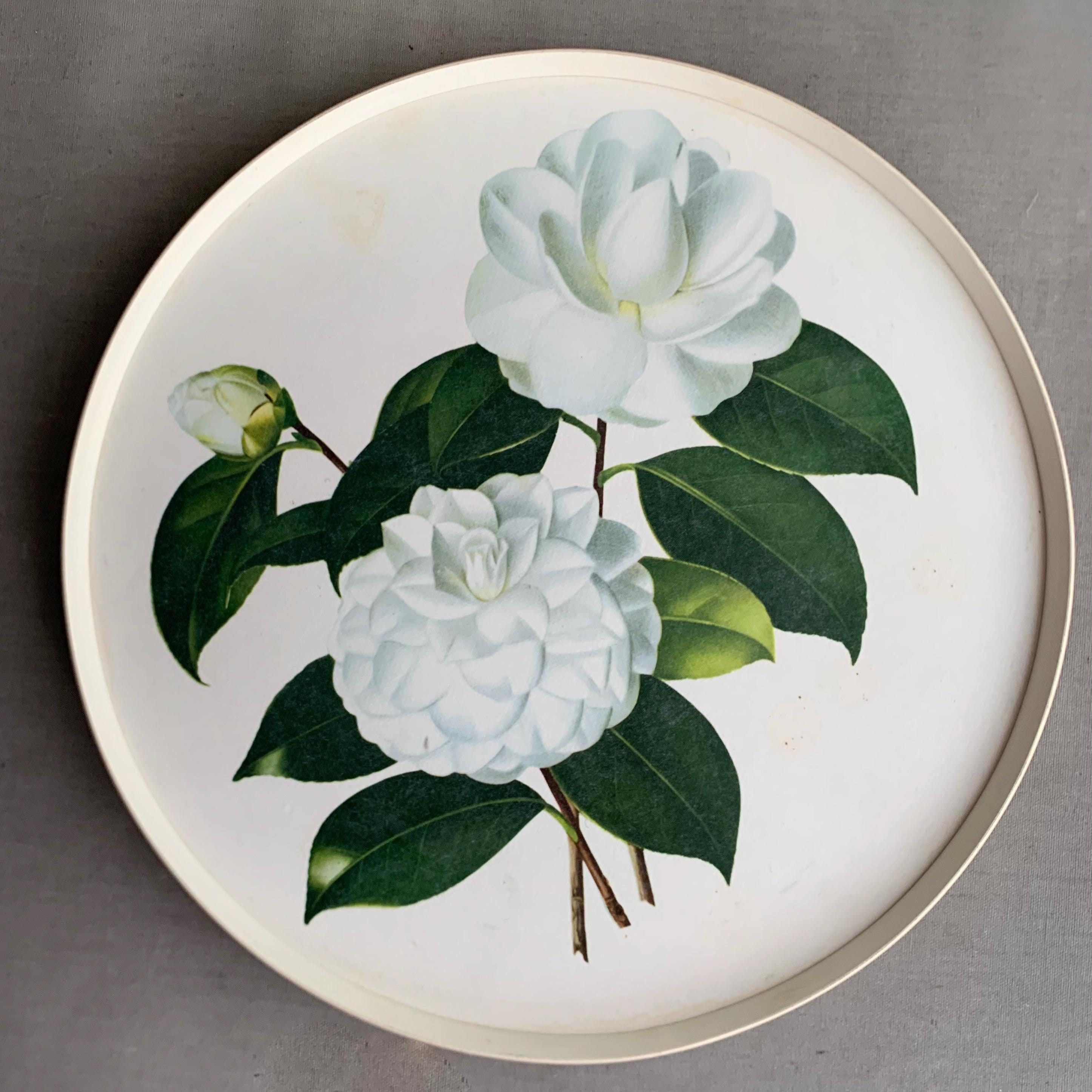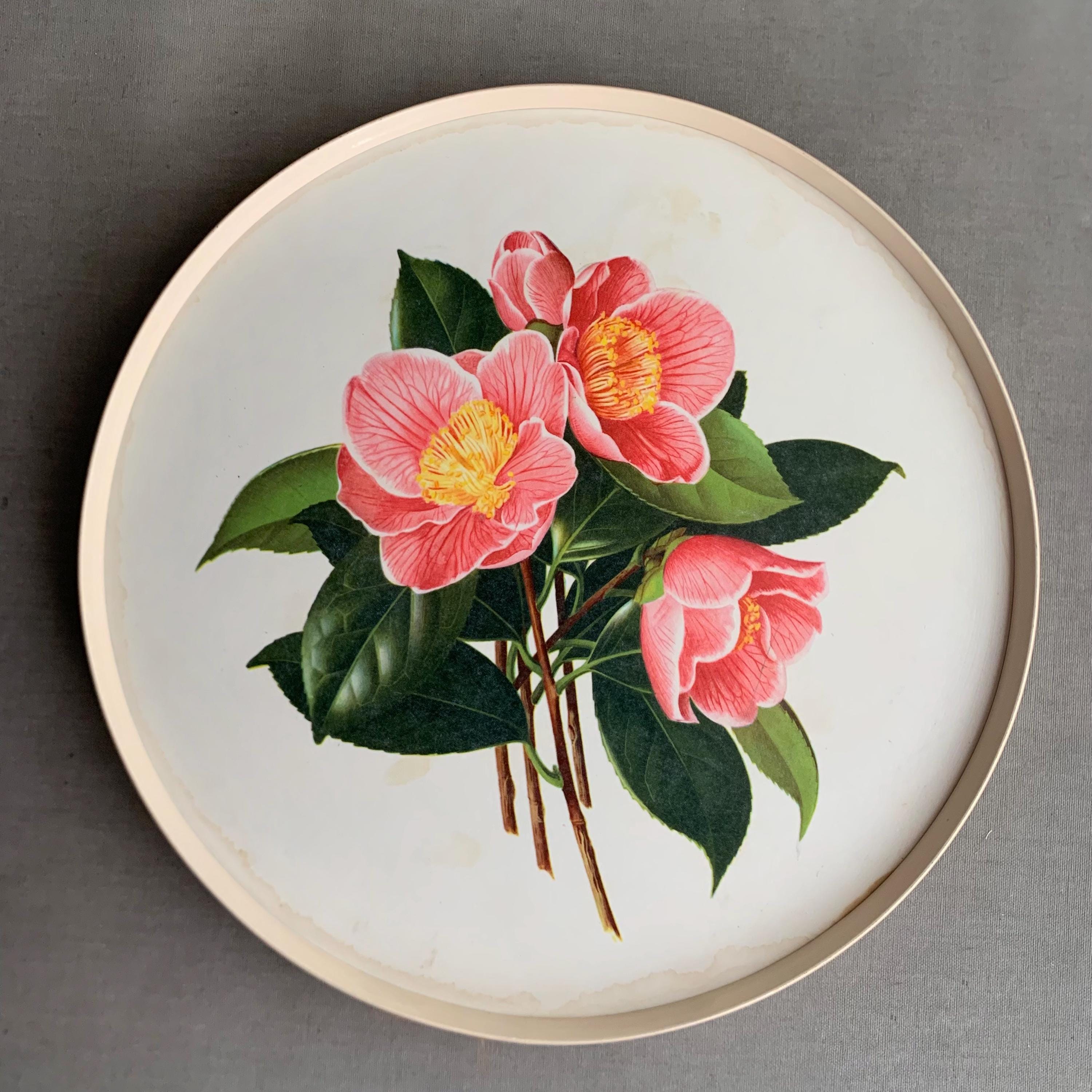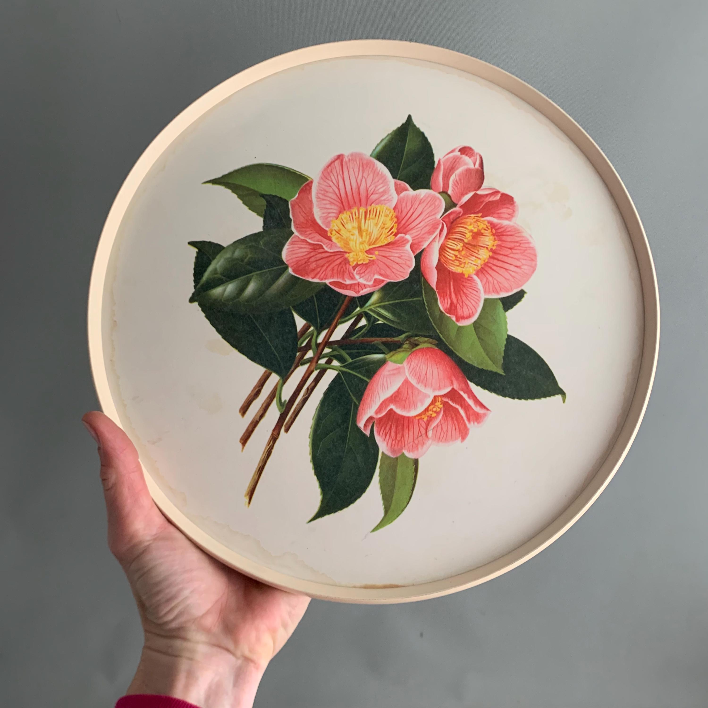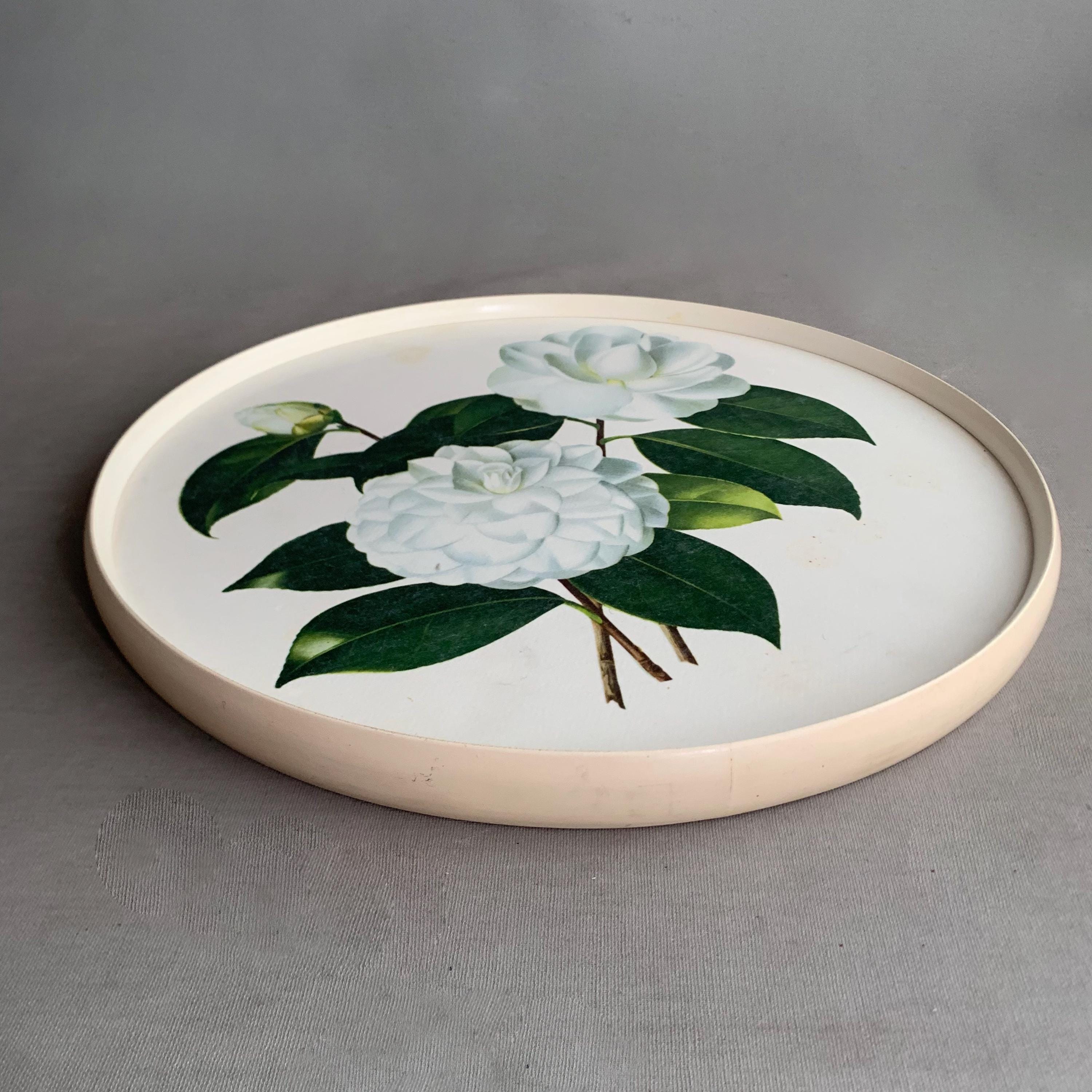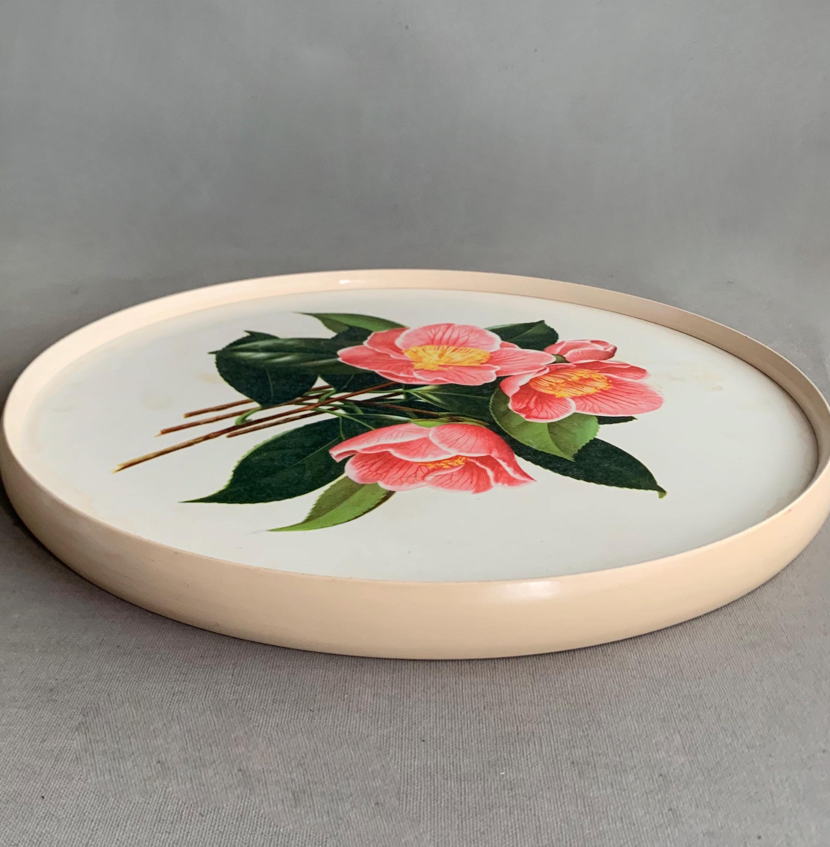 A useful little tray that has Camellia flowers on each side - one side pink, one side white . plastic rim edge and a wipeable melamine surface circa 1970s . A few age related marks ( see picture)