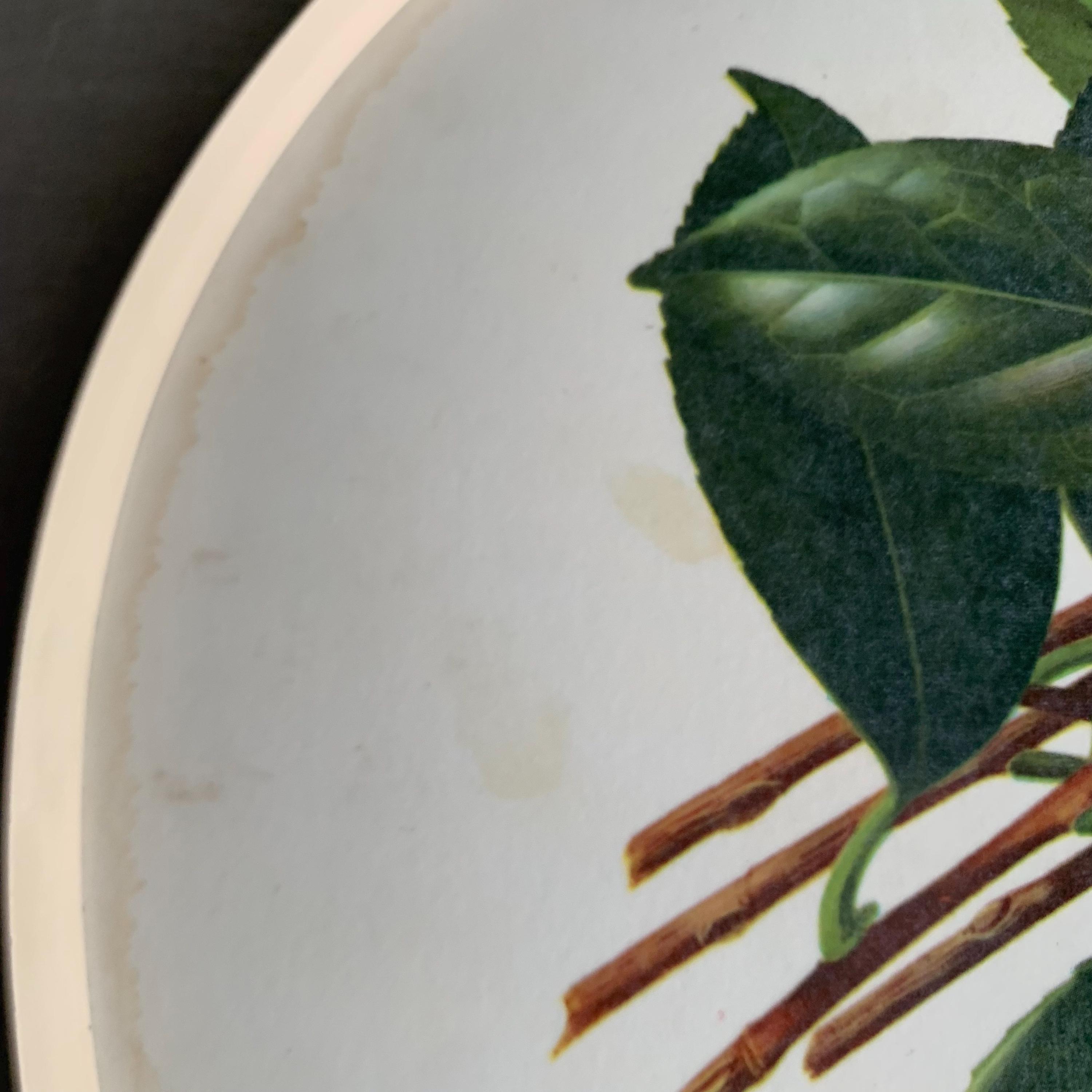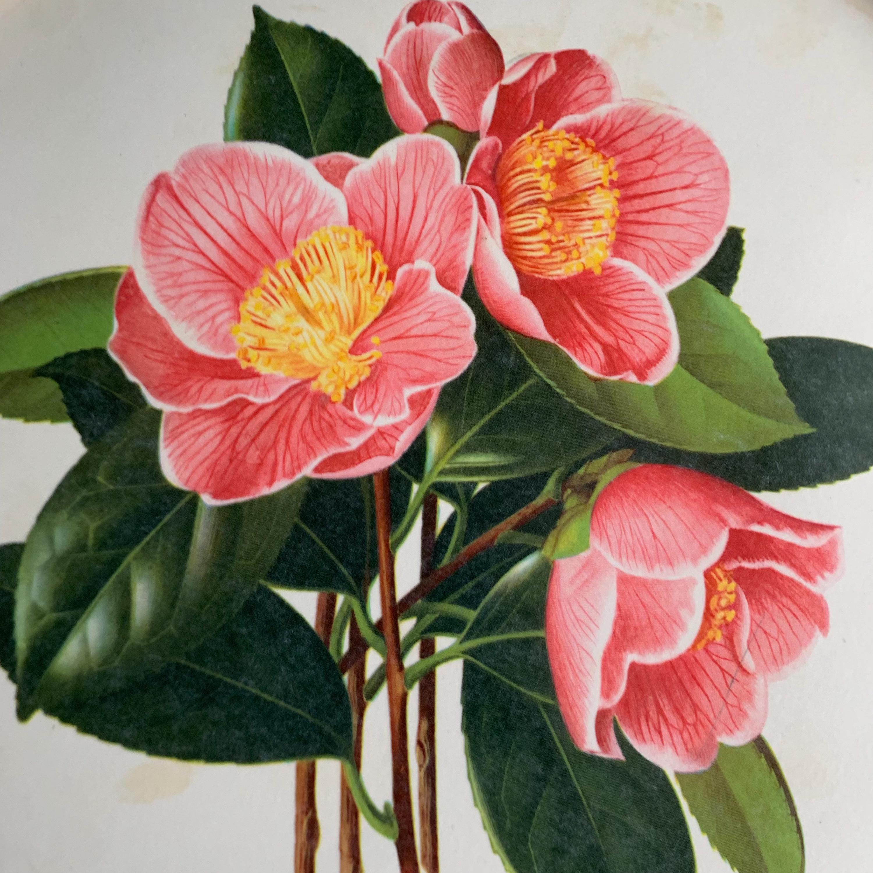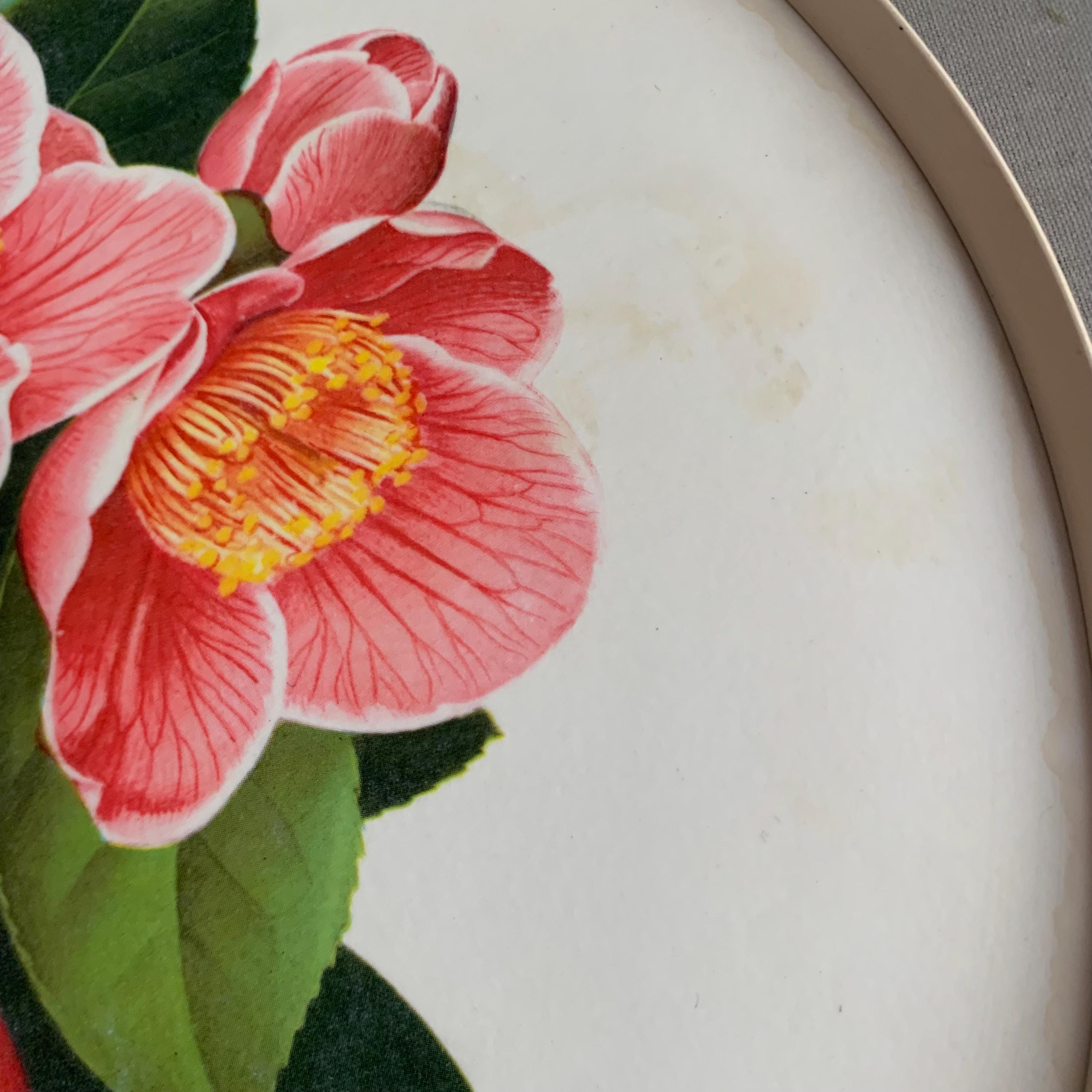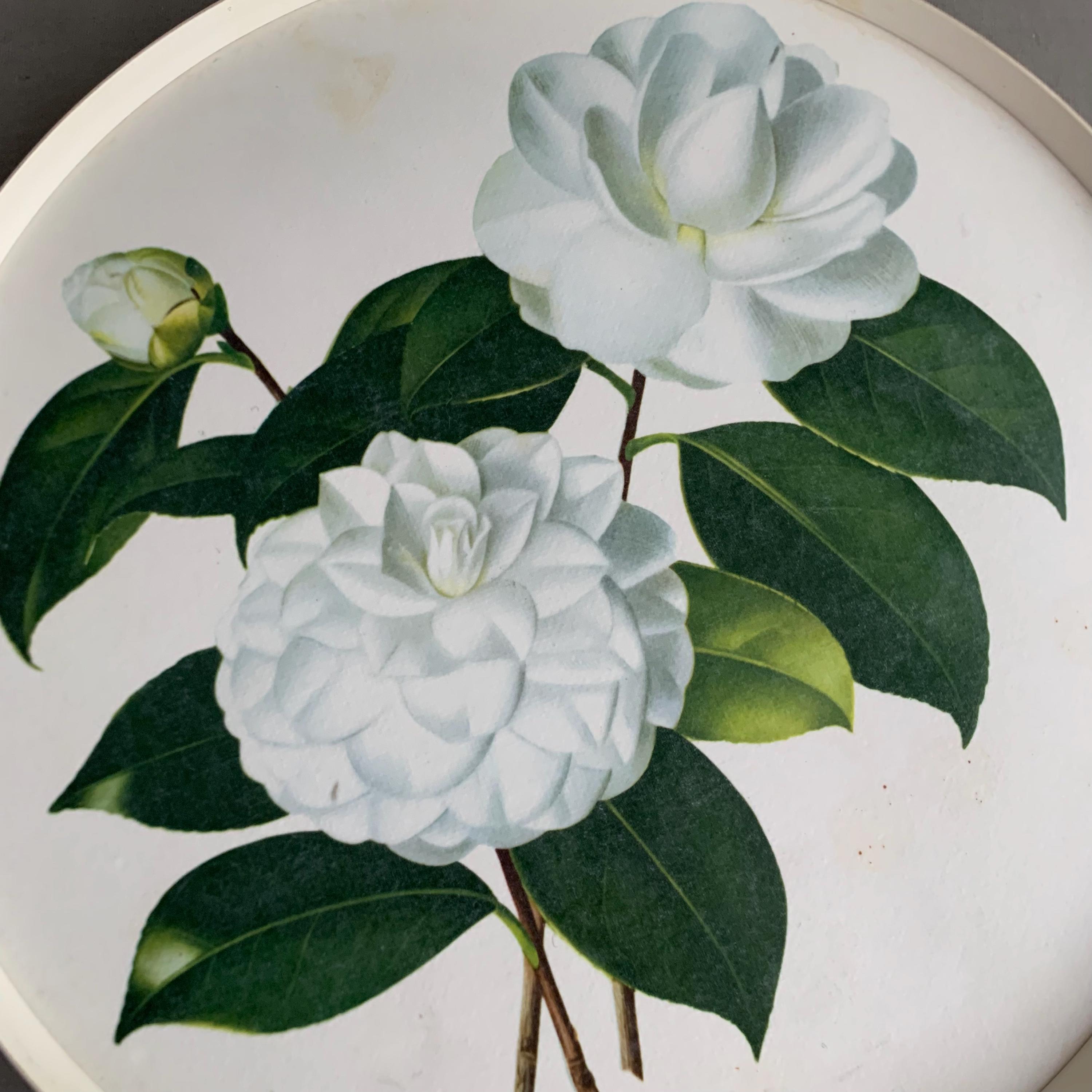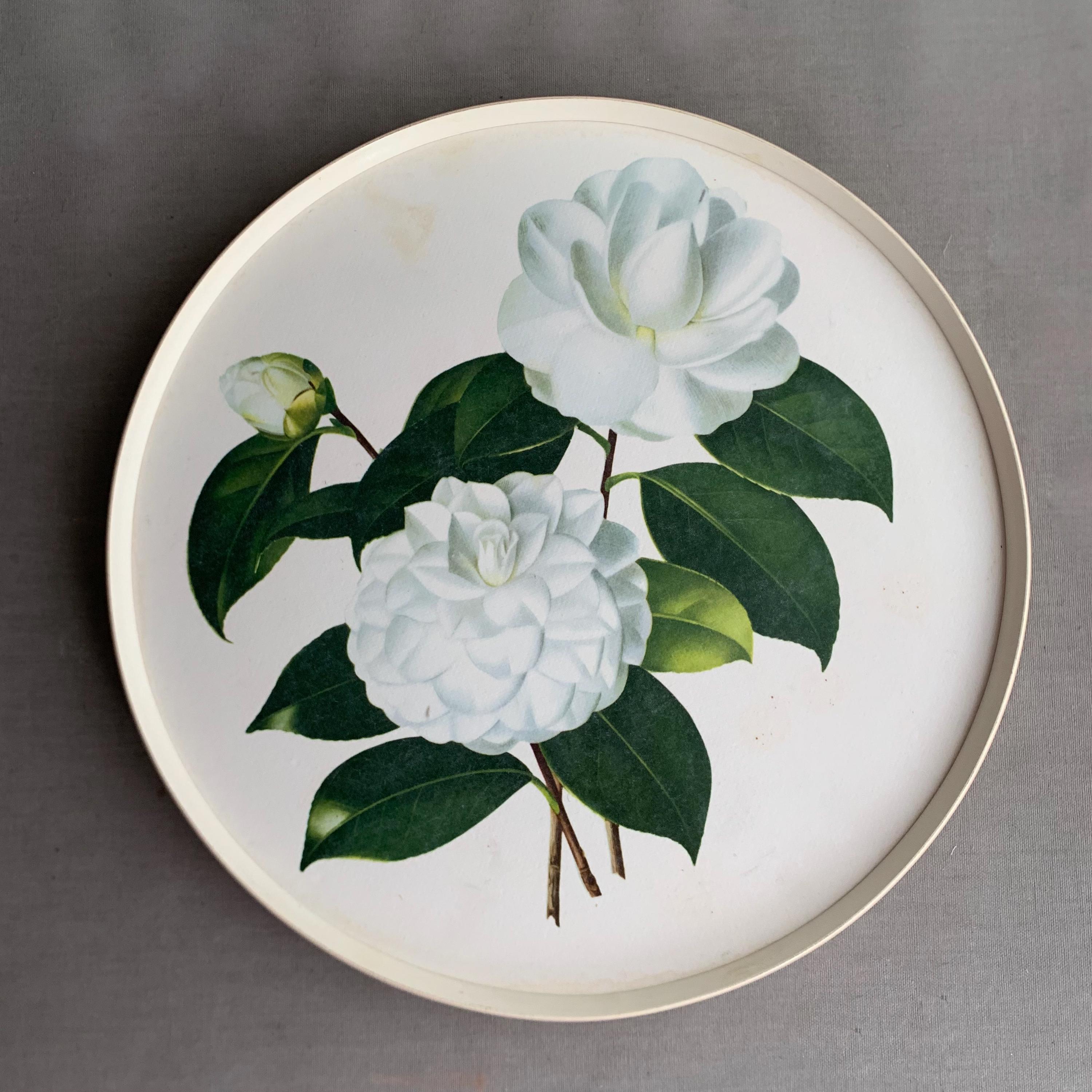 A useful little tray that has Camellia flowers on each side - one side pink, one side white . plastic rim edge and a wipeable melamine surface circa 1970s . A few age related marks ( see picture)