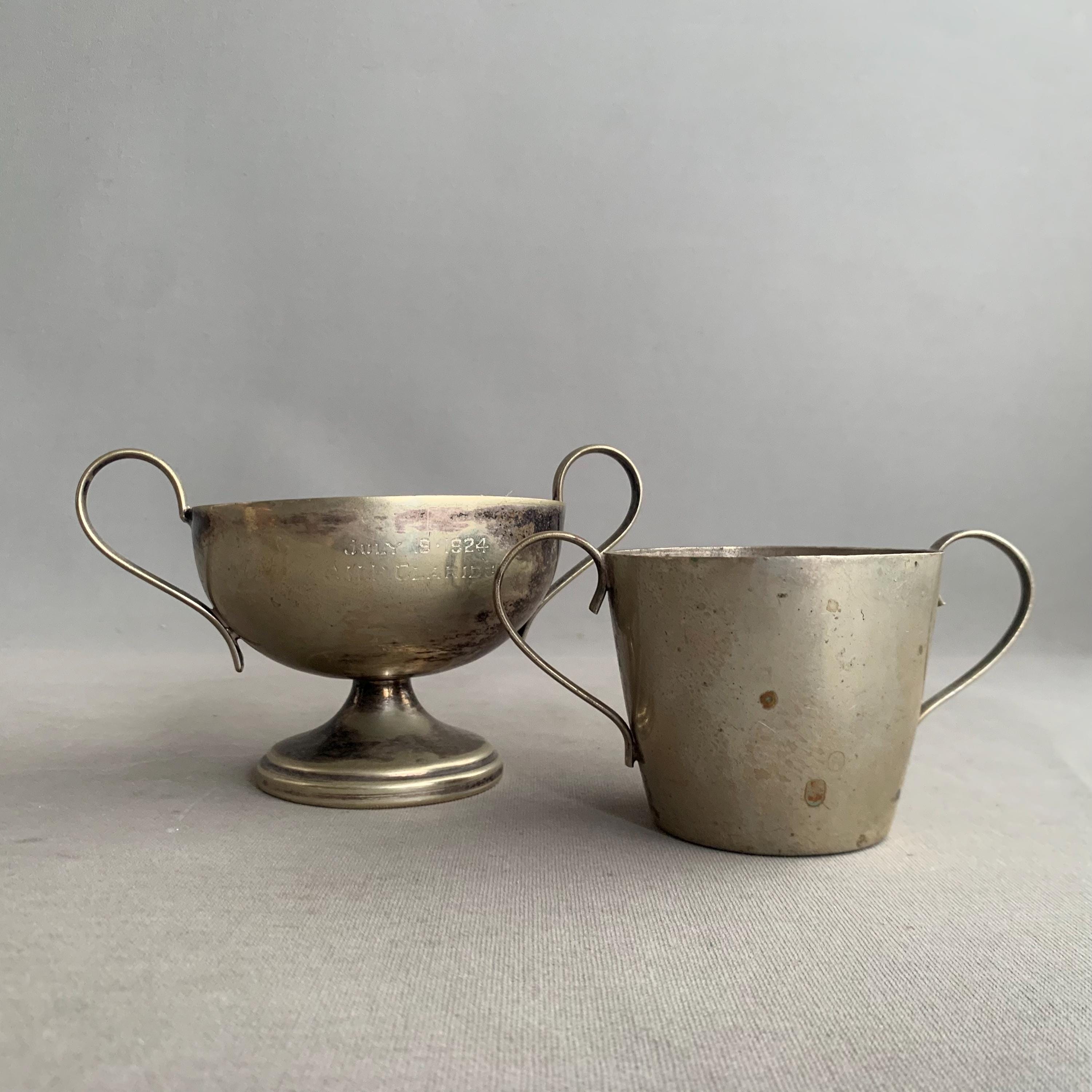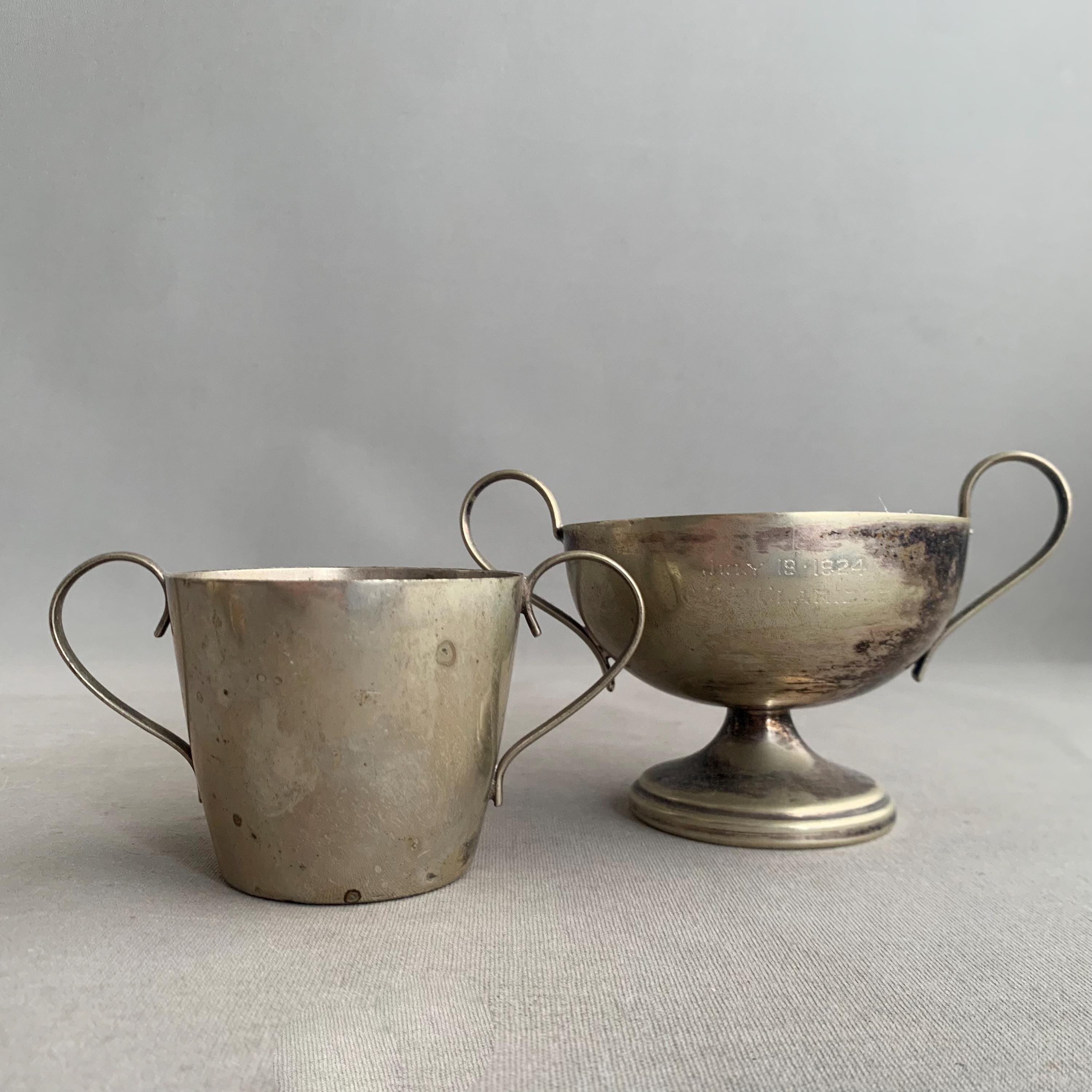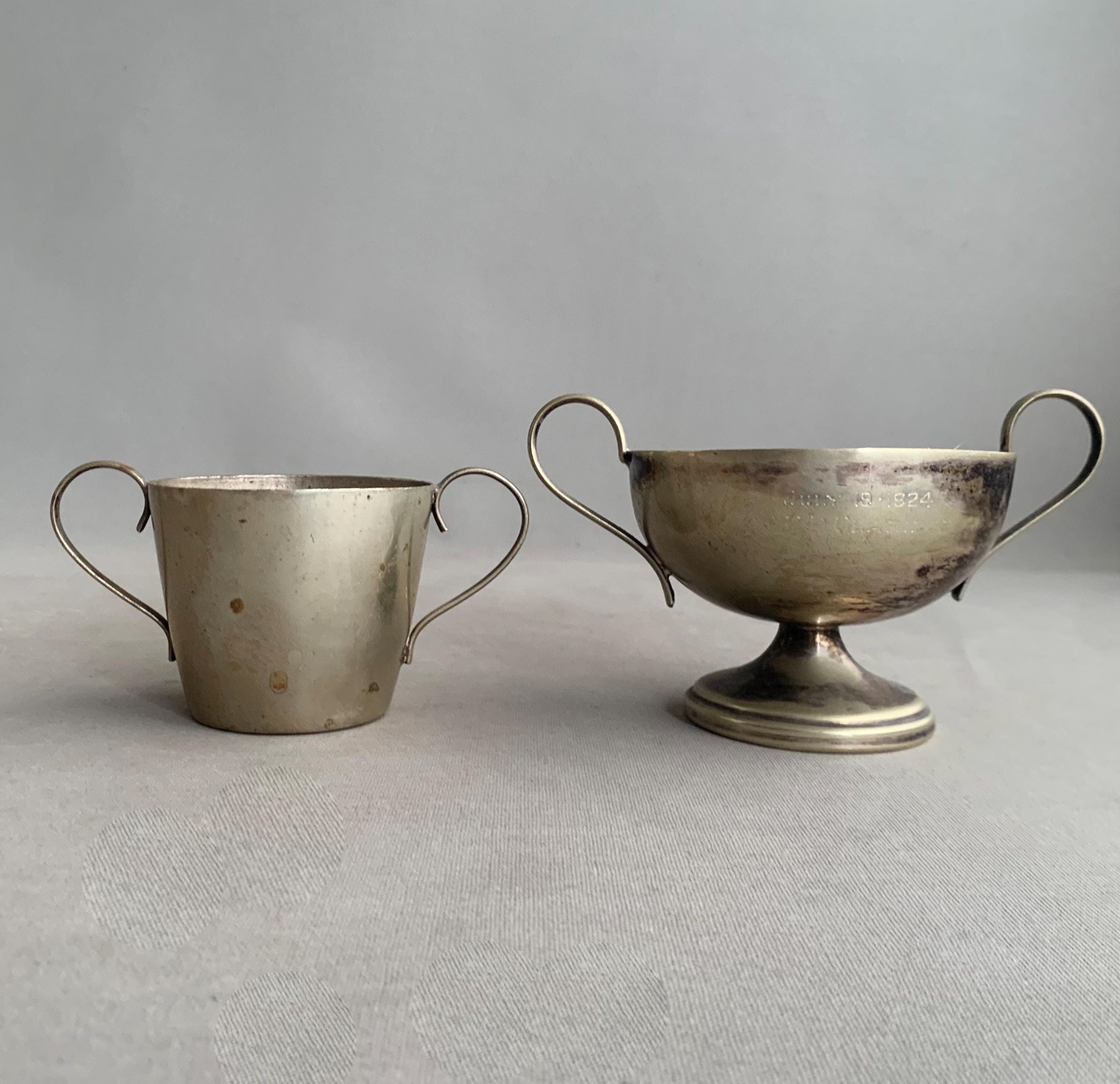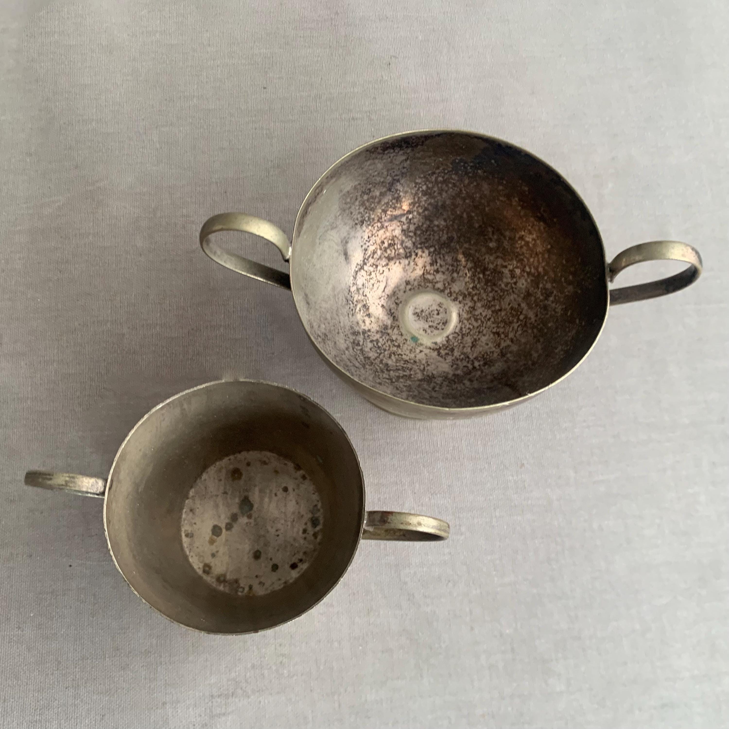 A battered but very charming character full trophies in a usefull shape- would maje good sugar bowls and saly pot. Nice patina with the tarnished metal