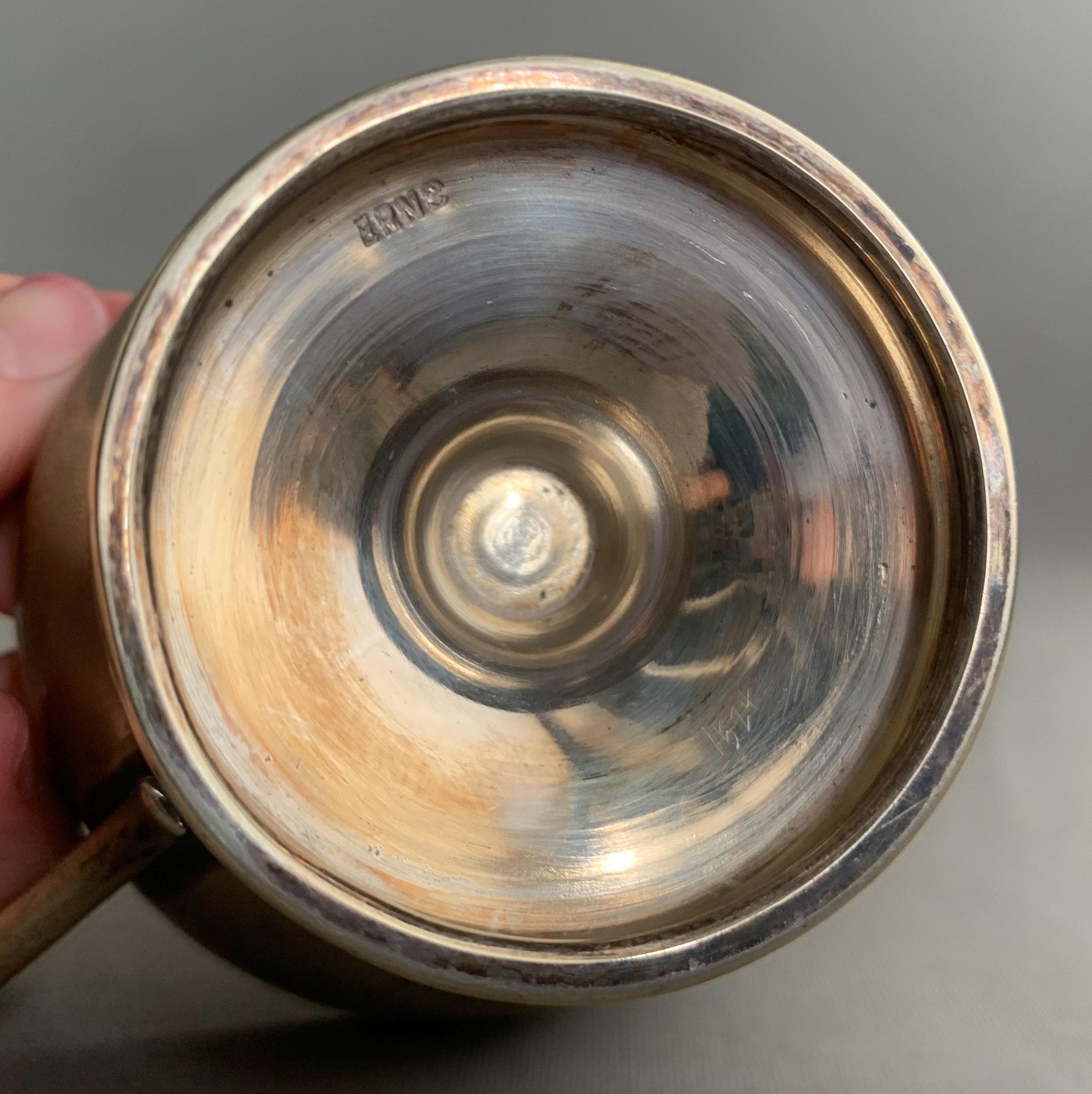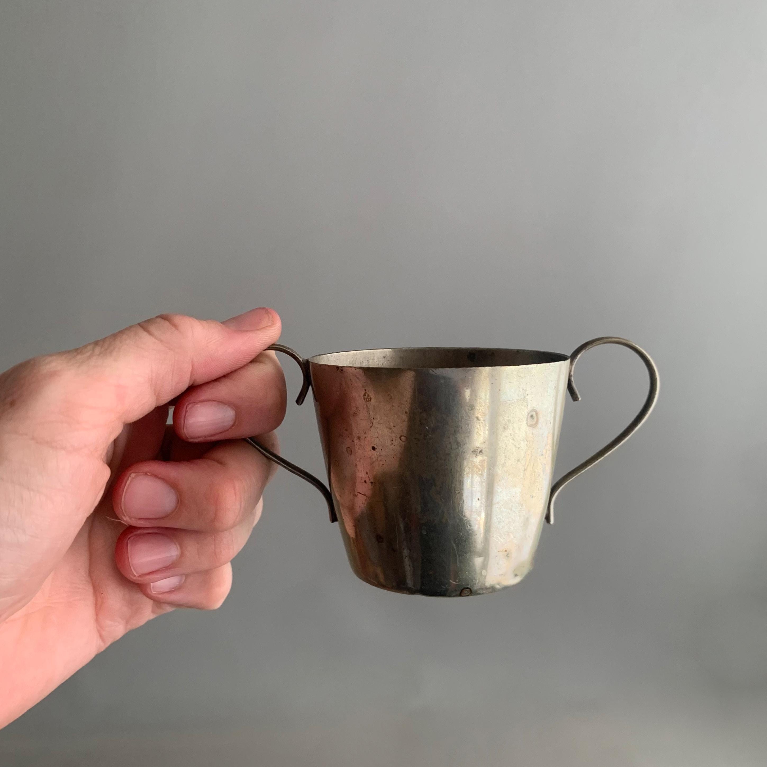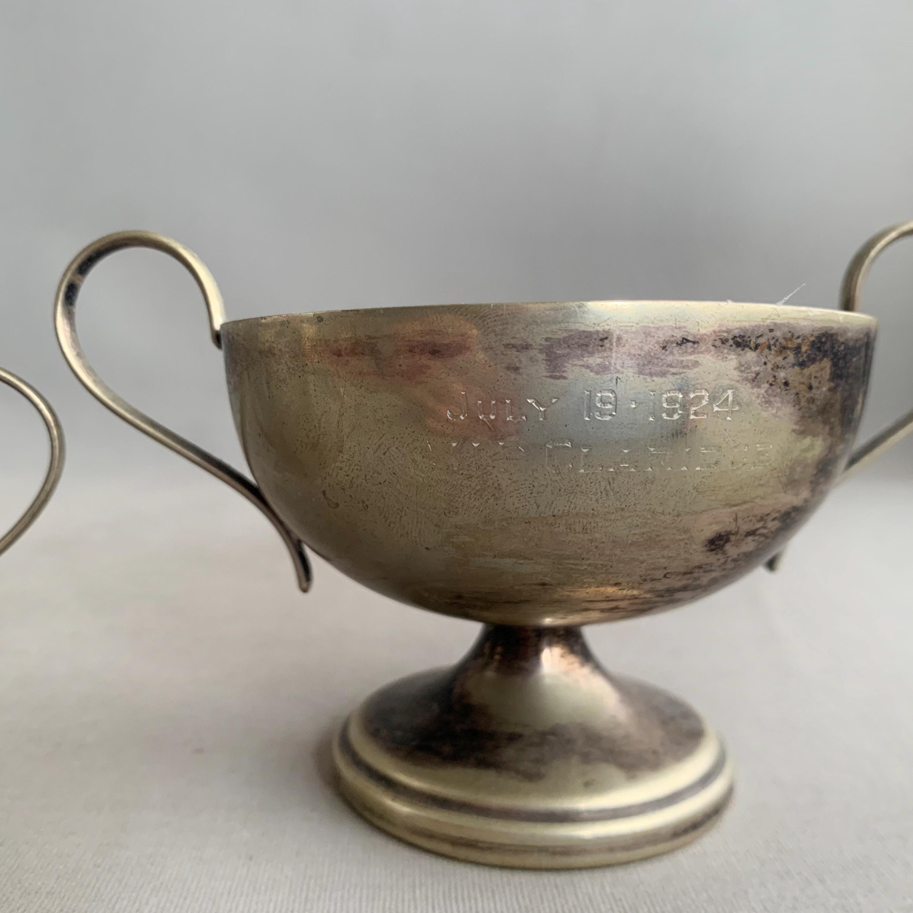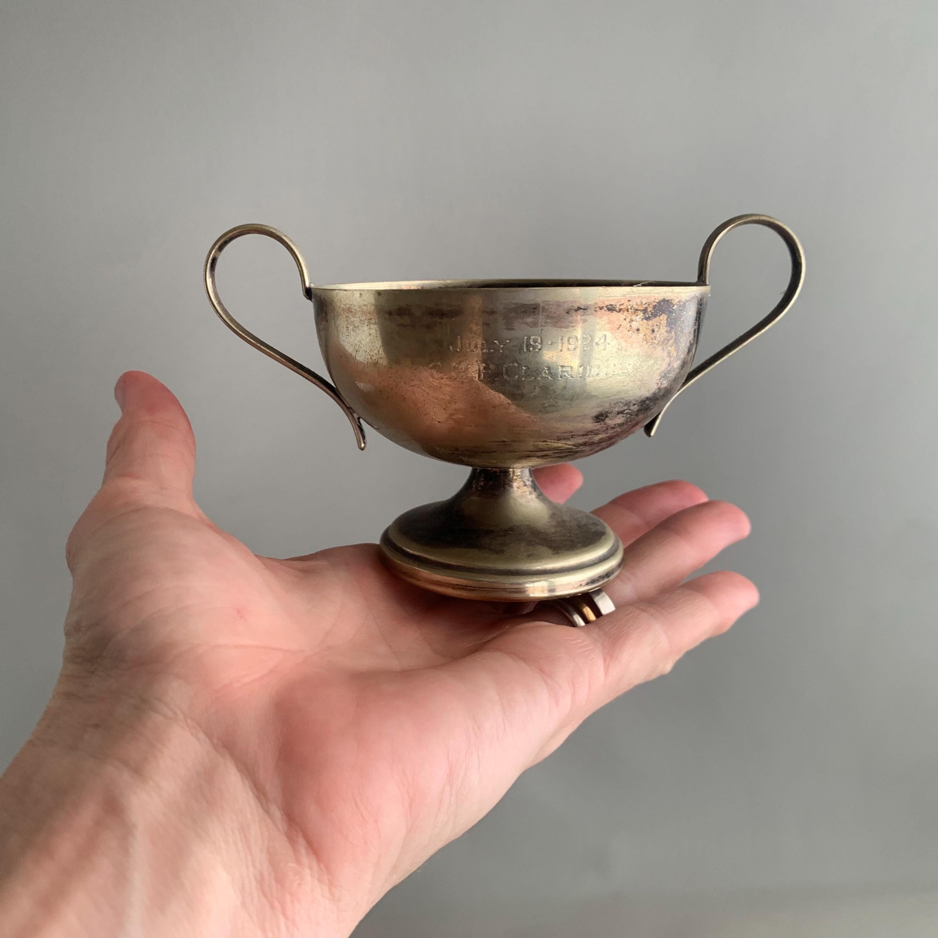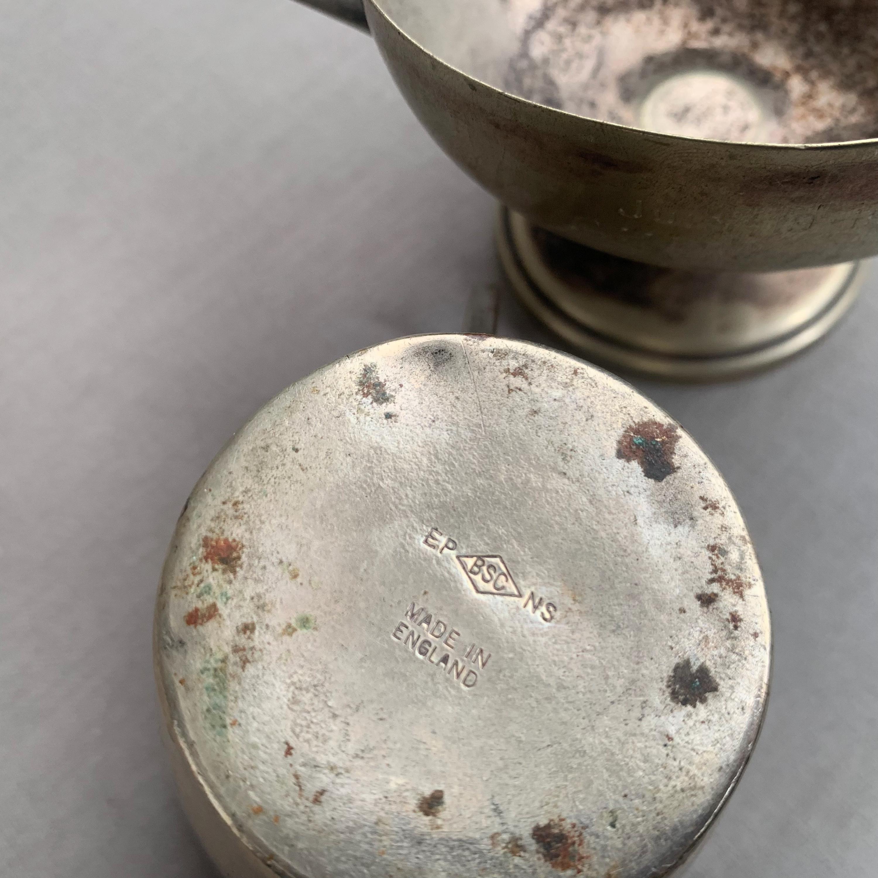 A battered but very charming character full trophies in a usefull shape- would maje good sugar bowls and saly pot. Nice patina with the tarnished metal
