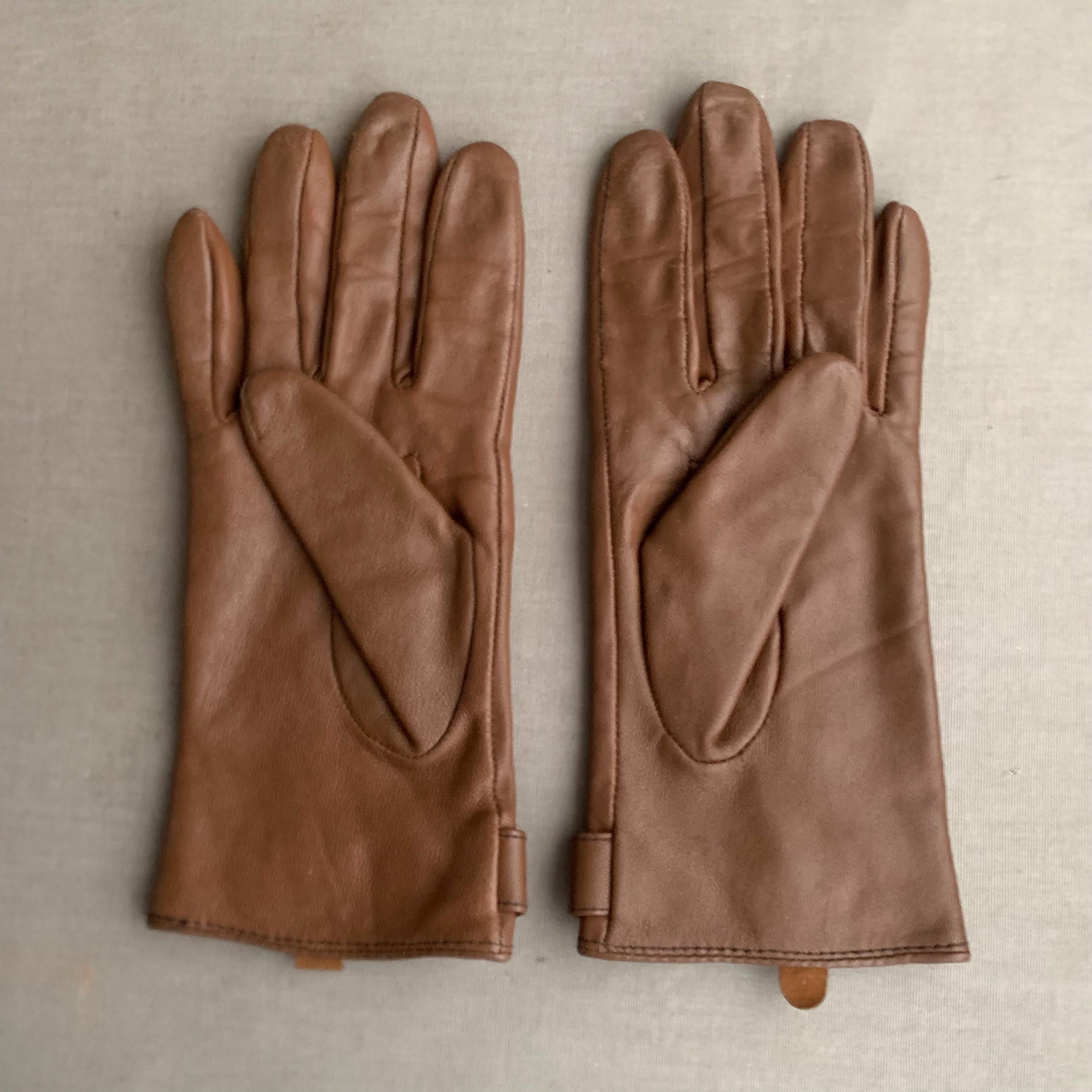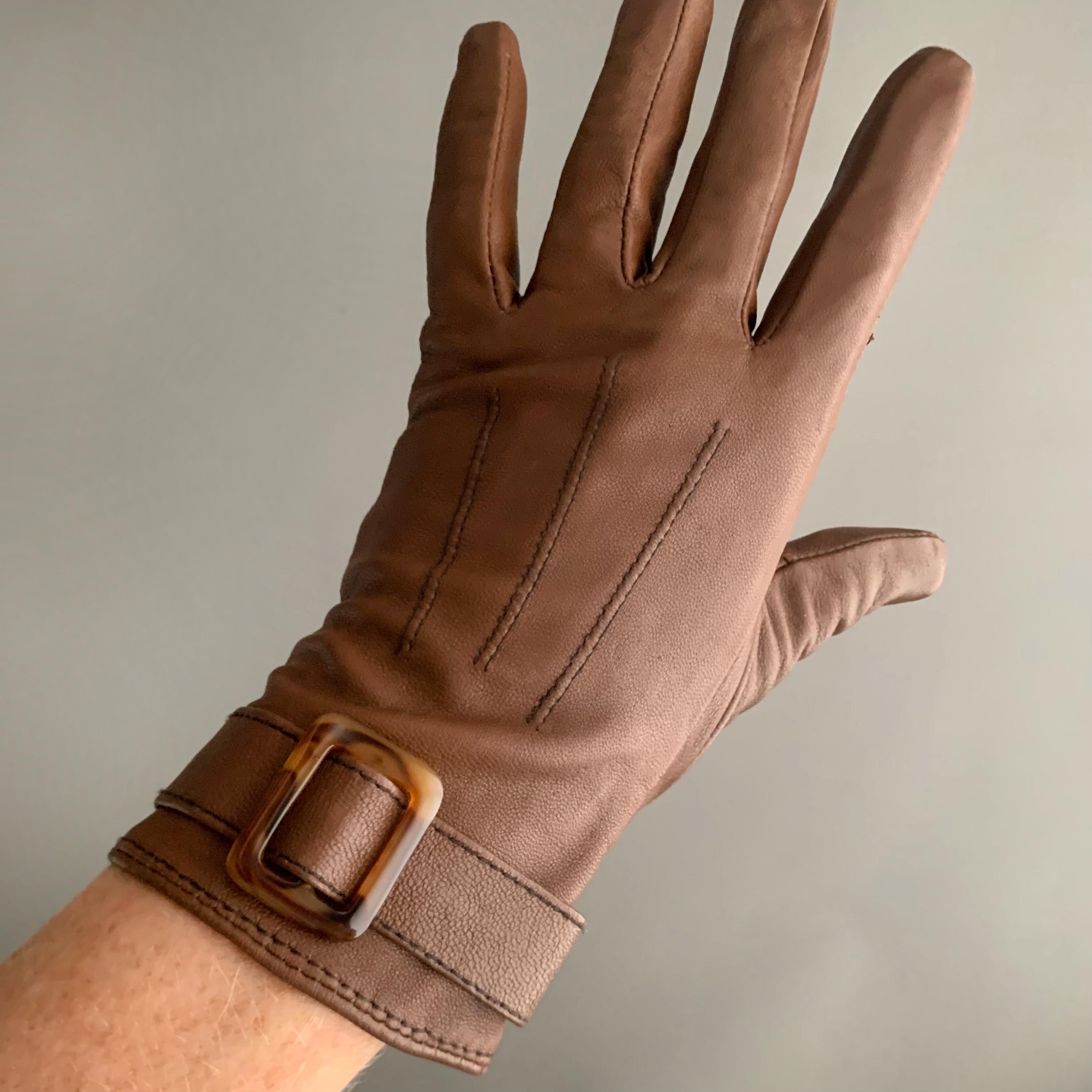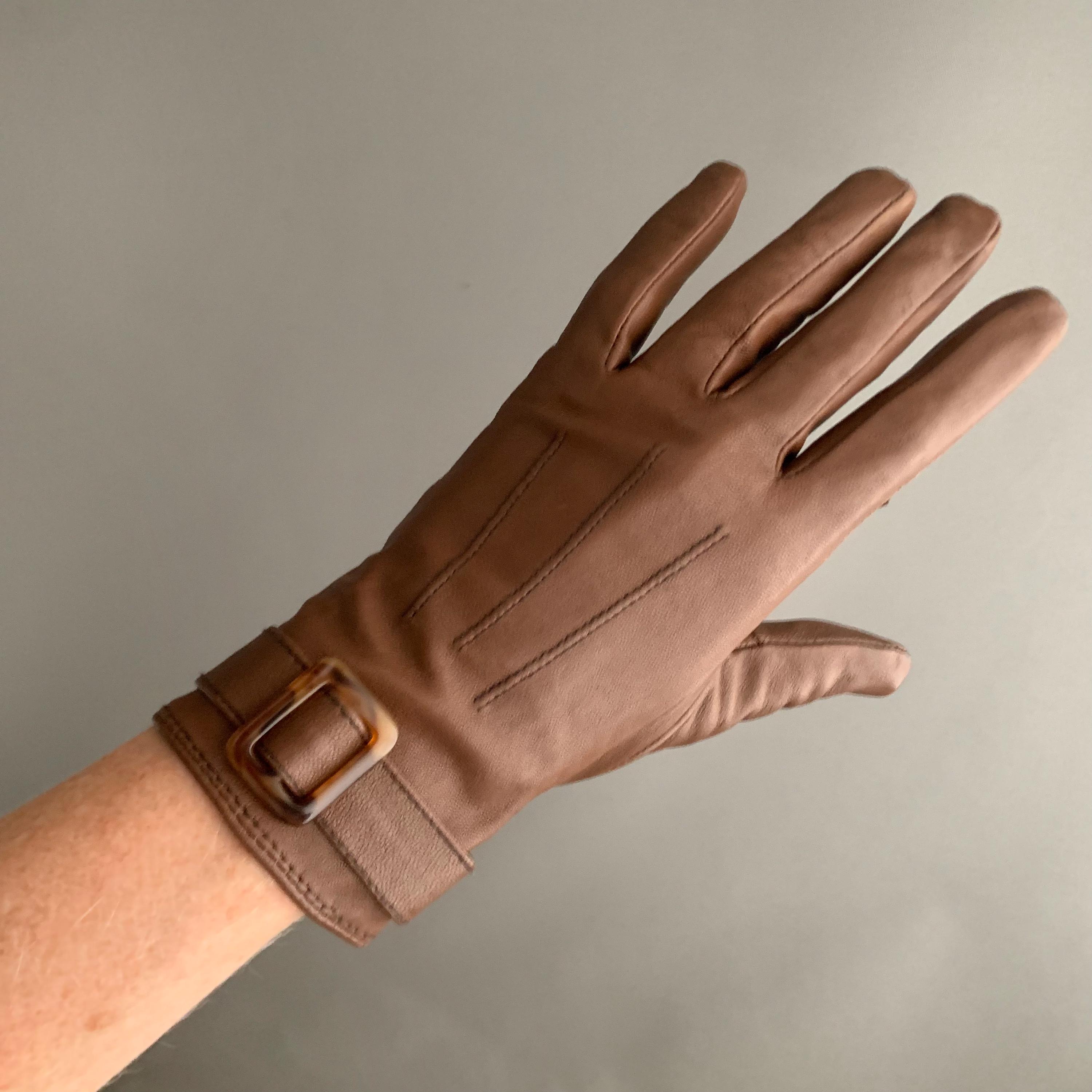 A smart pair of butter soft leather lined ladies gloves. Fully lined and in exellent condition. Buckel detail on the cuff. They look very elegant on and being lined they are nice and warm. Good as new , would make a lovely gift