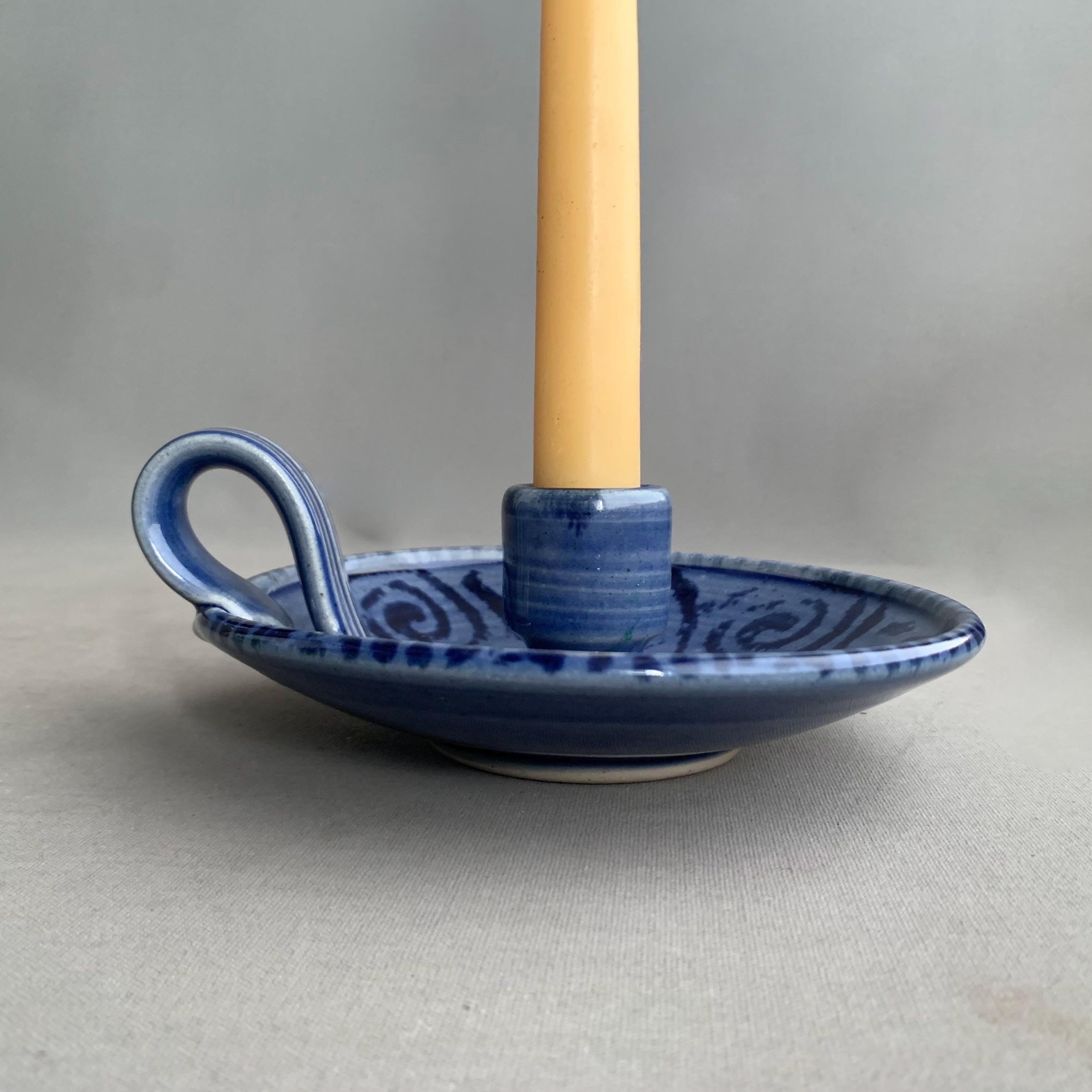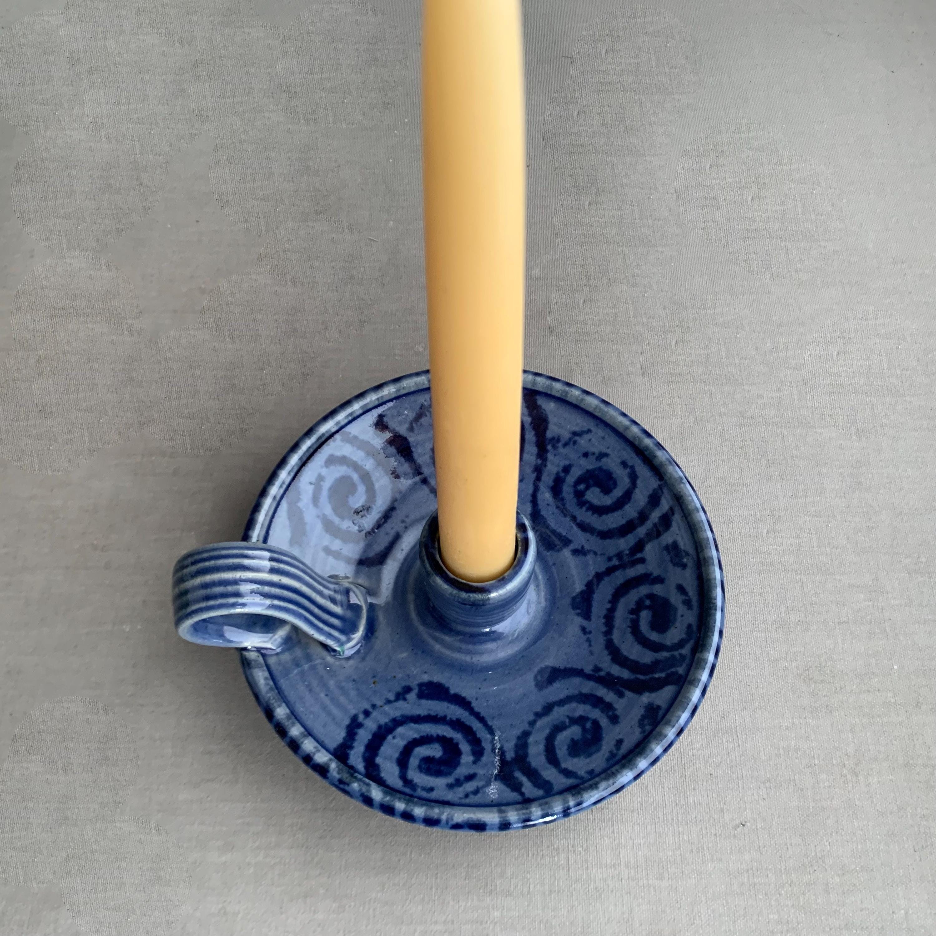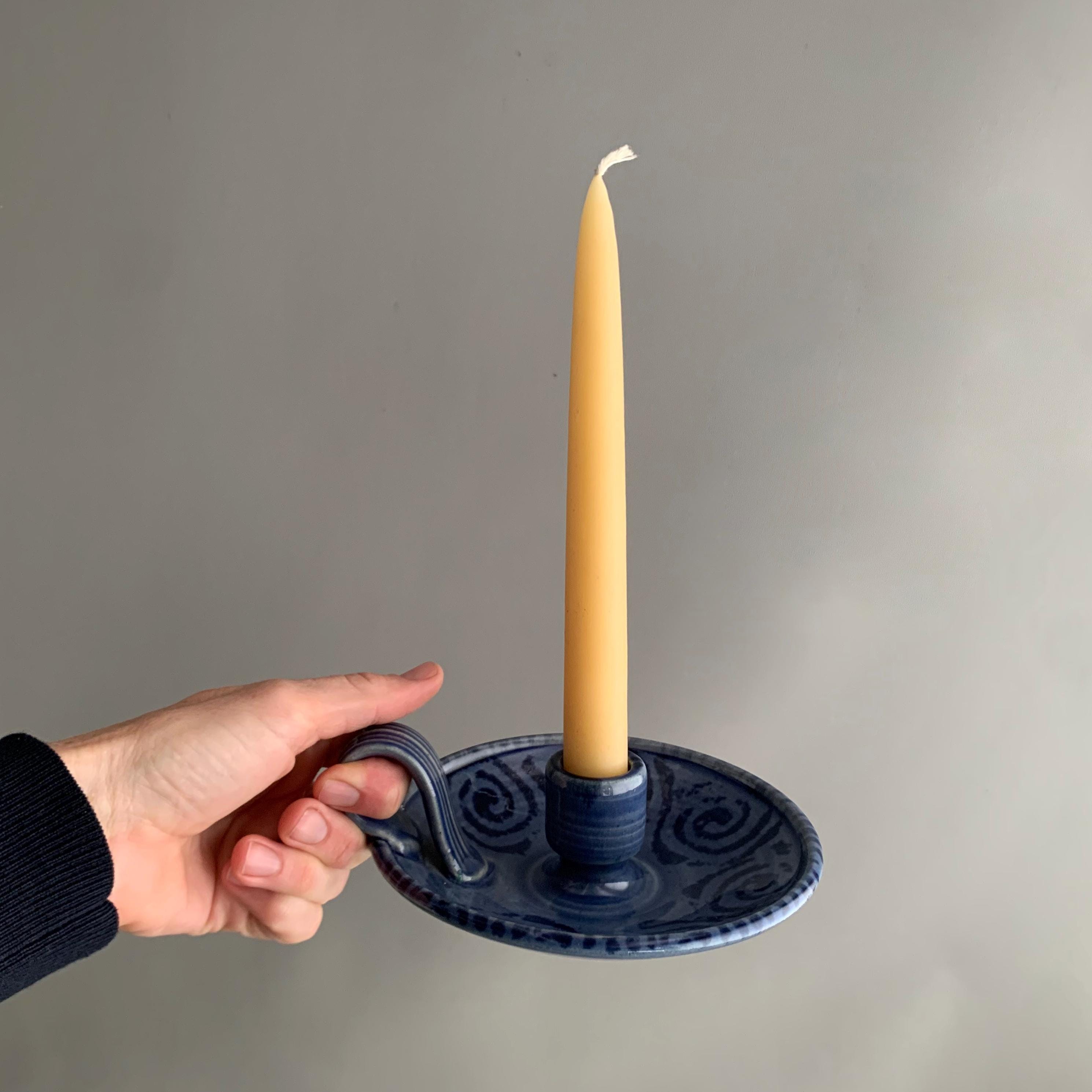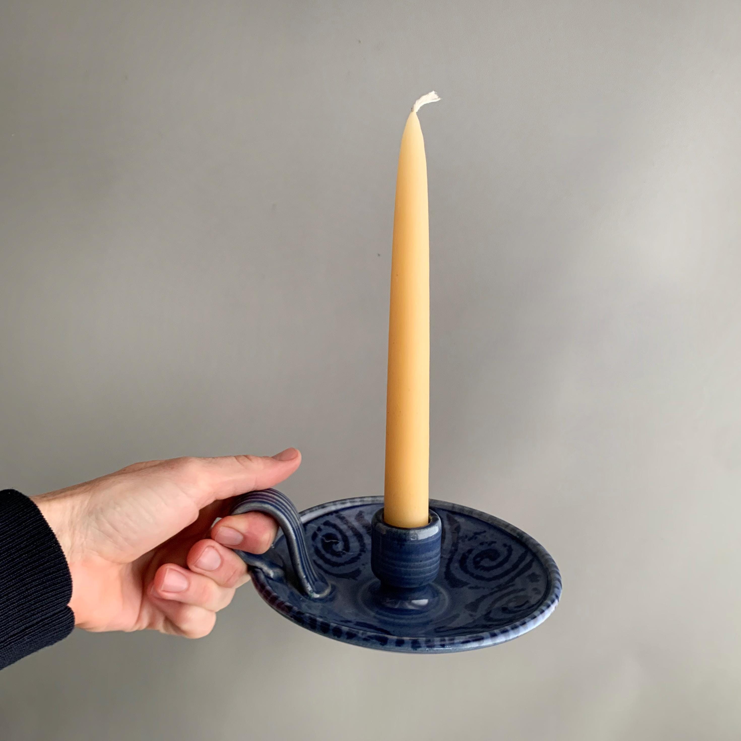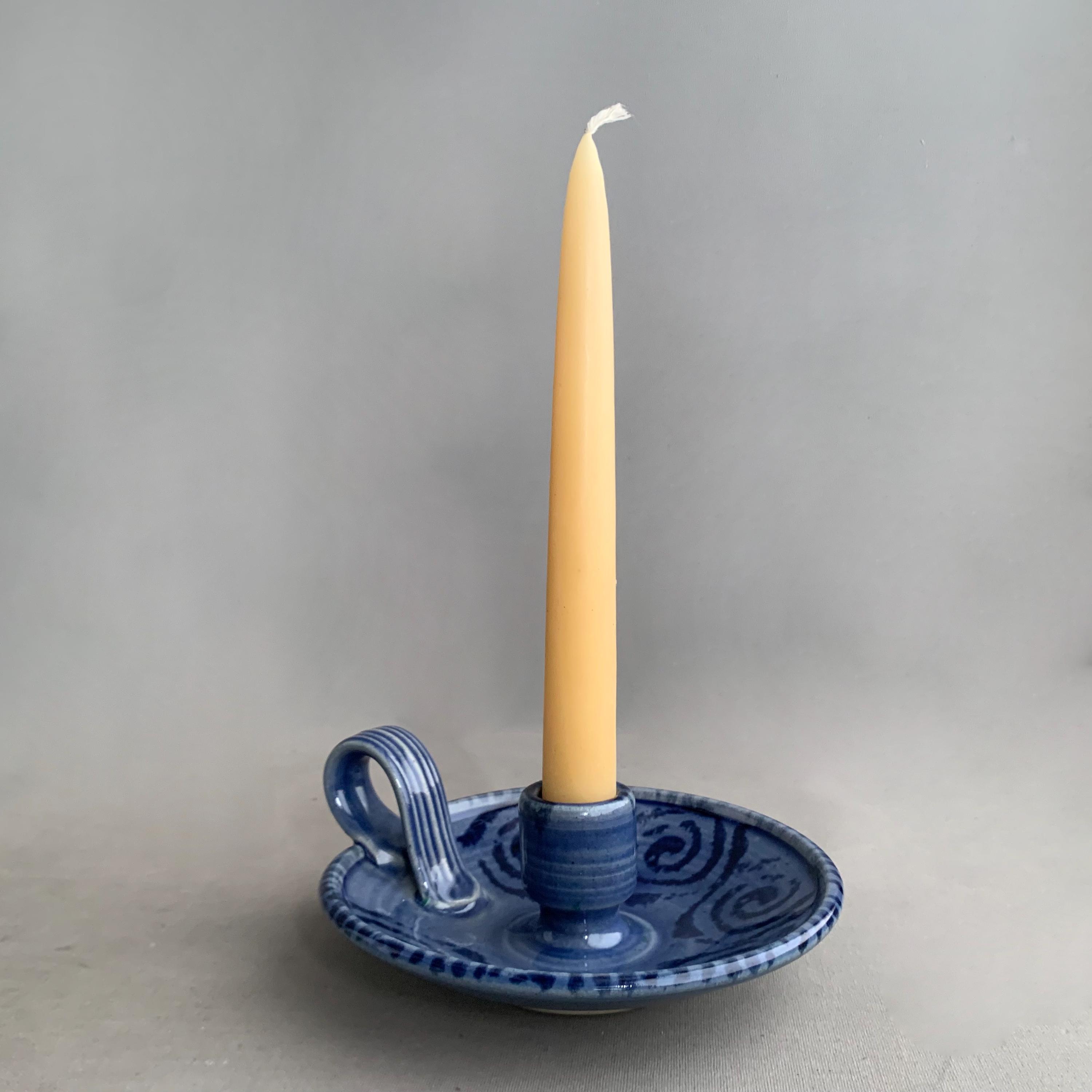 Beautiful hand thrown and hand painted glazed stoneware Tom Agnew Pottery candle stick holder co tyrone in a classic wee-willy-winkie style. Holds a standard dinner candle