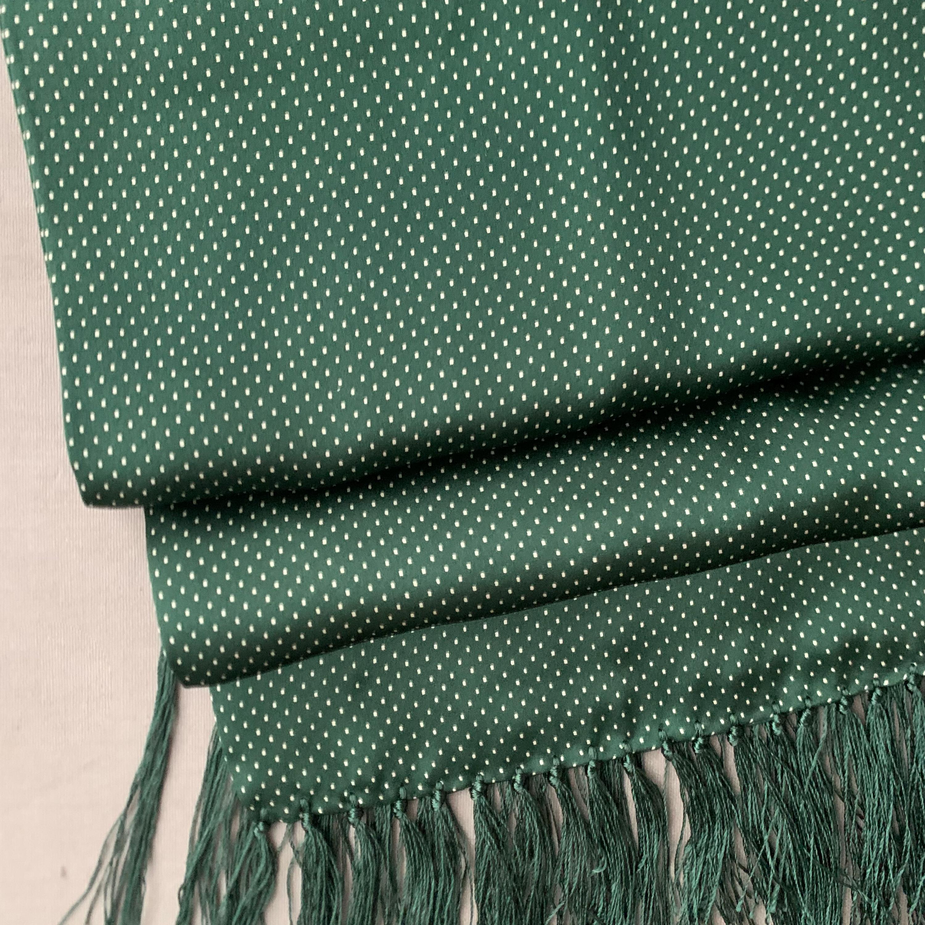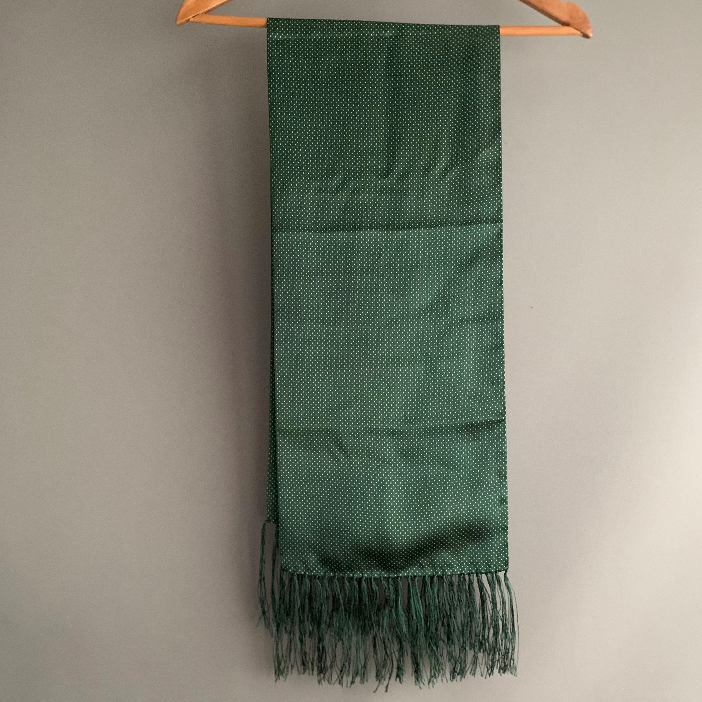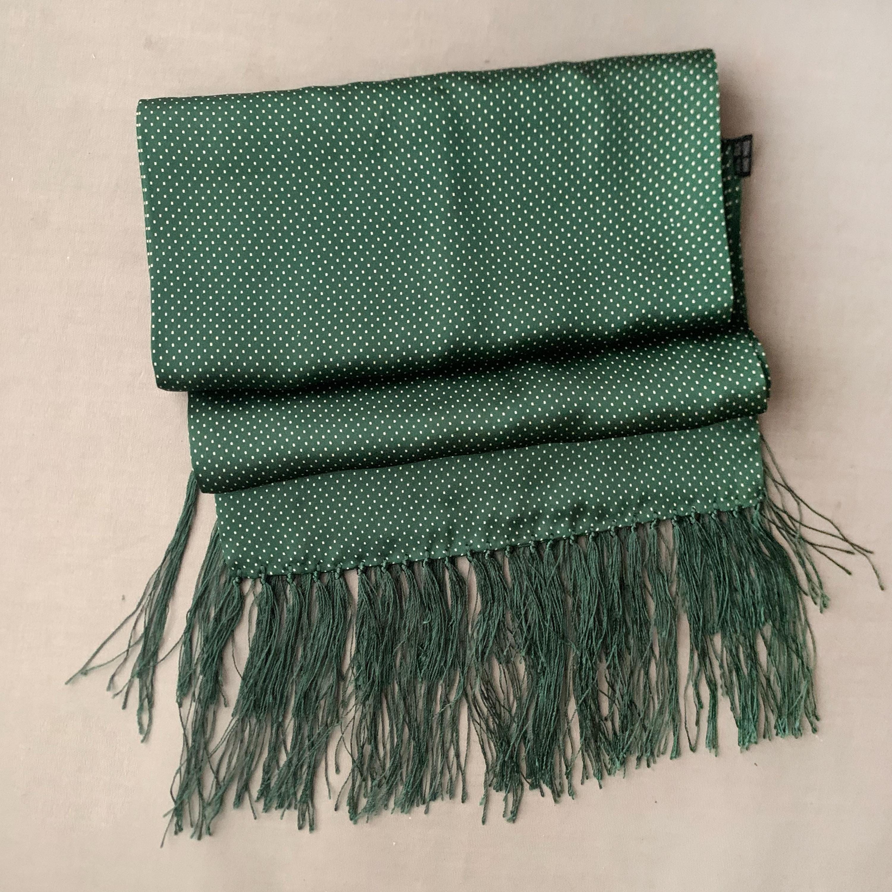 Handmade 100% Silk Scarf. Classic Pin Dot design. A classic Edwardian design in vintage old school British Racing Green. Scarf measures 114 cm length x 25 cm width, with 8cm tassels.