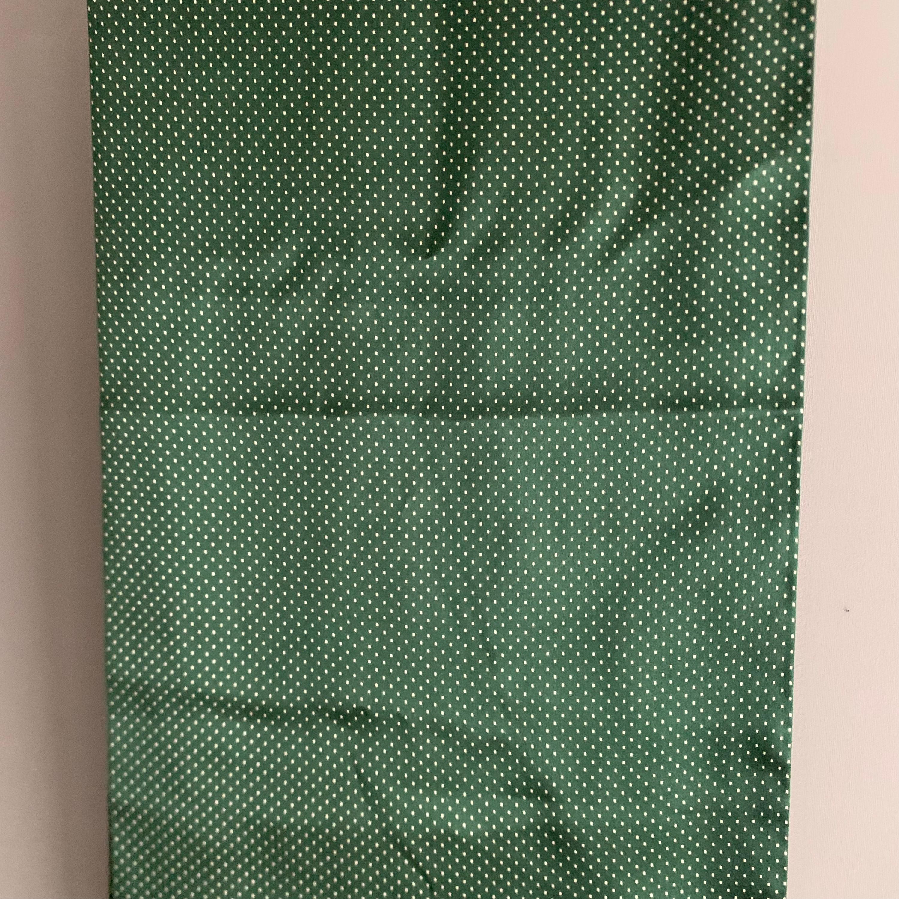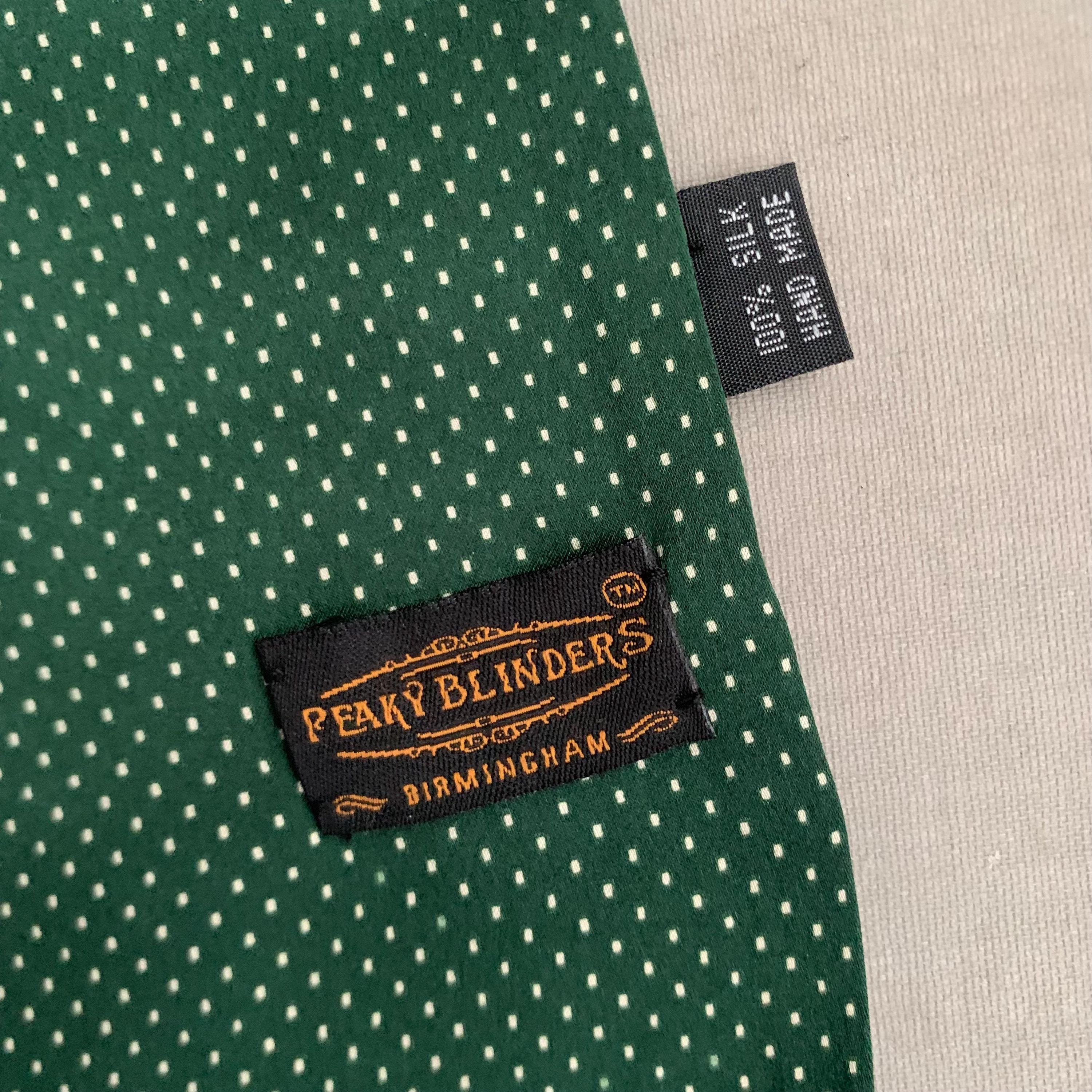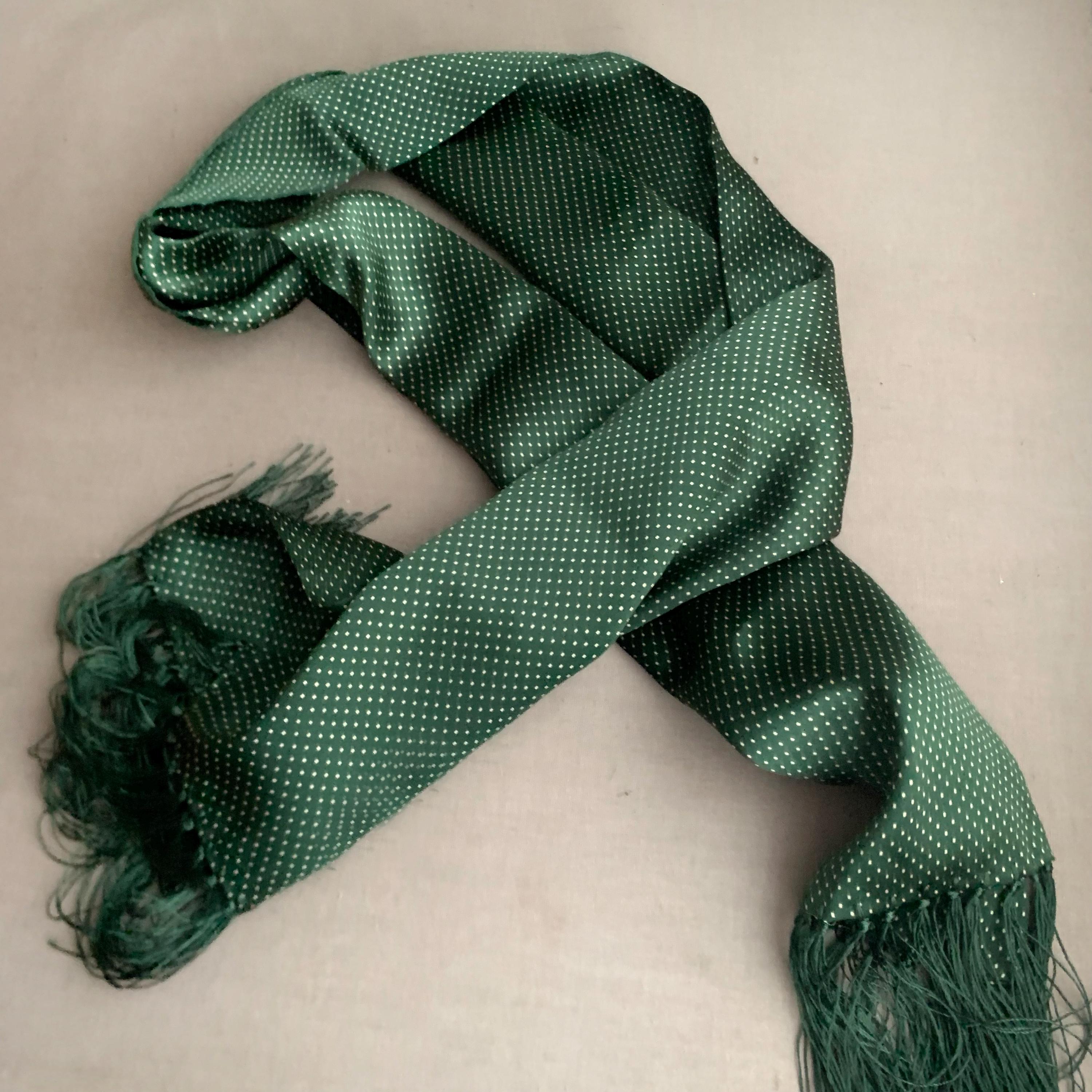 Handmade 100% Silk Scarf. Classic Pin Dot design. A classic Edwardian design in vintage old school British Racing Green. Scarf measures 114 cm length x 25 cm width, with 8cm tassels.