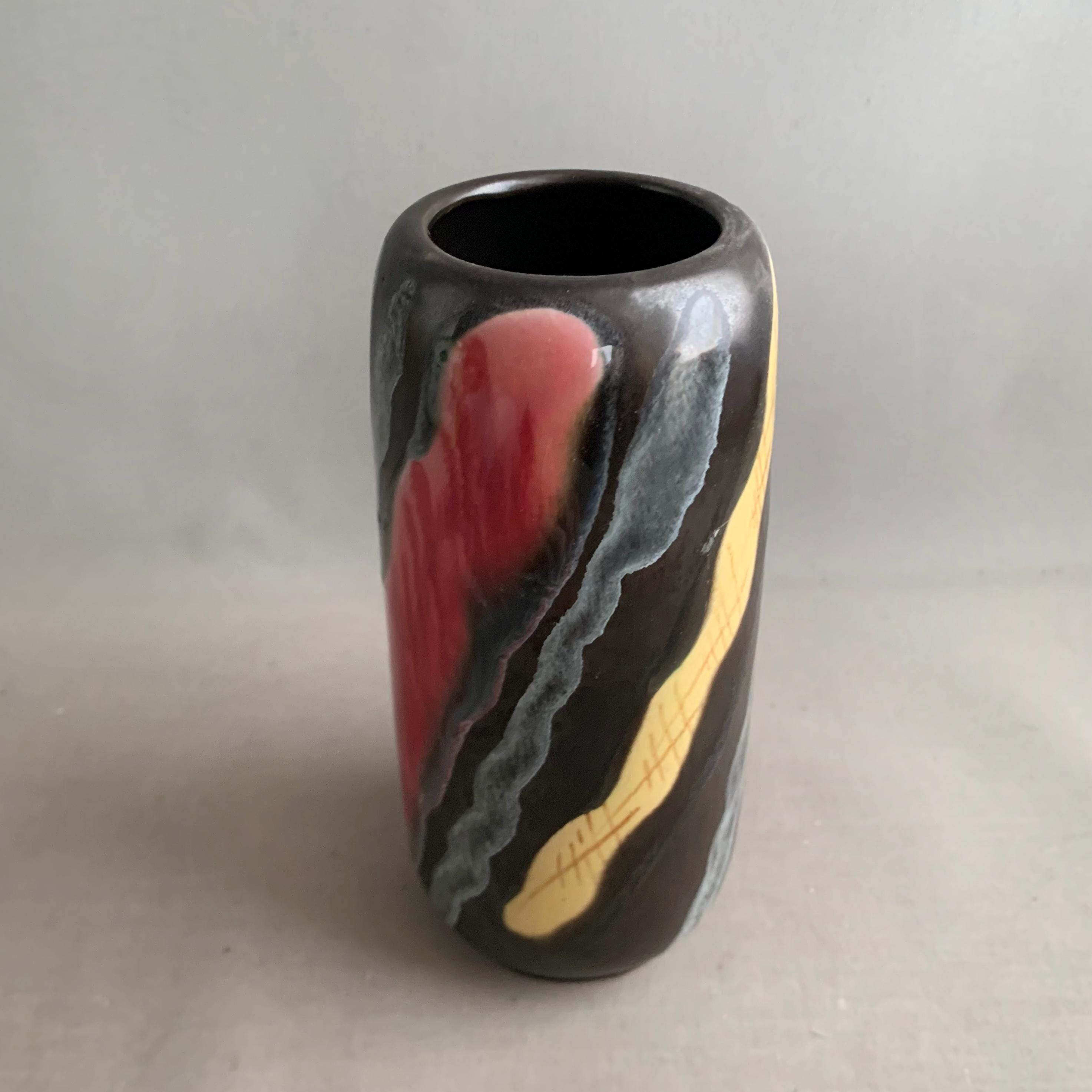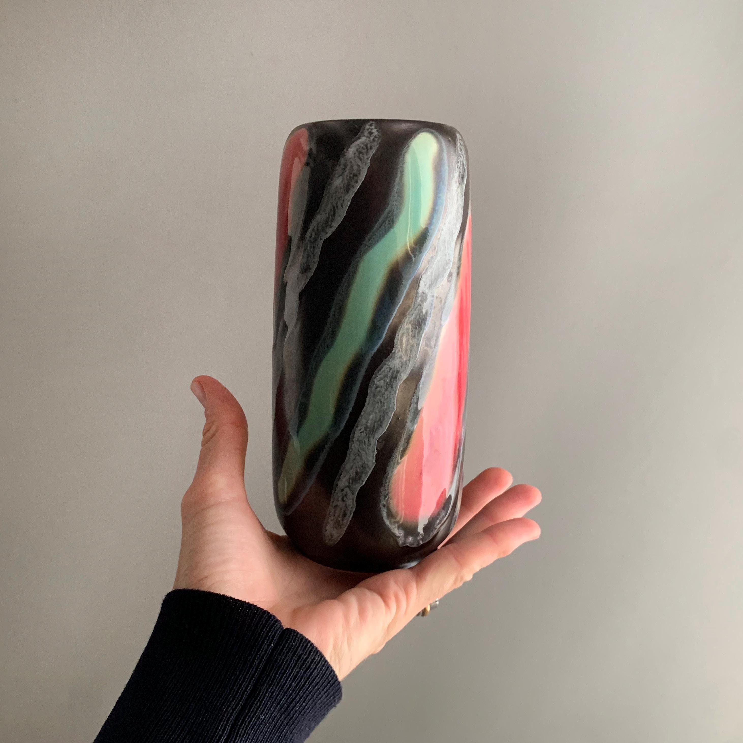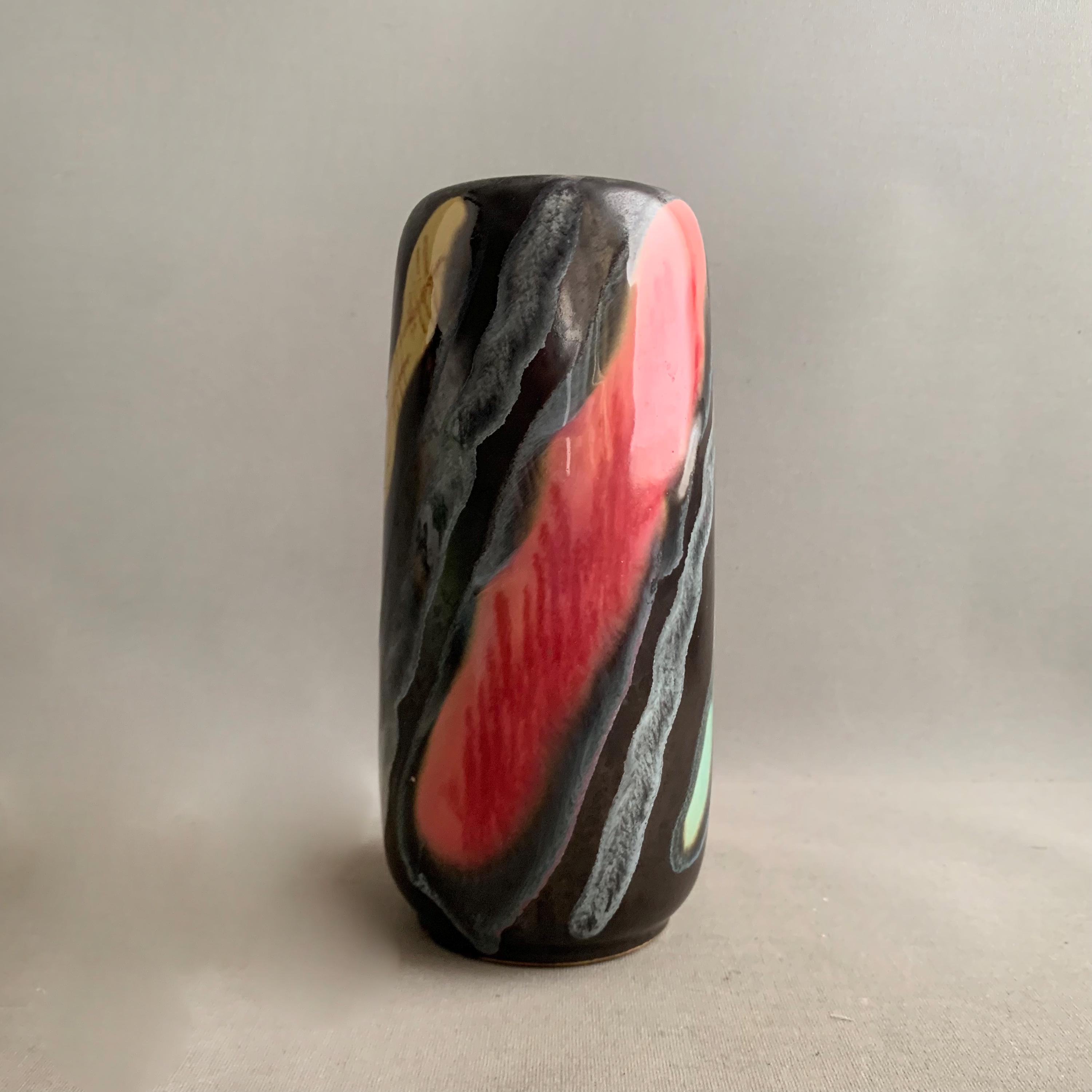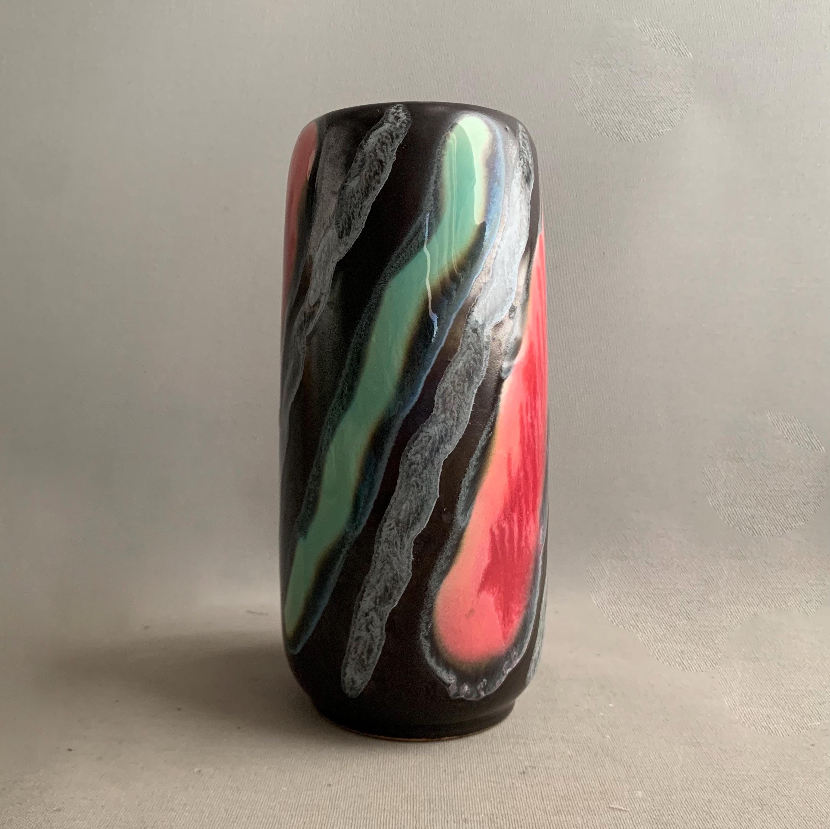 a ceramic vase with a drip glaze finish. A great example of mid-century modern pottery from makers like Poole Pottery, McCoy Pottery, or Scheurich. I think this is a west german pottery piece