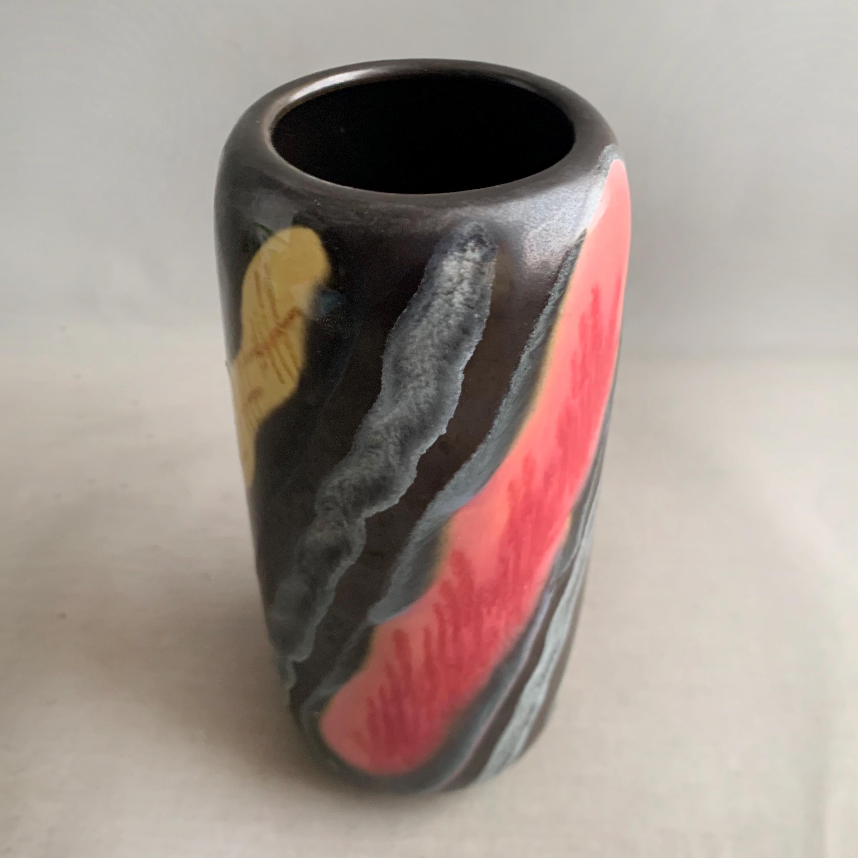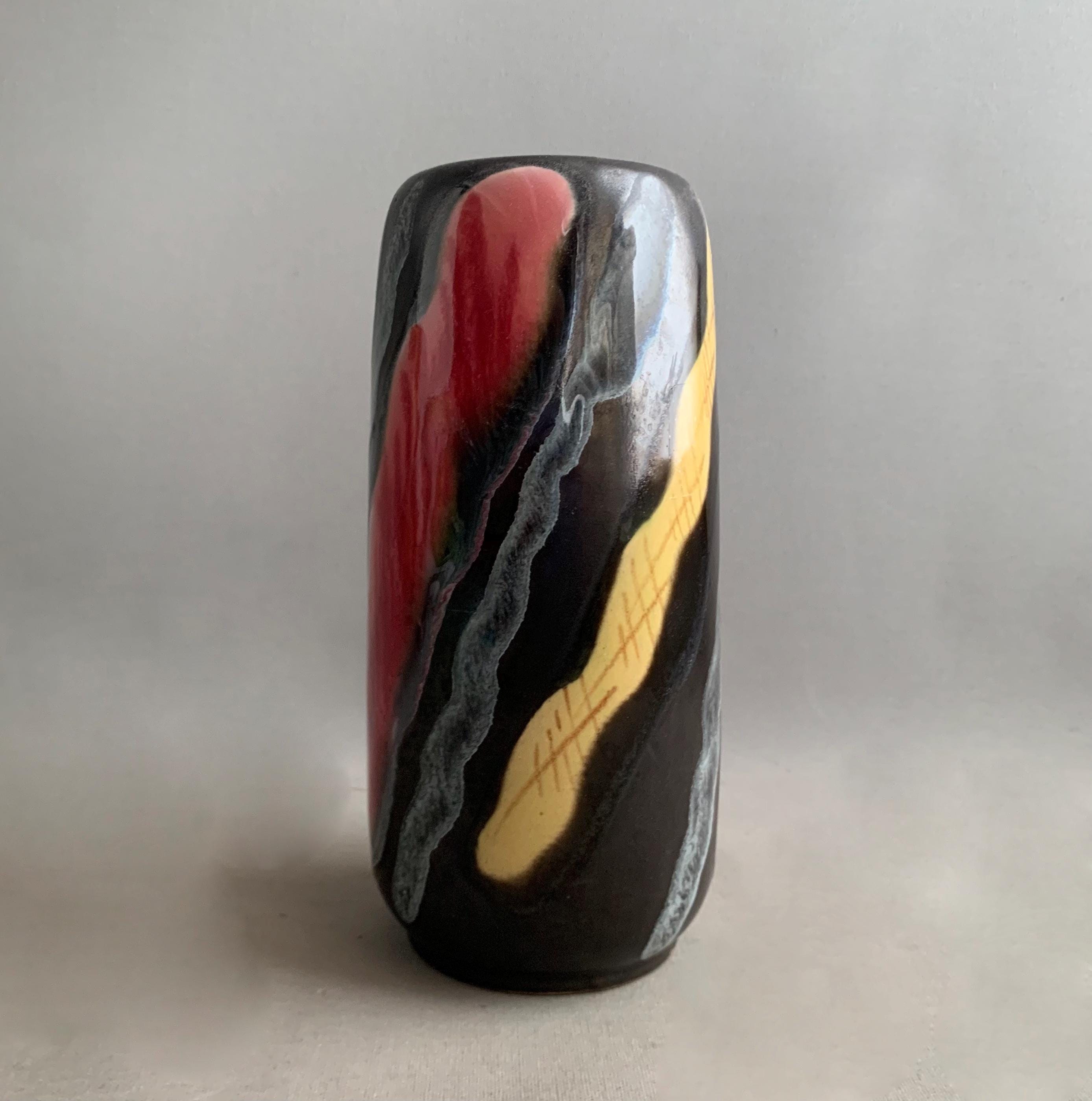 The vase has a cylindrical shape with a black base glaze, decorated with abstract, vertical drips of red, yellow, and blue/grey glaze, often referred to as "lava drip glaze" or "fat lava" pottery.