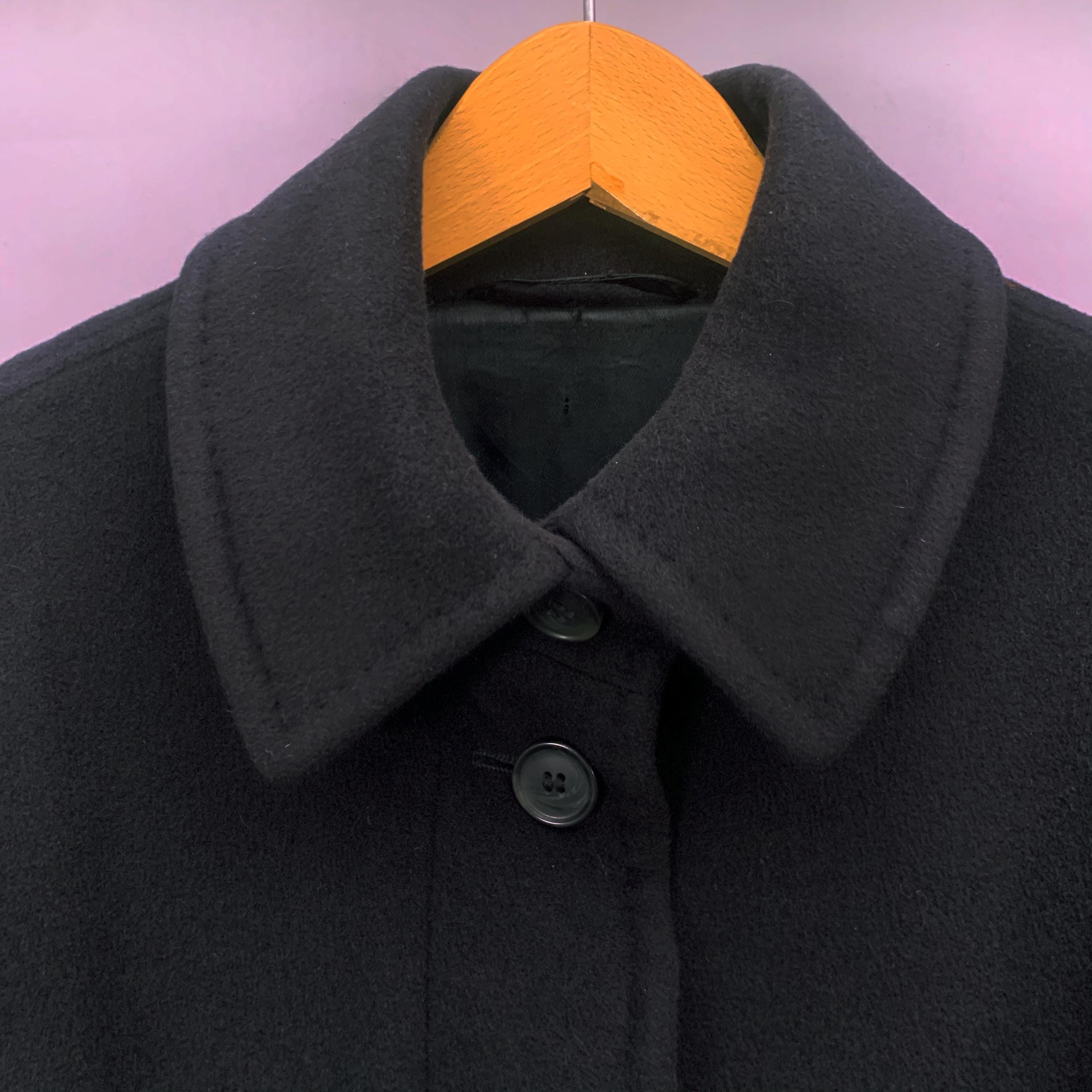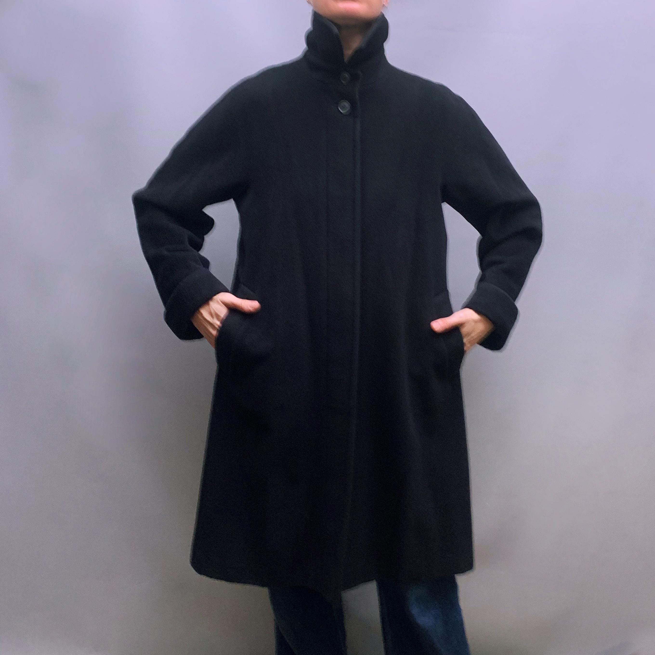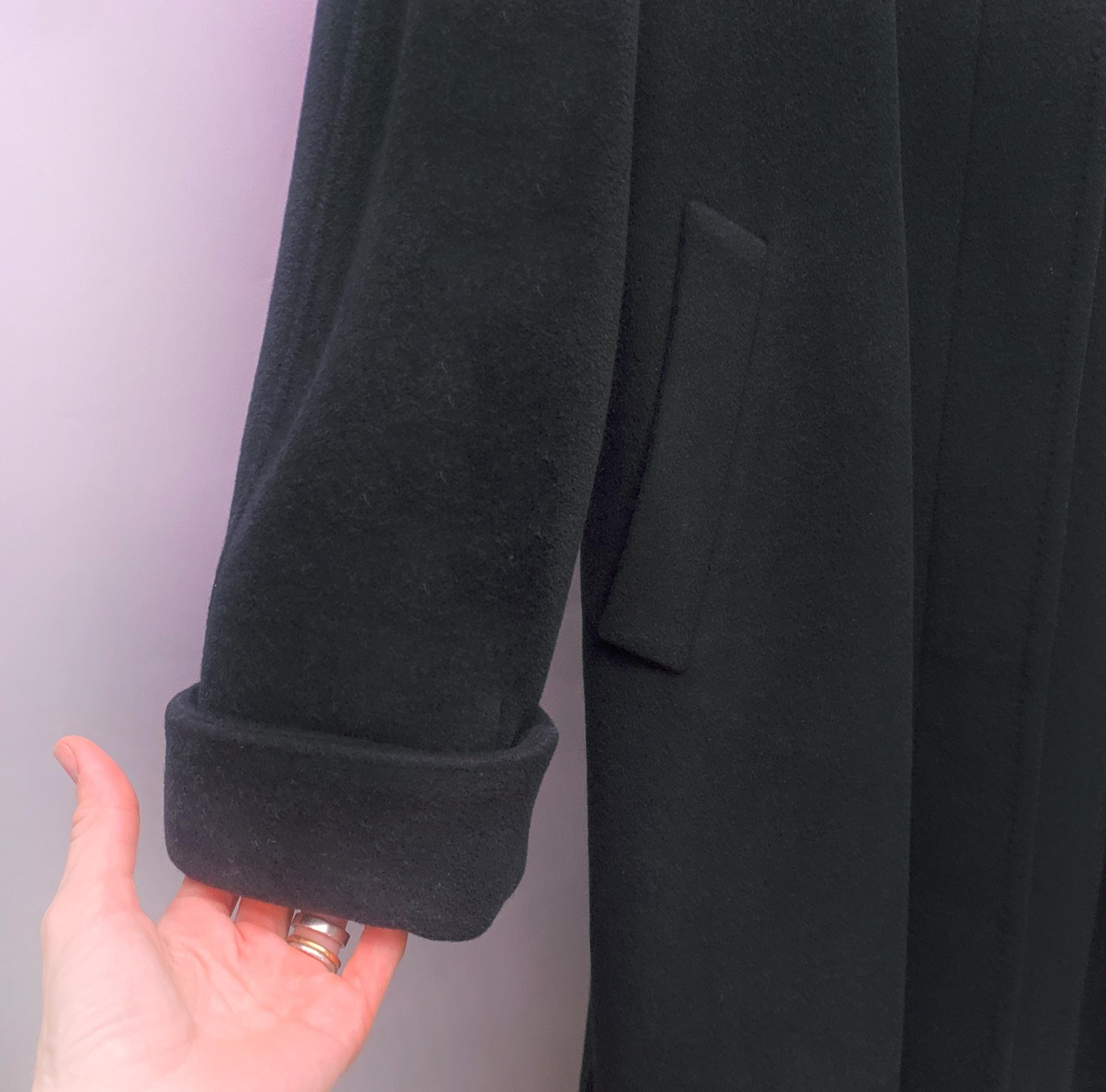 A truly quality coat. No makers lable but the quality is clear. The fabric is thick and walm and feels like a wool / cashmere blend. Fully lined in dark satin with 2 deep pockets and turn over sleeve. Cut in a gentle A line and buttons up to a coller that can be raised to warm the neck with a slit at either side at the hem for easy wearing. A very smart and classic coat that will last a life time . Im a size UK 12/14 and this fits perfectly