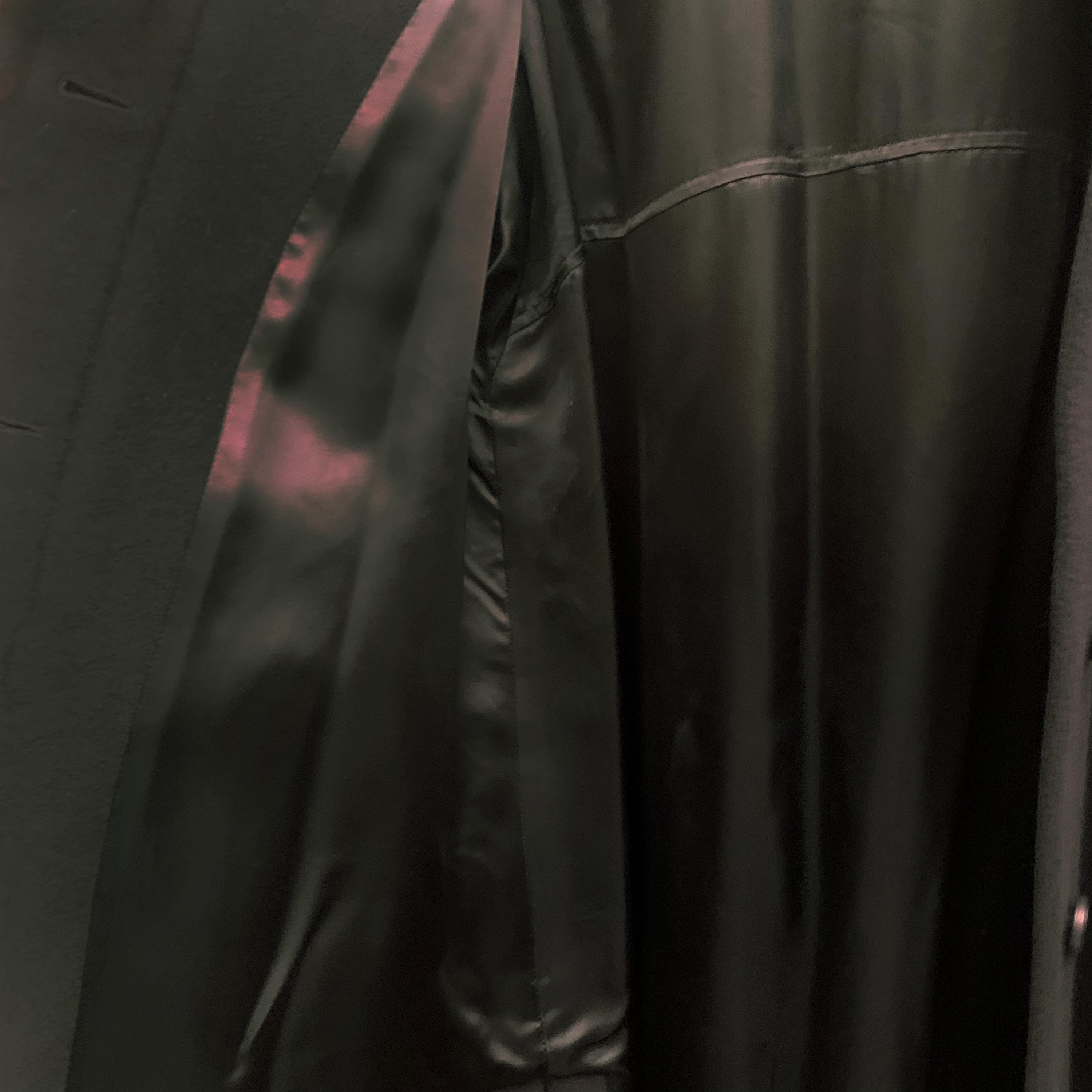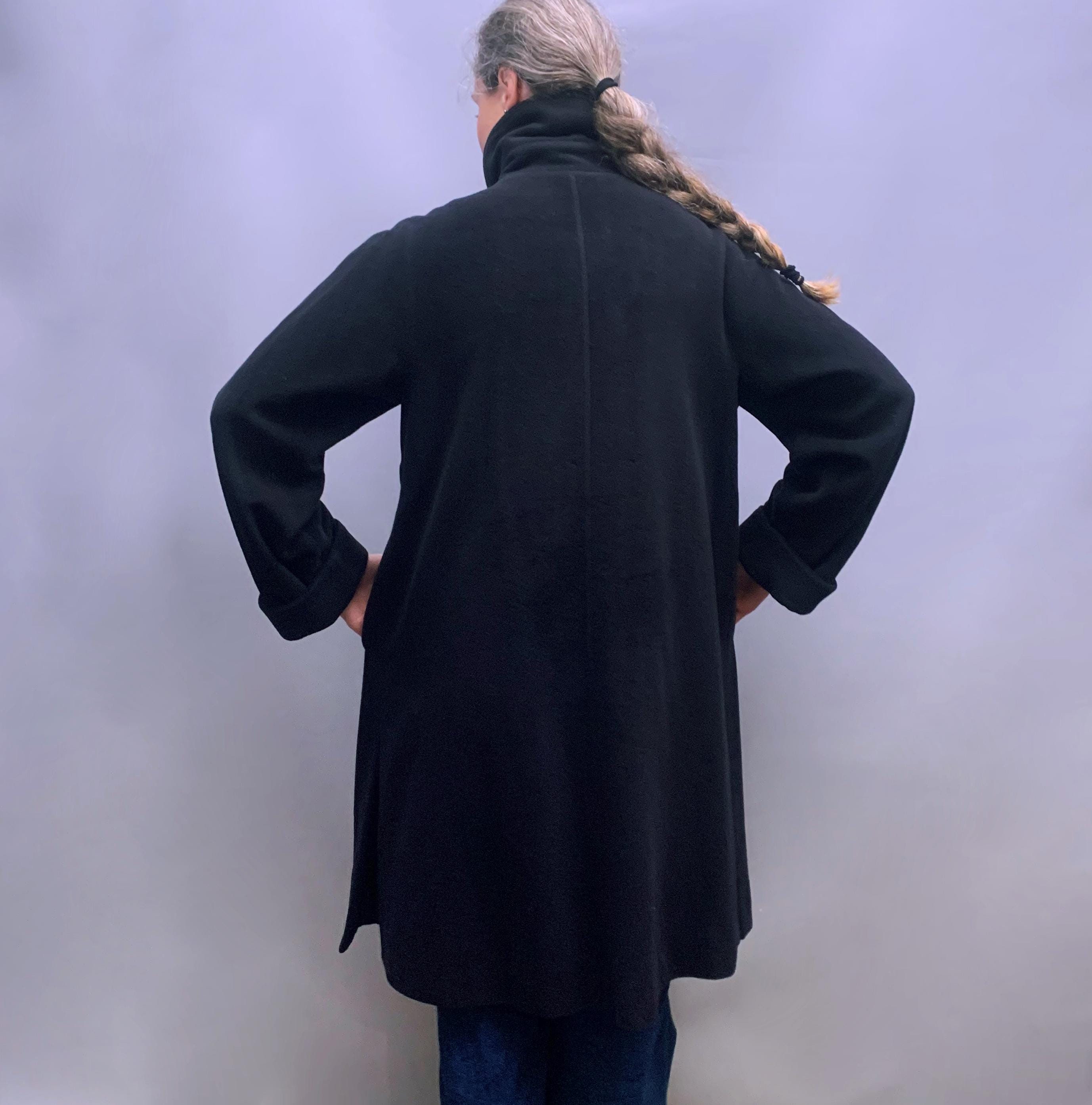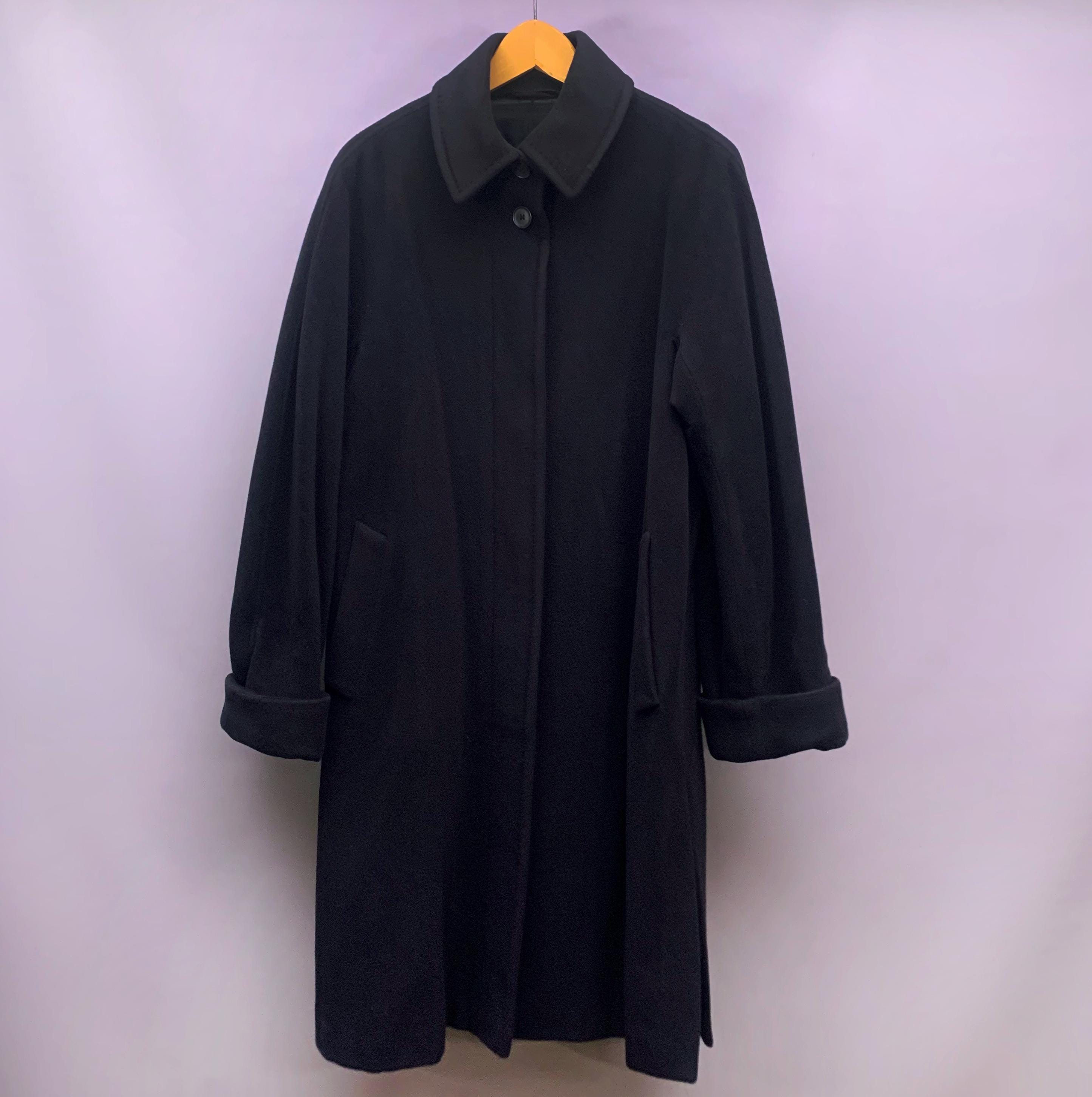 A truly quality coat. No makers lable but the quality is clear. The fabric is thick and walm and feels like a wool / cashmere blend. Fully lined in dark satin with 2 deep pockets and turn over sleeve. Cut in a gentle A line and buttons up to a coller that can be raised to warm the neck with a slit at either side at the hem for easy wearing. A very smart and classic coat that will last a life time . Im a size UK 12/14 and this fits perfectly