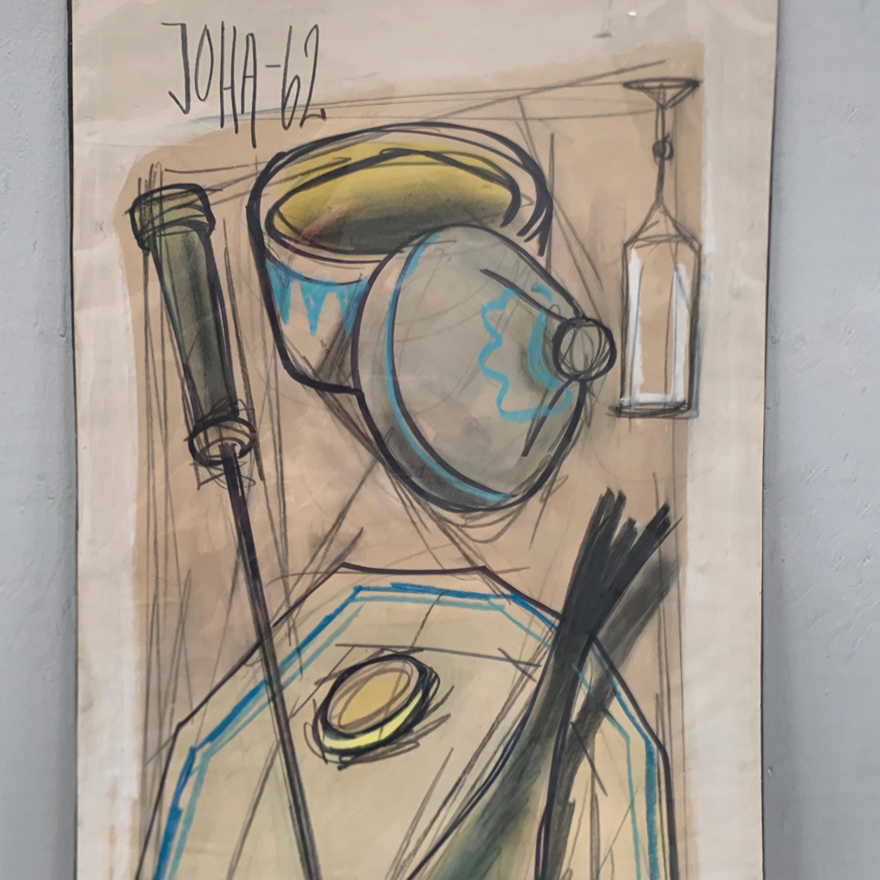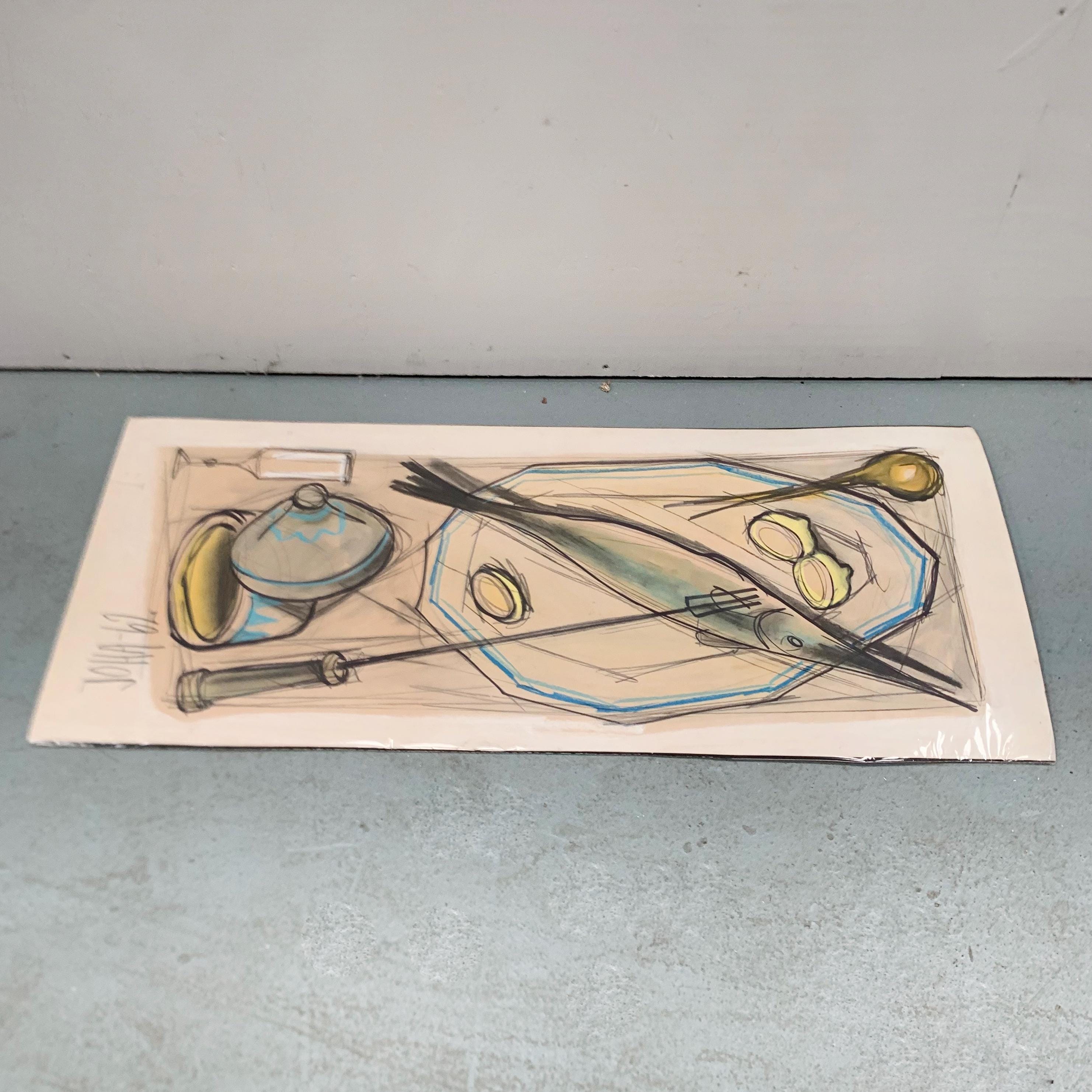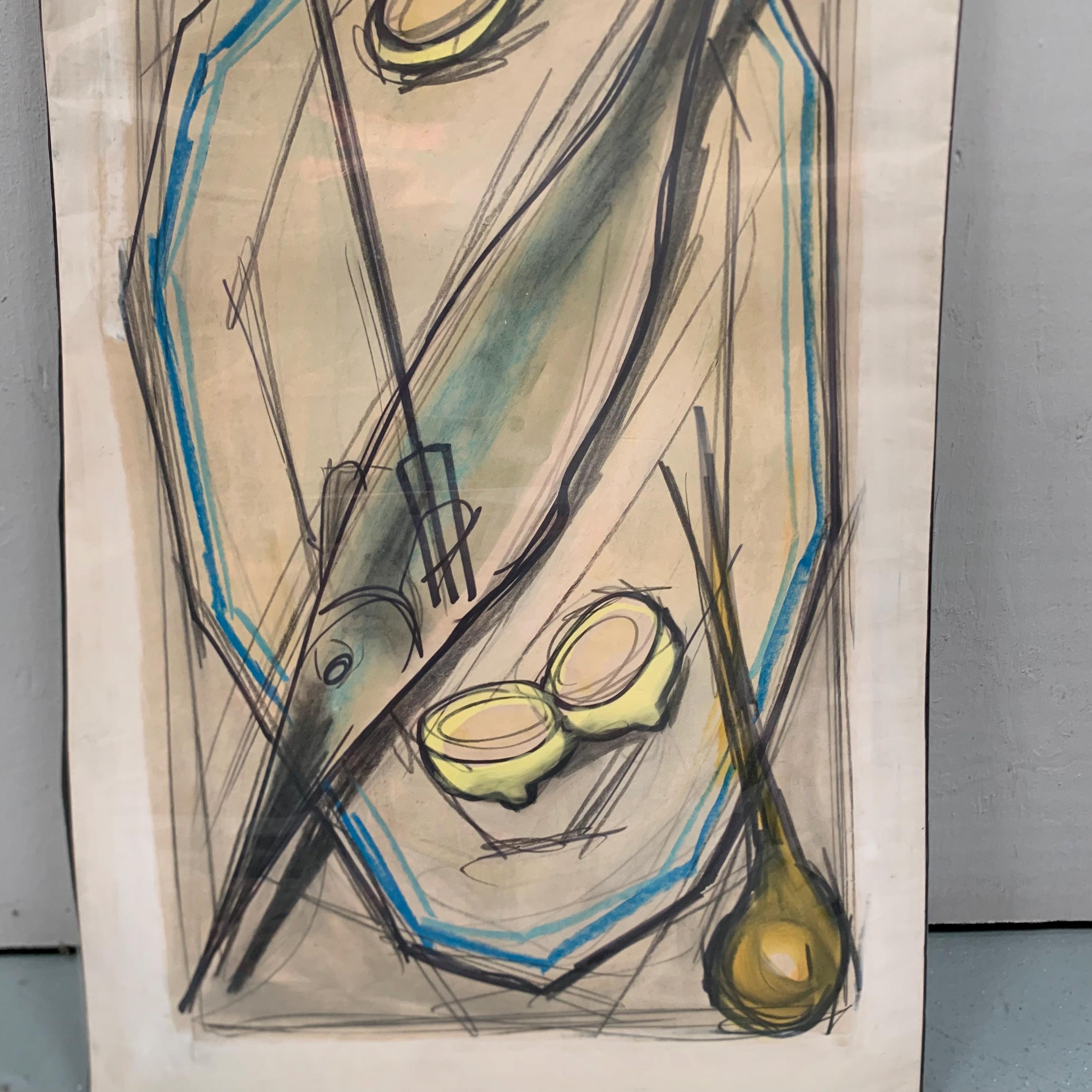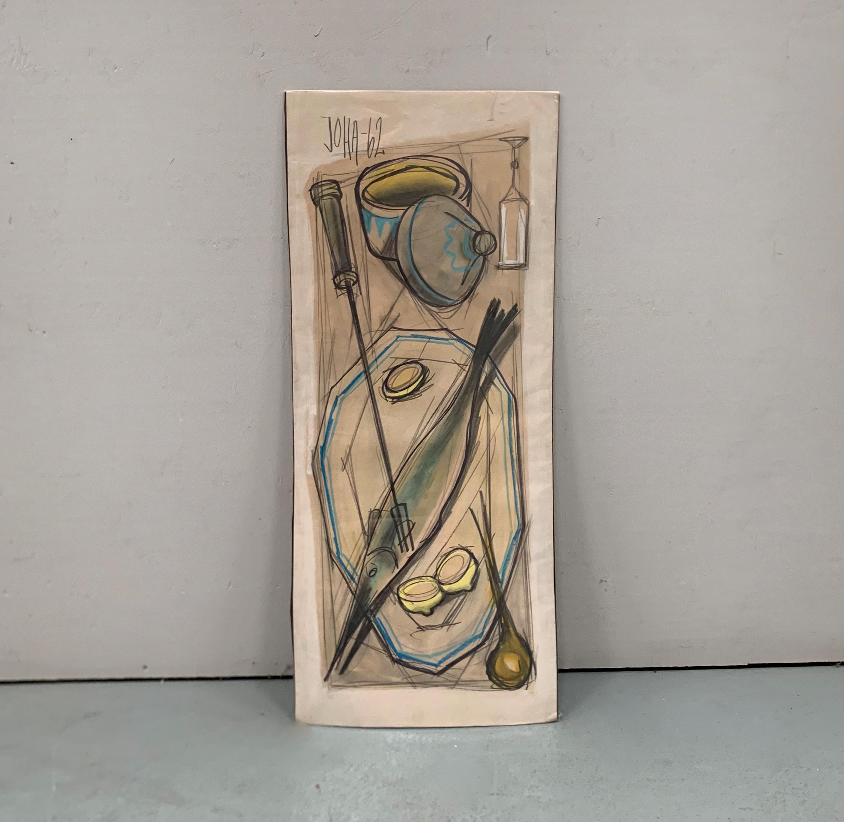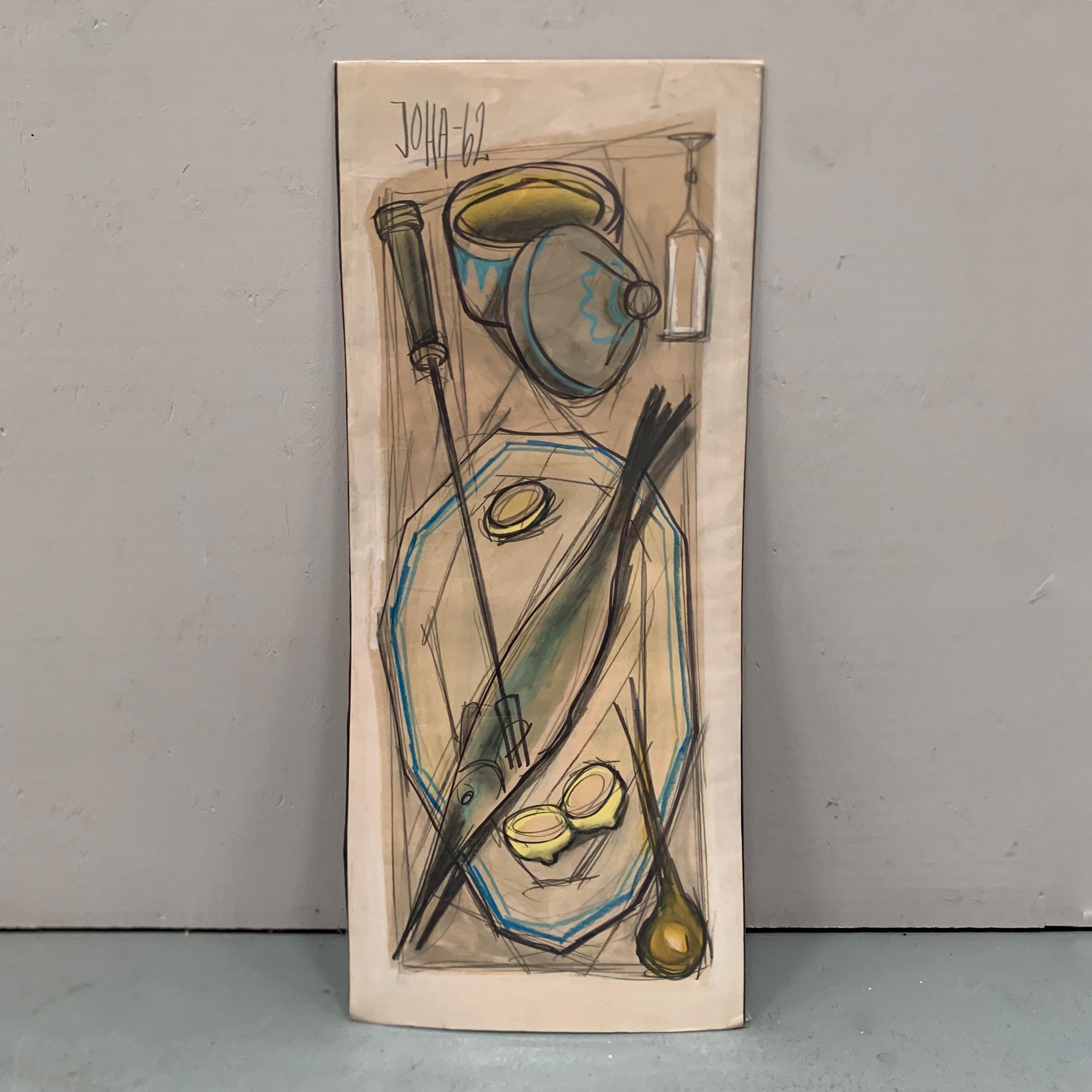 A beautiful modernist still life drawing / painting, . The artwork is a still life, a common genre in Western art, depicting everyday objects like a container, lid, and utensils with a fish on a plate with lemon slices and a glass. in a stylized, sketched manner. The artwork is signed "JOHA-62" at the top. A beautiful muted palette . This is an original drawing not a print characterized by minimalist geometric shapes and bold black outlines. I cant seem to find any infomation on this artist though i suspect he is scandinavian
