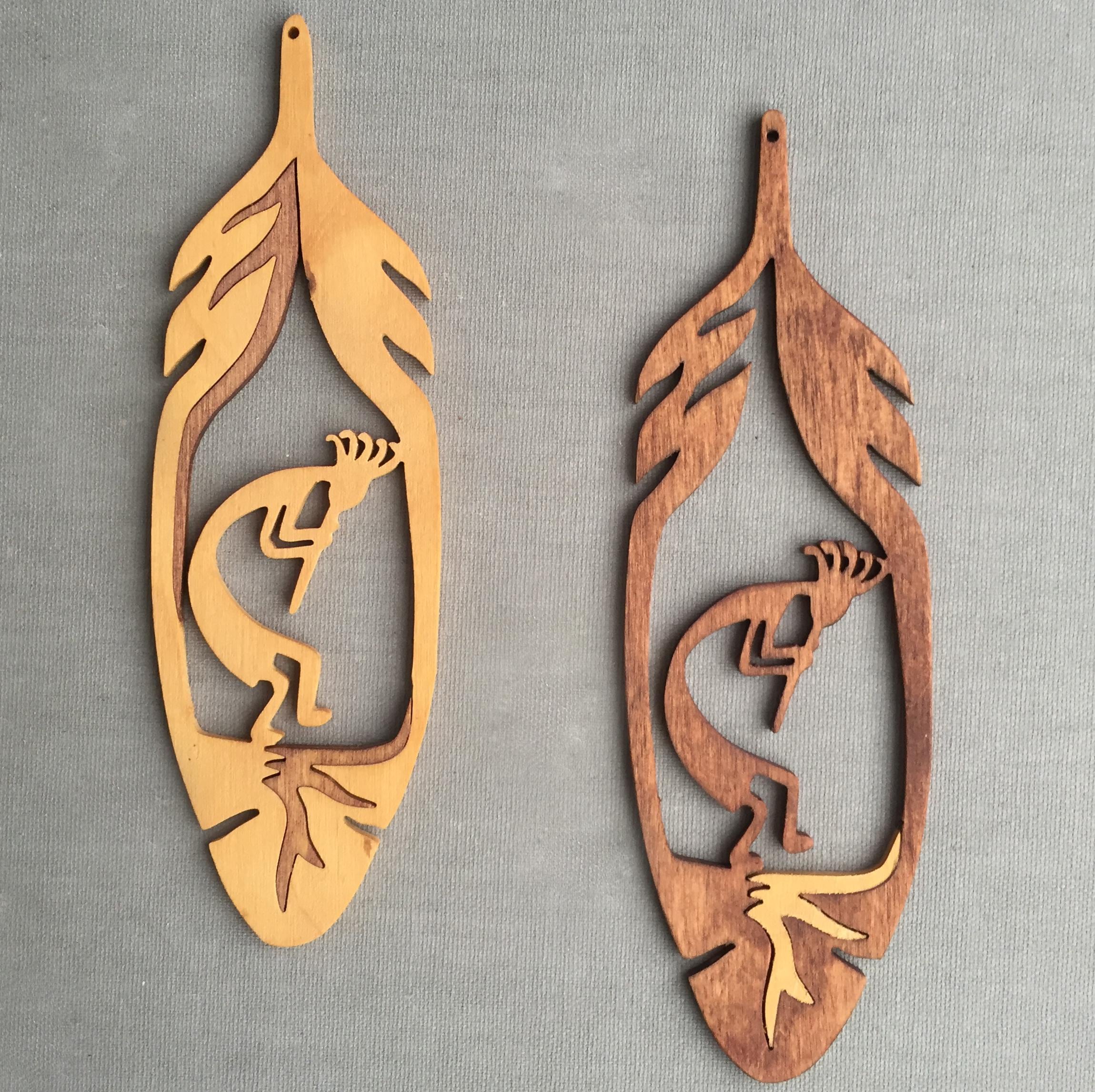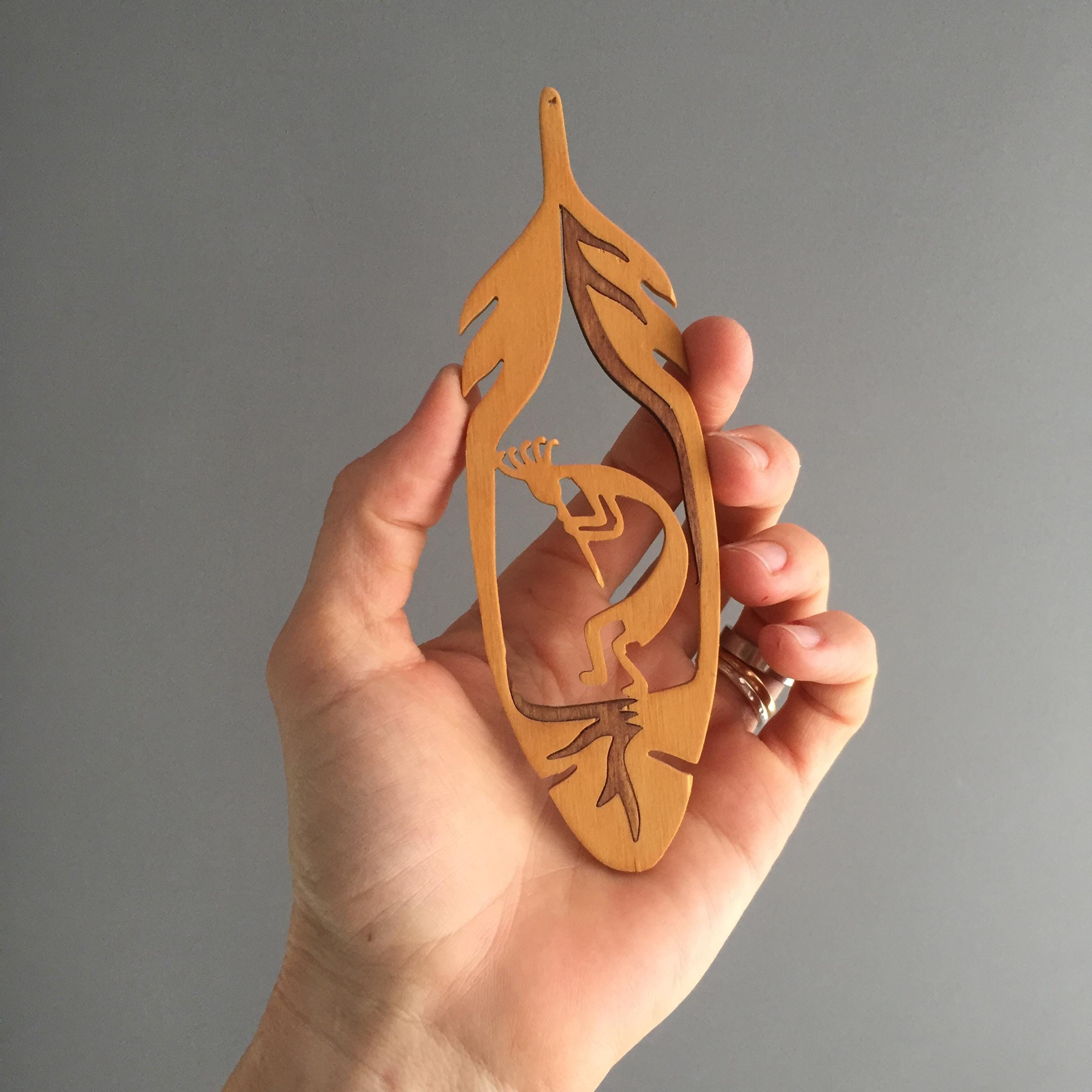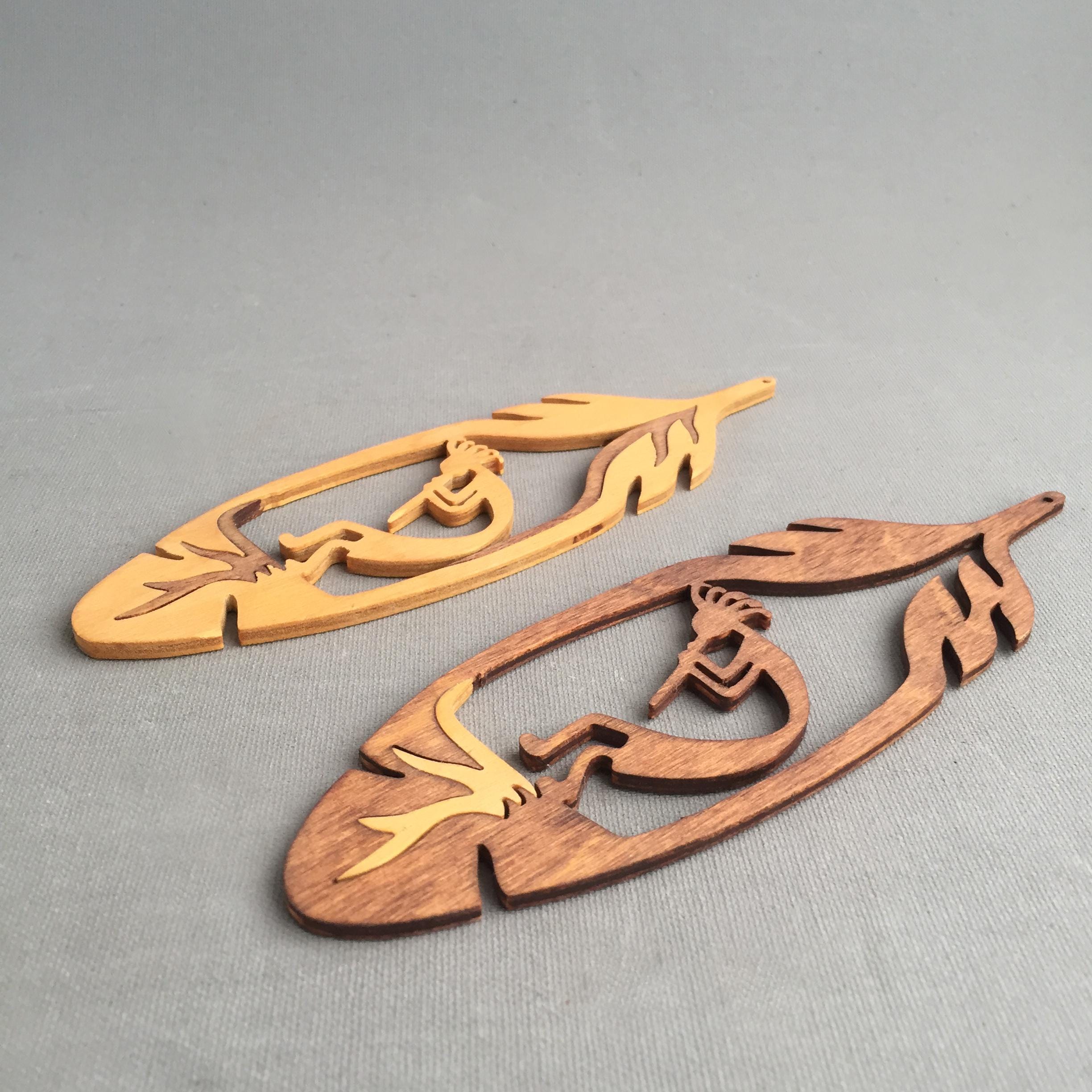 Two wooden ornaments featuring the figure of Kokopelli within a feather design. Kokopelli is a sacred figure and common symbol in the North American Southwest, often representing fertility and success. Made with fine details out of two types of wood . They have a small hole at the top of the feather for hanging and display or use as a book mark . sold as a pair