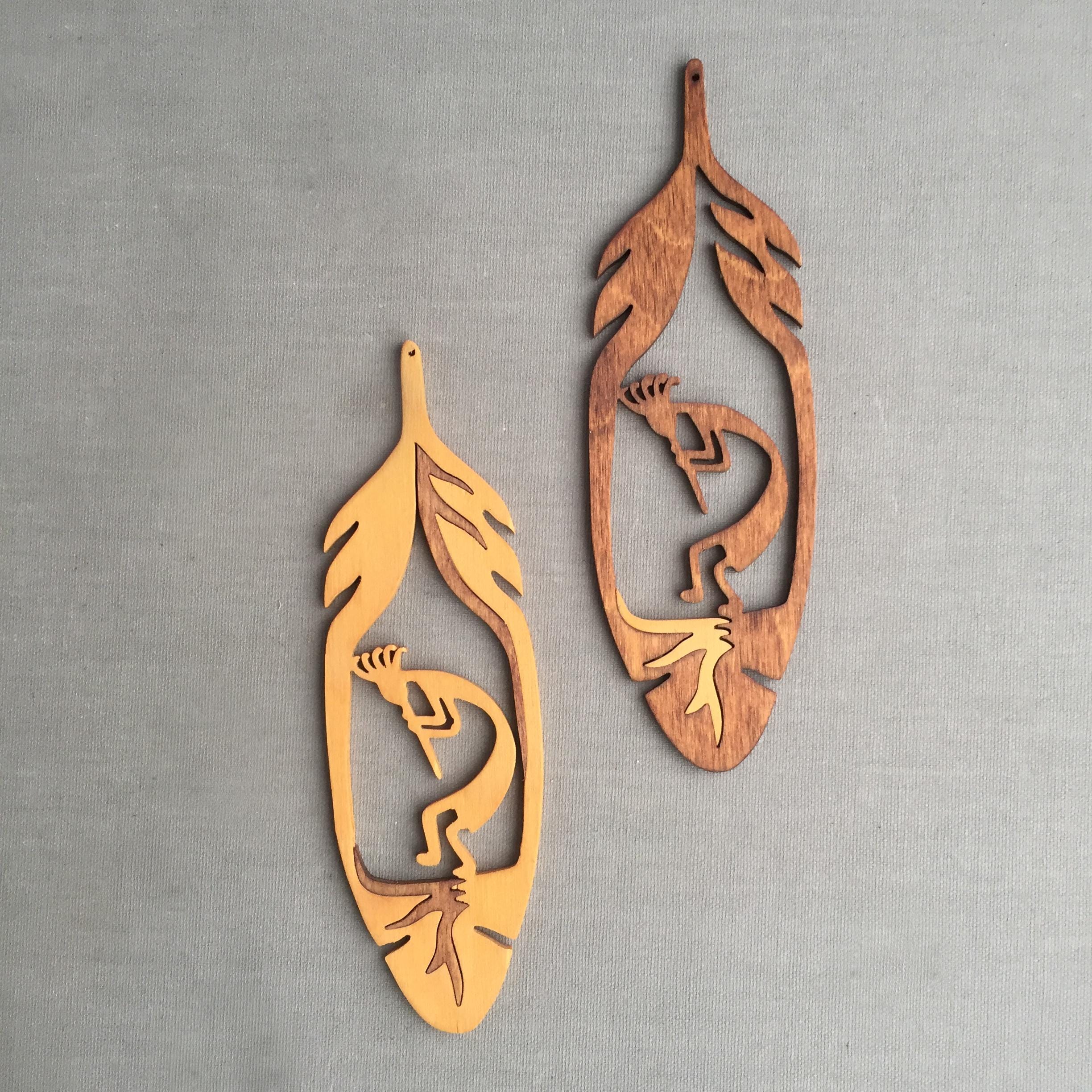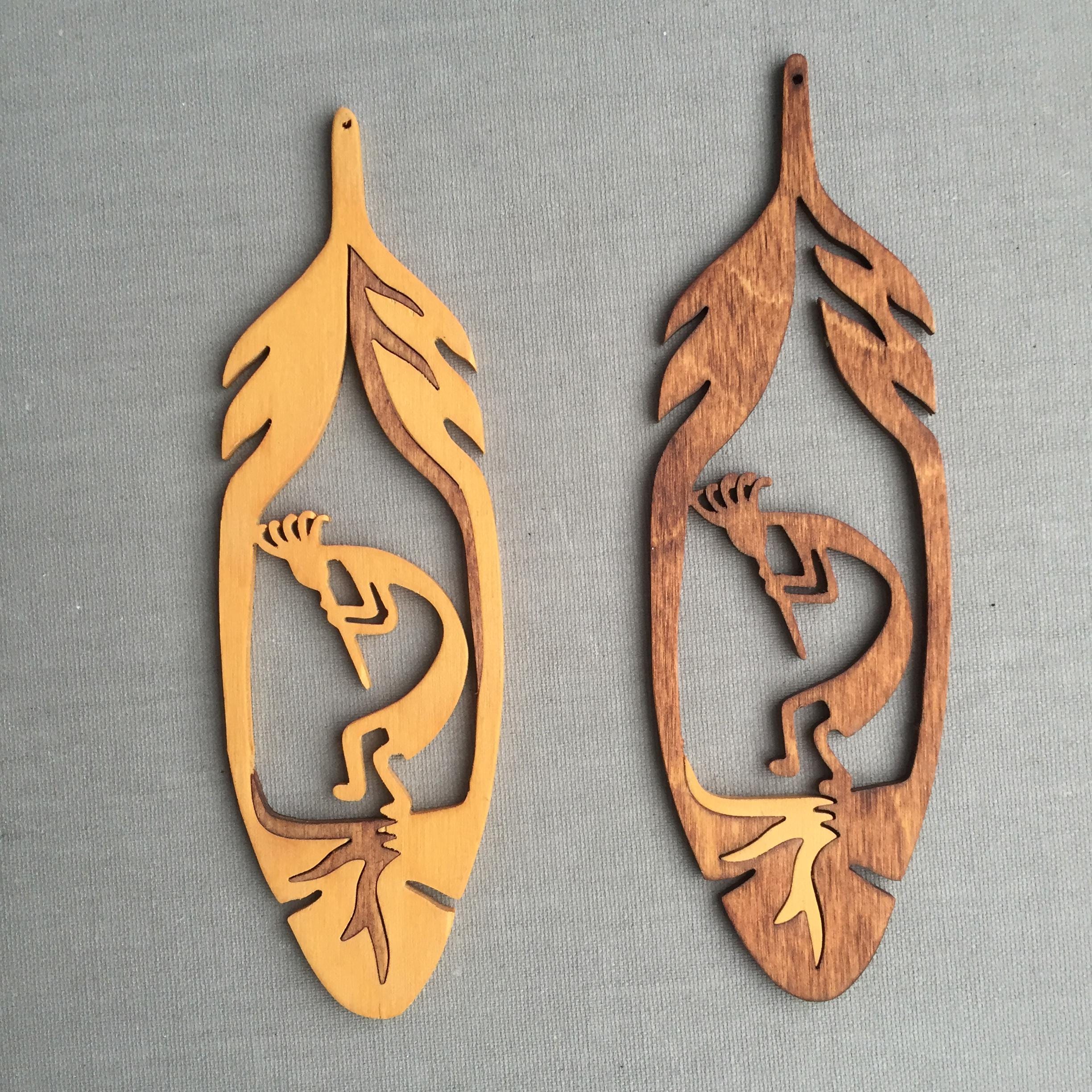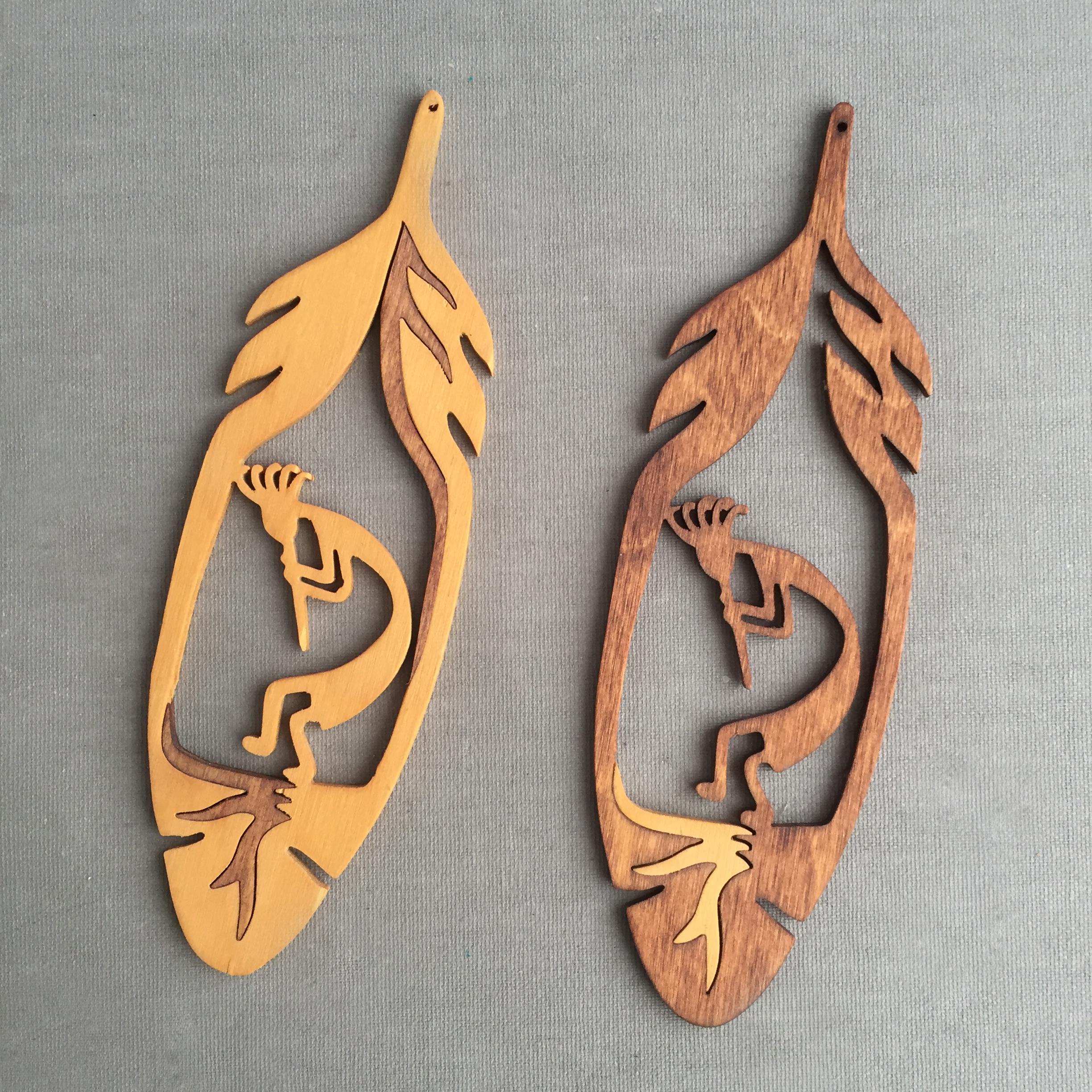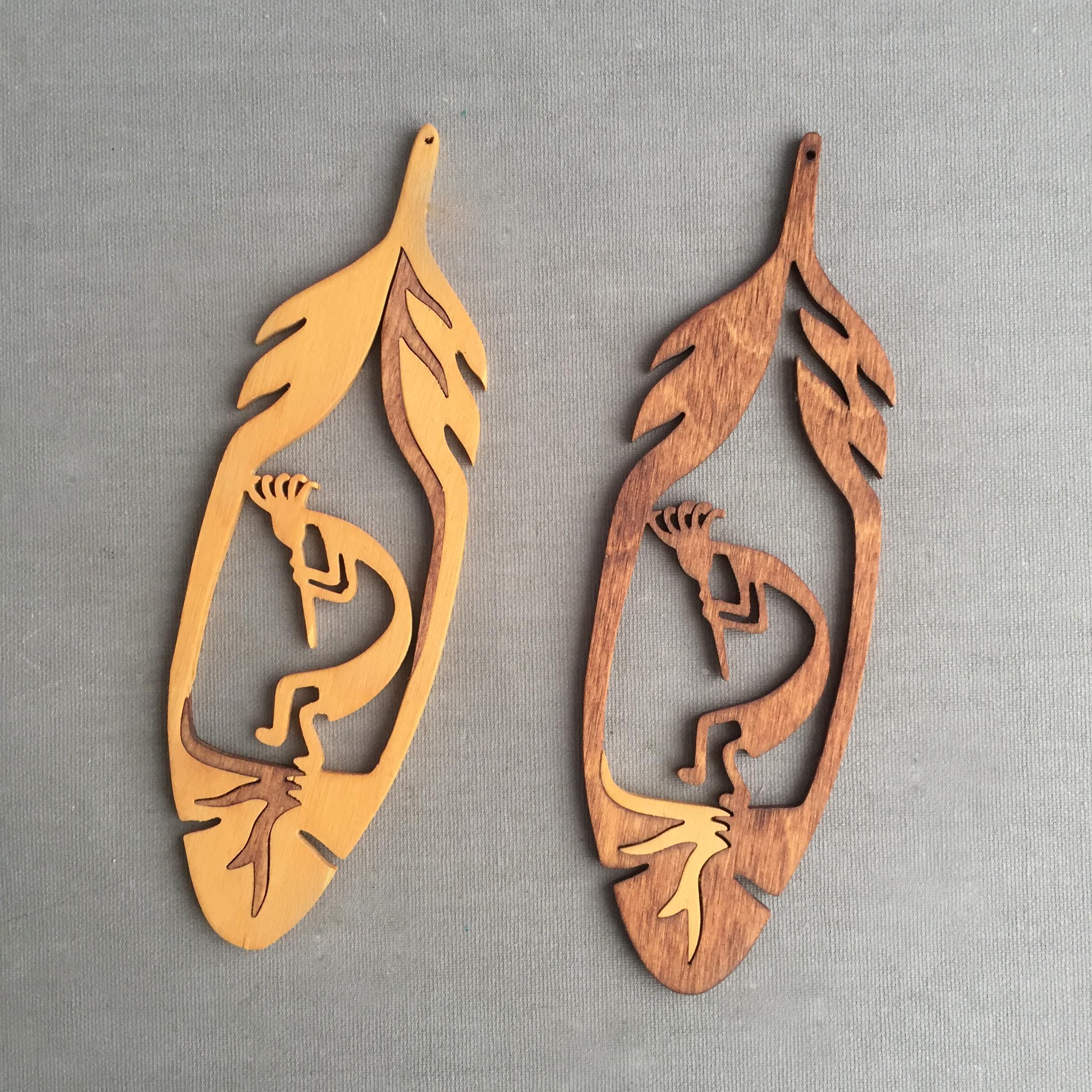 Two wooden ornaments featuring the figure of Kokopelli within a feather design. Kokopelli is a sacred figure and common symbol in the North American Southwest, often representing fertility and success. Made with fine details out of two types of wood . They have a small hole at the top of the feather for hanging and display or use as a book mark . sold as a pair