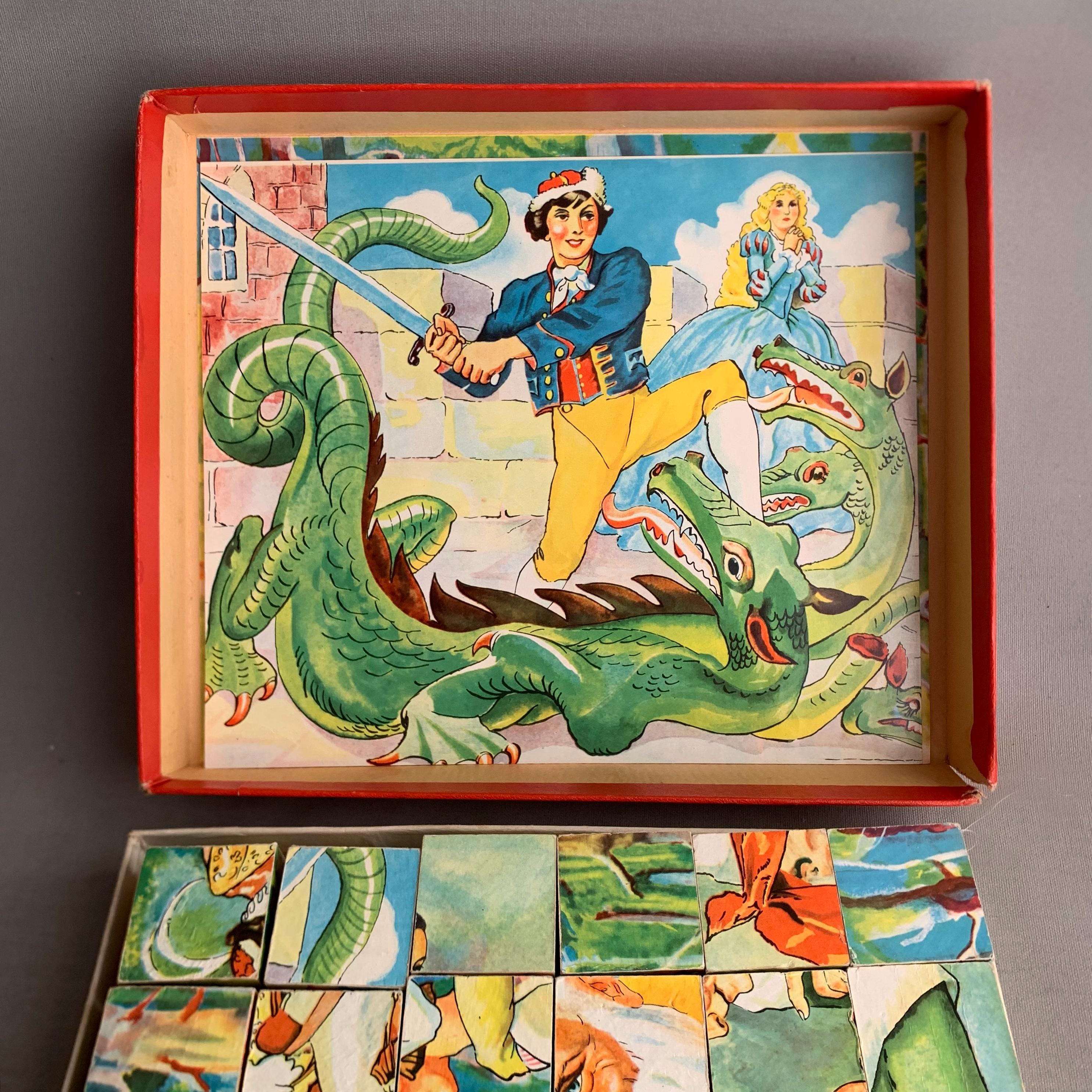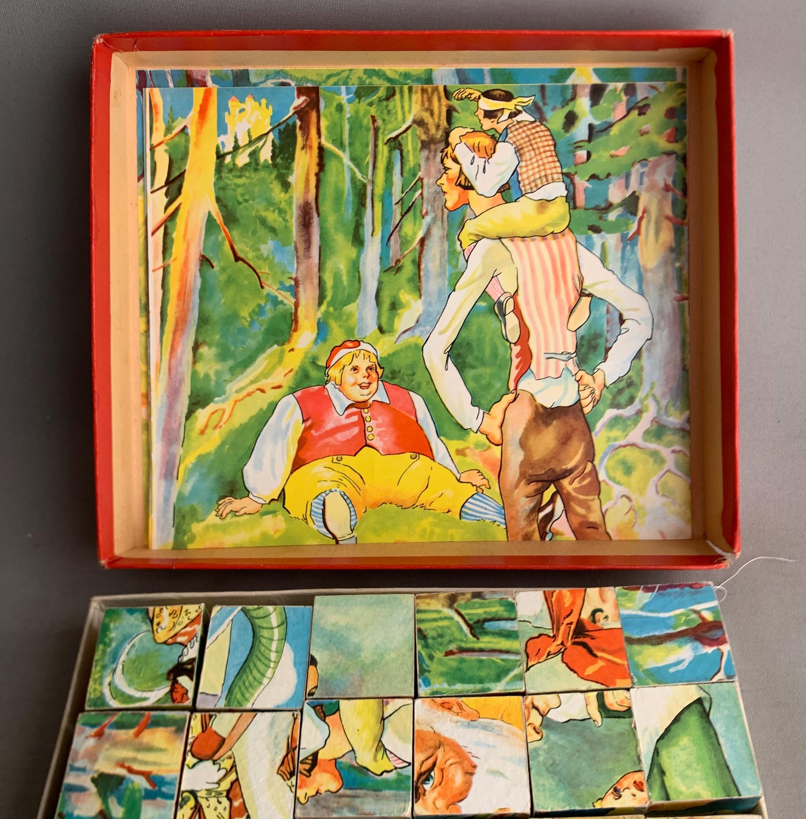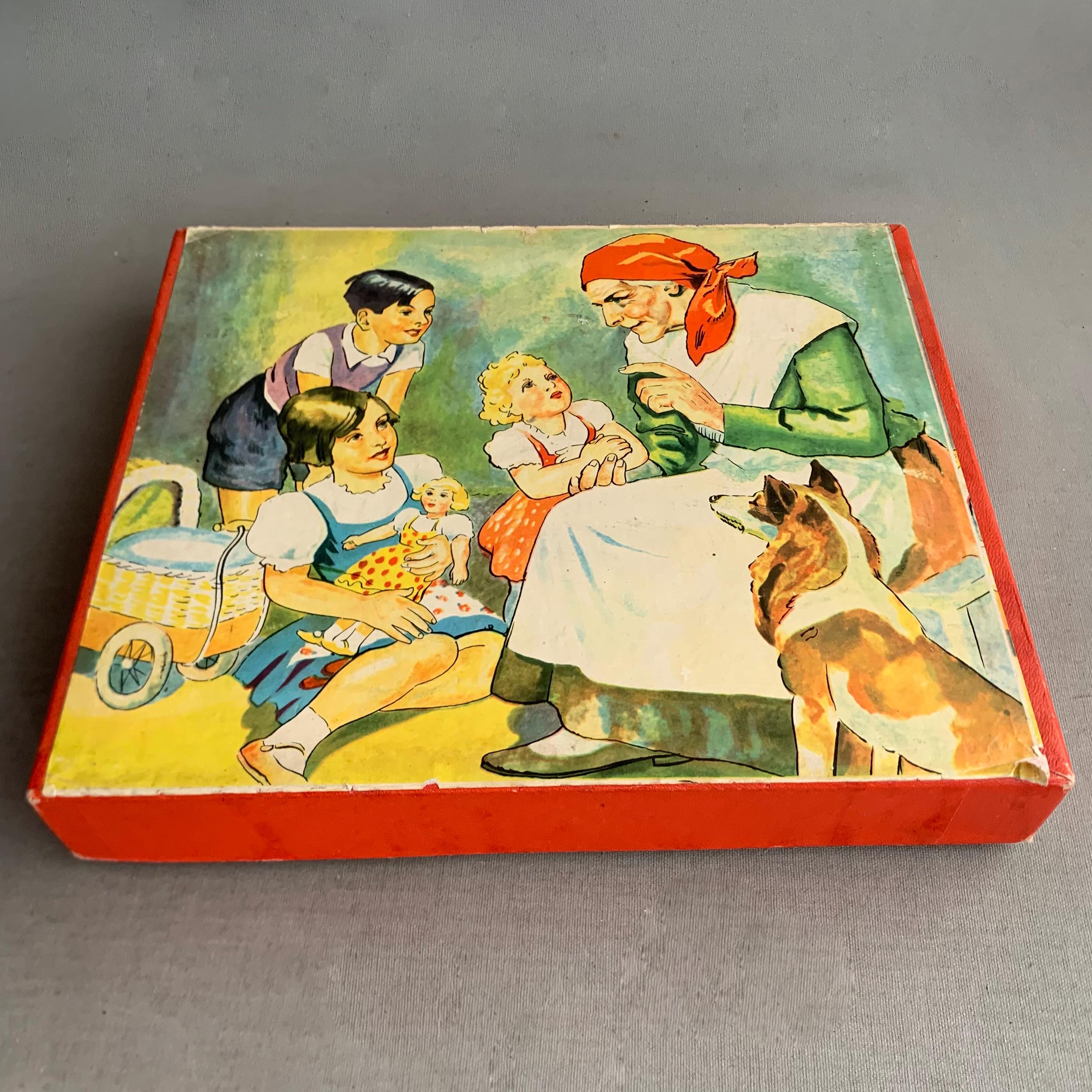 A vintage, mid-century wooden block puzzle featuring six different fairy tale scenes, including Little Red Riding Hood.
