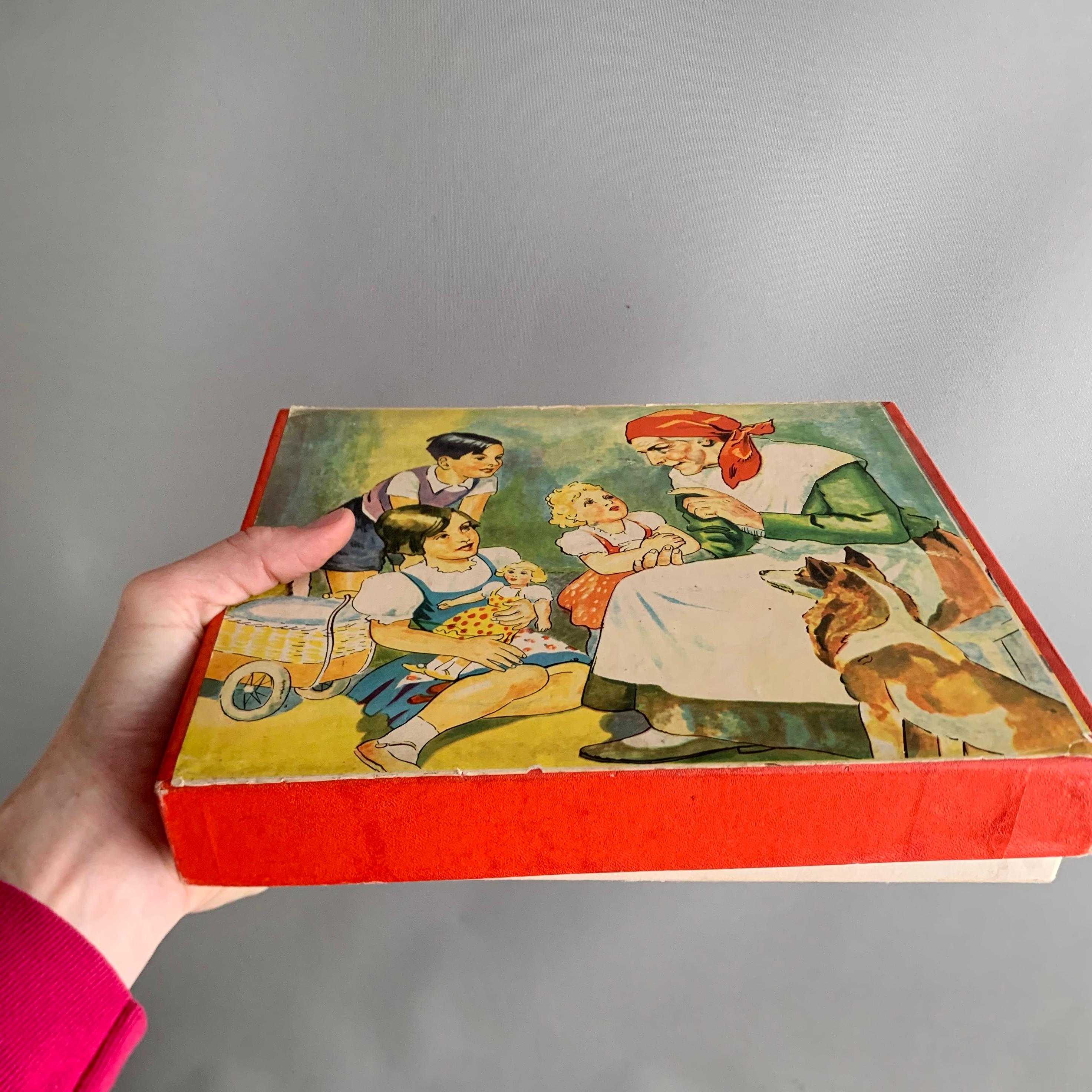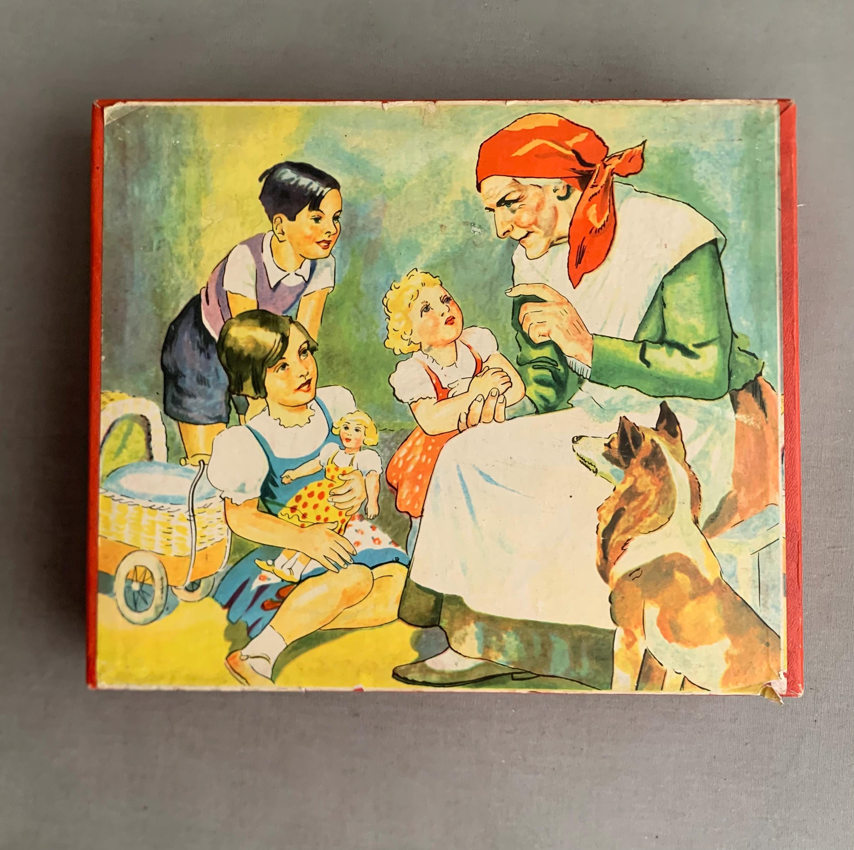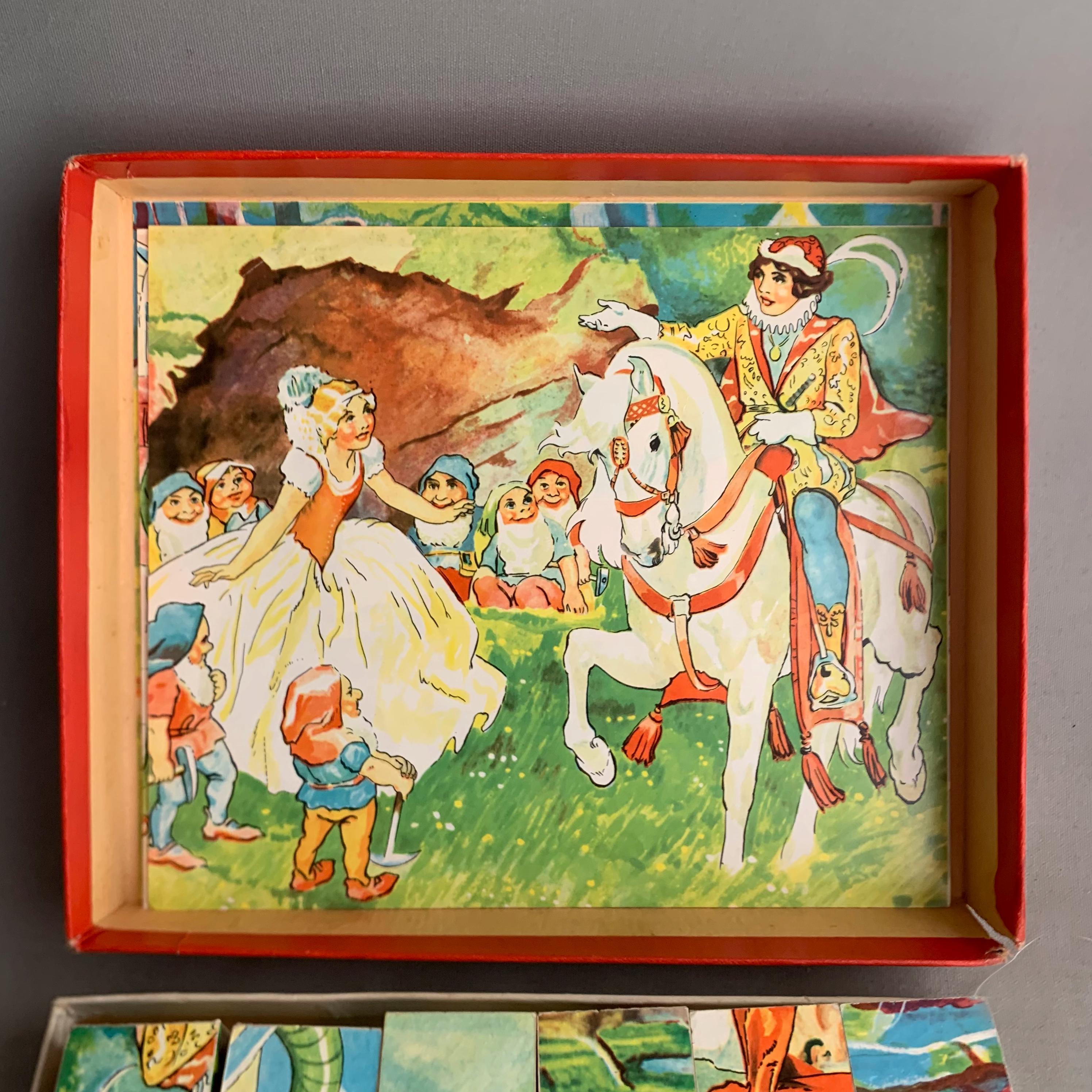 A vintage, mid-century wooden block puzzle featuring six different fairy tale scenes, including Little Red Riding Hood.