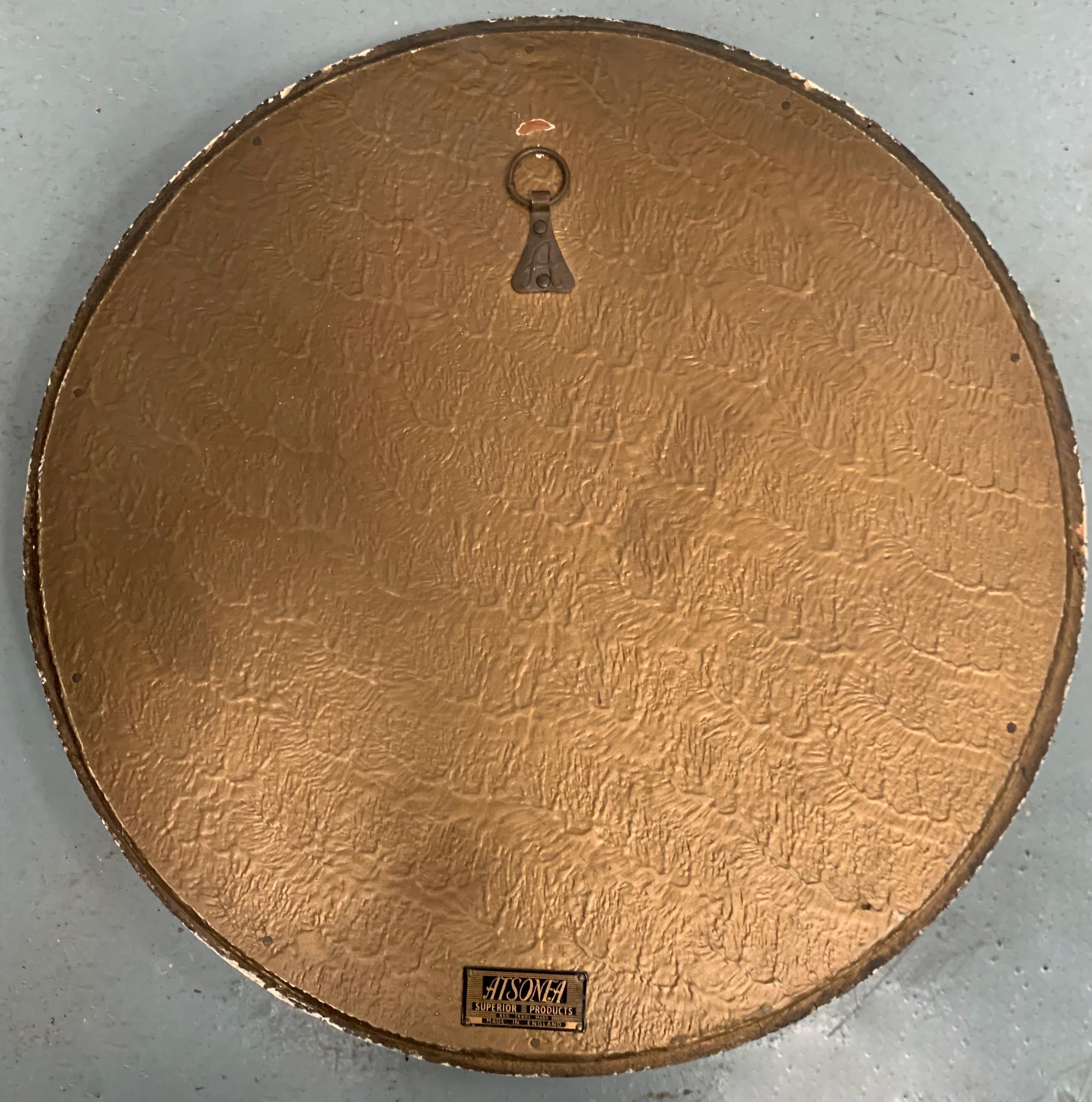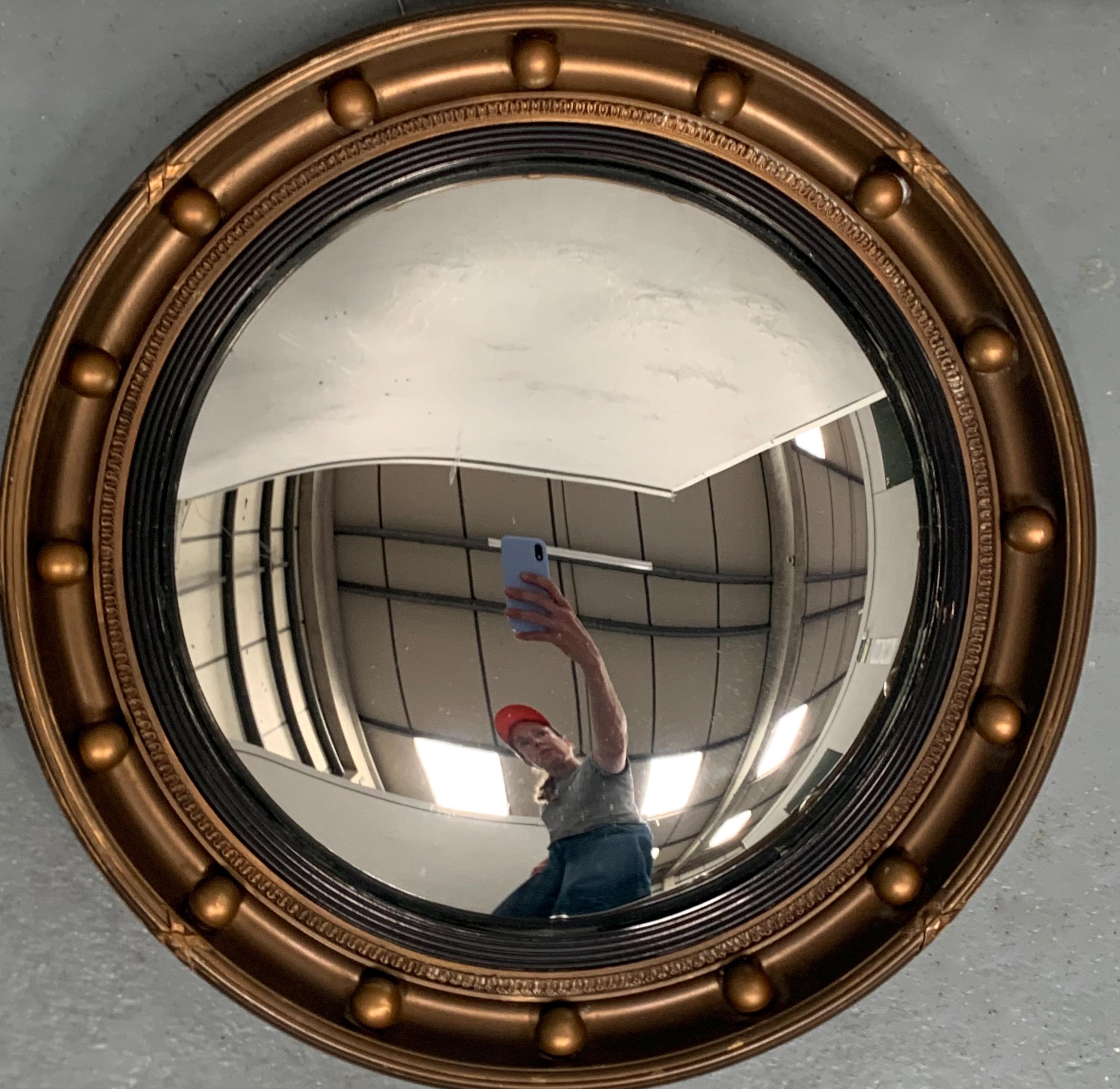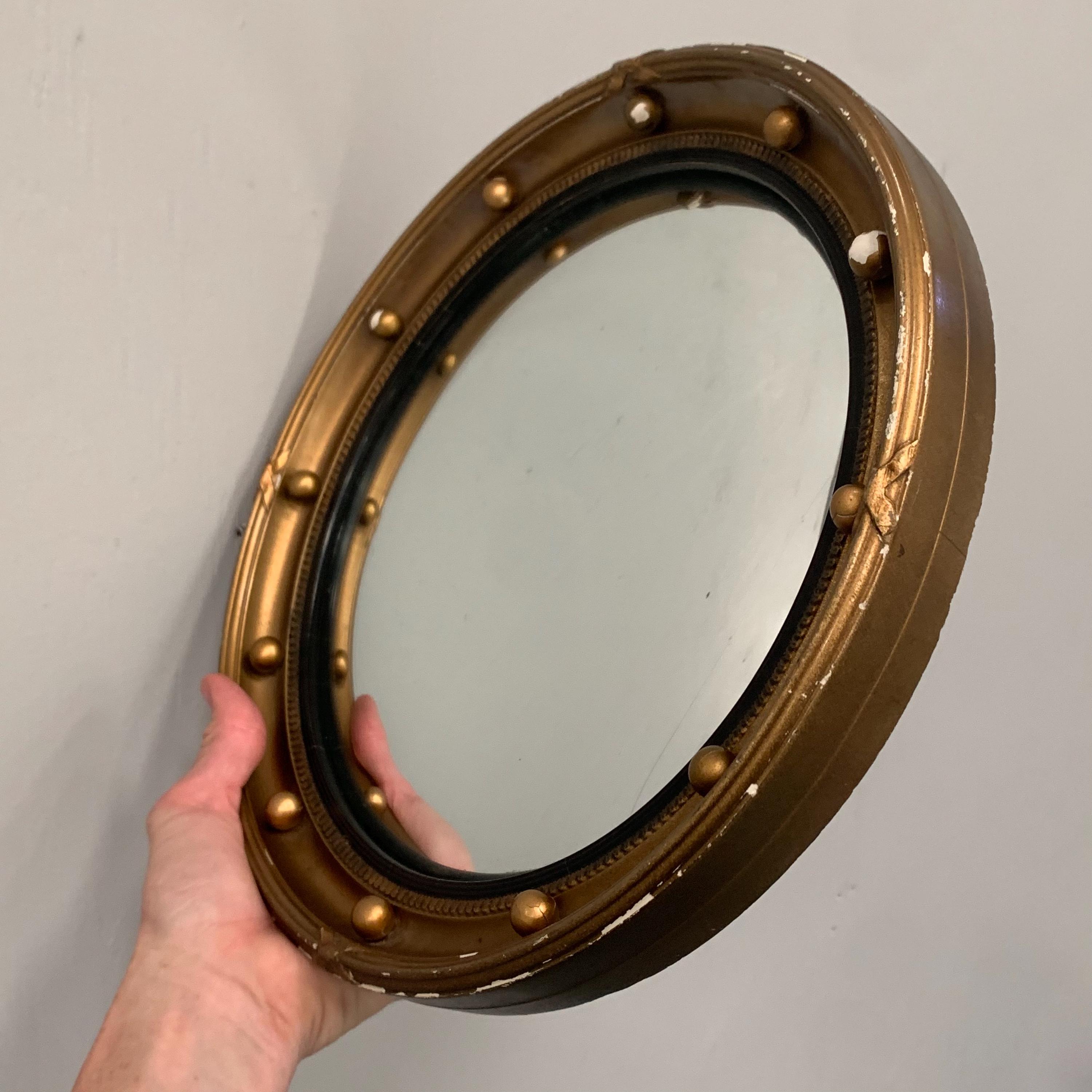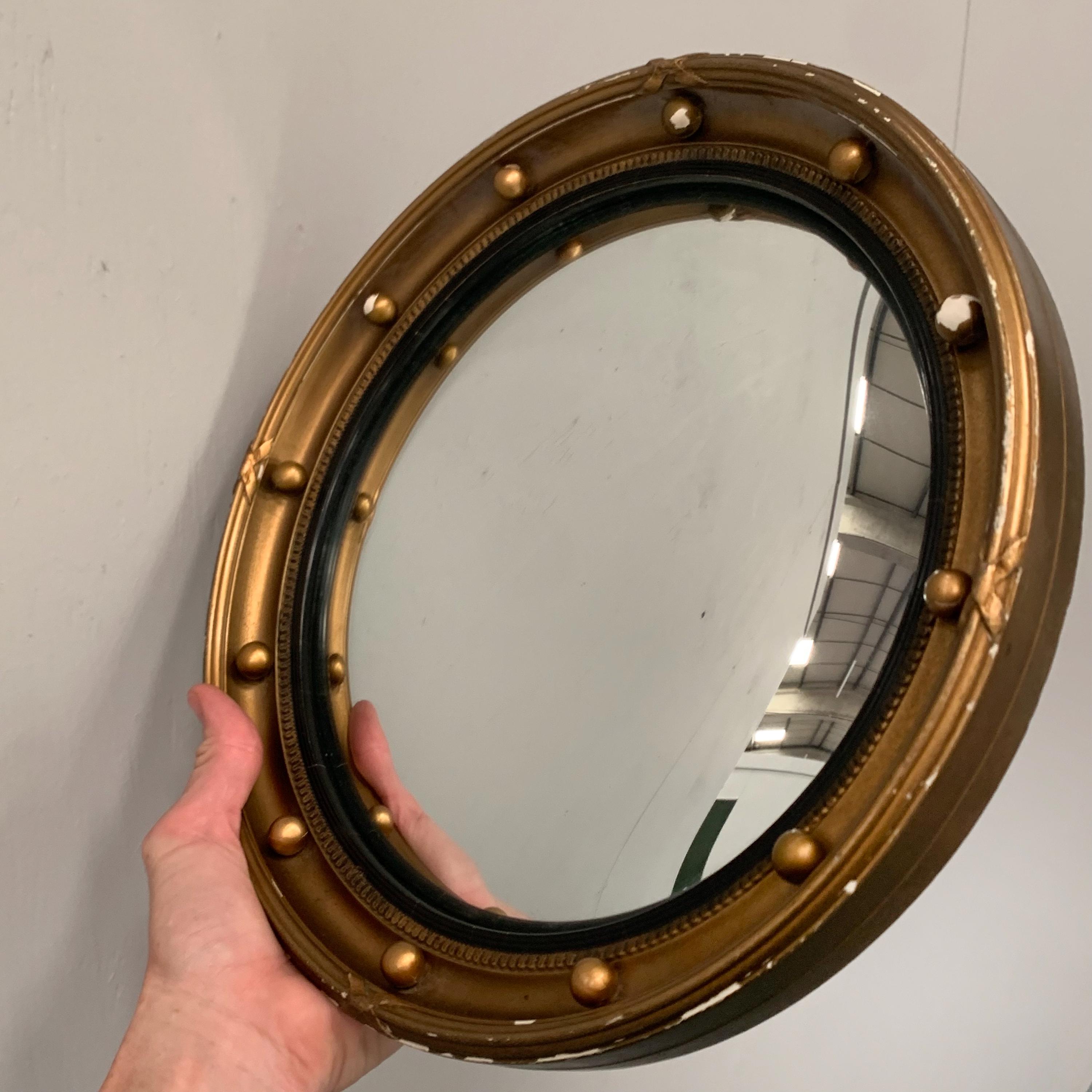 A vintage round convex mirror, often referred to as a "butler's mirror" or "fish-eye mirror". Featuring a gilt (gold-coloured) frame with decorative ball embellishments, a design typical of the Regency style-