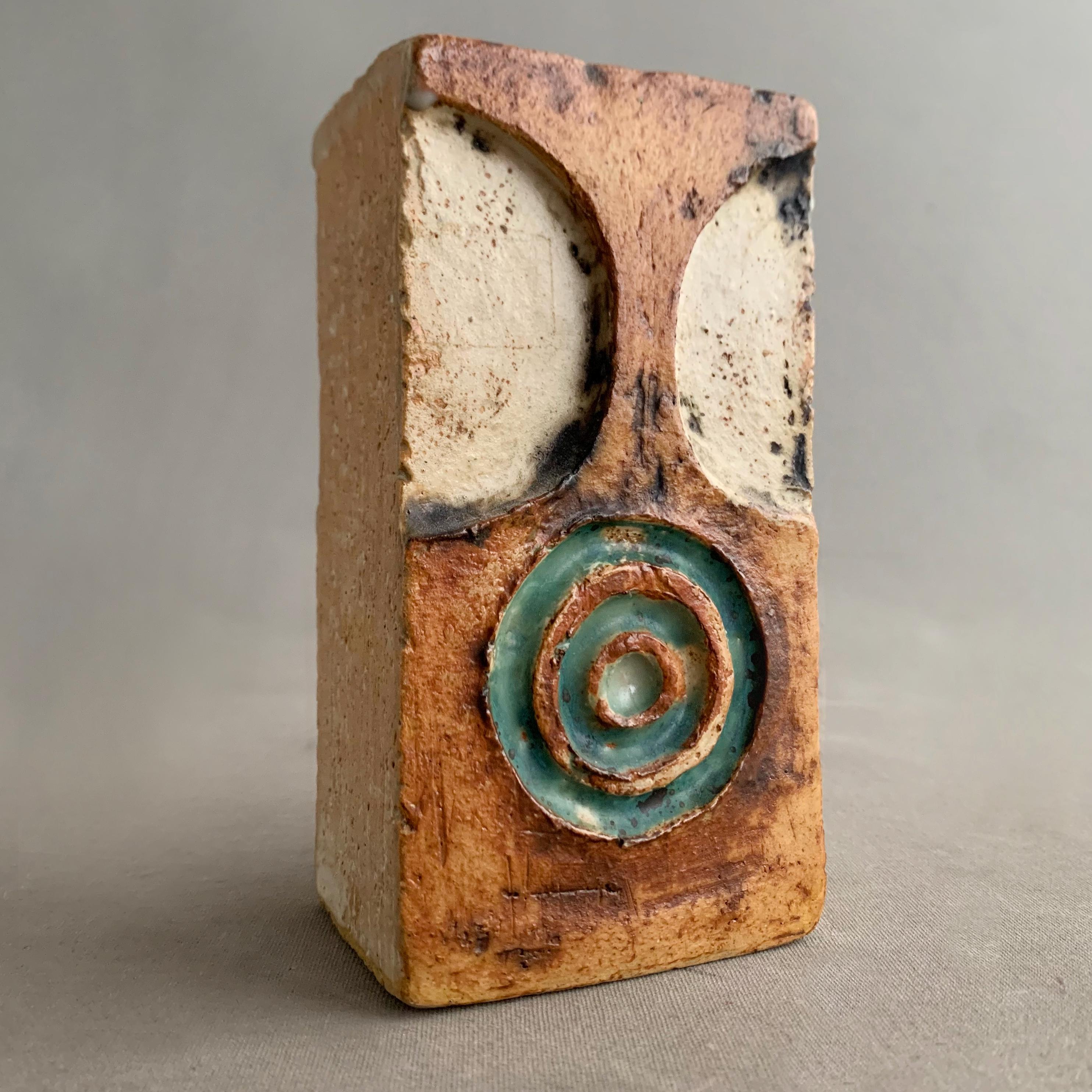 It has impressed circular and semi-circular motifs, highlighted with a vibrant turquoise glaze.