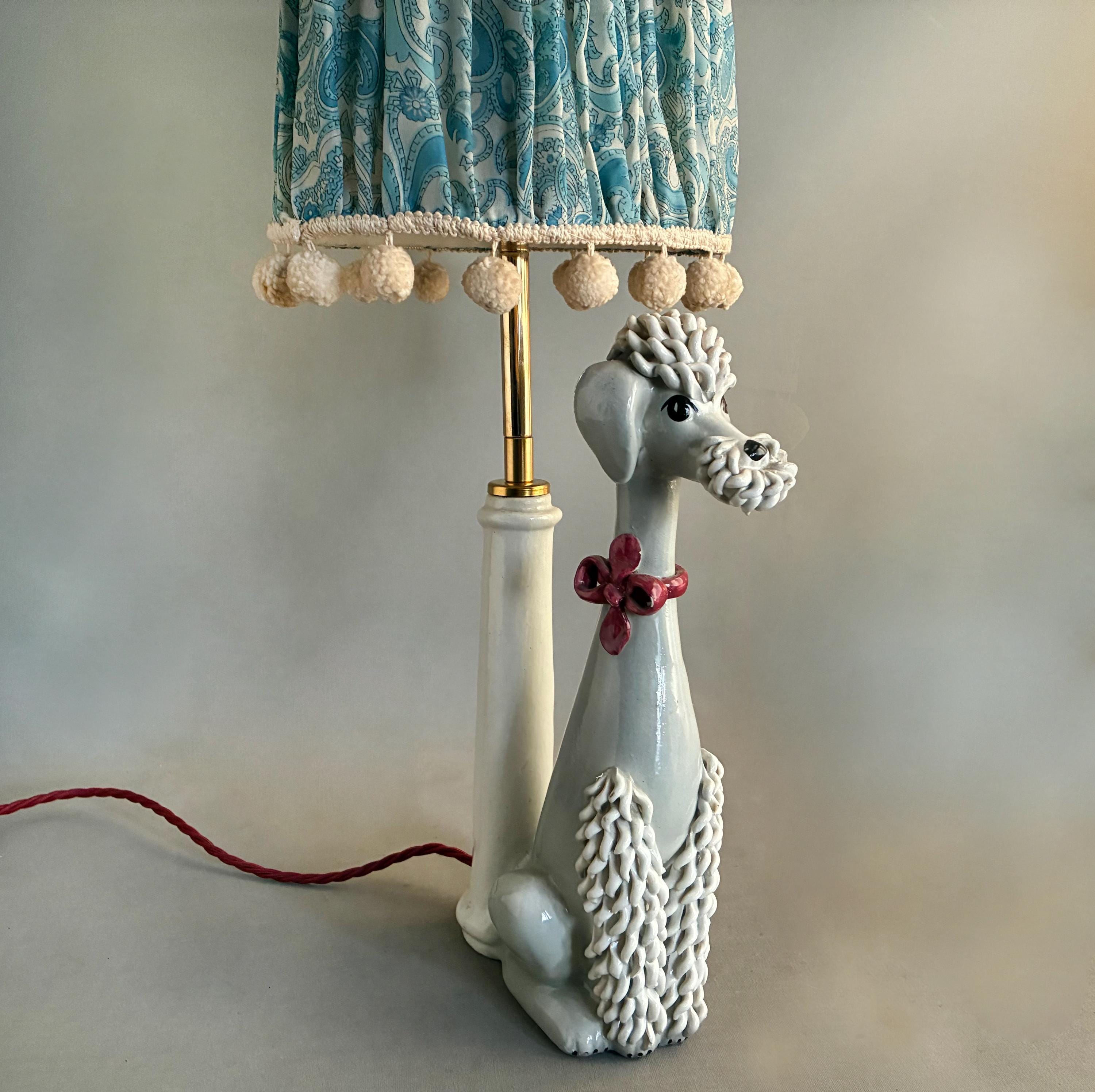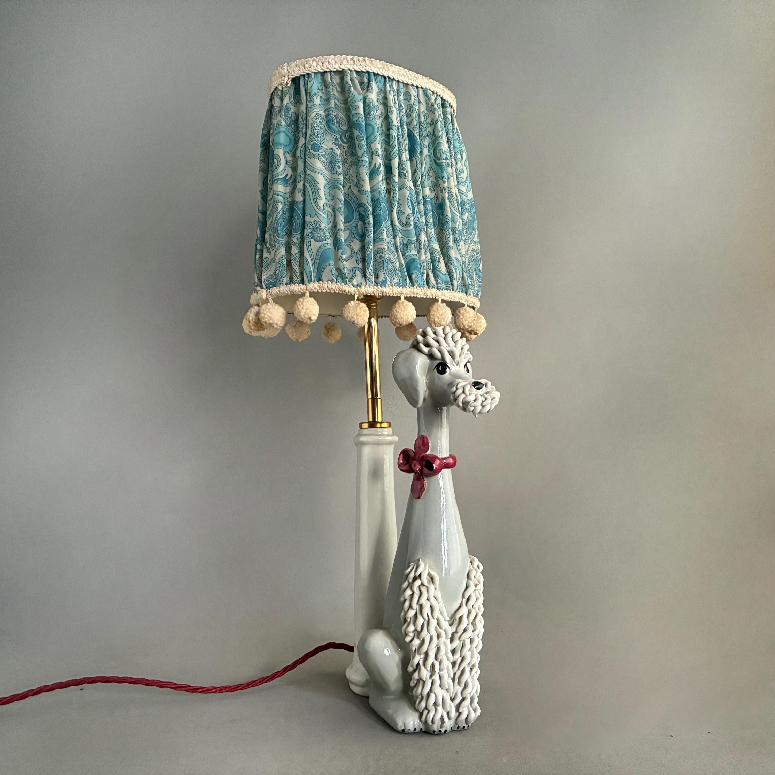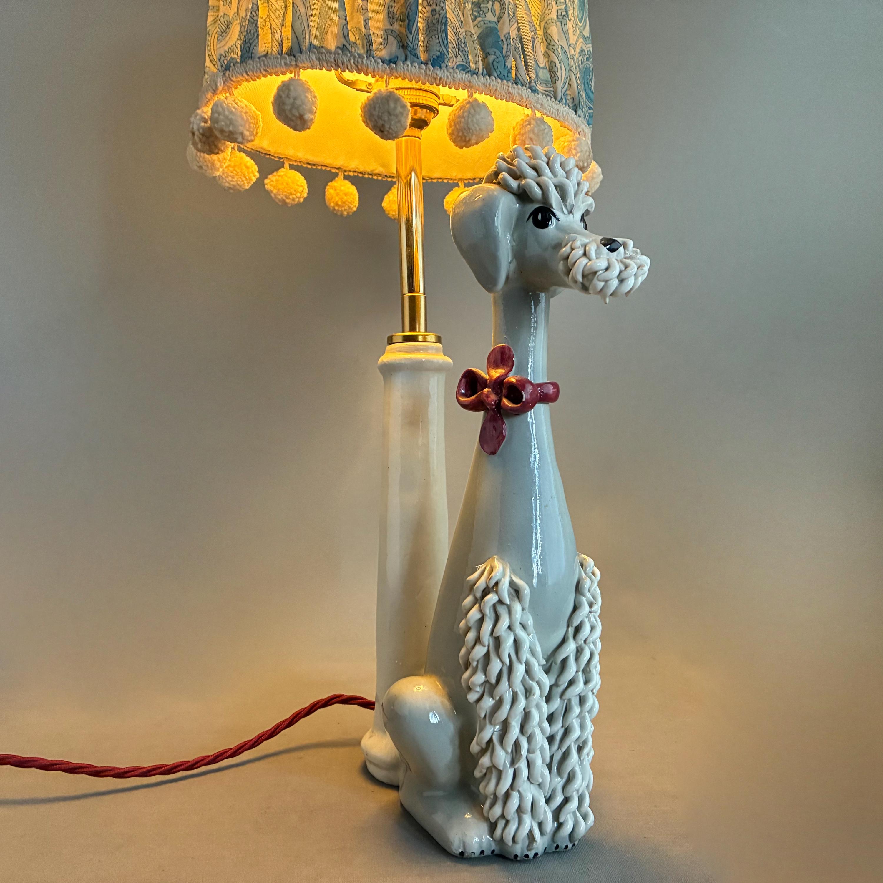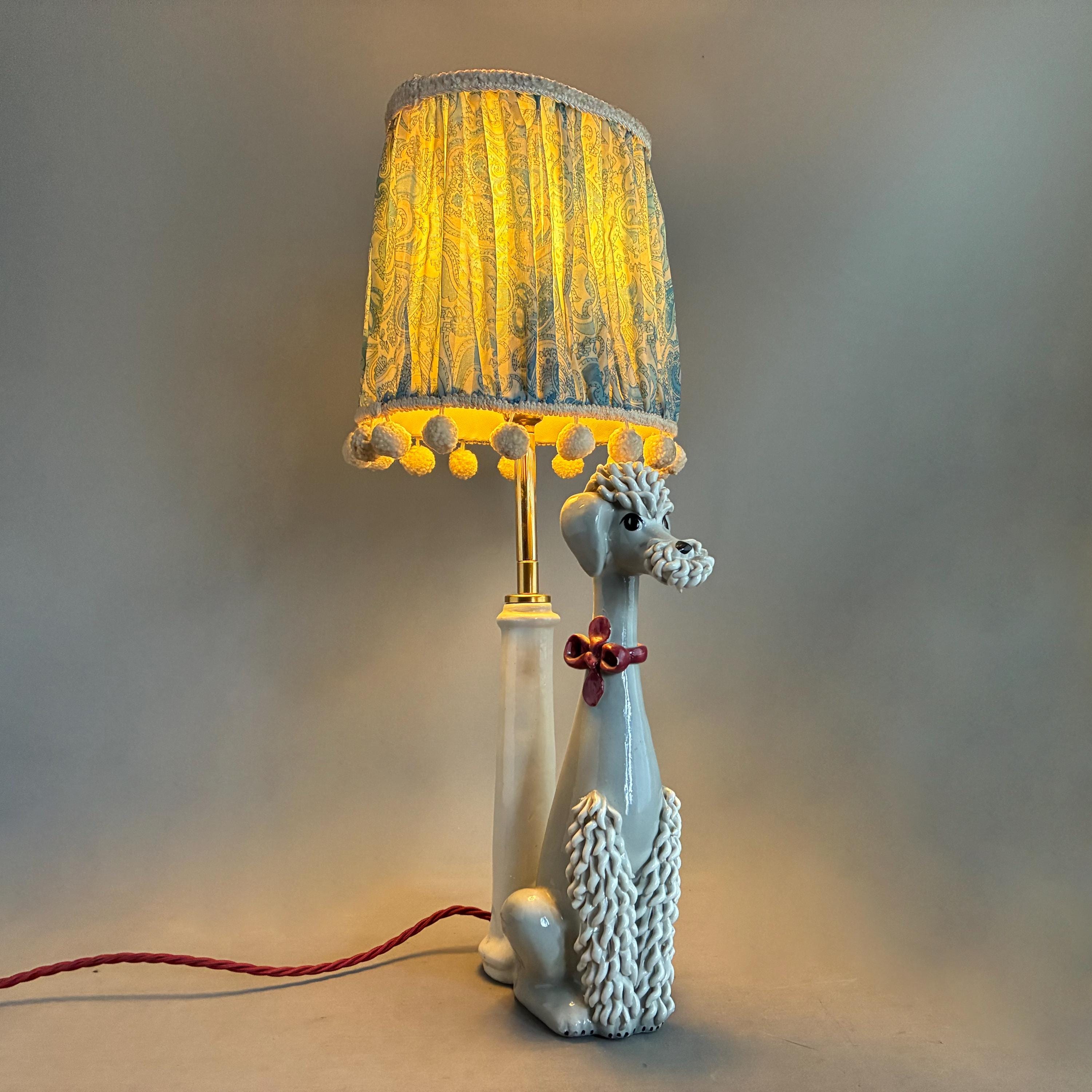 This charming vintage ceramic poodle lamp brings a lot of mid-century whimsy to any space. With its distinctive spaghetti-textured fur and dapper burgundy bow collar, this retro pooch stands tall and proud .Paired with an original vintage floral ruche and pompom shade. This lamp has been professionally rewired and has a burgundy textile cord and black switch on the cable . There are a few unnoticeable flaws where the spagetti tips have broken ( see close up of the face) for a ceramic of this age it is in good condition . A quirky and rare little fellow .Many modern day knock offs- this is the real mcoy