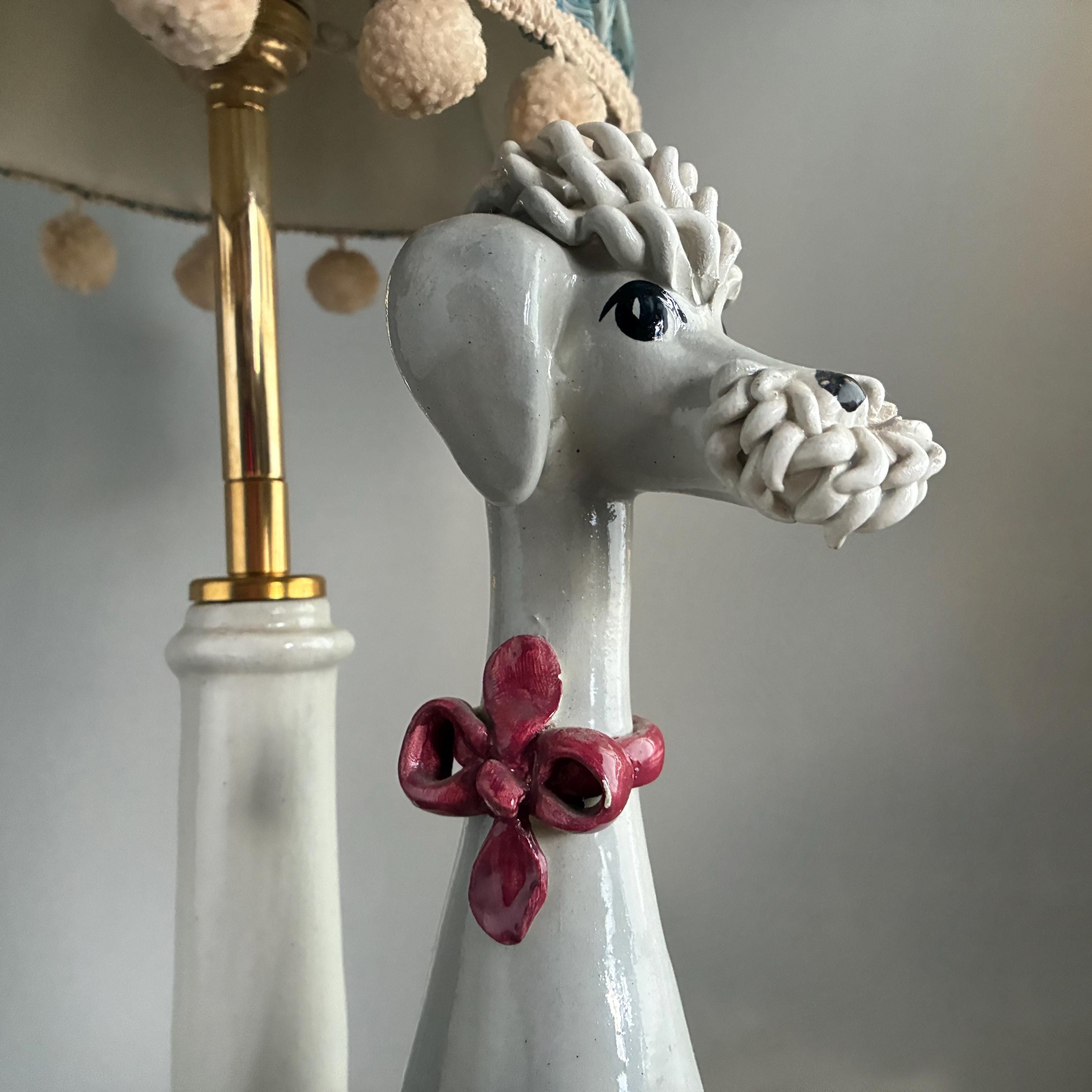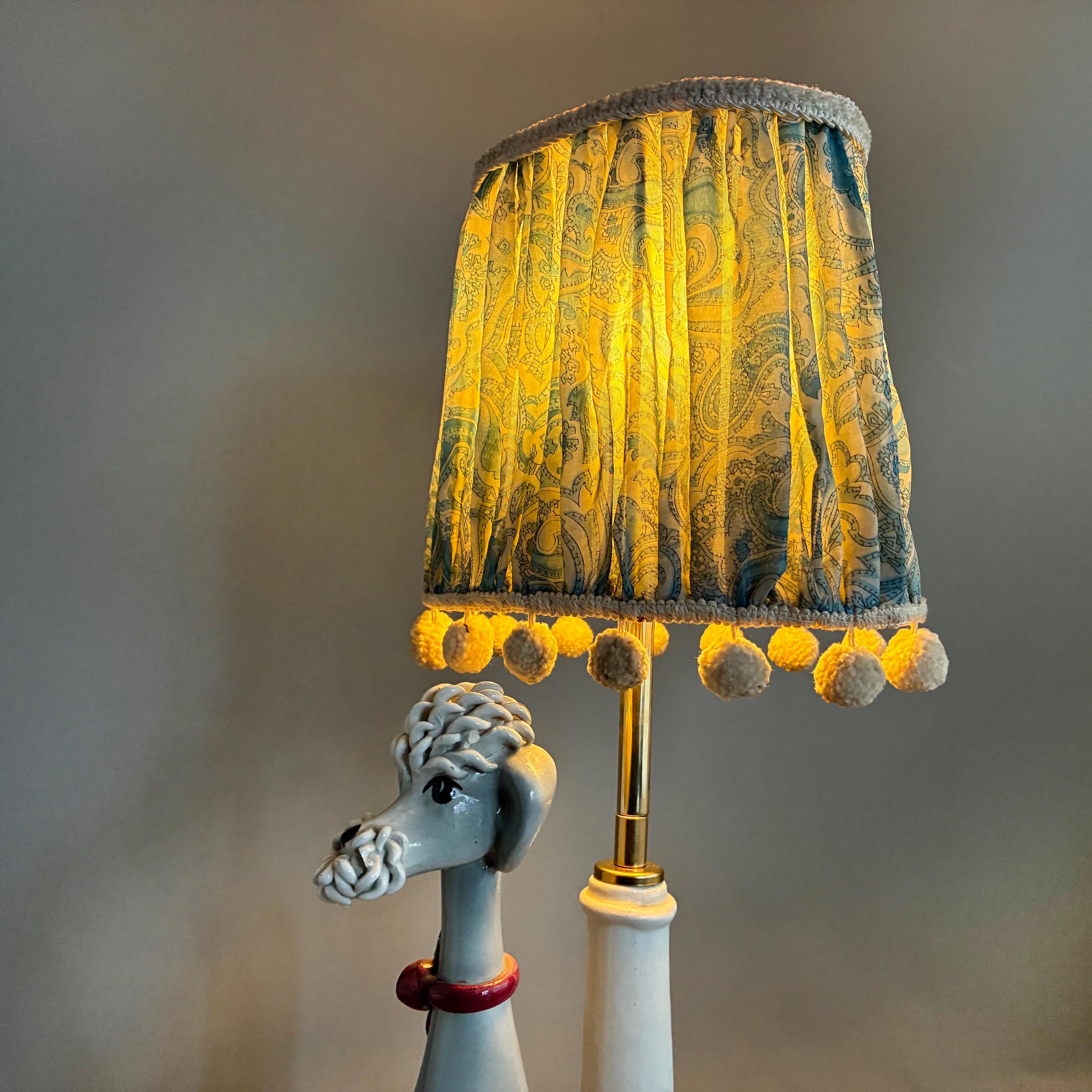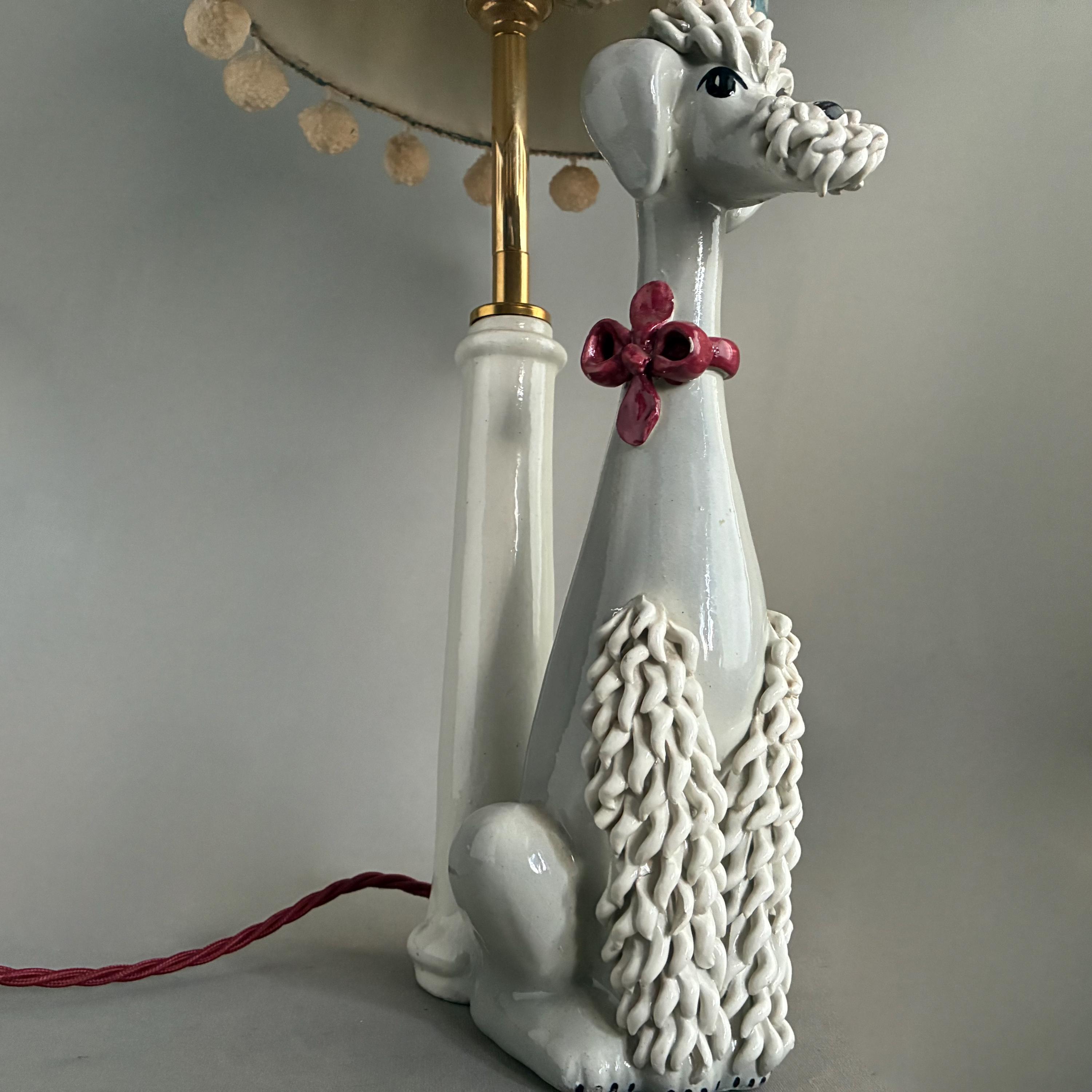 This charming vintage ceramic poodle lamp brings a lot of mid-century whimsy to any space. With its distinctive spaghetti-textured fur and dapper burgundy bow collar, this retro pooch stands tall and proud .Paired with an original vintage floral ruche and pompom shade. This lamp has been professionally rewired and has a burgundy textile cord and black switch on the cable . There are a few unnoticeable flaws where the spagetti tips have broken ( see close up of the face) for a ceramic of this age it is in good condition . A quirky and rare little fellow .Many modern day knock offs- this is the real mcoy