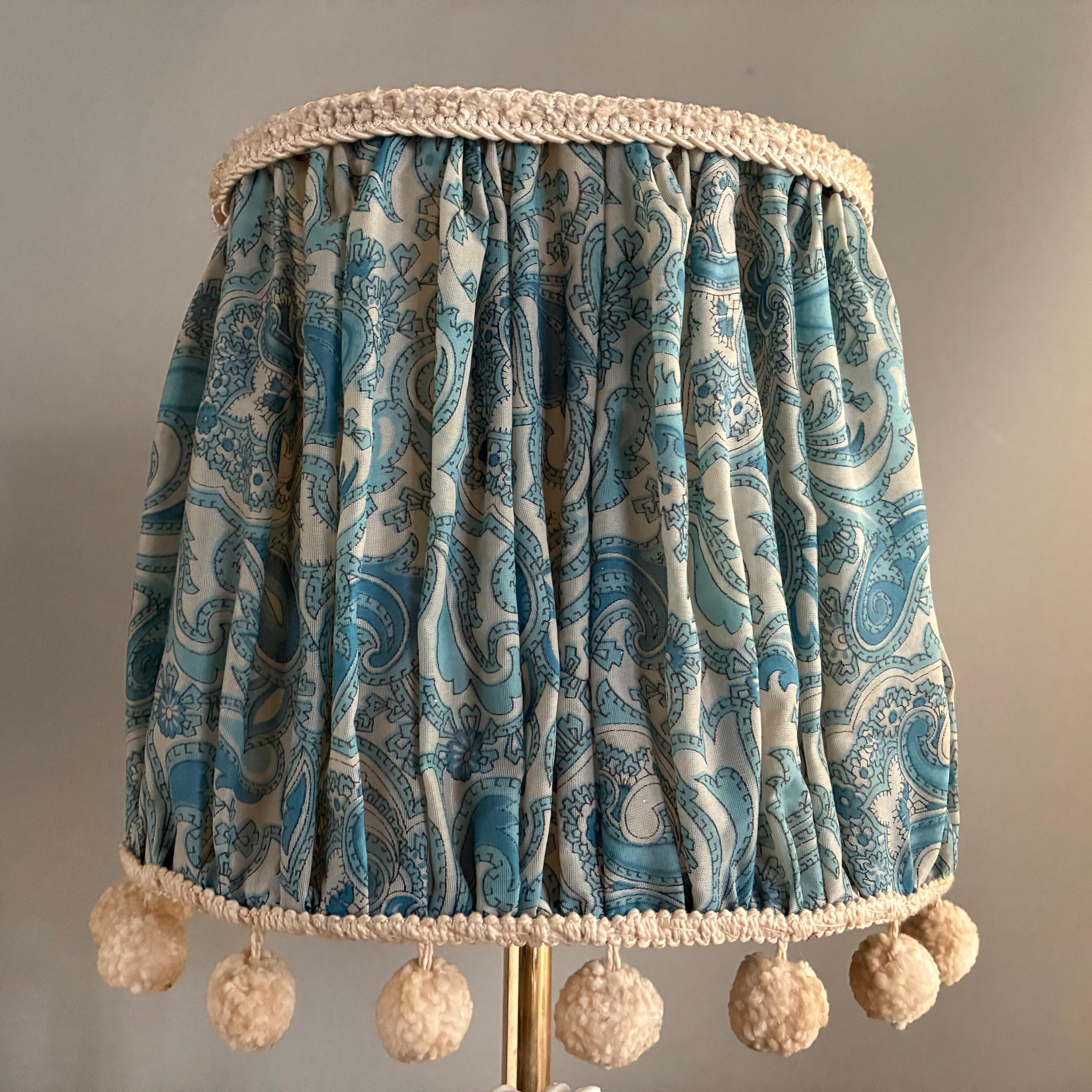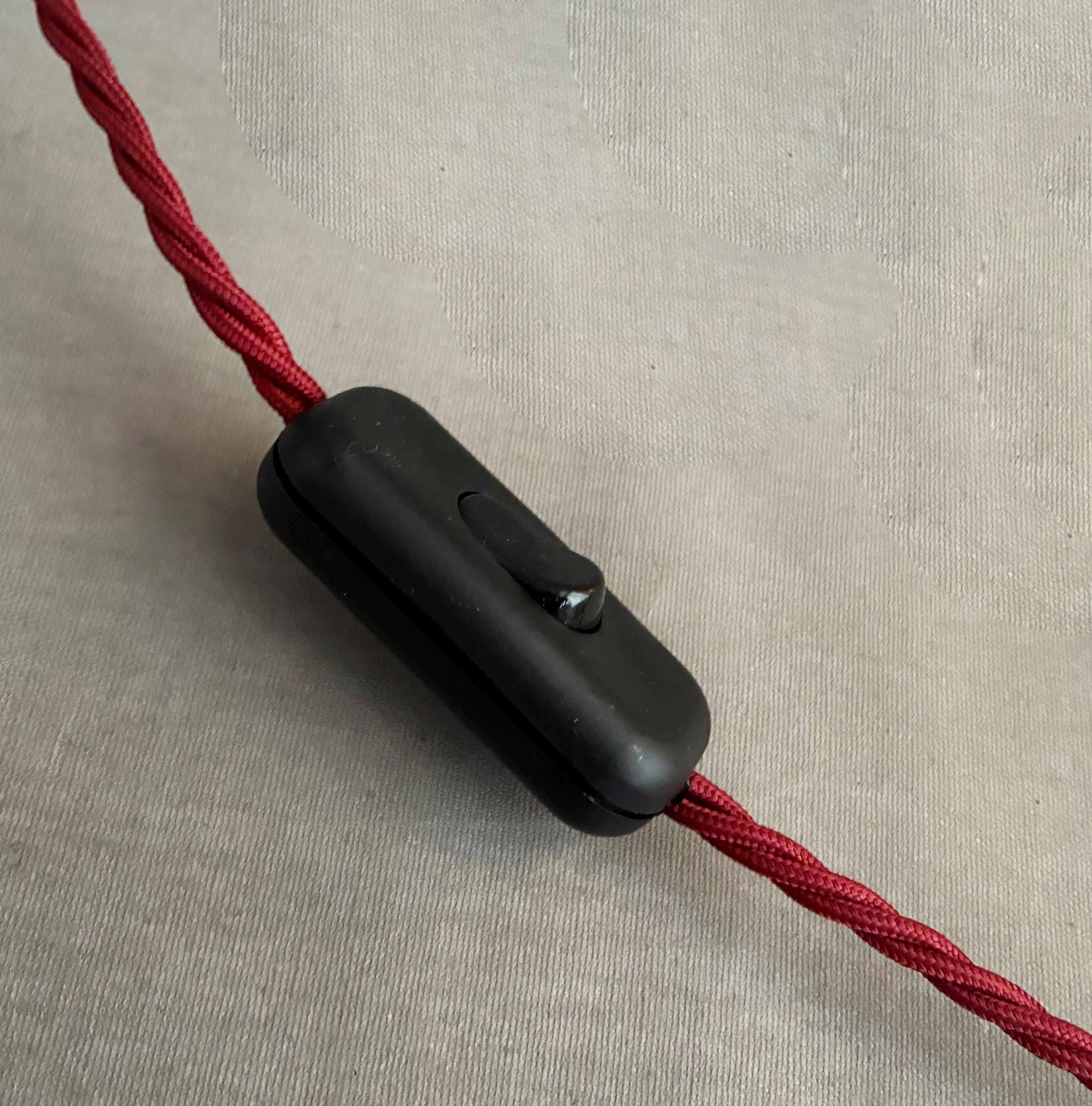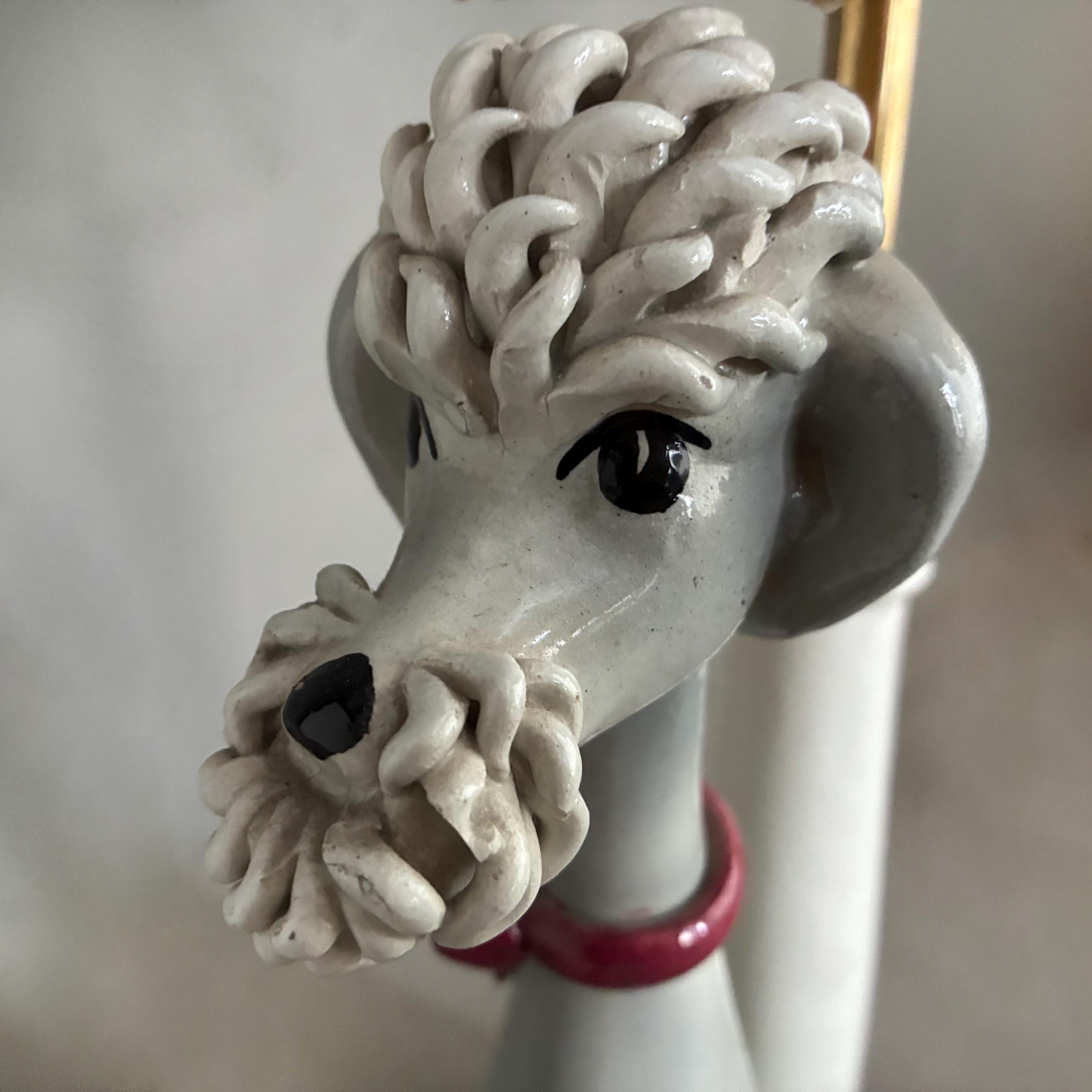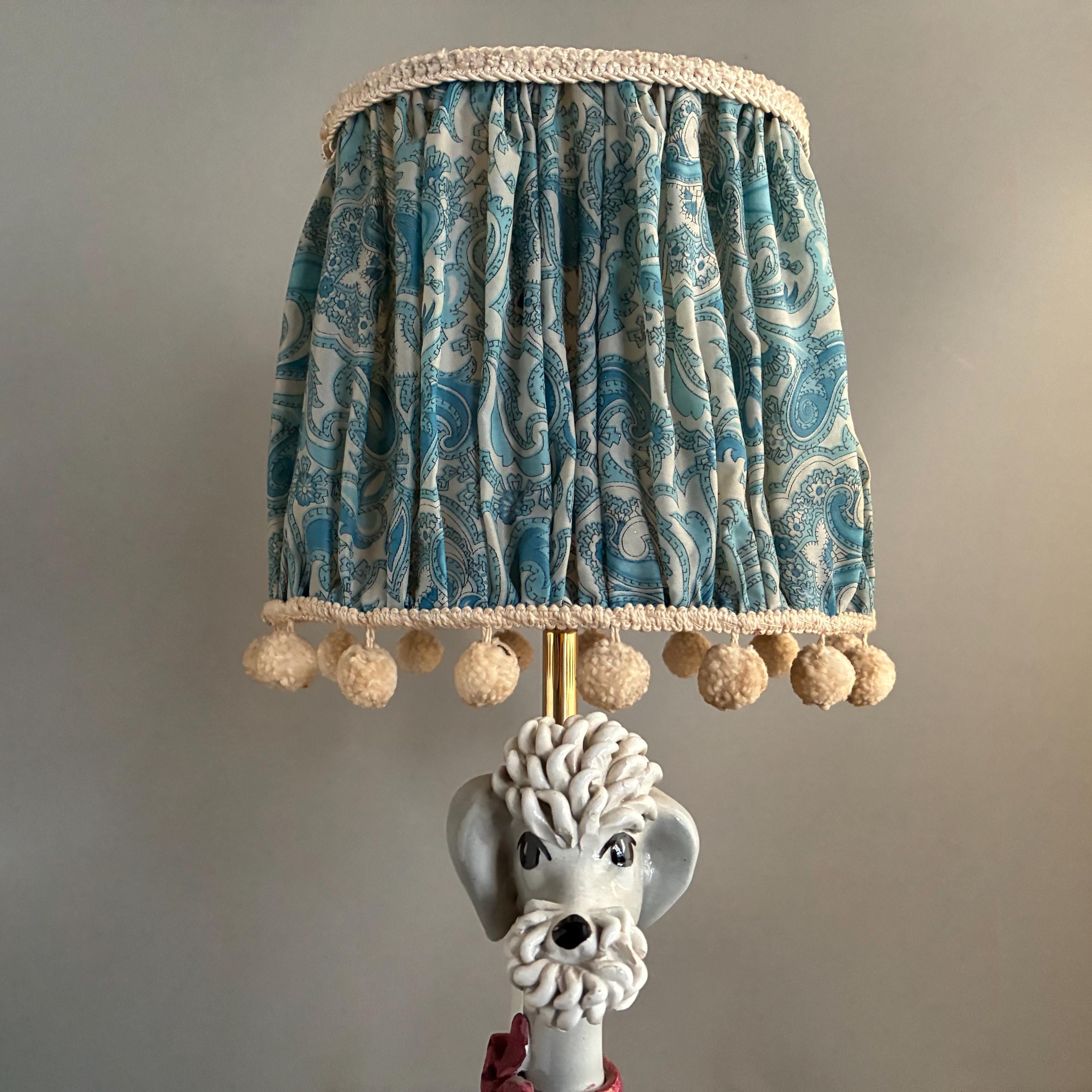 This charming vintage ceramic poodle lamp brings a lot of mid-century whimsy to any space. With its distinctive spaghetti-textured fur and dapper burgundy bow collar, this retro pooch stands tall and proud .Paired with an original vintage floral ruche and pompom shade. This lamp has been professionally rewired and has a burgundy textile cord and black switch on the cable . There are a few unnoticeable flaws where the spagetti tips have broken ( see close up of the face) for a ceramic of this age it is in good condition . A quirky and rare little fellow .Many modern day knock offs- this is the real mcoy