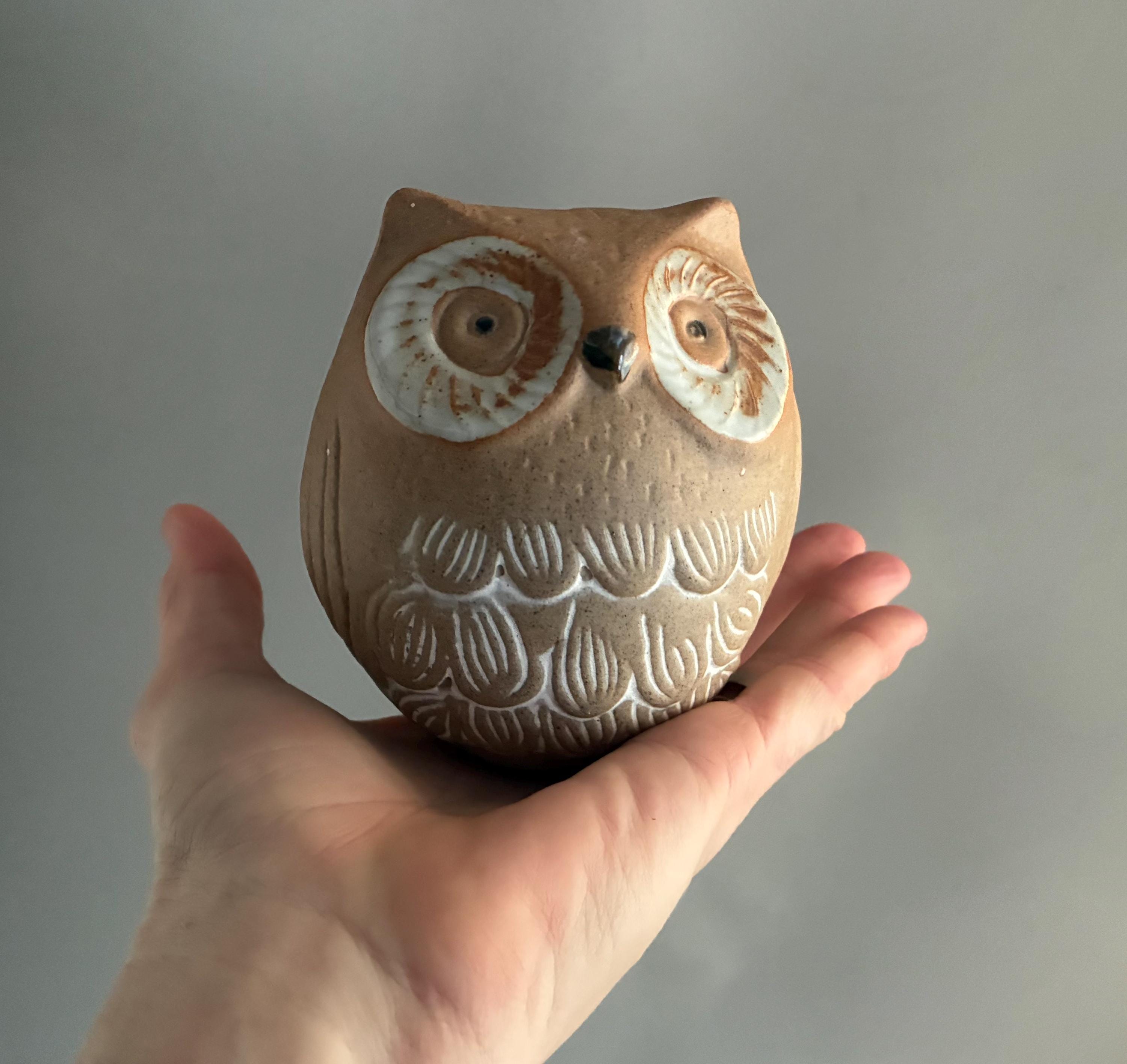 A sweet little stoneware owl money box , unglazed brown body and white glazed details on the face and chest.
