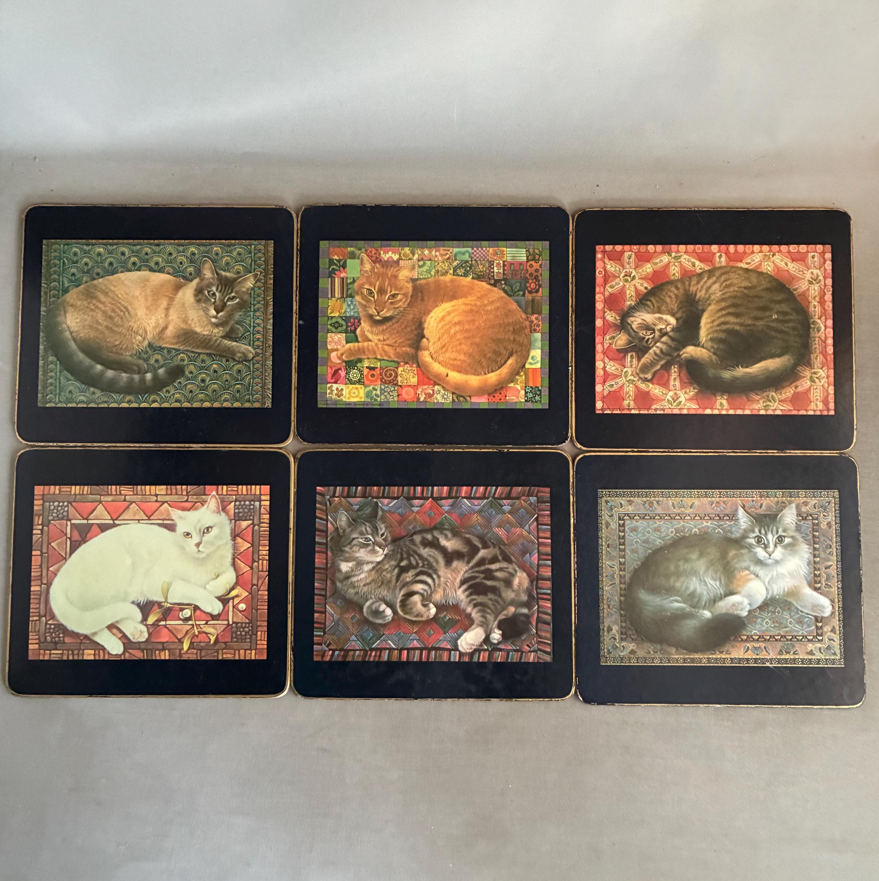 A set of six vintage Cloverleaf placemats / coasters featuring illustrations of cats by artist Lesley Anne Ivory.
